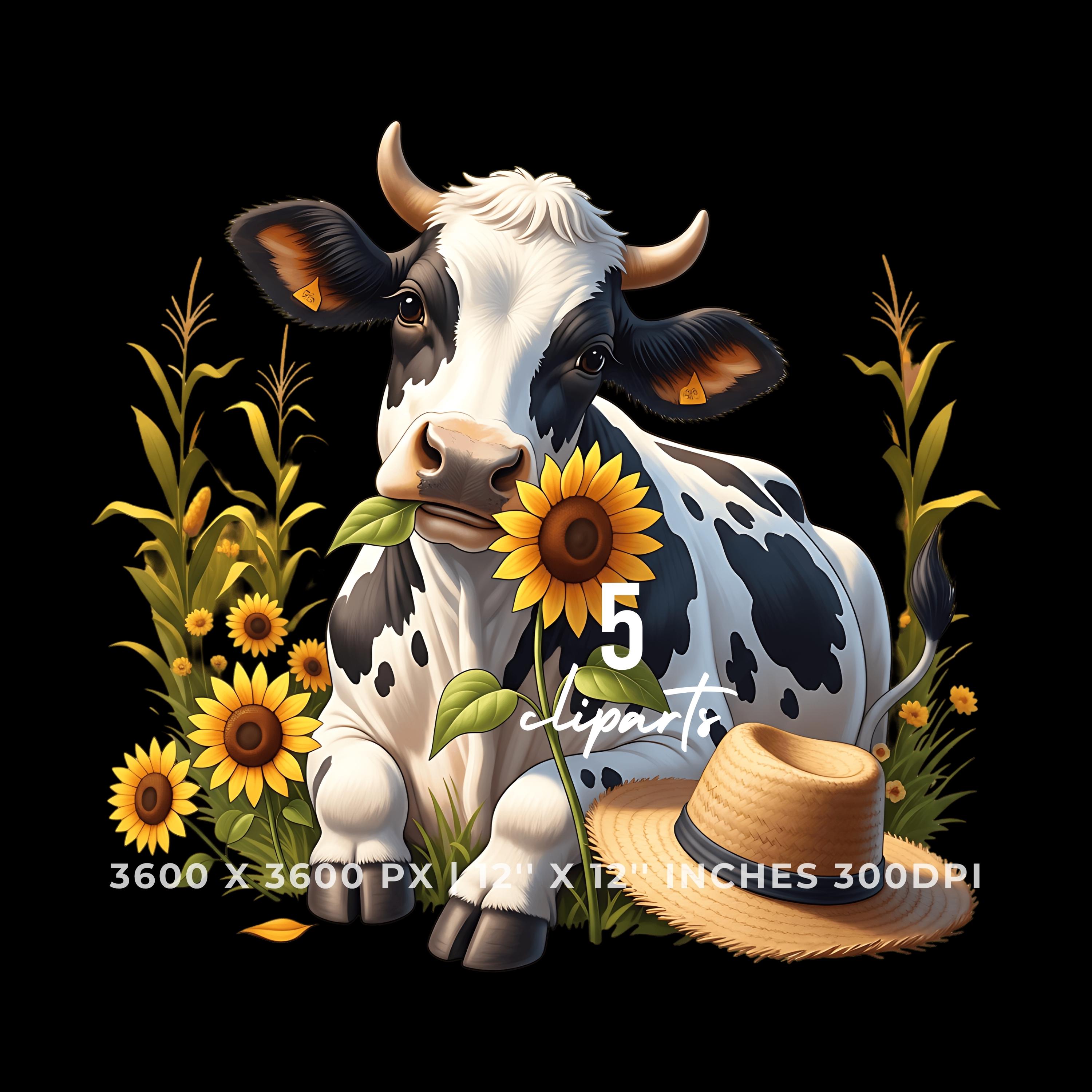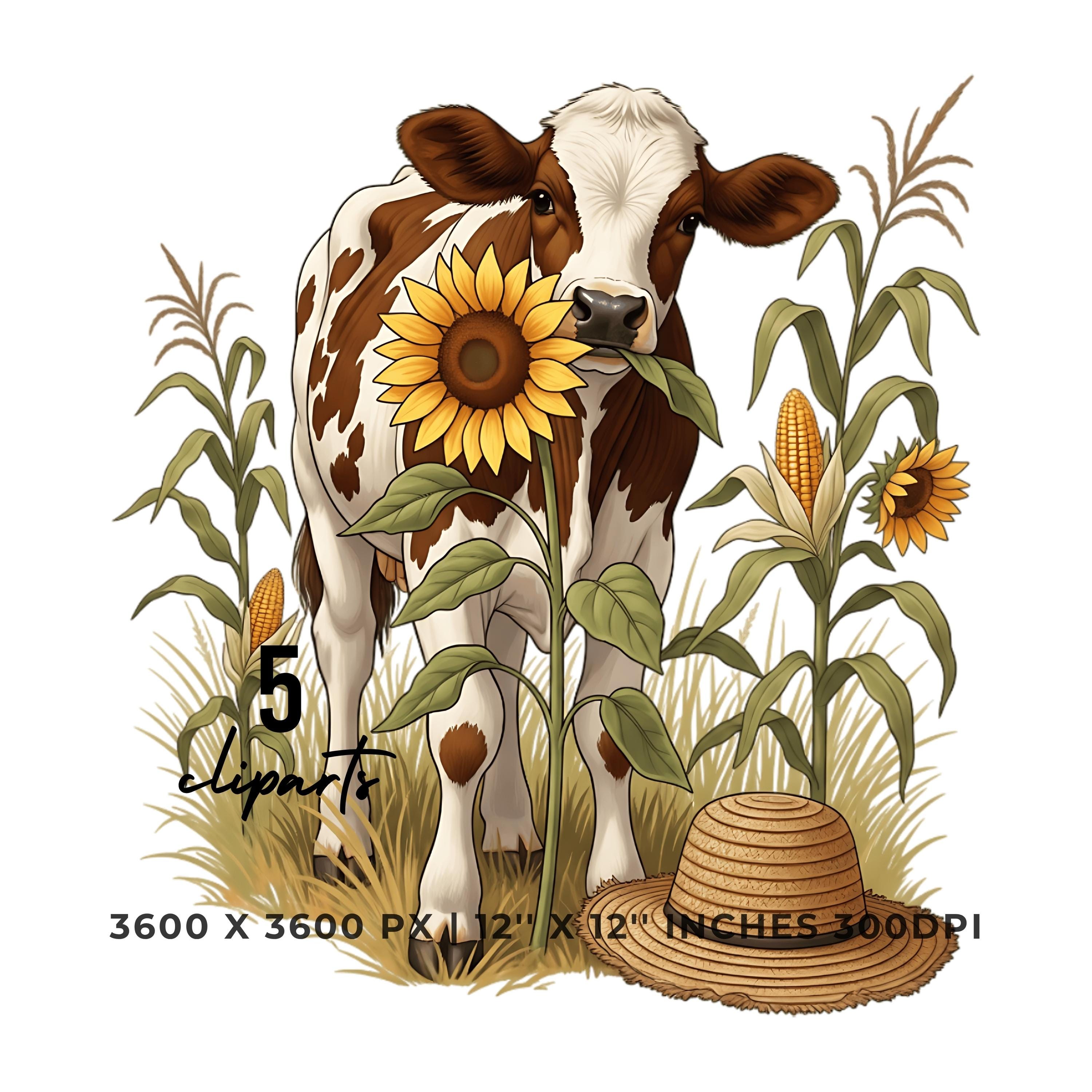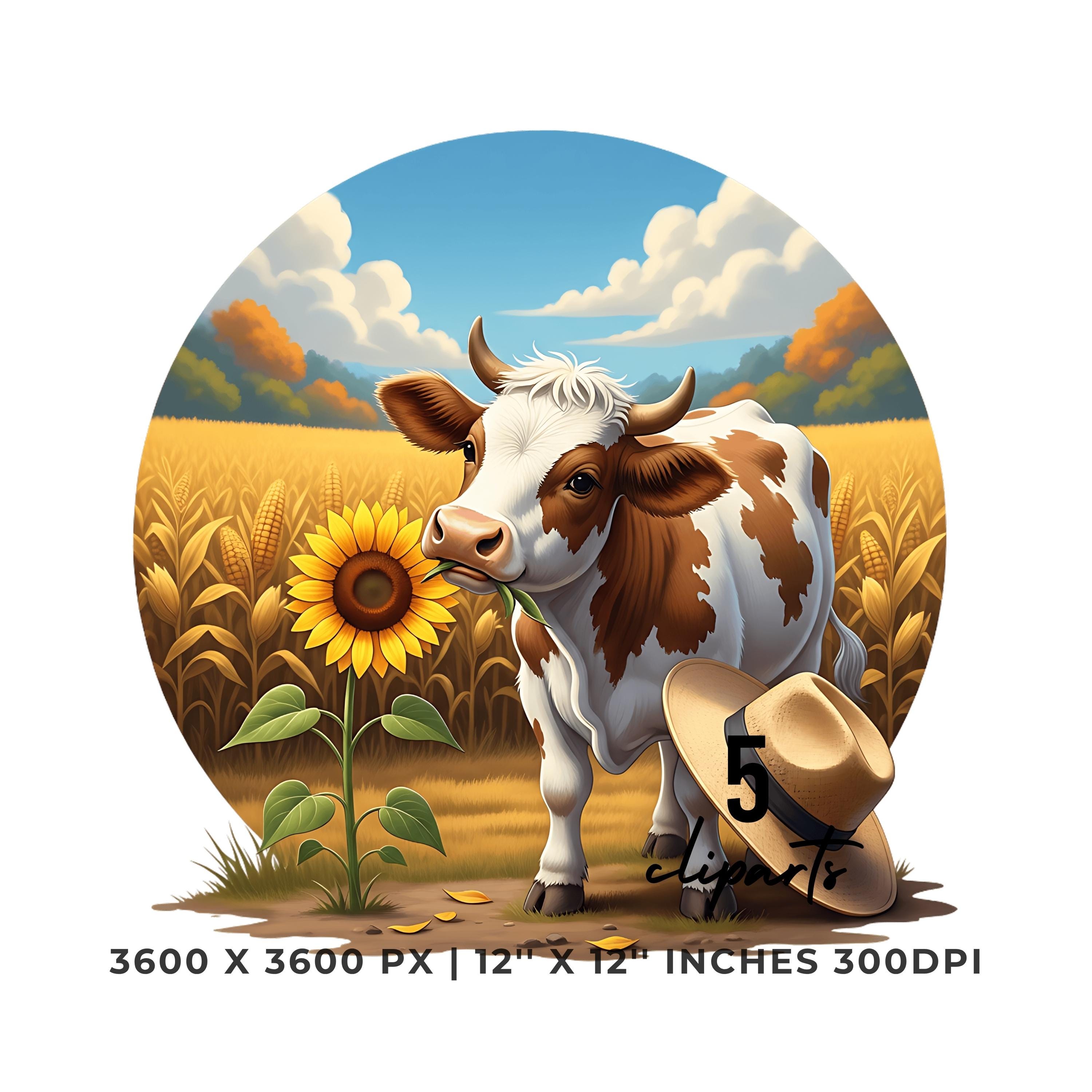 Cute Cow Chewing Sunflower Clipart Bundle | Fall Farm Animal 5 PNG & 5 JPG | Rustic Autumn Cow Art | 12″x12″ 300DPI Art Pack Commercial Use is an eye-catching, high-resolution digital asset designed for creators, crafters, teachers, and small business owners looking to elevate their visuals.