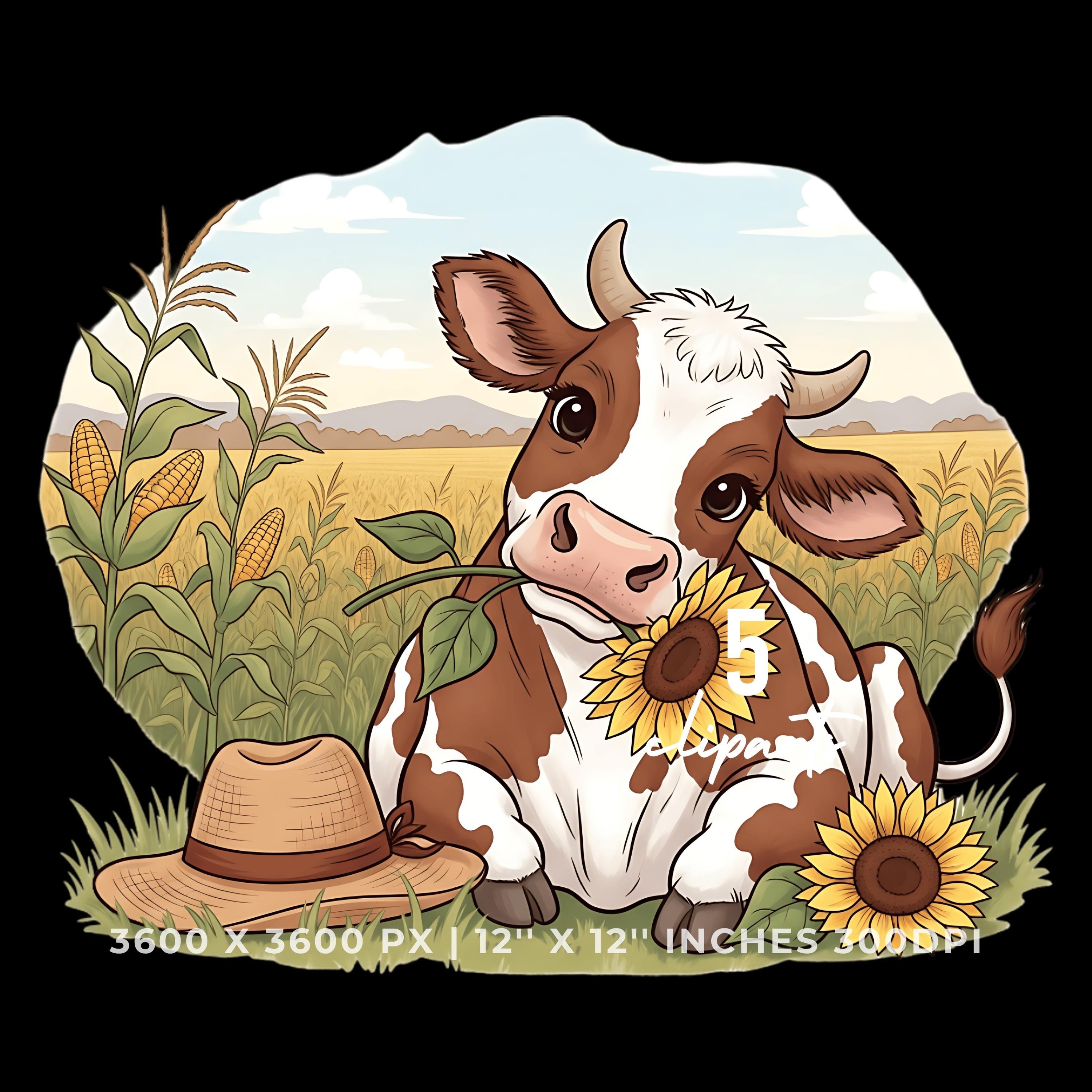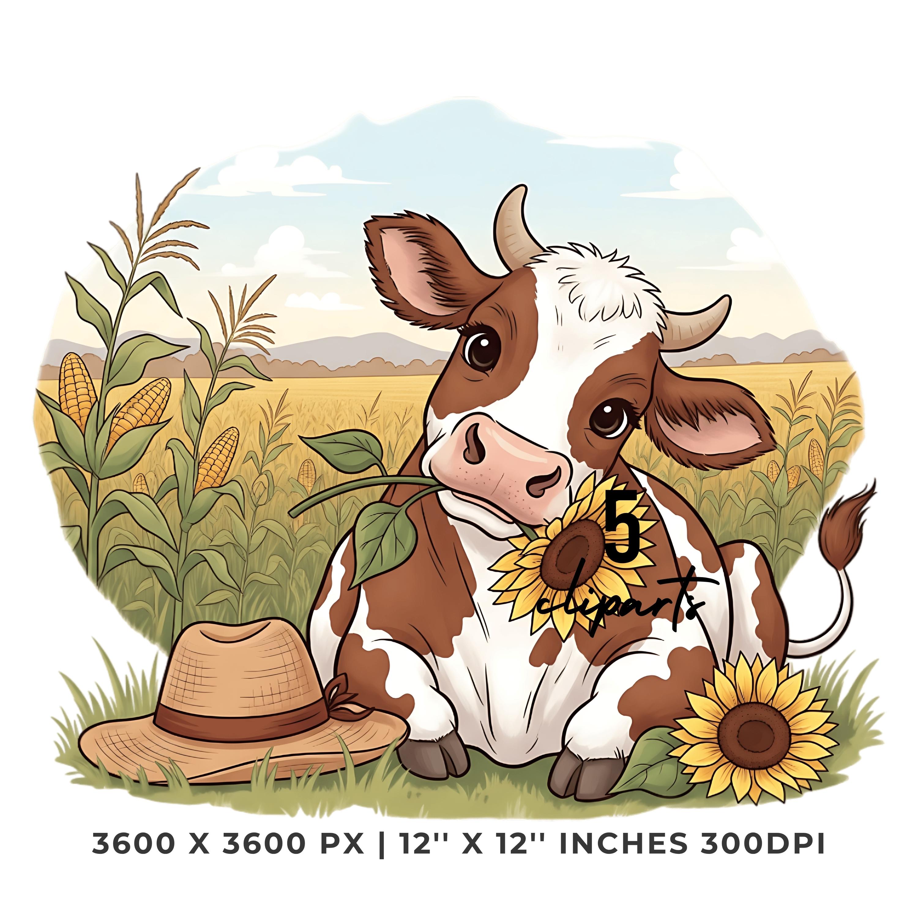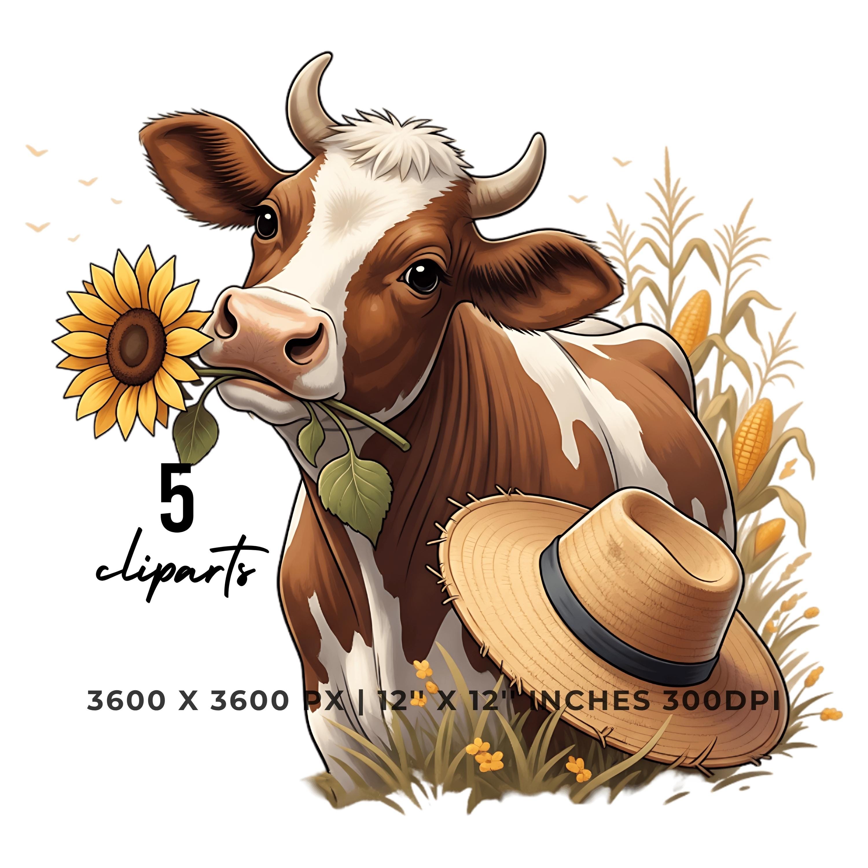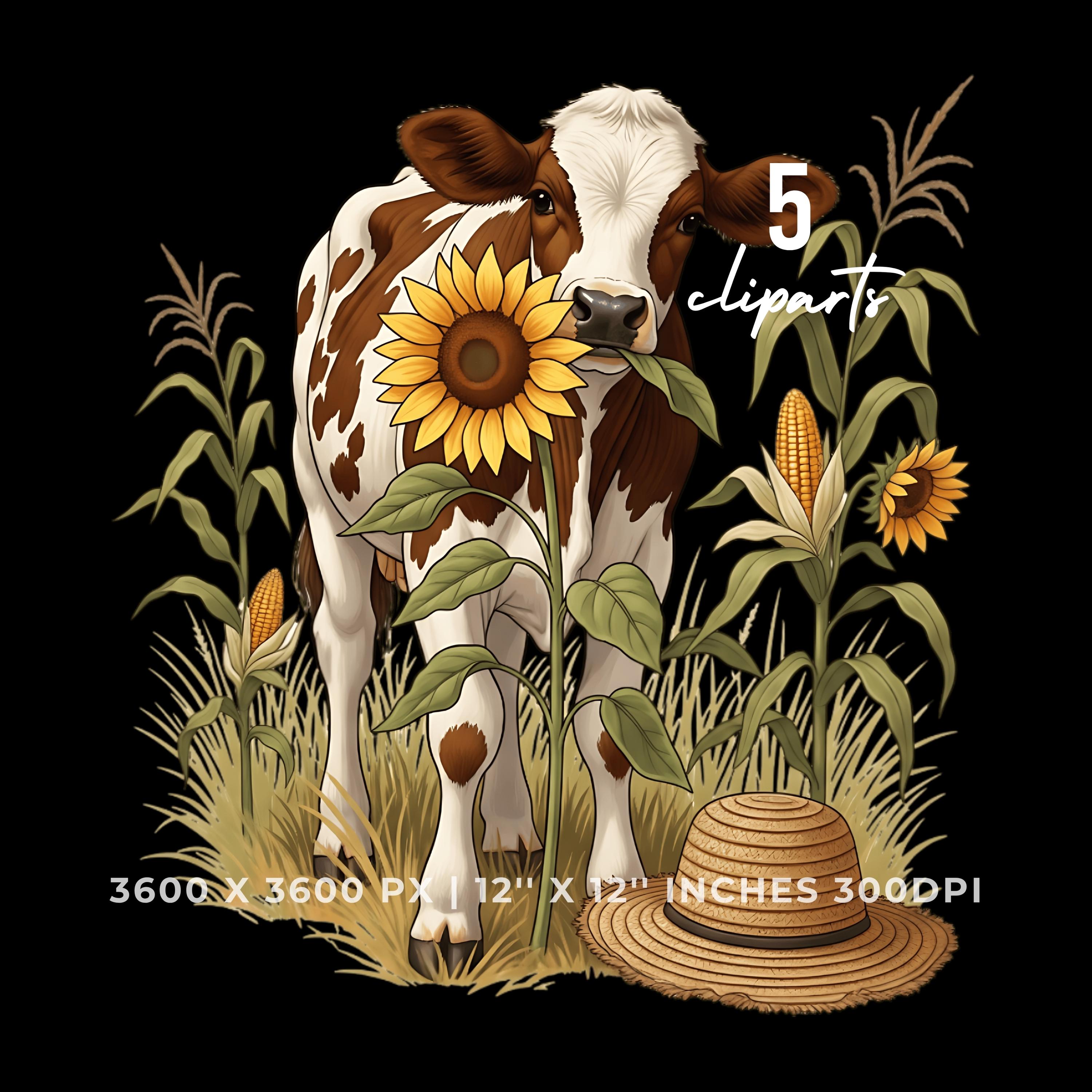 Cute Cow Chewing Sunflower Clipart Bundle | Fall Farm Animal 5 PNG & 5 JPG | Rustic Autumn Cow Art | 12″x12″ 300DPI Art Pack Commercial Use is an eye-catching, high-resolution digital asset designed for creators, crafters, teachers, and small business owners looking to elevate their visuals.