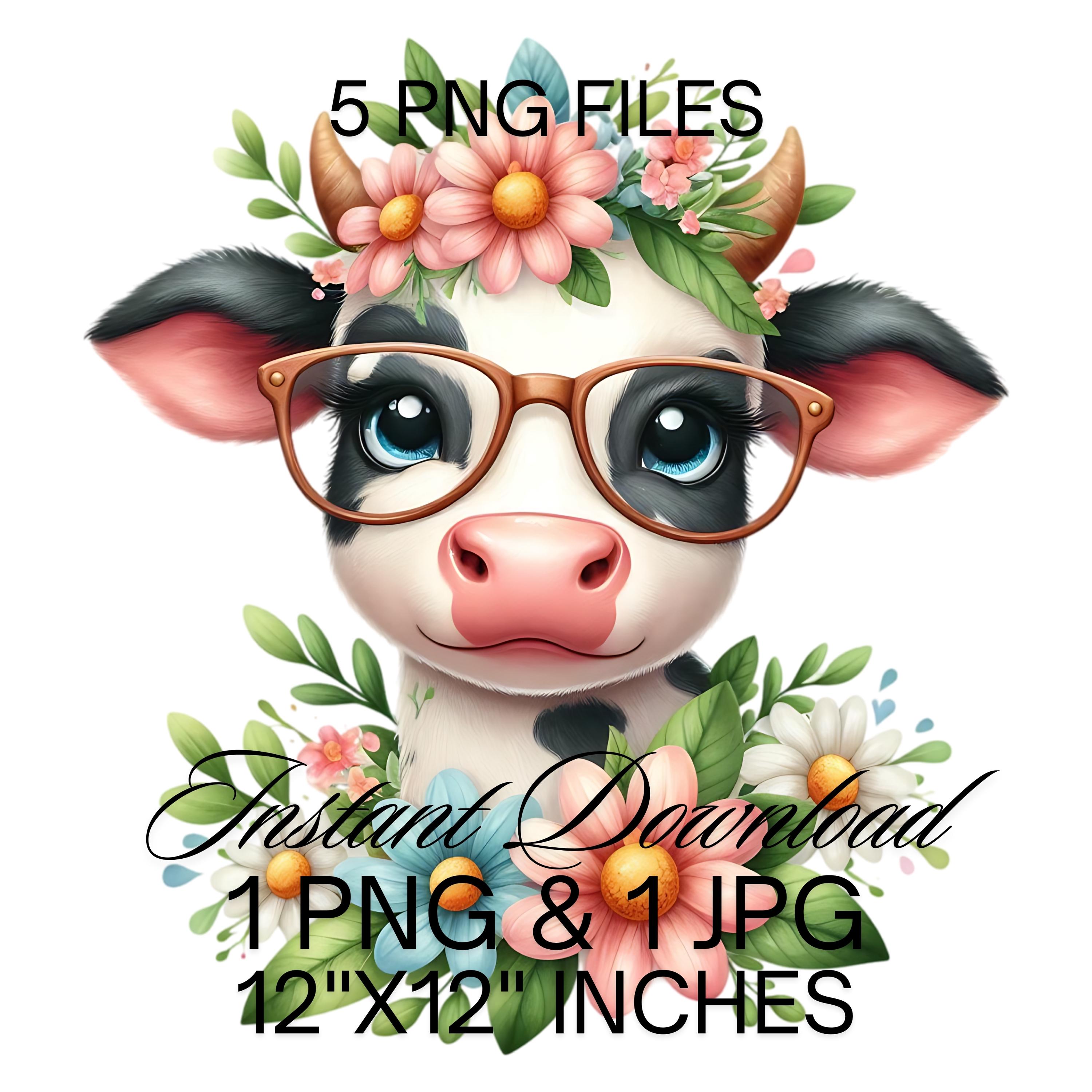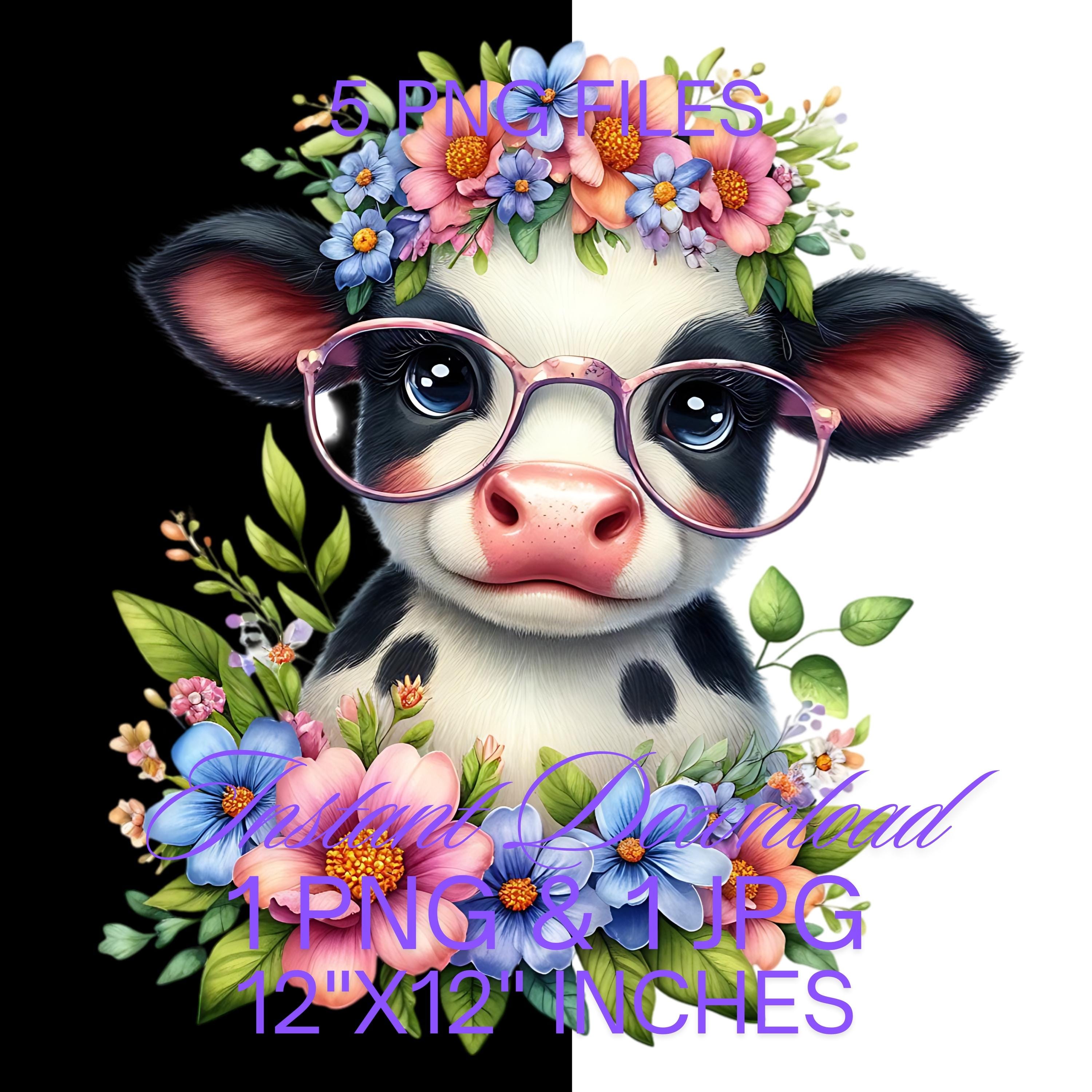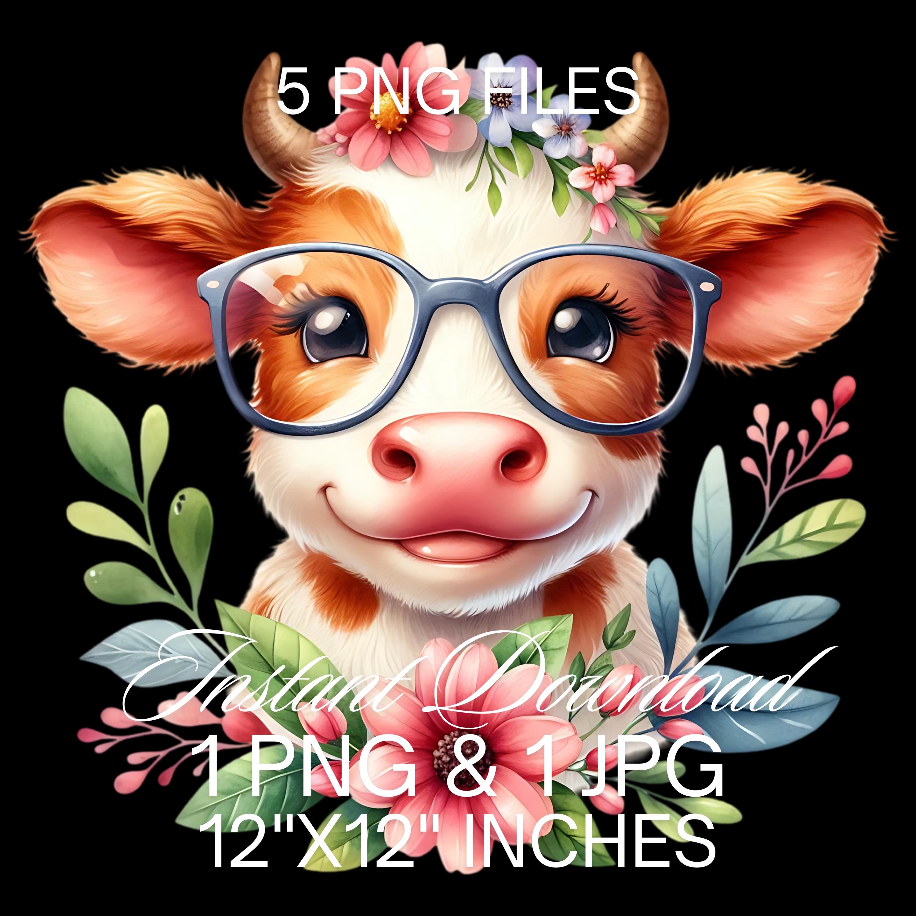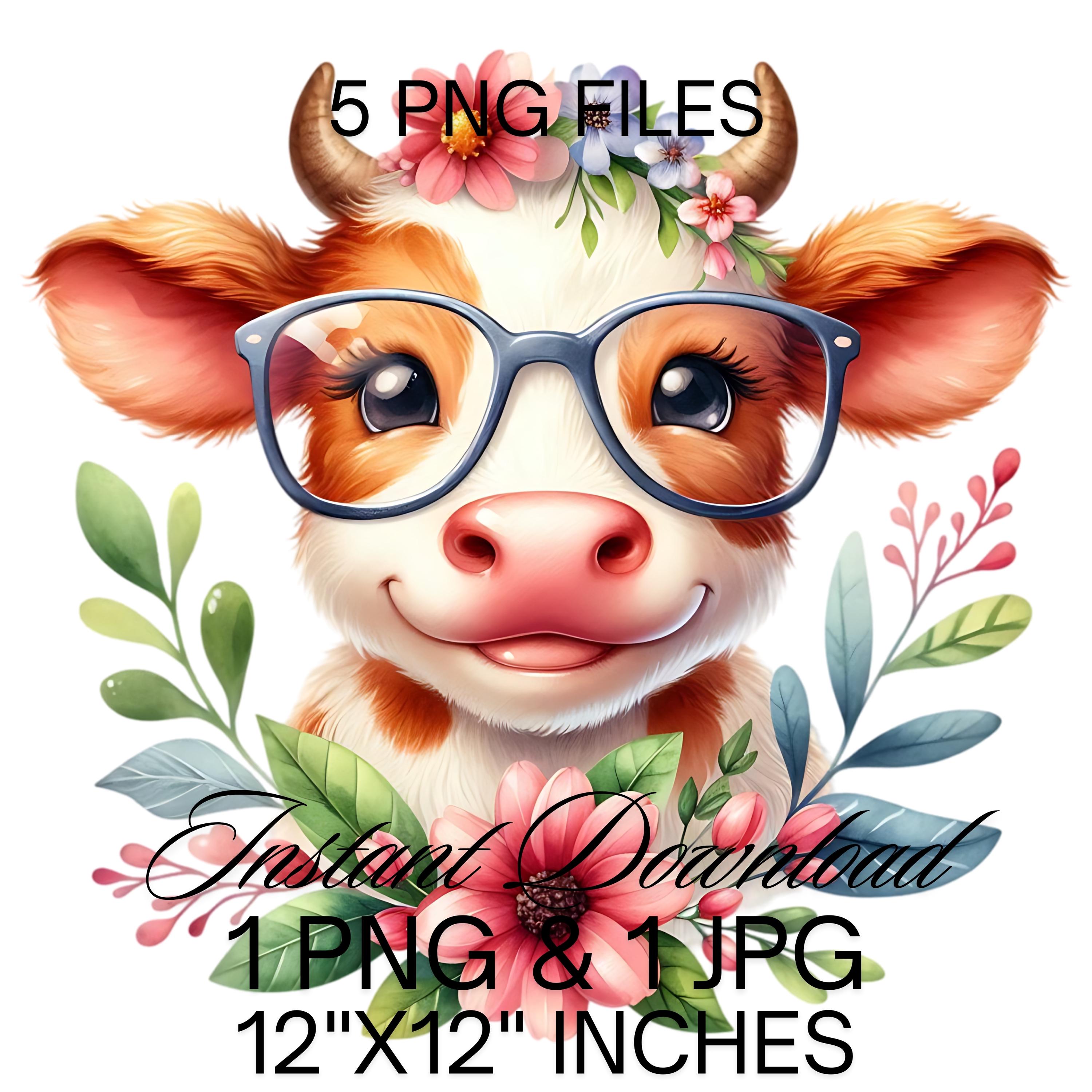 Cute Dairy Calf & Glasses Watercolor Clipart PNG | Farm Baby Cow Spring Flowers Graphic Design Illustration | Funny Cattle Commercial Use is an eye-catching, high-resolution digital asset designed for creators, crafters, teachers, and small business owners looking to elevate their visuals.