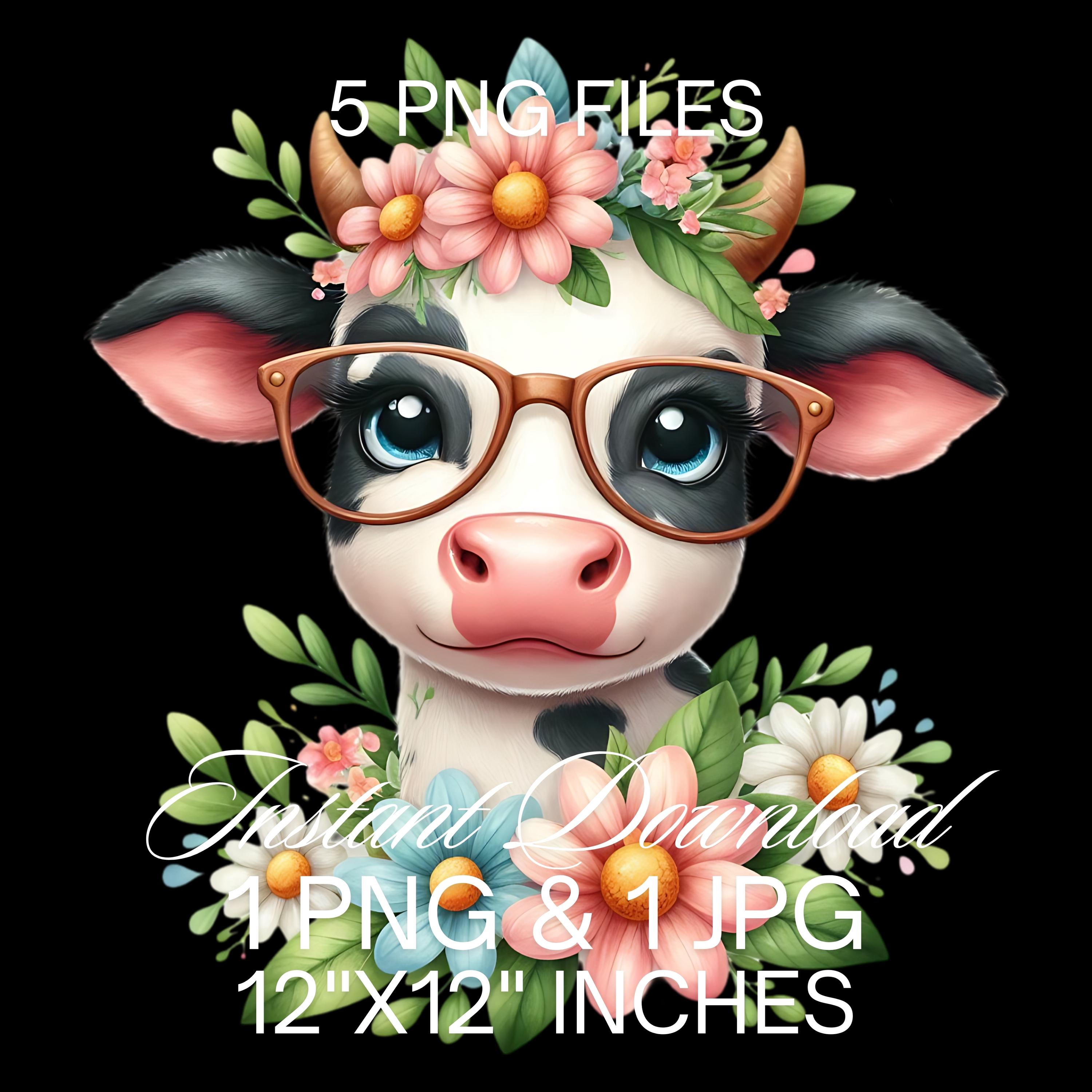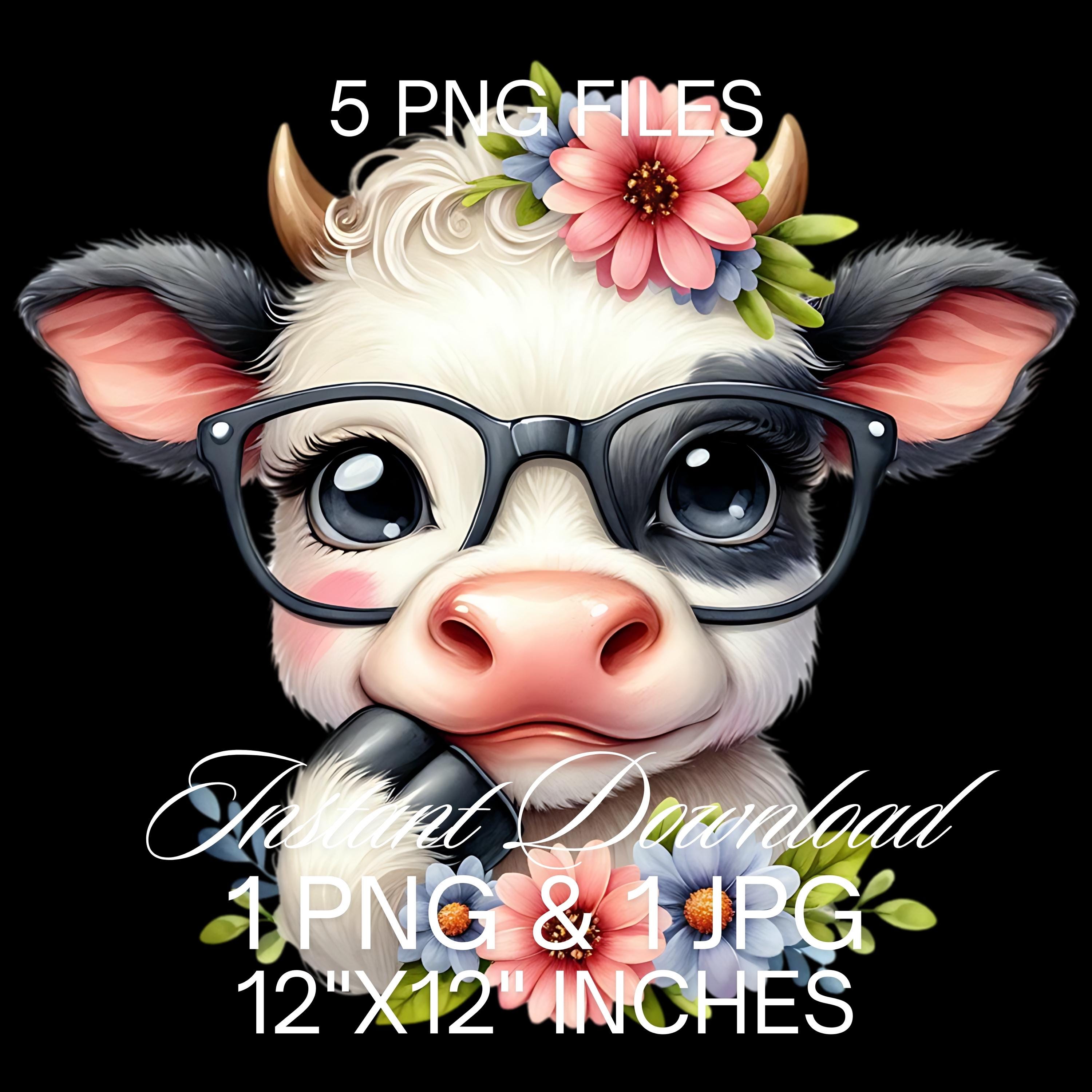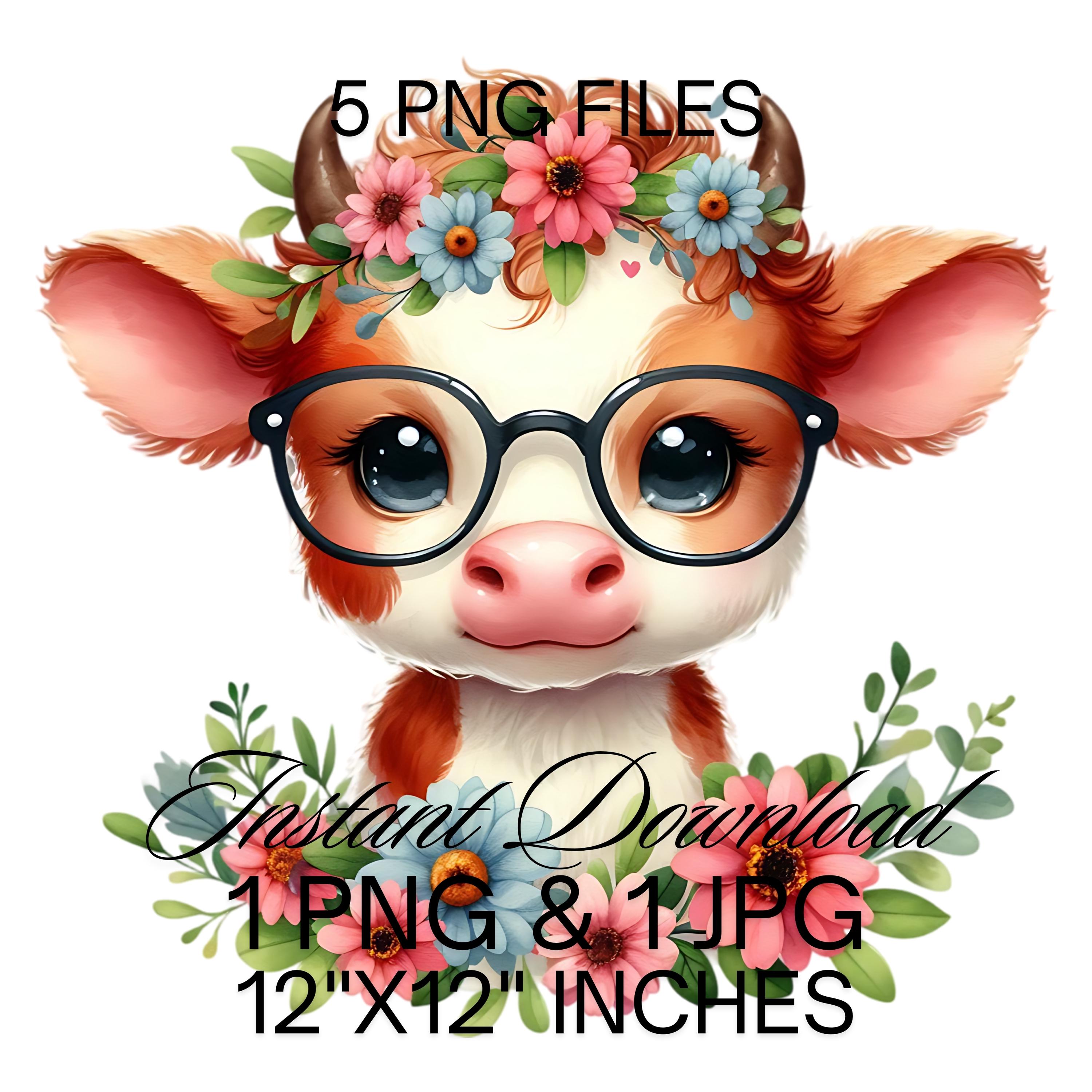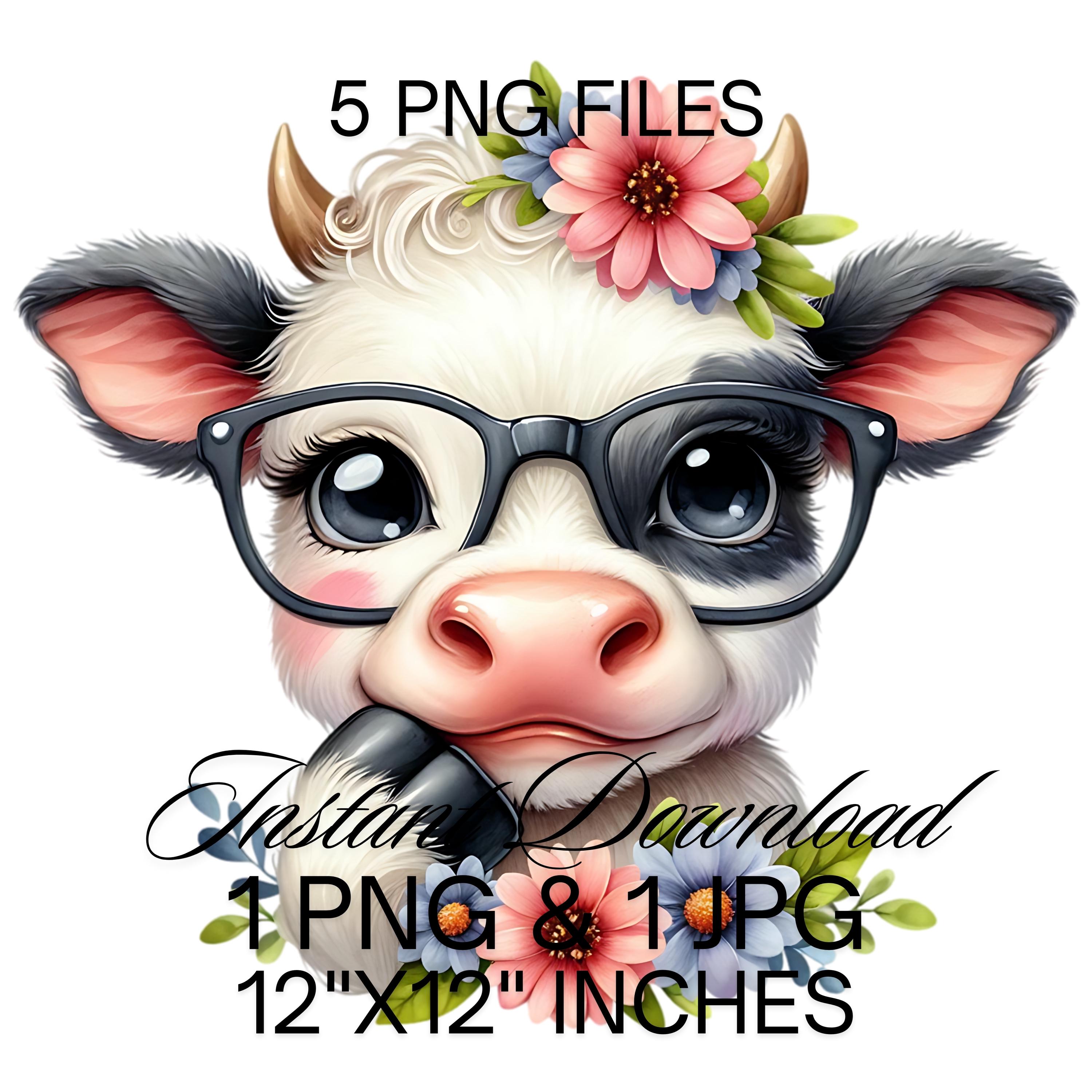 Cute Dairy Calf & Glasses Watercolor Clipart PNG | Farm Baby Cow Spring Flowers Graphic Design Illustration | Funny Cattle Commercial Use is an eye-catching, high-resolution digital asset designed for creators, crafters, teachers, and small business owners looking to elevate their visuals.