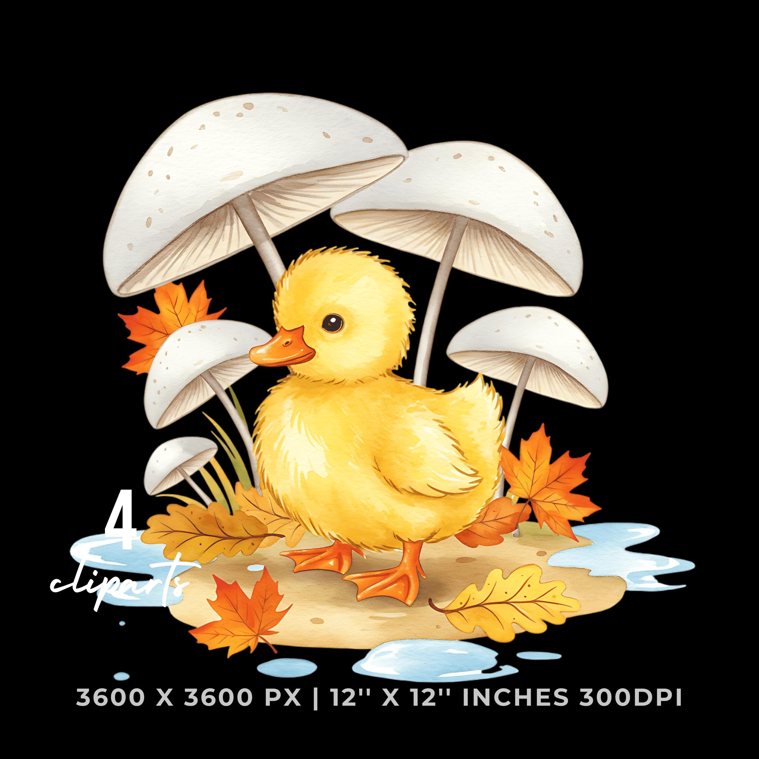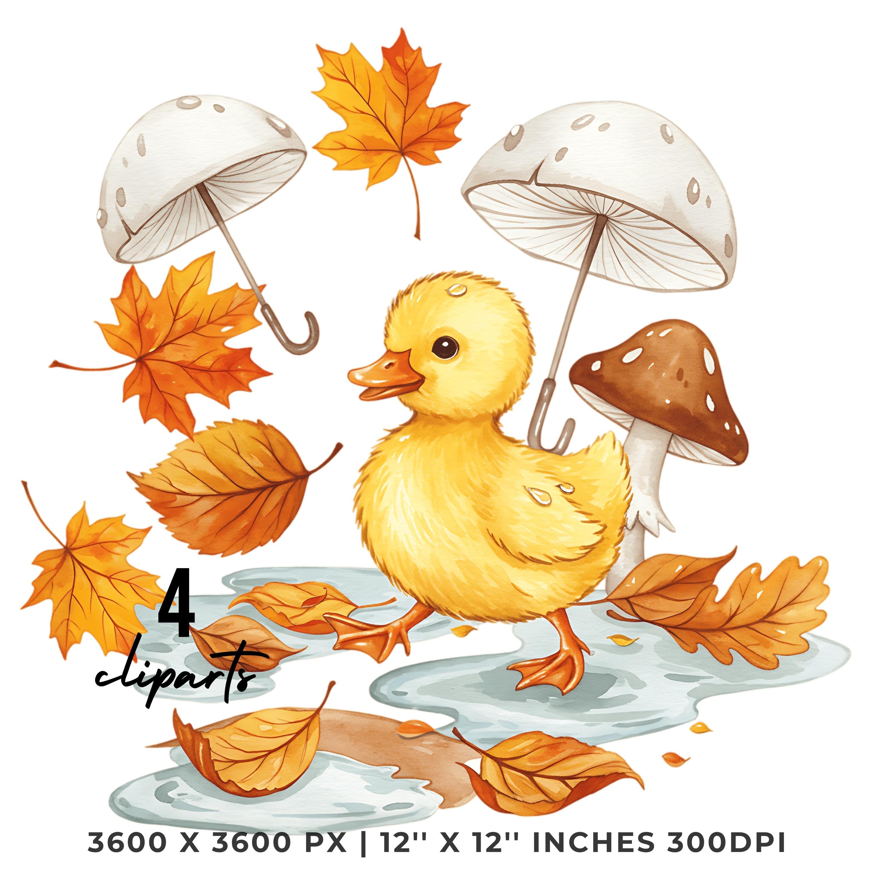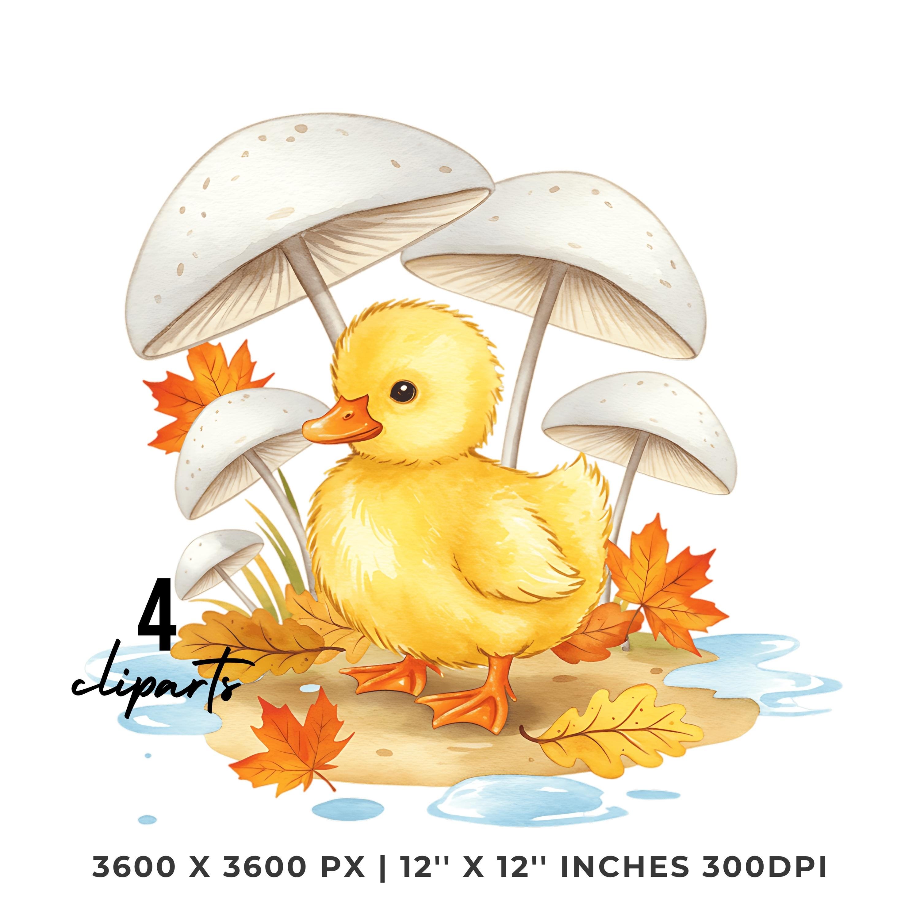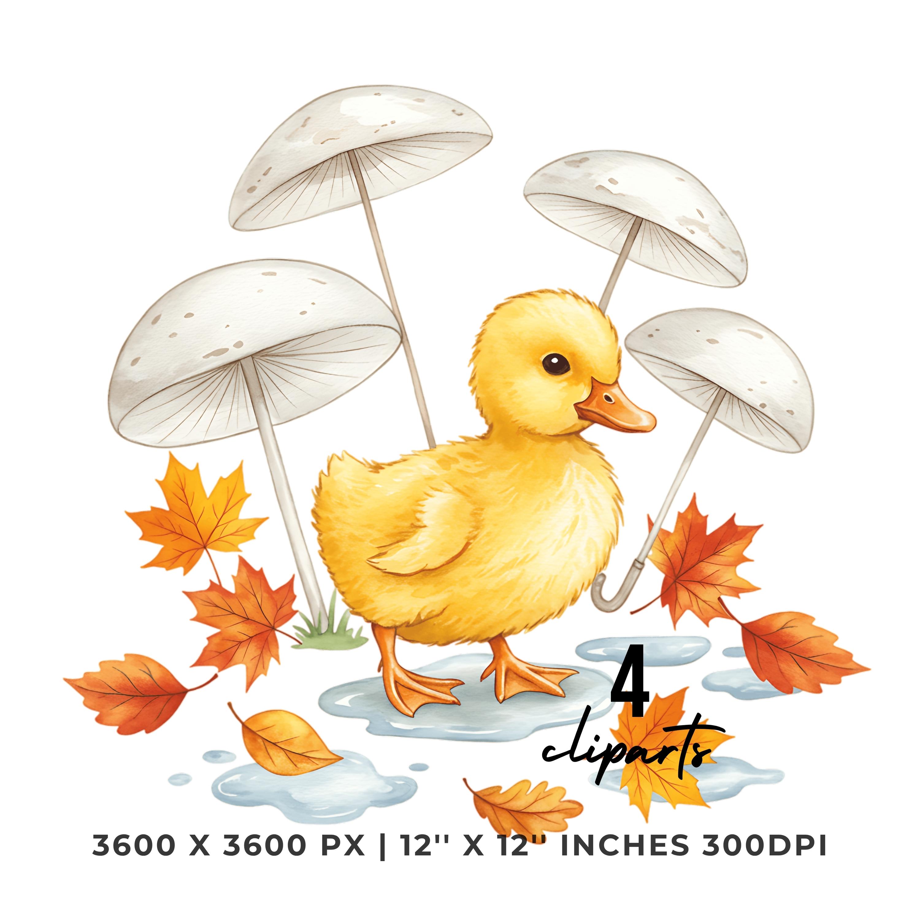 Cute Duckling with White Mushroom Umbrella Clipart | Fall Autumn Rainy Day Art | 4 PNG JPG | 12″x12″ | 300 DPI for Sublimation, Stickers & Crafts | Commercial Use