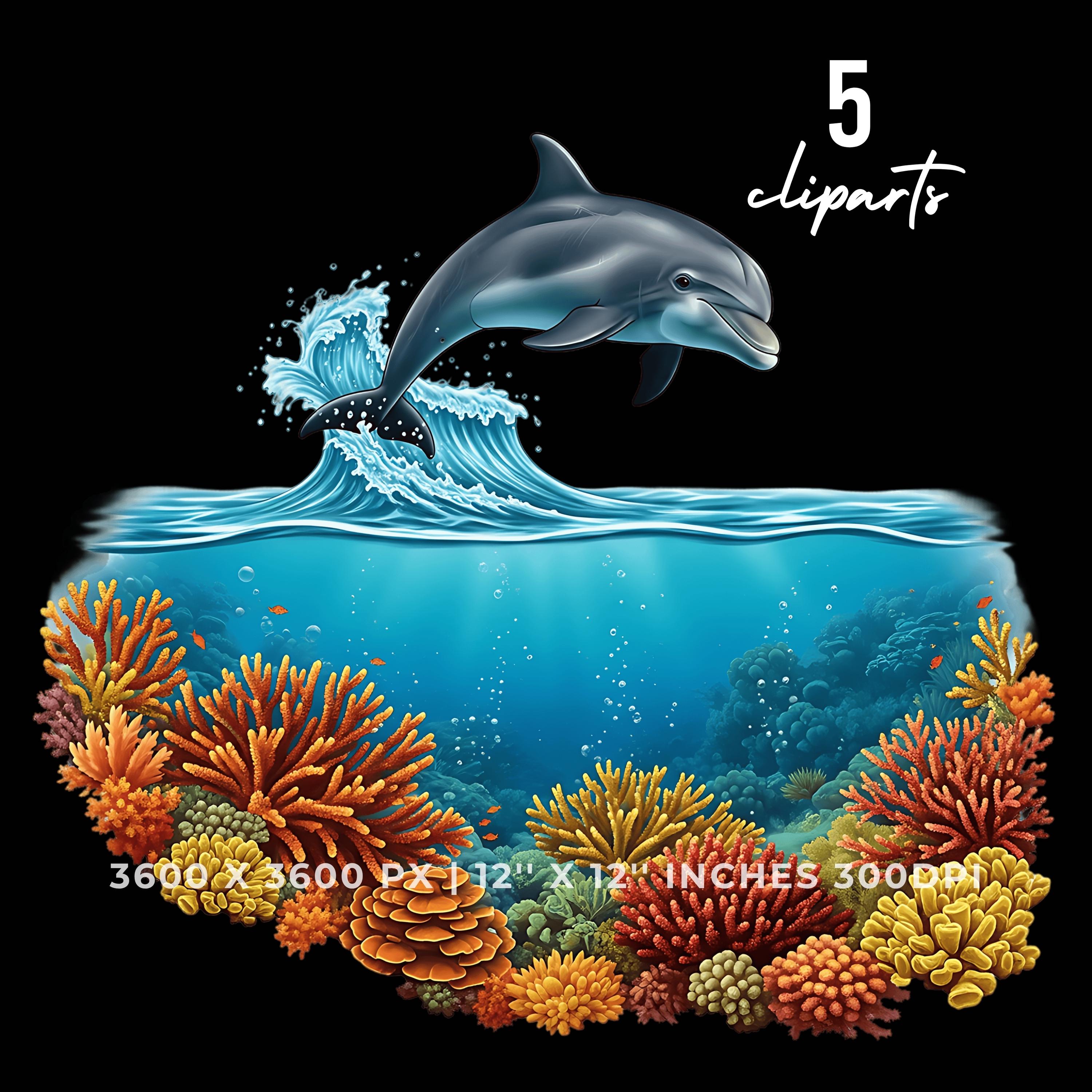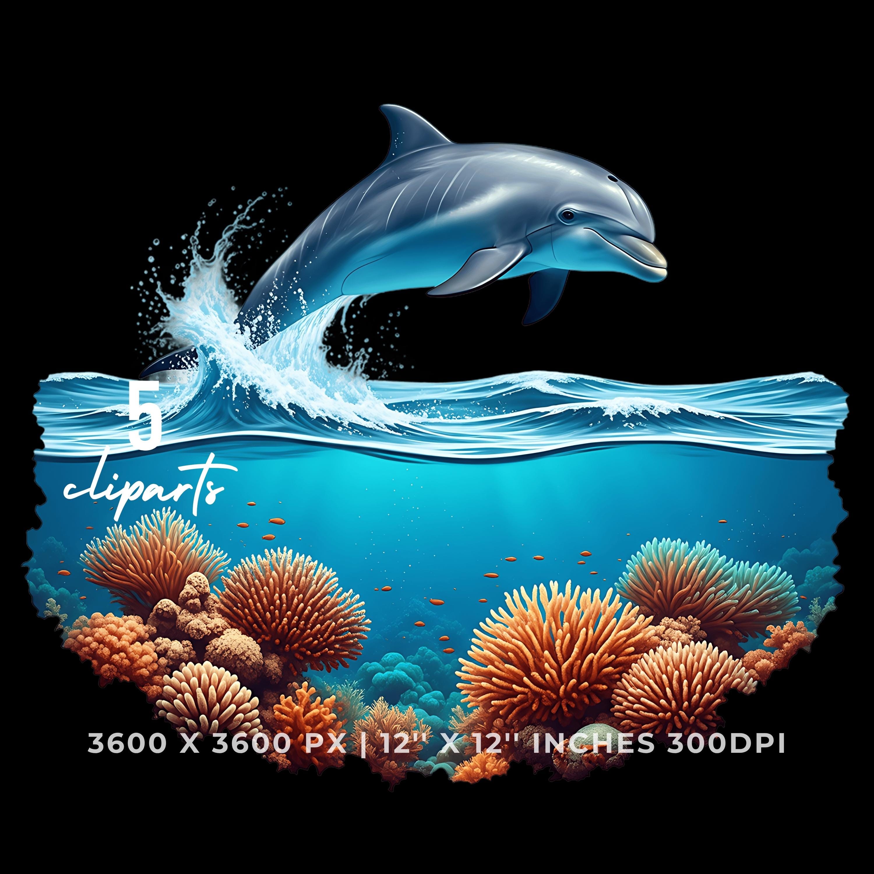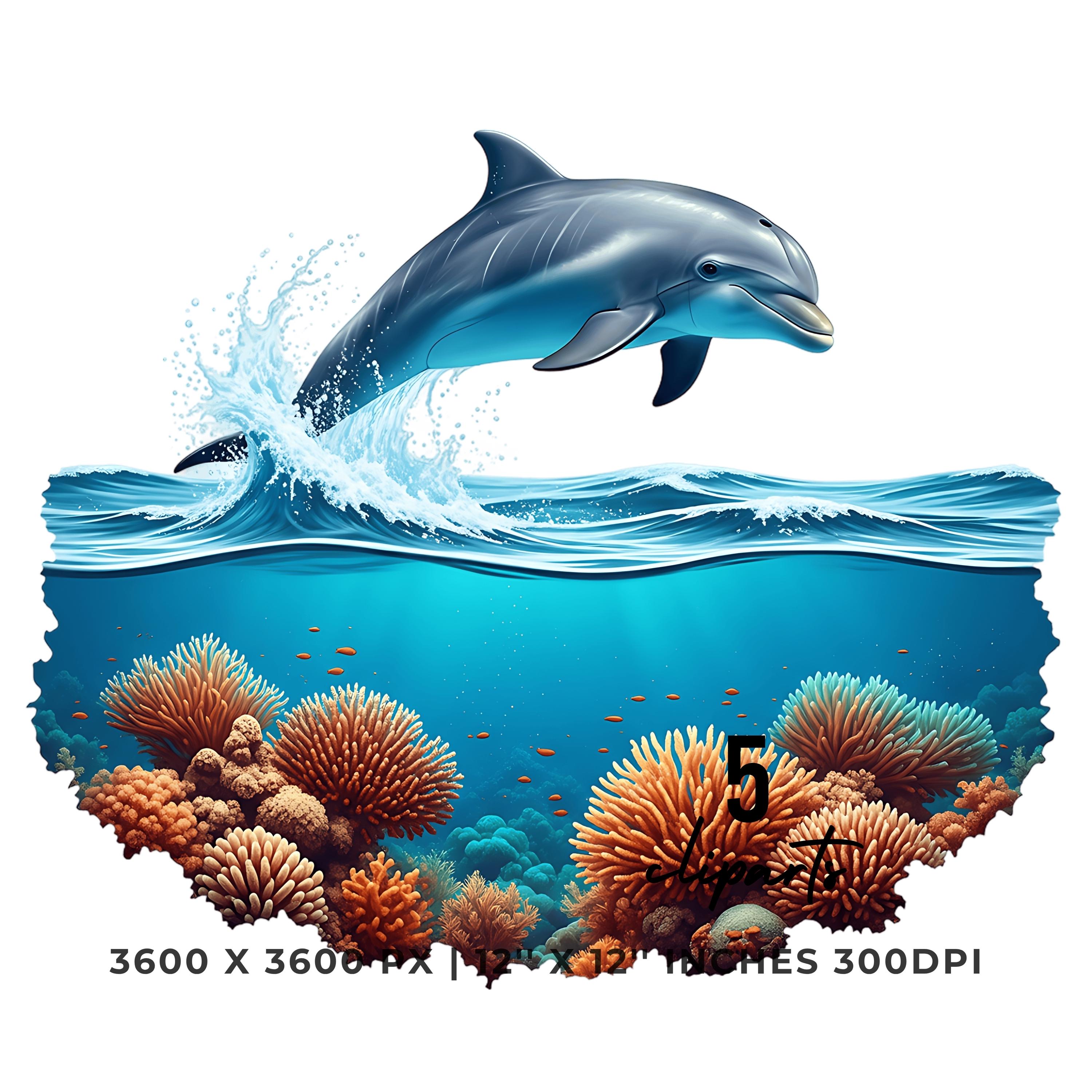 Dolphin Leaping Above Ocean Waves Clipart | Underwater Coral Scene | 5 PNG & JPG | 3600x3600px | 12″x12″ 300DPI | Underwater Sublimation Transparent Commercial Use