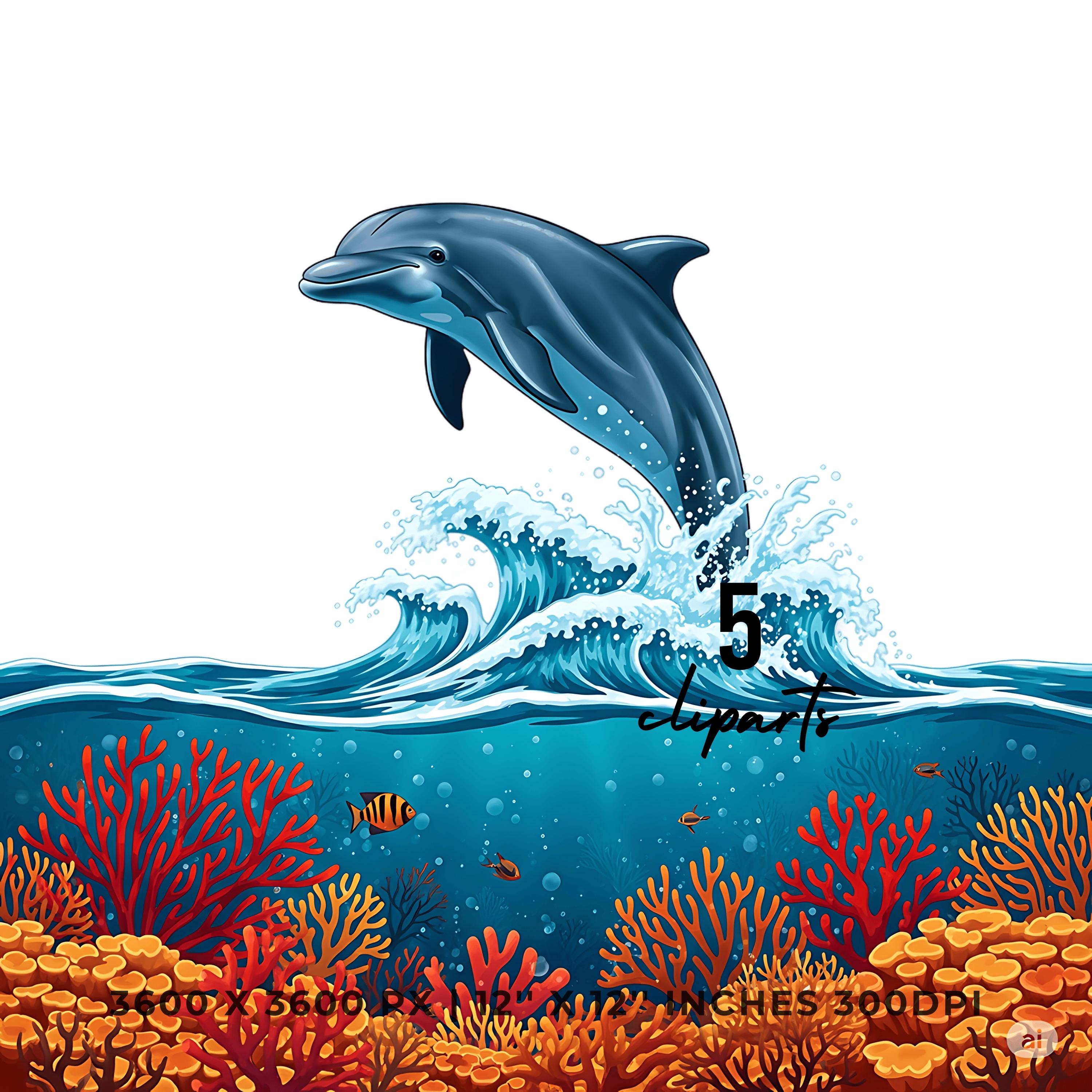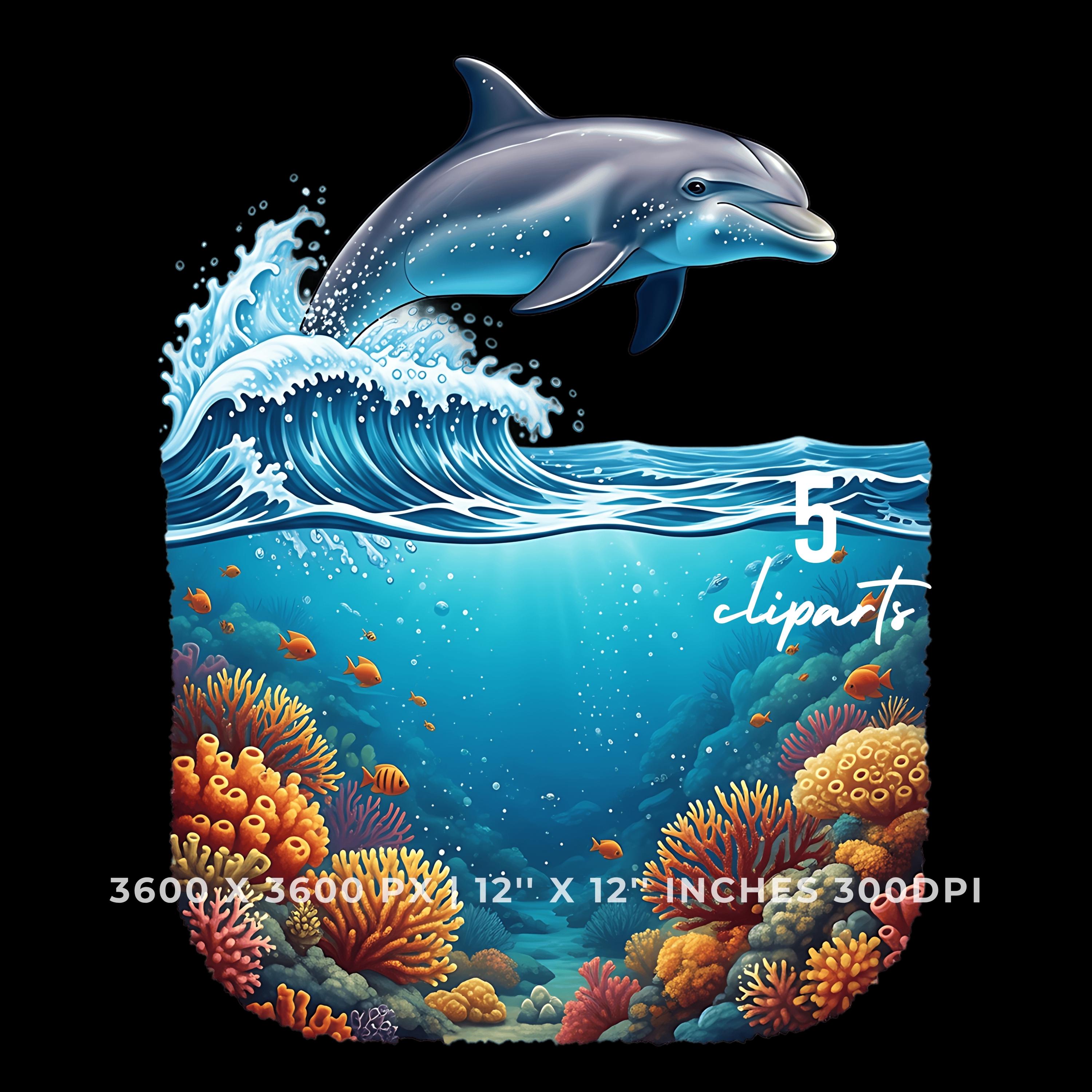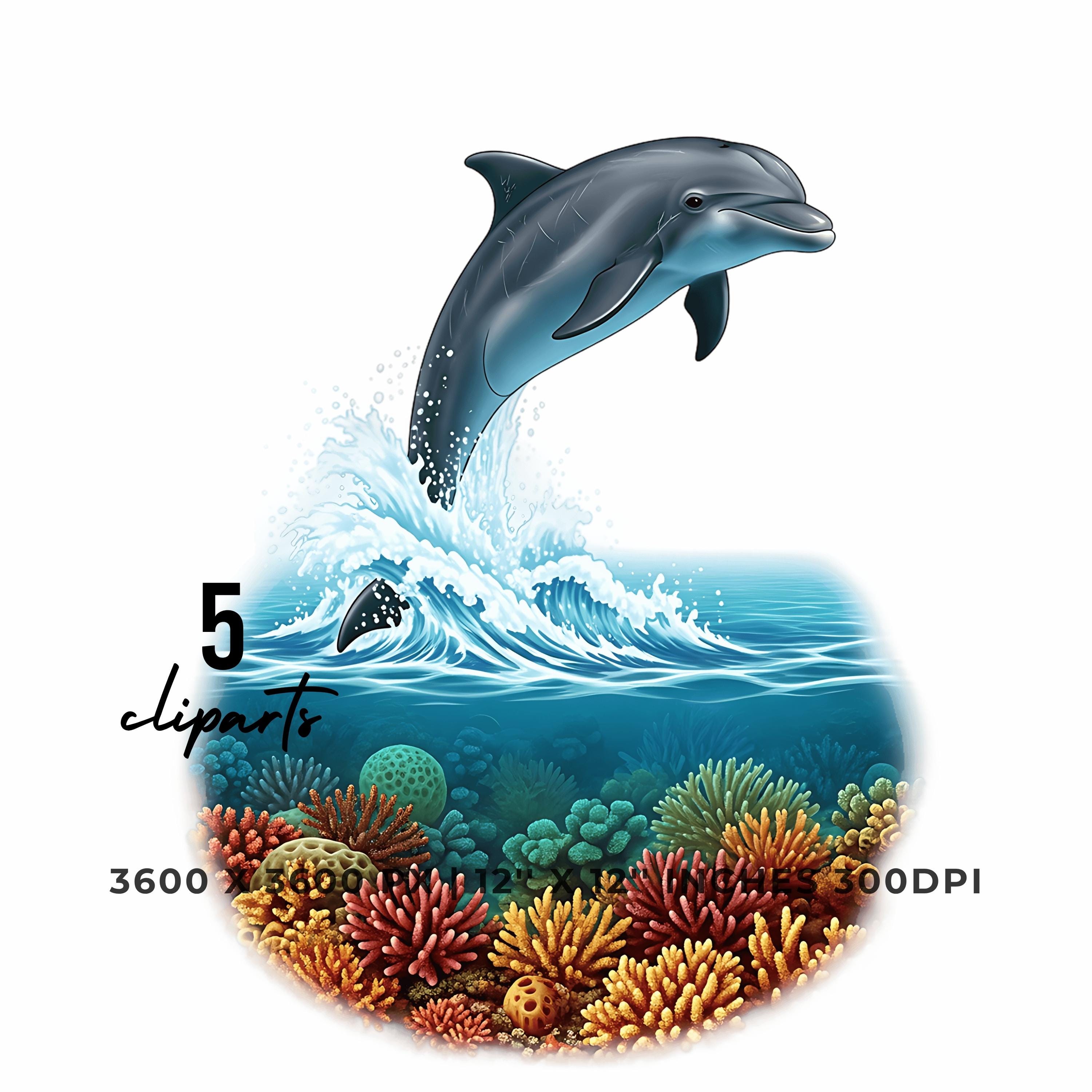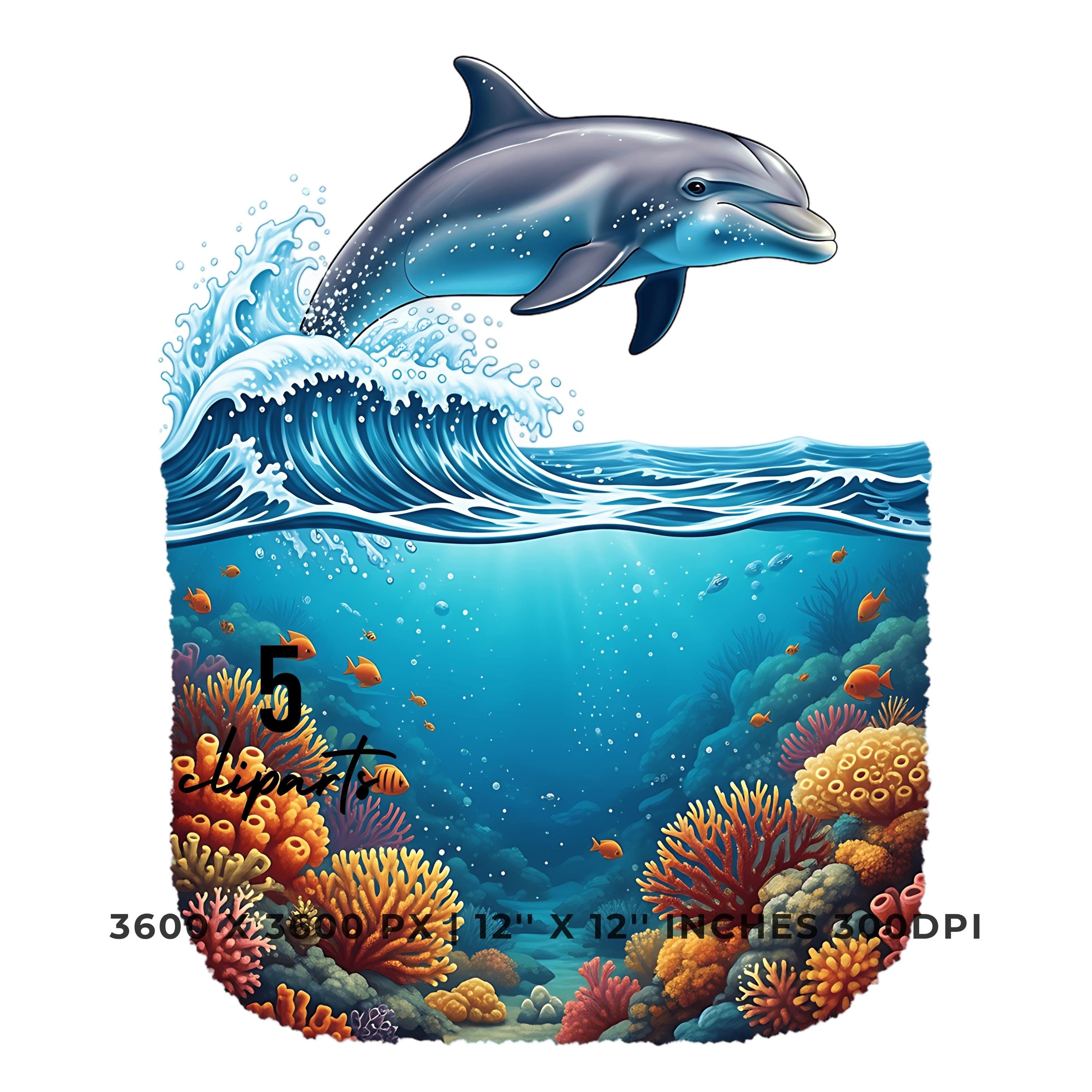 Dolphin Leaping Above Ocean Waves Clipart | Underwater Coral Scene | 5 PNG & JPG | 3600x3600px | 12″x12″ 300DPI | Underwater Sublimation Transparent Commercial Use