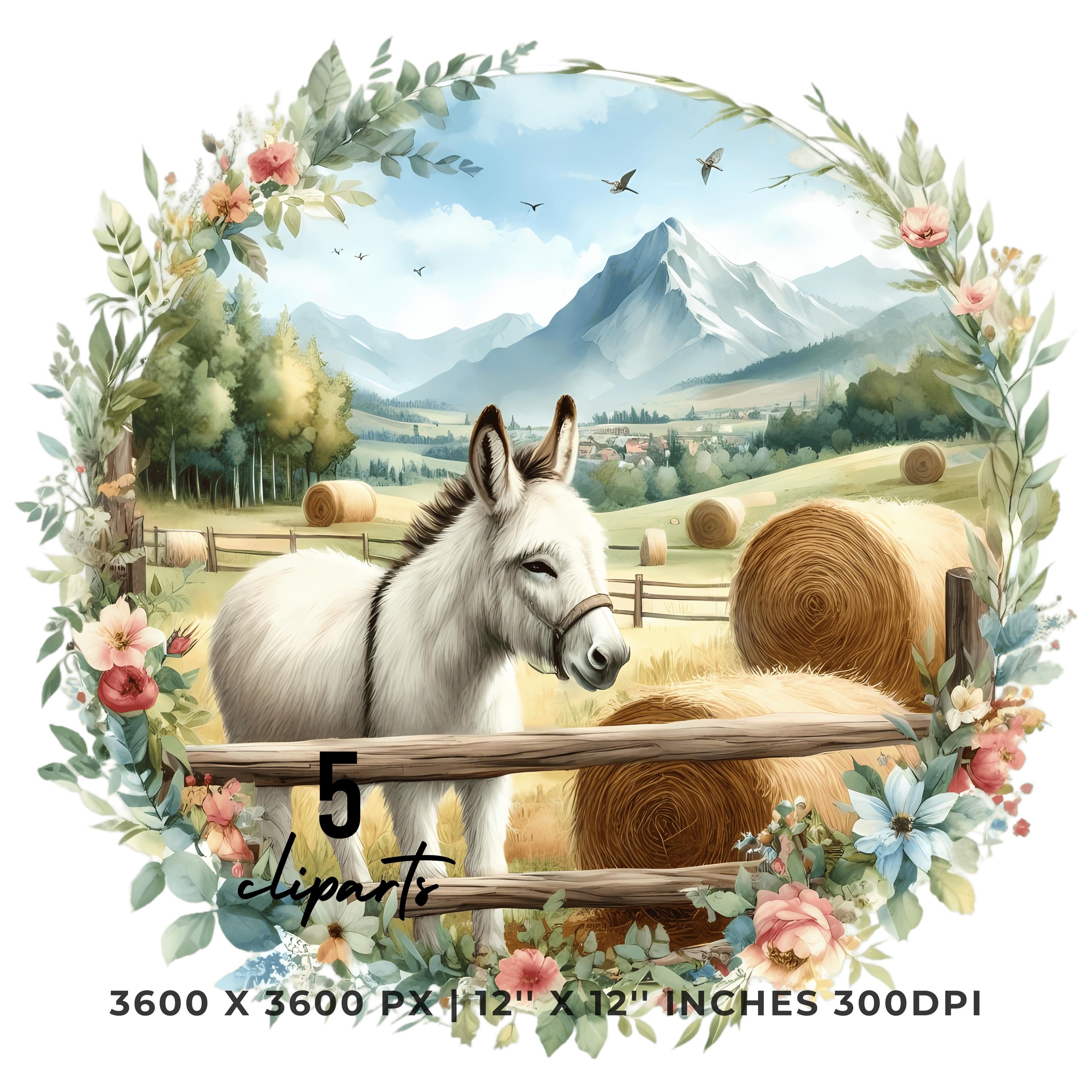Donkey Clipart PNG | 5 Watercolor Donkey in a field with hay bales, flowers, and wooden fence | Farm Sublimation Transparent Commercial Use is an eye-catching, high-resolution digital asset designed for creators, crafters, teachers, and small business owners looking to elevate their visuals.