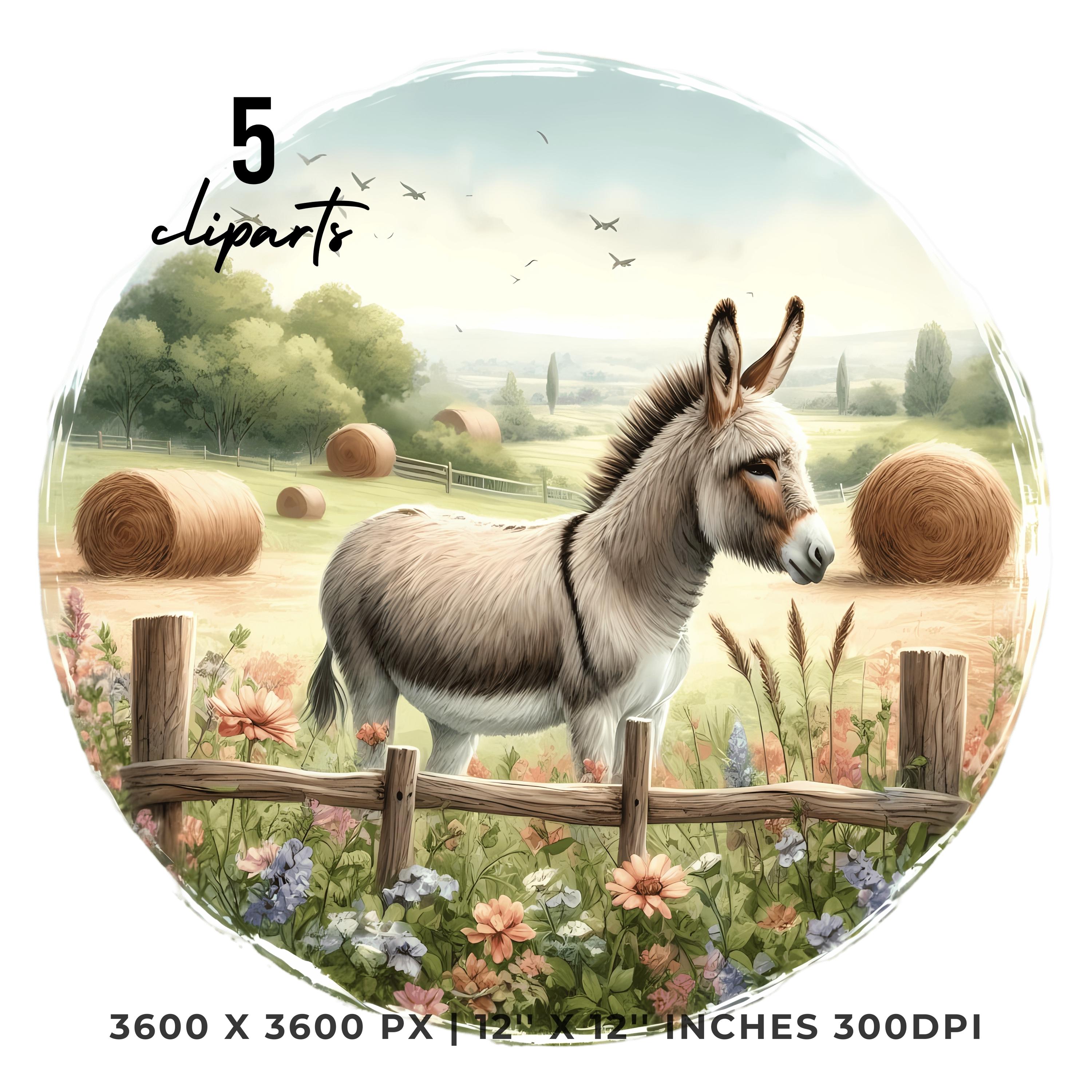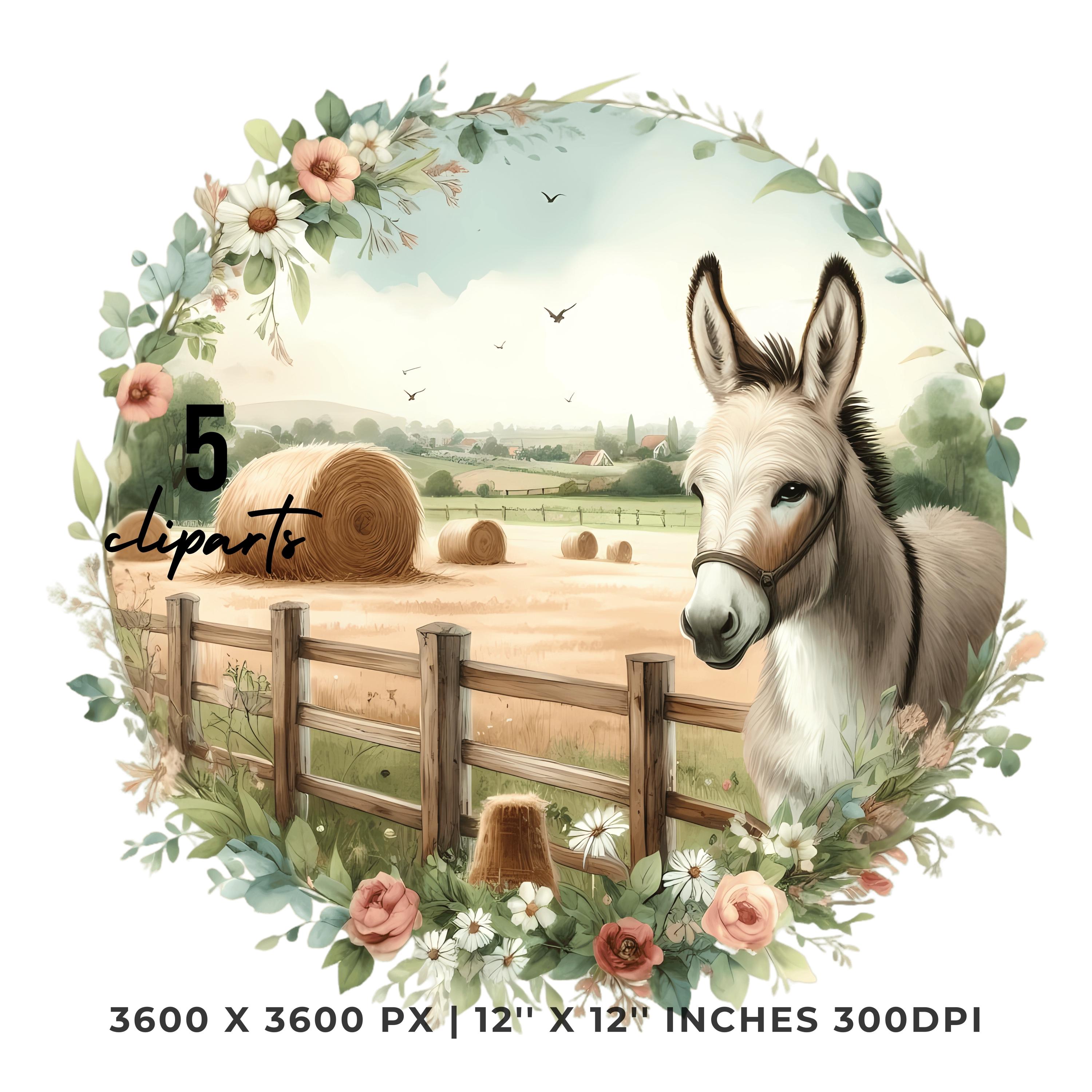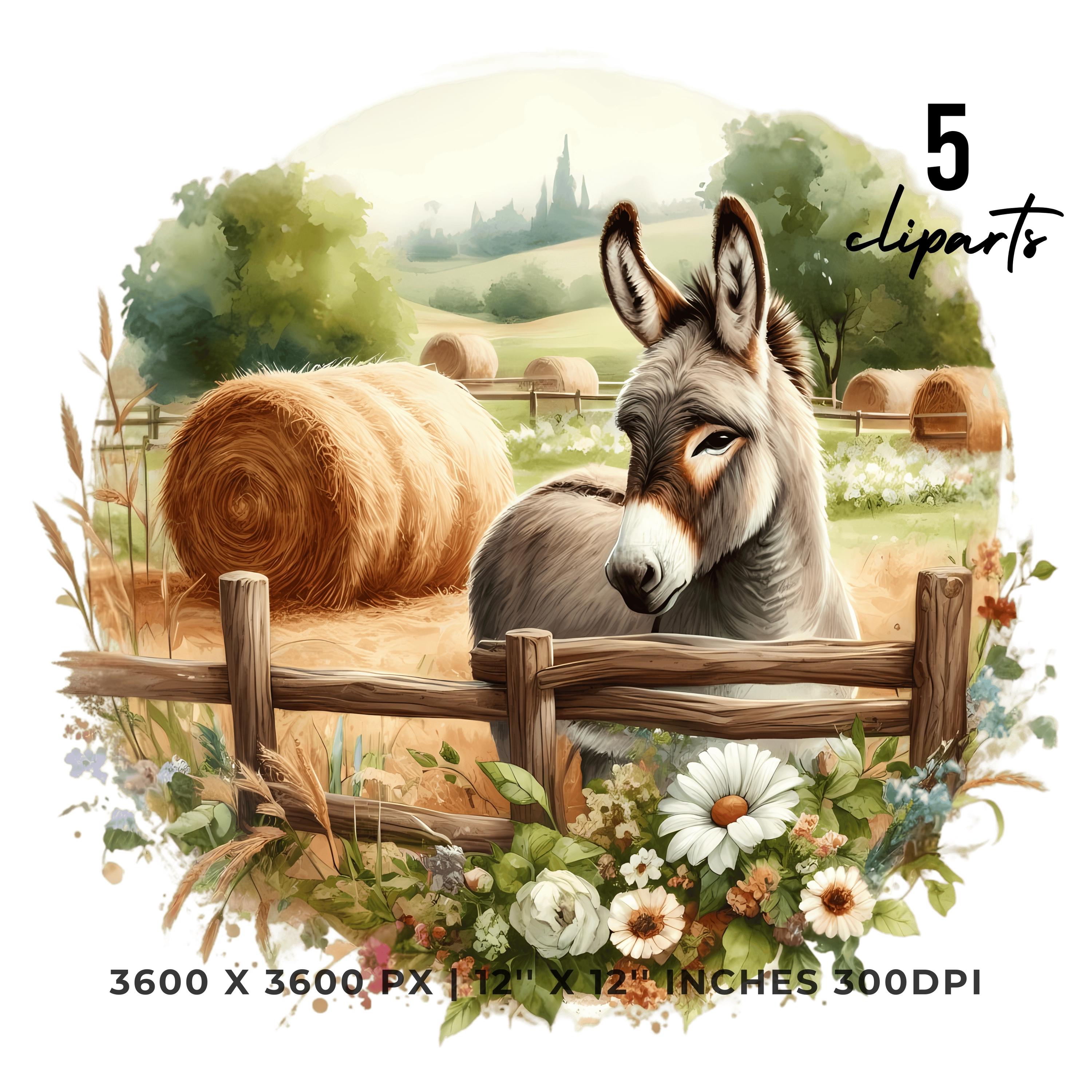 Donkey Clipart PNG | 5 Watercolor Gentle donkey in a pastoral field with hay bales, flowers, and a wooden fence | Farm Sublimation Transparent Commercial Use