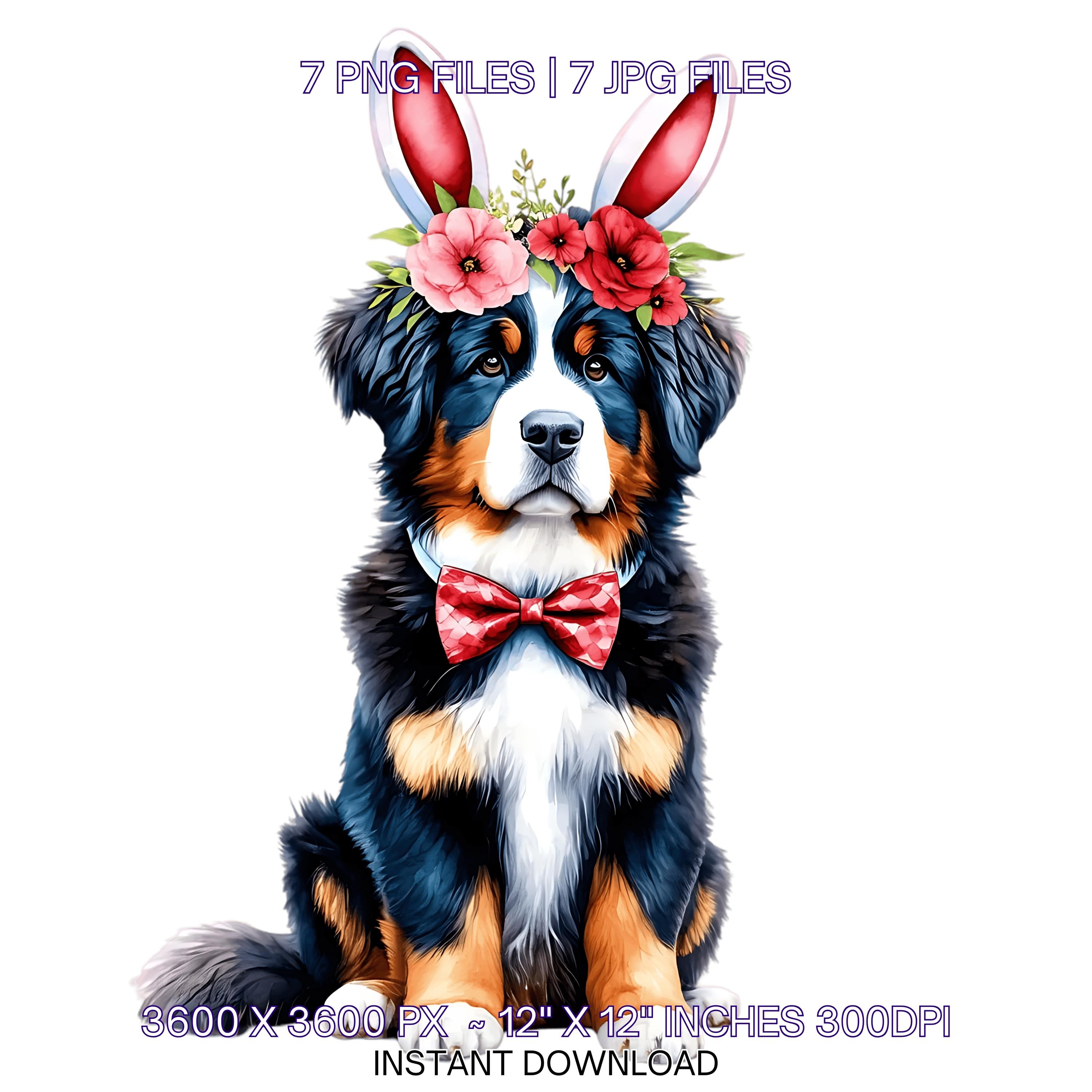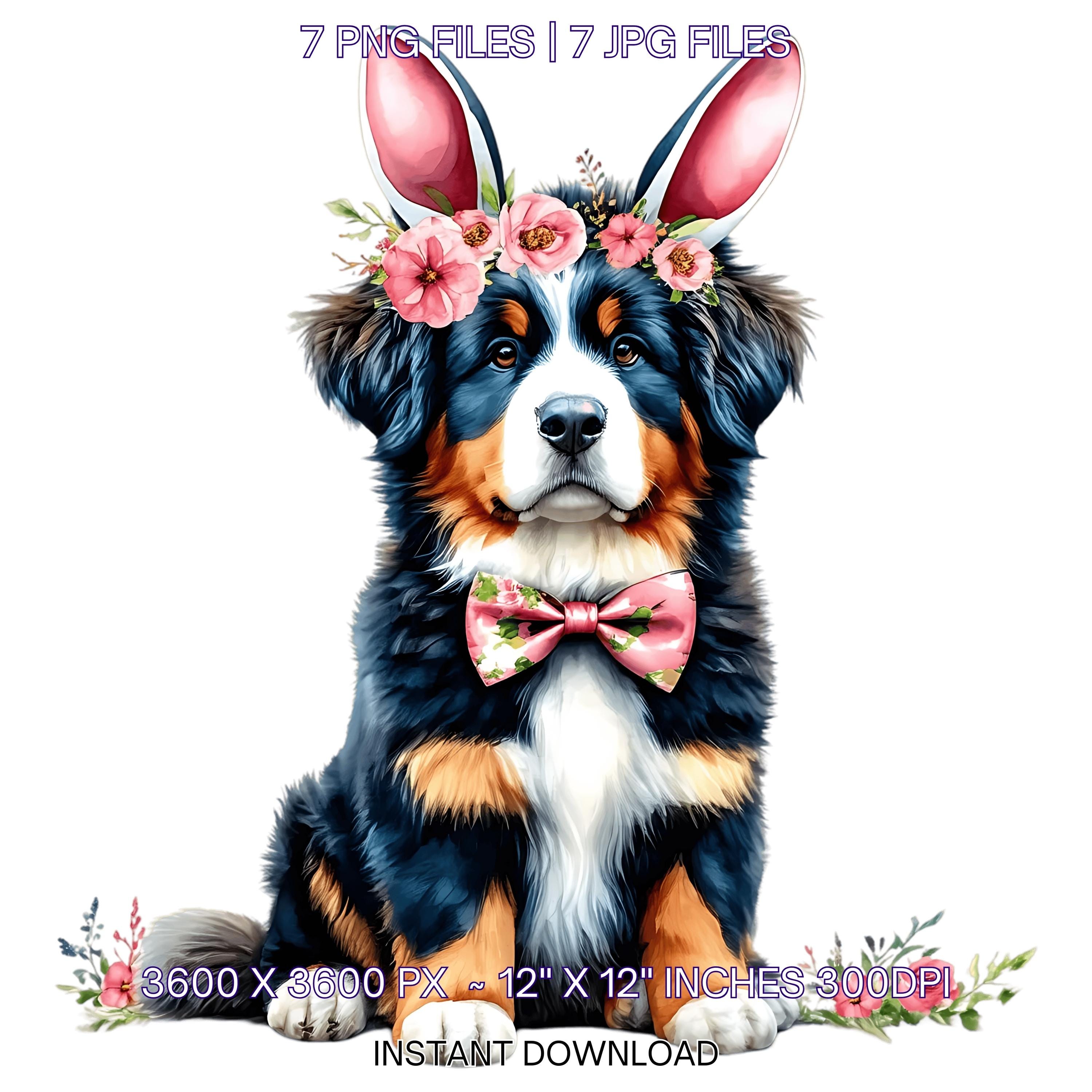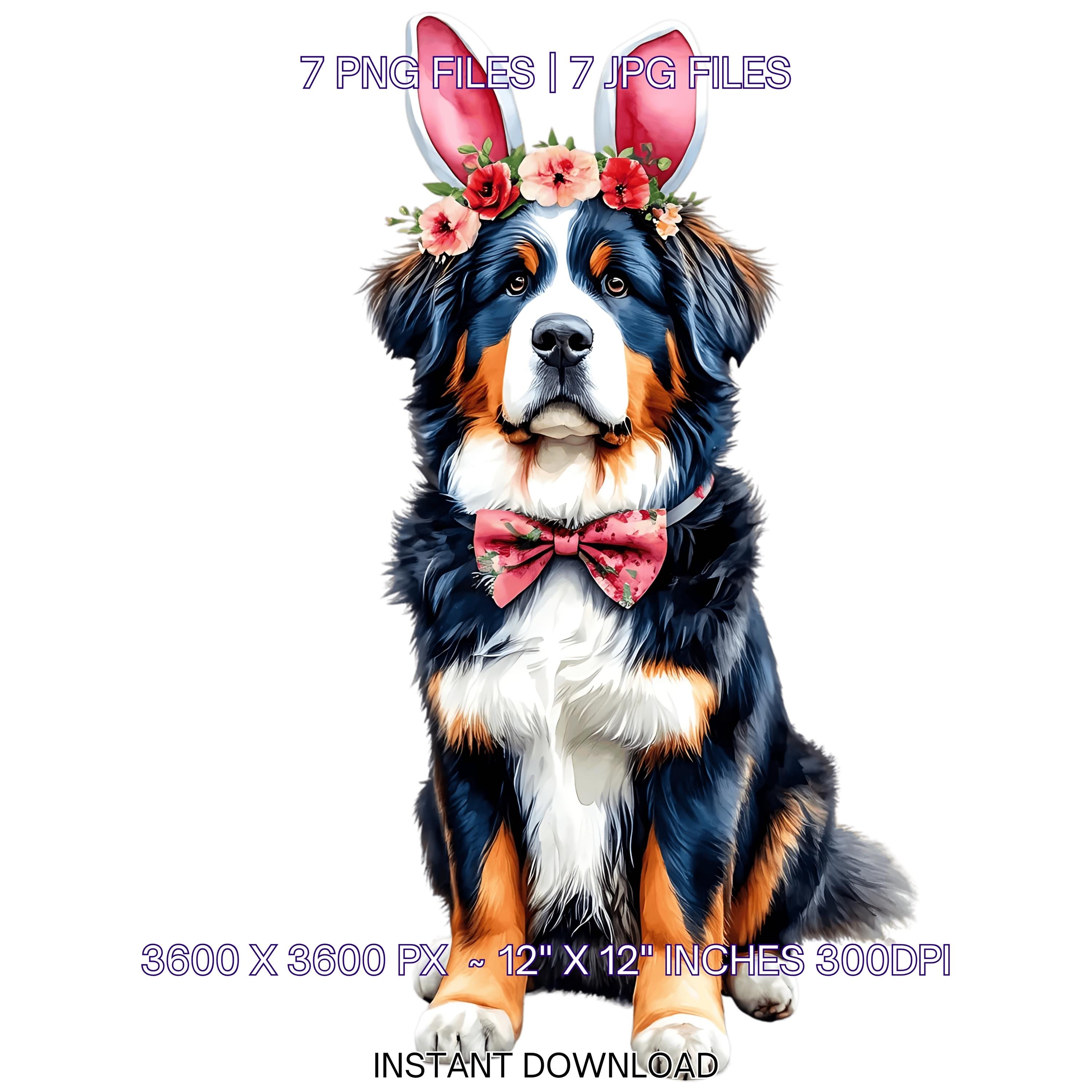 Easter Bernese Mountain Dog Wearing Floral Bow & Bunny Ear Handband Ready for Easter Egg Hunting Clipart PNG, 7 Dog Lover Commercial is an eye-catching, high-resolution digital asset designed for creators, crafters, teachers, and small business owners looking to elevate their visuals.