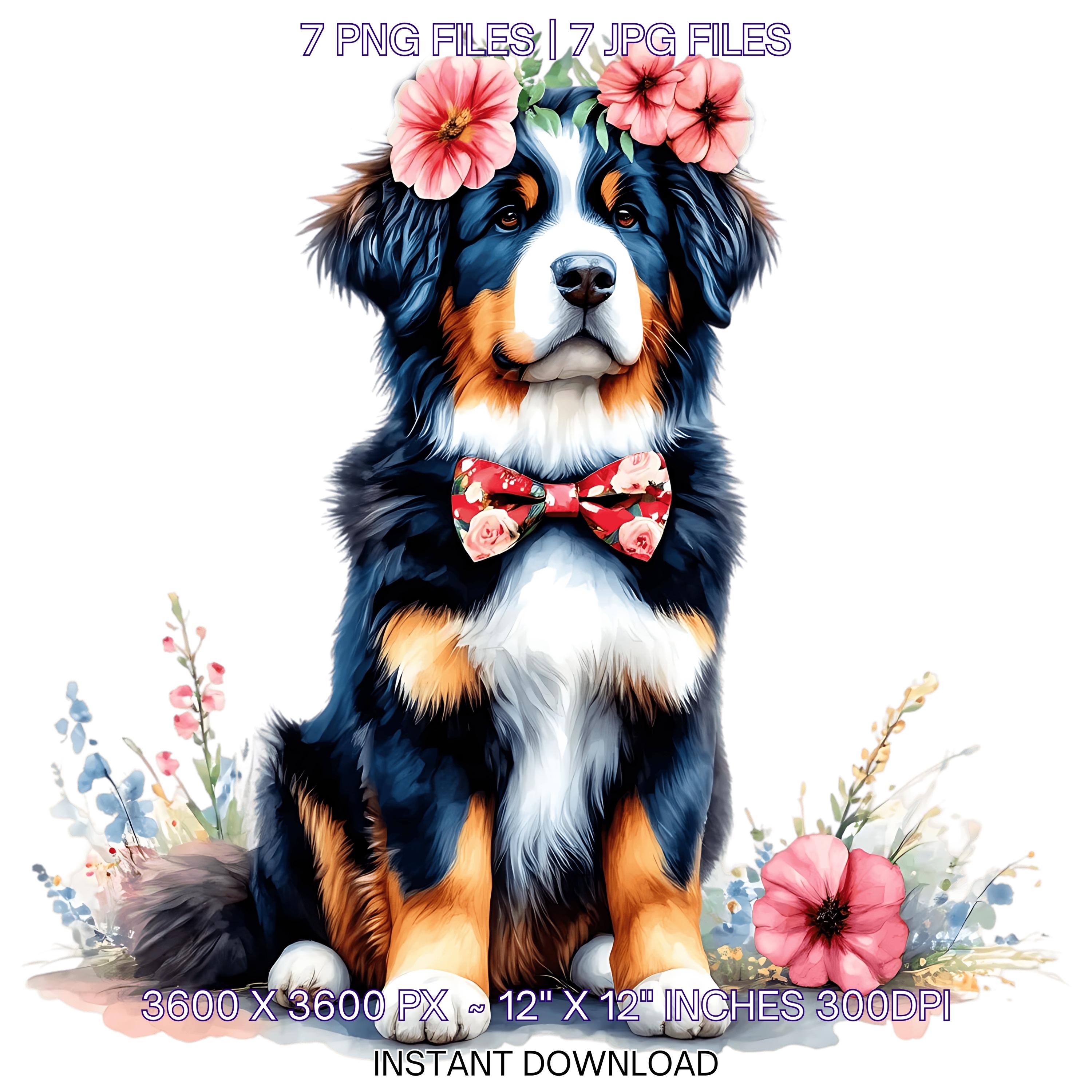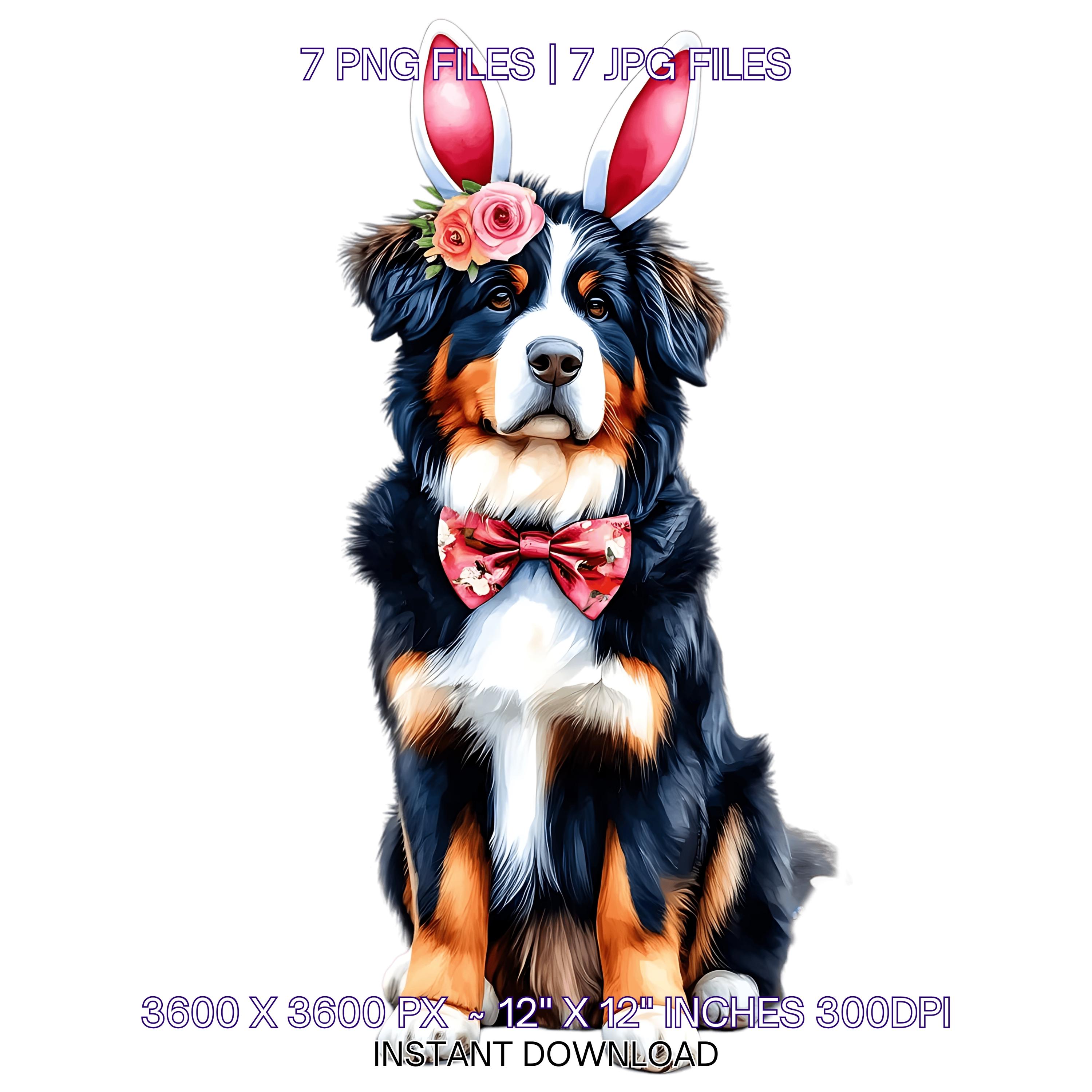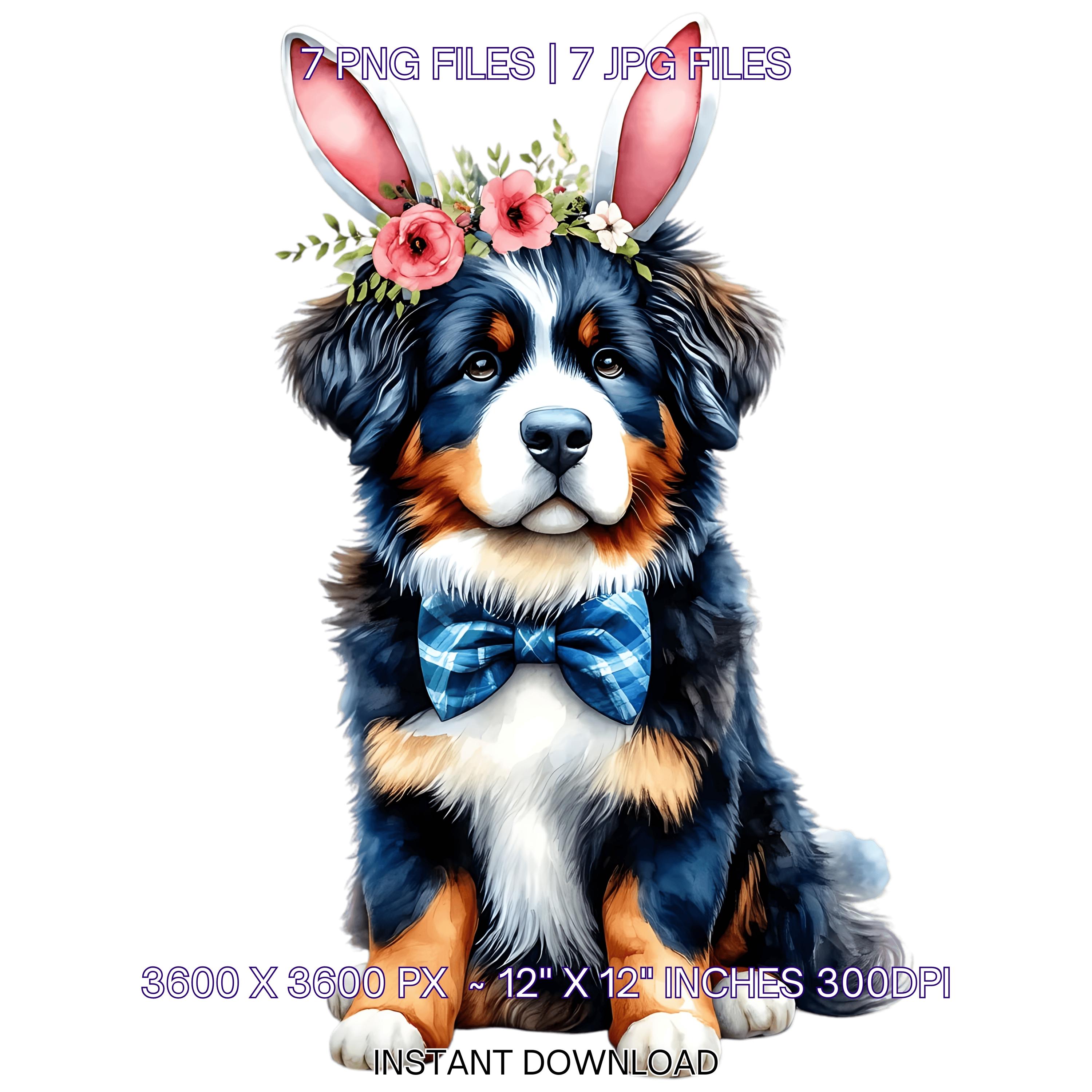 Easter Bernese Mountain Dog Wearing Floral Bow & Bunny Ear Handband Ready for Easter Egg Hunting Clipart PNG, 7 Dog Lover Commercial is an eye-catching, high-resolution digital asset designed for creators, crafters, teachers, and small business owners looking to elevate their visuals.
