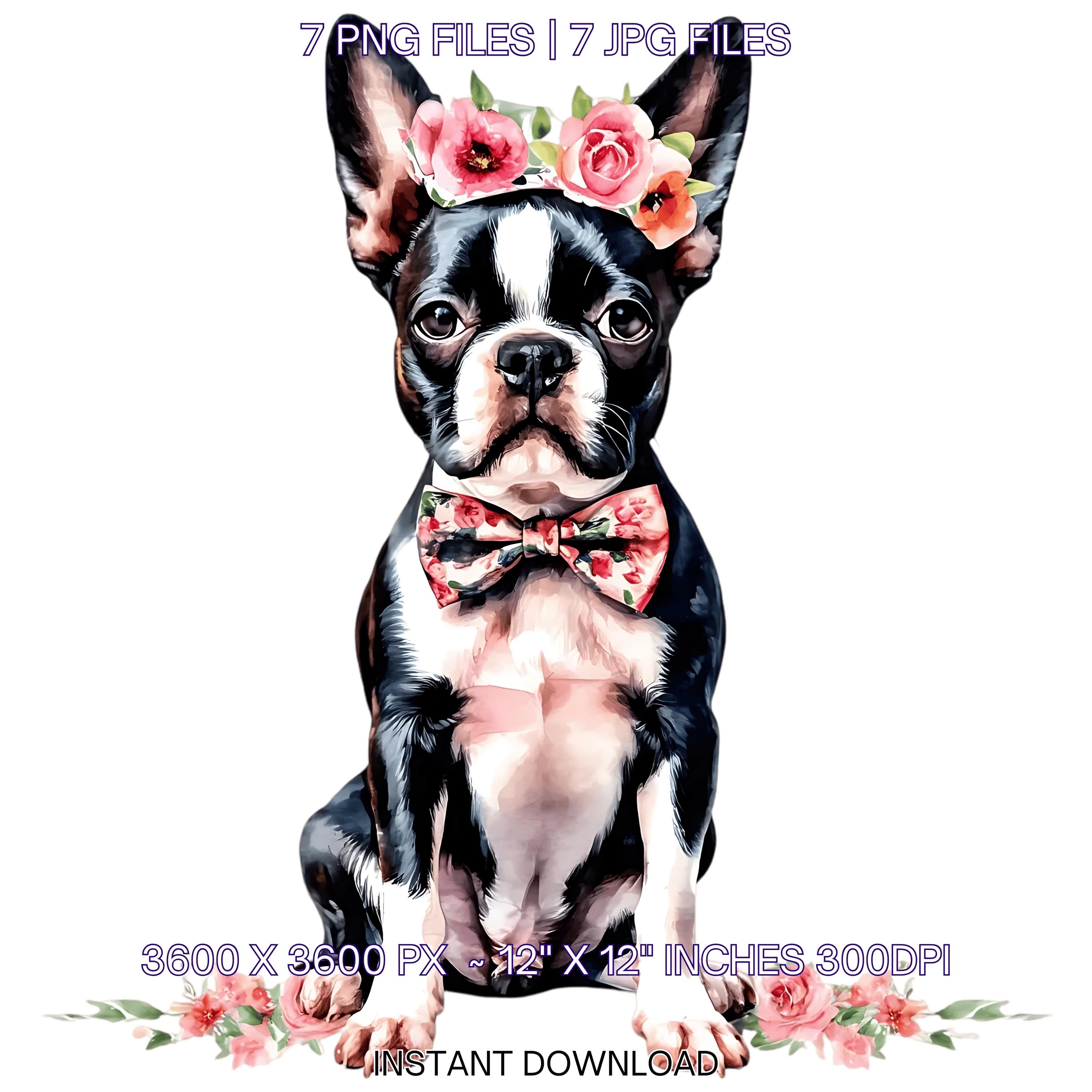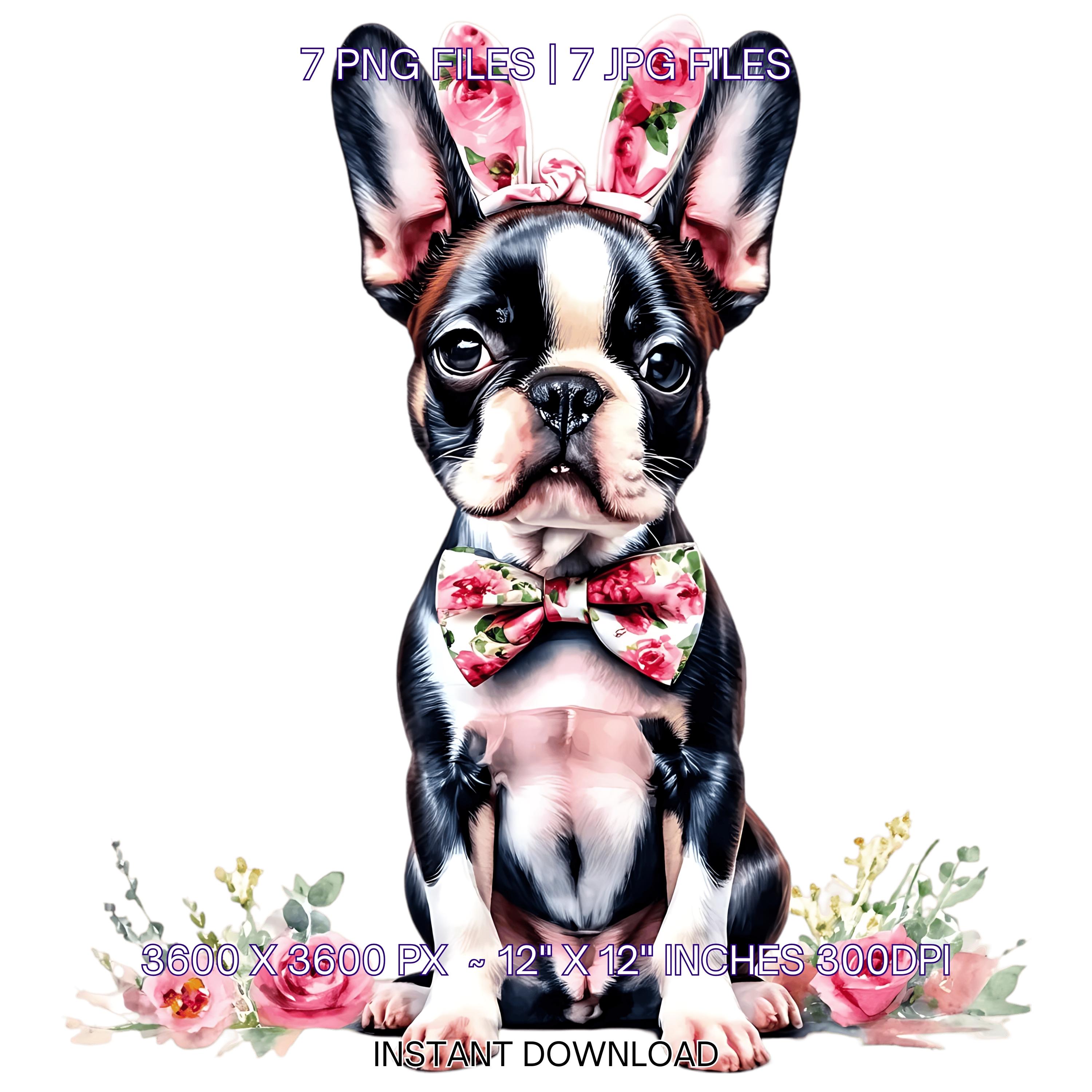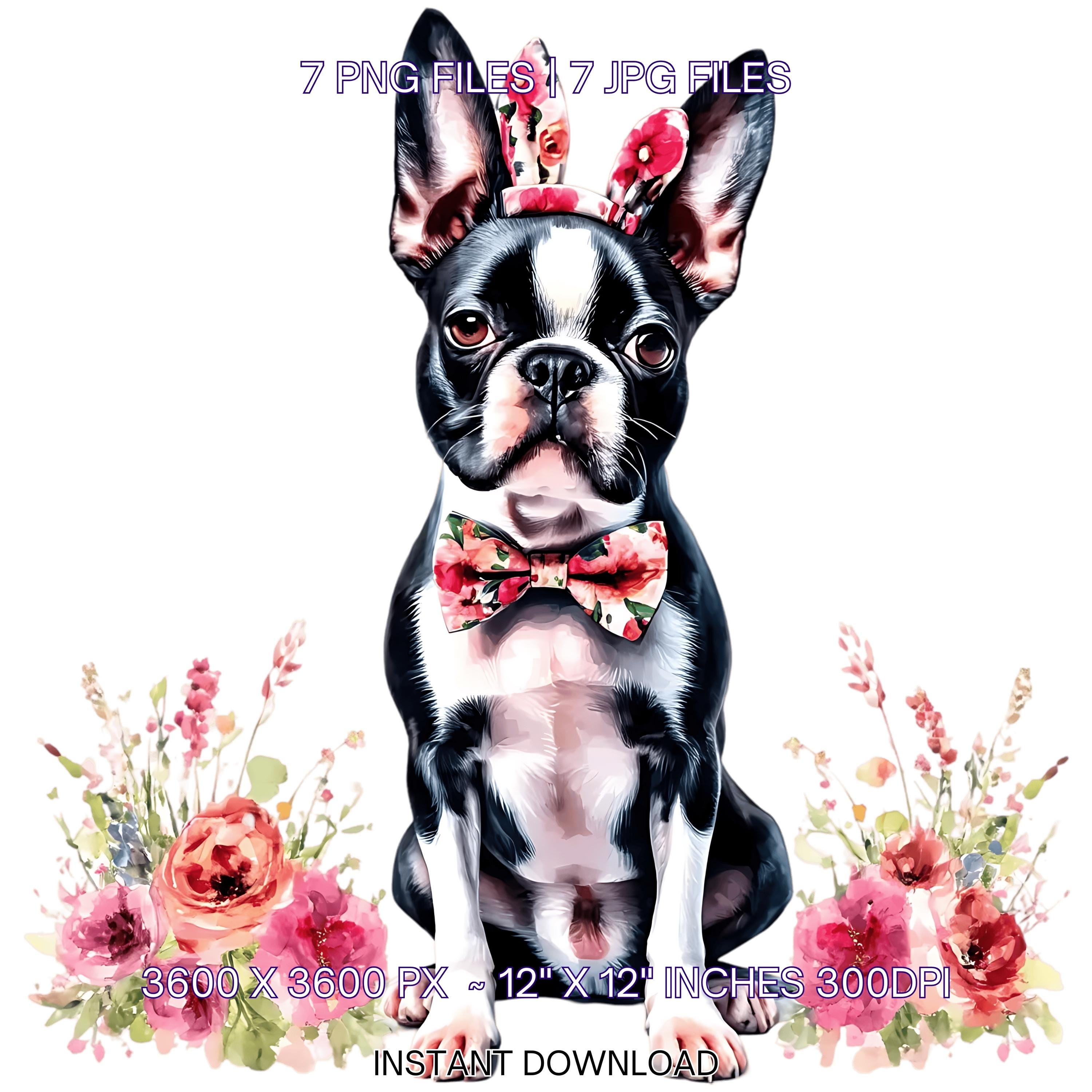 Easter Boston Terrier Dog Wearing Floral Bow & Bunny Ear Handband Ready for Easter Egg Hunting Clip Art PNG | 7 Clip Art | Dog Lover Sublimation Commercial Use
