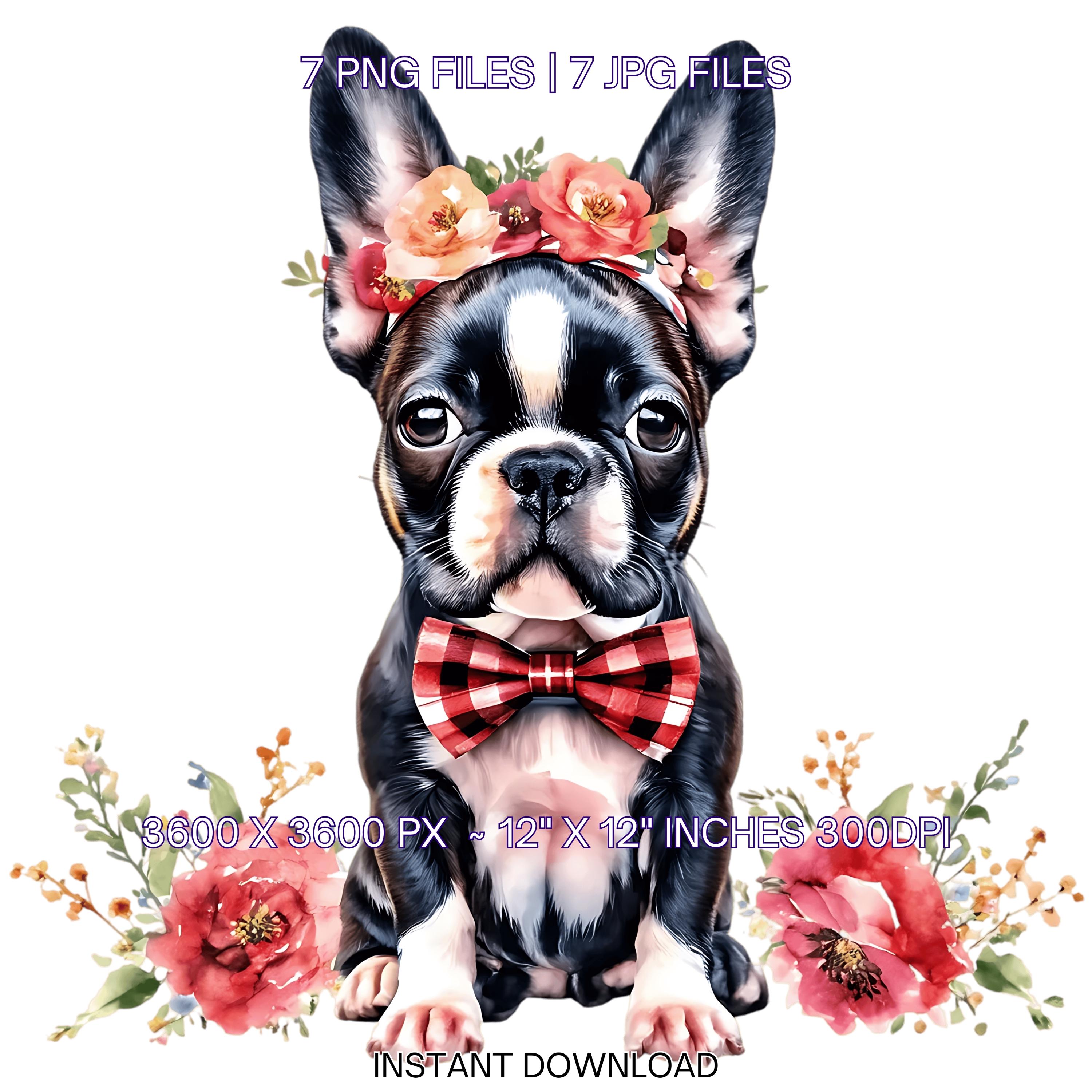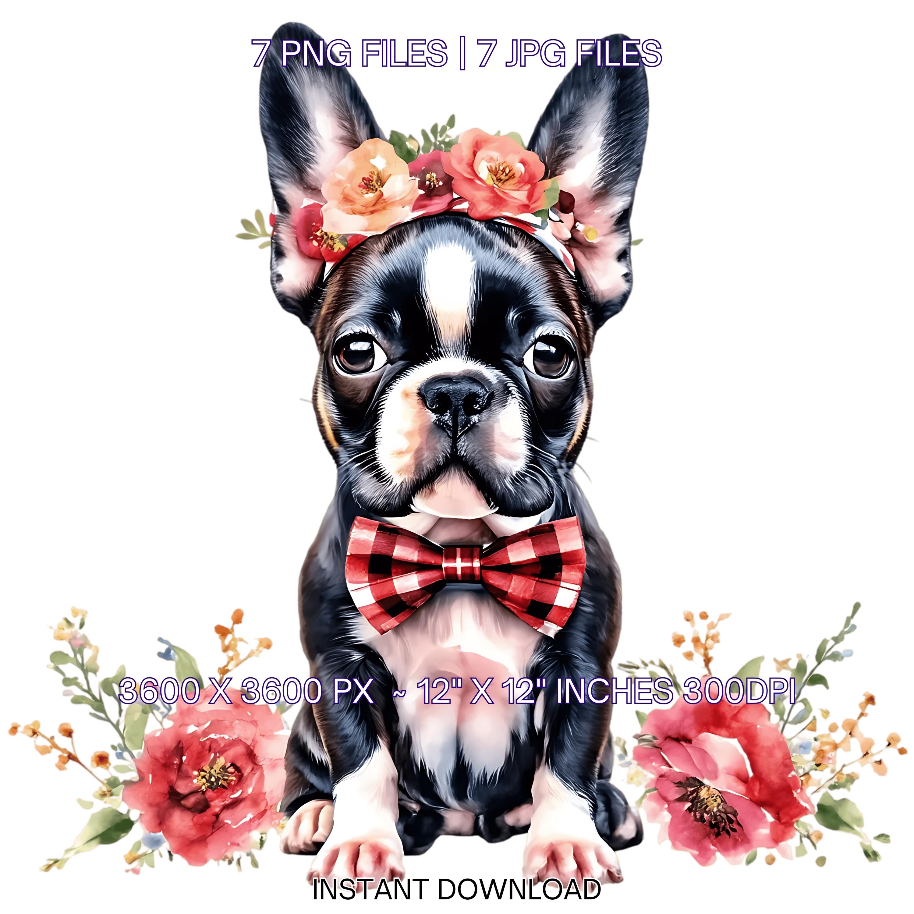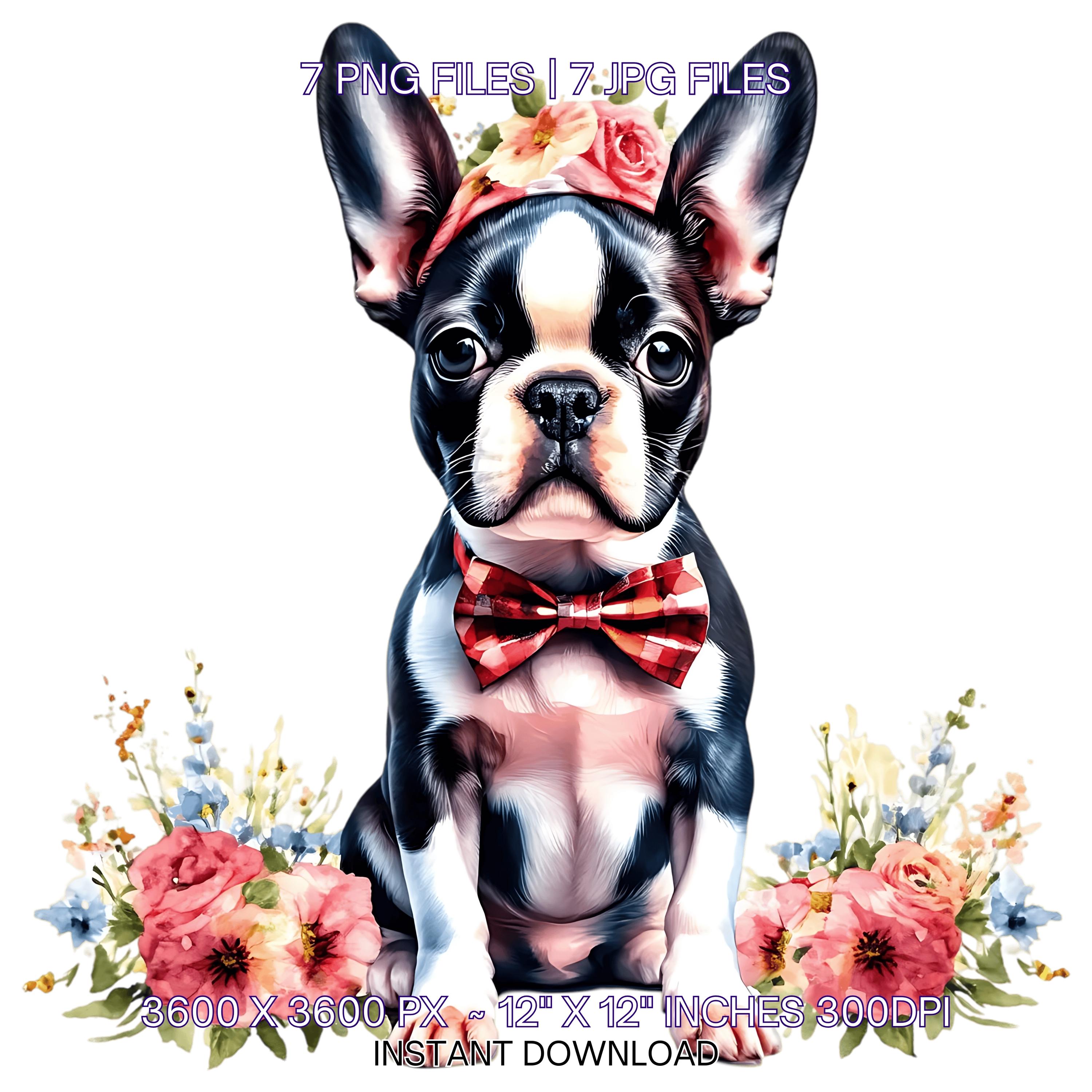 Easter Boston Terrier Dog Wearing Floral Bow & Bunny Ear Handband Ready for Easter Egg Hunting Clip Art PNG | 7 Clip Art | Dog Lover Sublimation Commercial Use