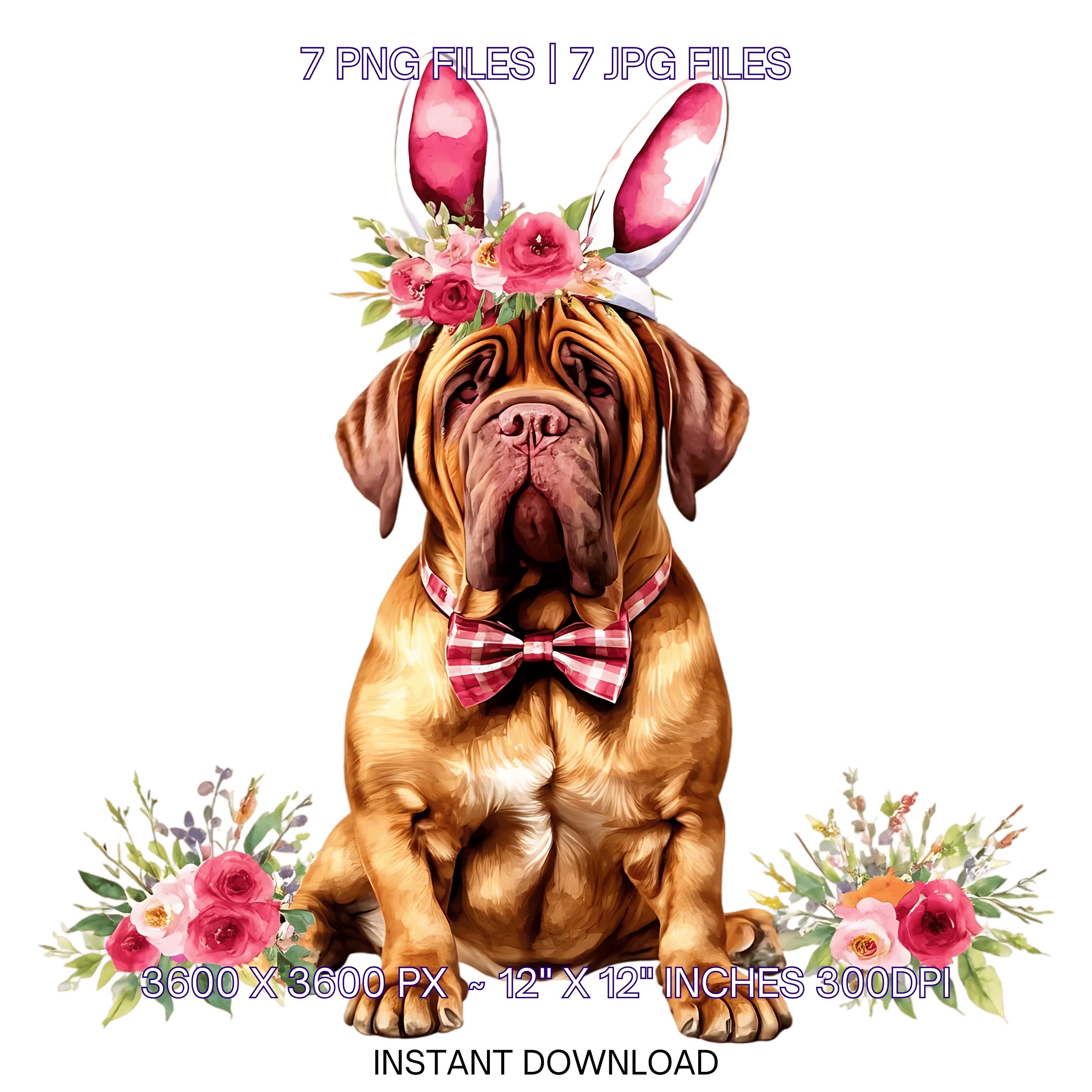 Easter Dogue De Bordeaux Dog Wearing Floral Bow & Bunny Ear Handband Ready for Easter Egg Hunting Clip Art PNG | 7 Clip Art | Dog Lover Sublimation Commercial Use
