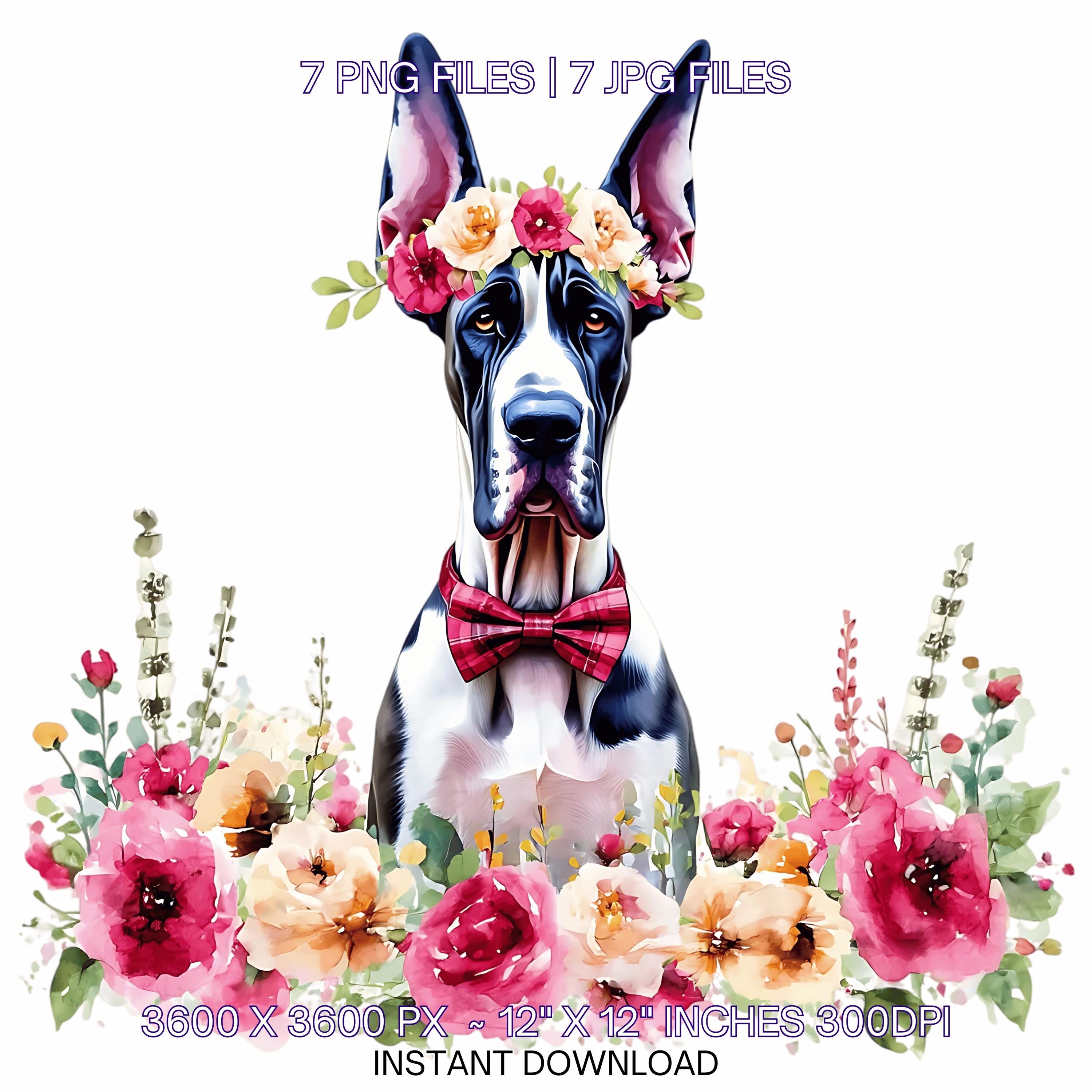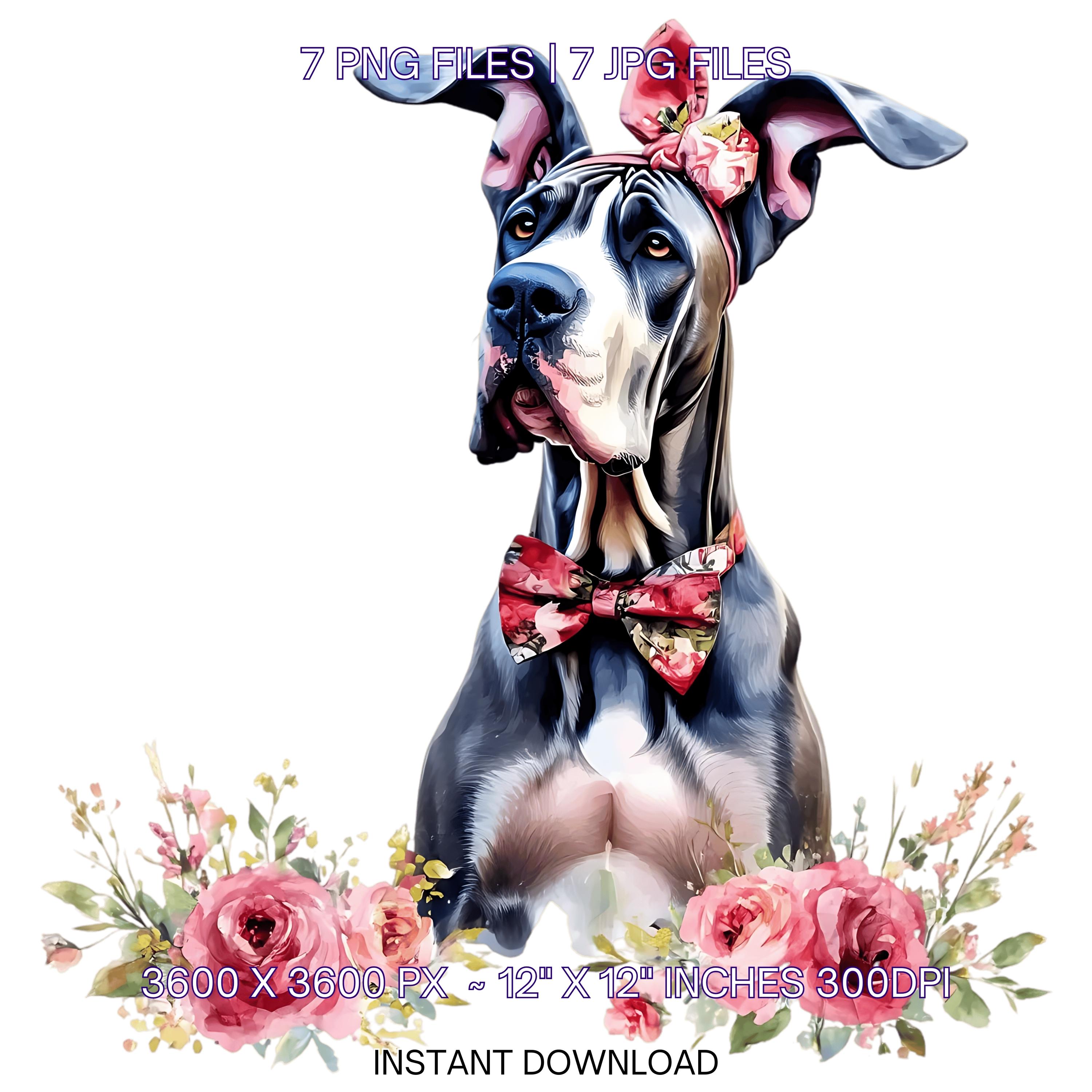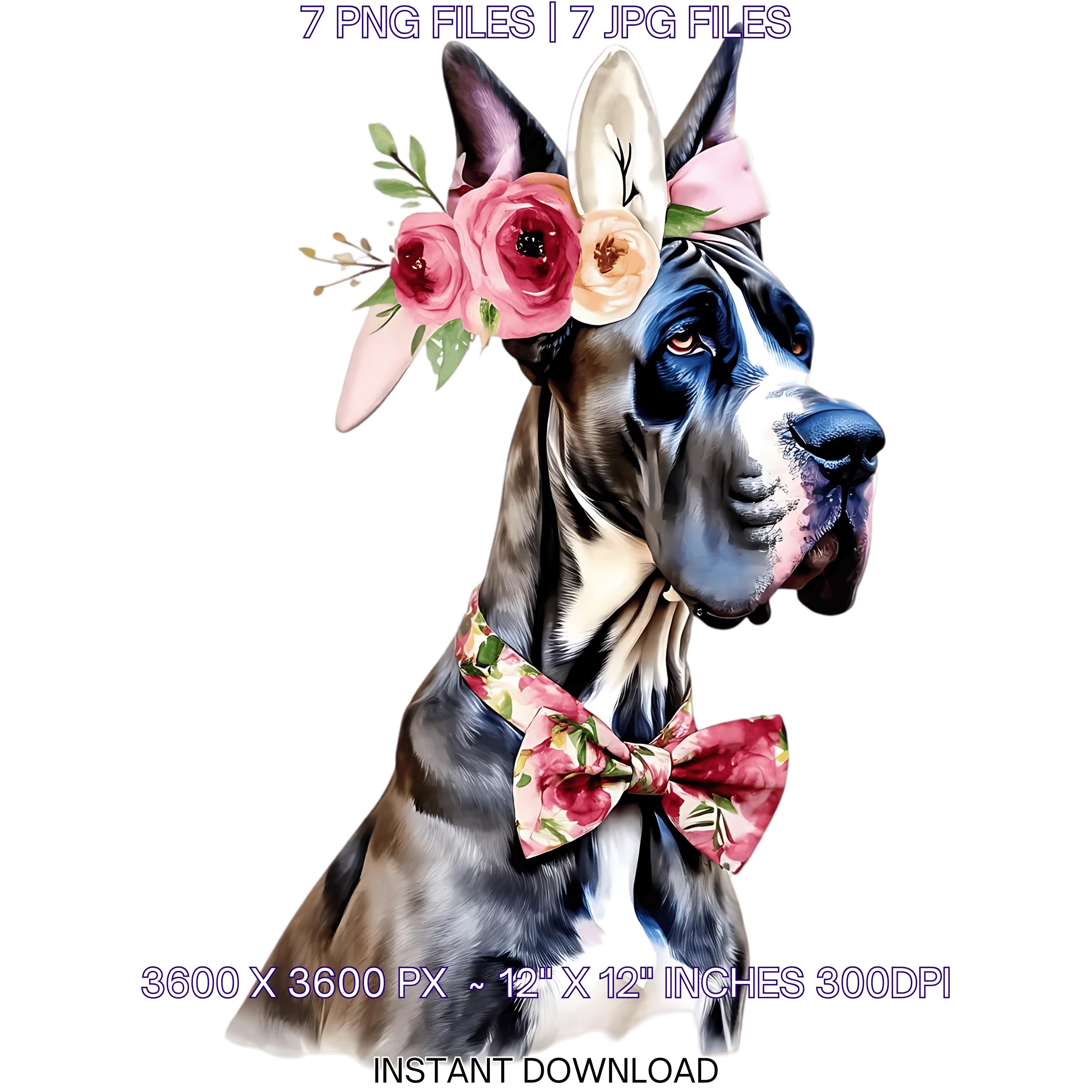 Easter Great Dane Dog Wearing Floral Bow & Bunny Ear Handband Ready for Easter Egg Hunting Clipart PNG, 7 Dog Lover Commercial is an eye-catching, high-resolution digital asset designed for creators, crafters, teachers, and small business owners looking to elevate their visuals.