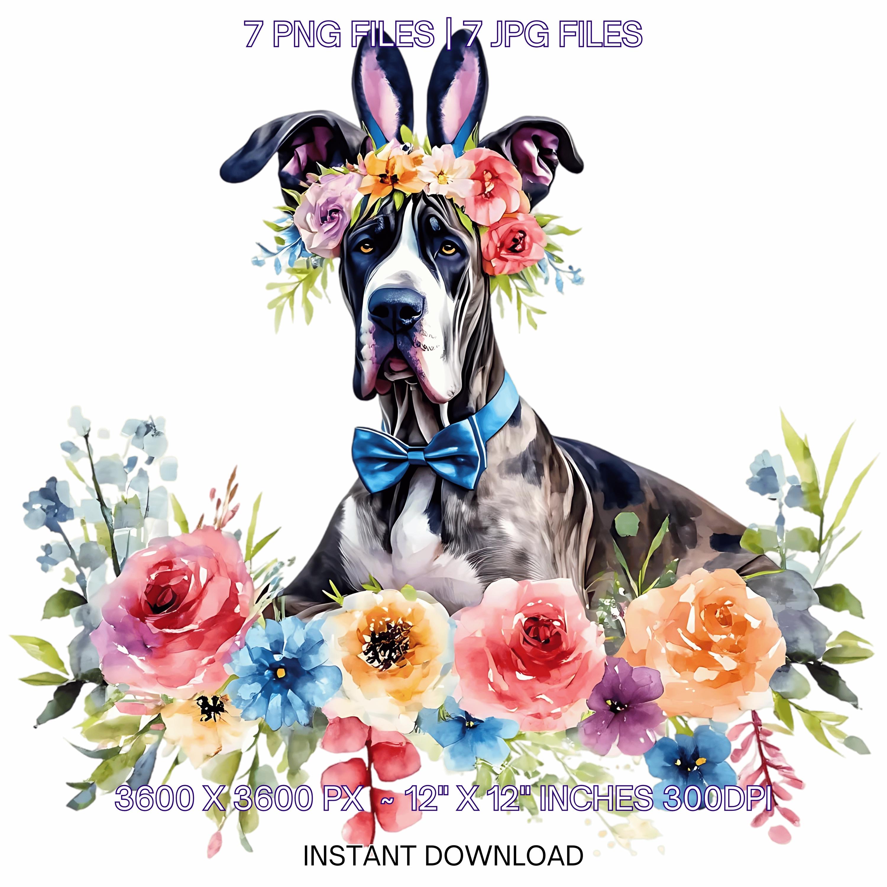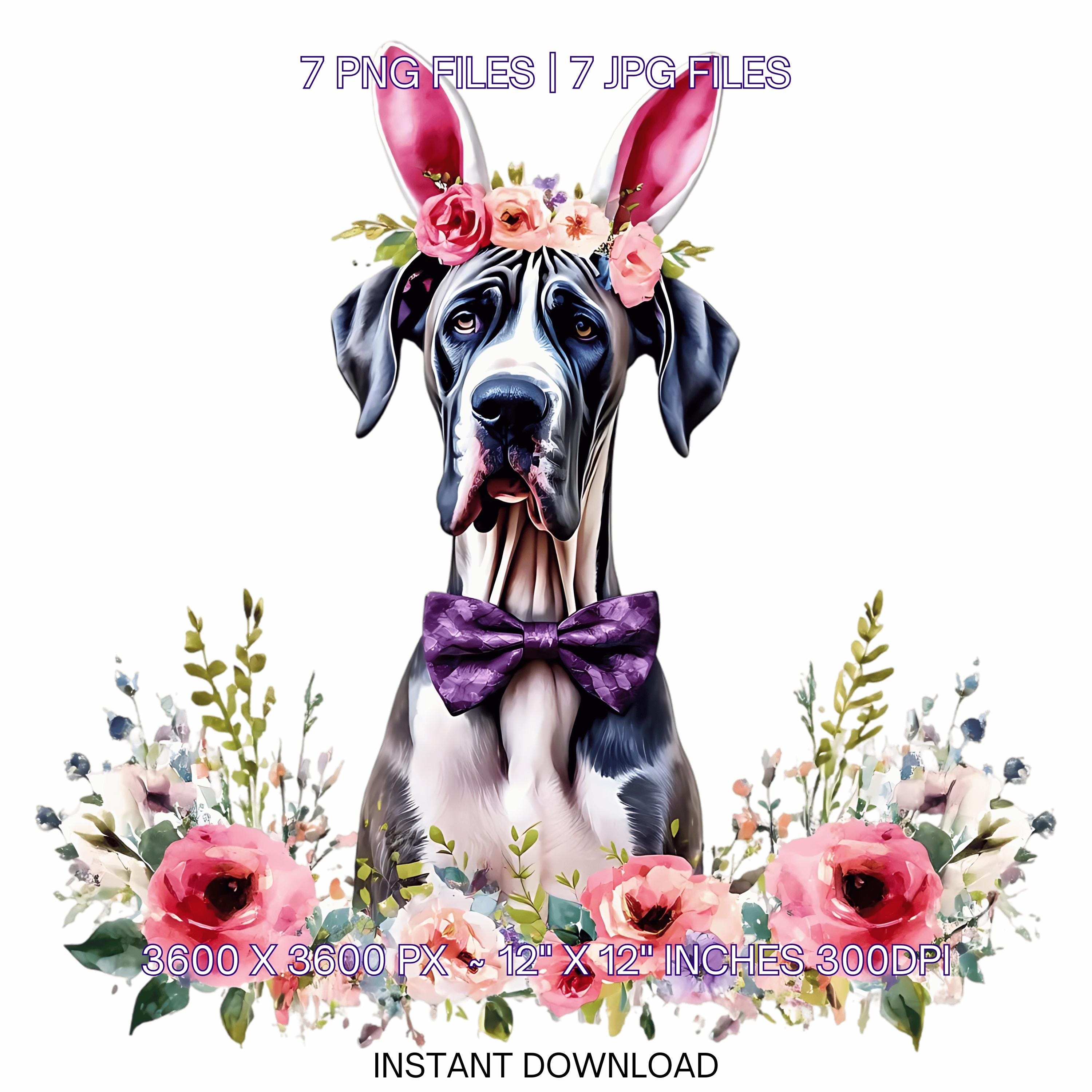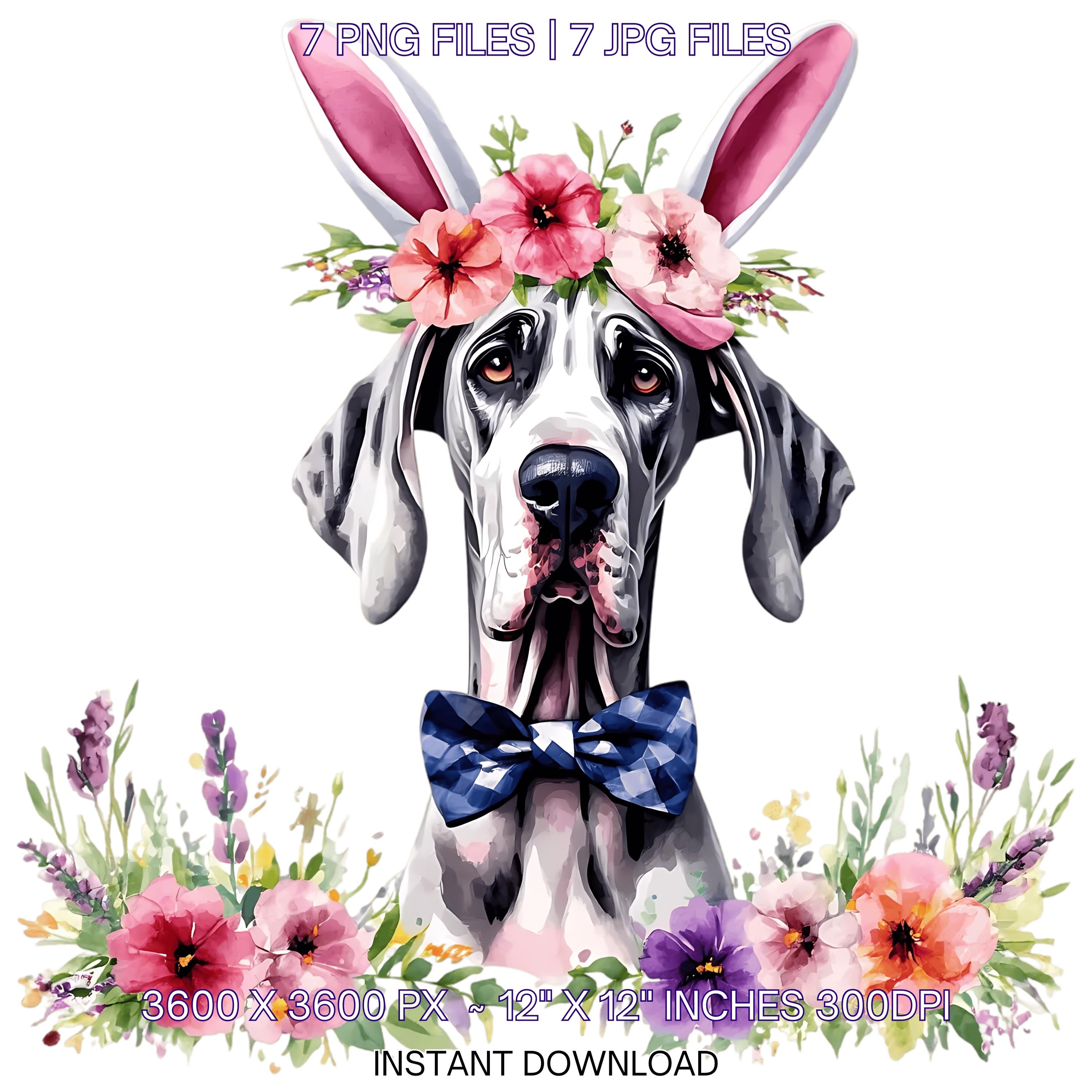 Easter Great Dane Dog Wearing Floral Bow & Bunny Ear Handband Ready for Easter Egg Hunting Clipart PNG, 7 Dog Lover Commercial – Instant Digital Download - TumblersGalaxy