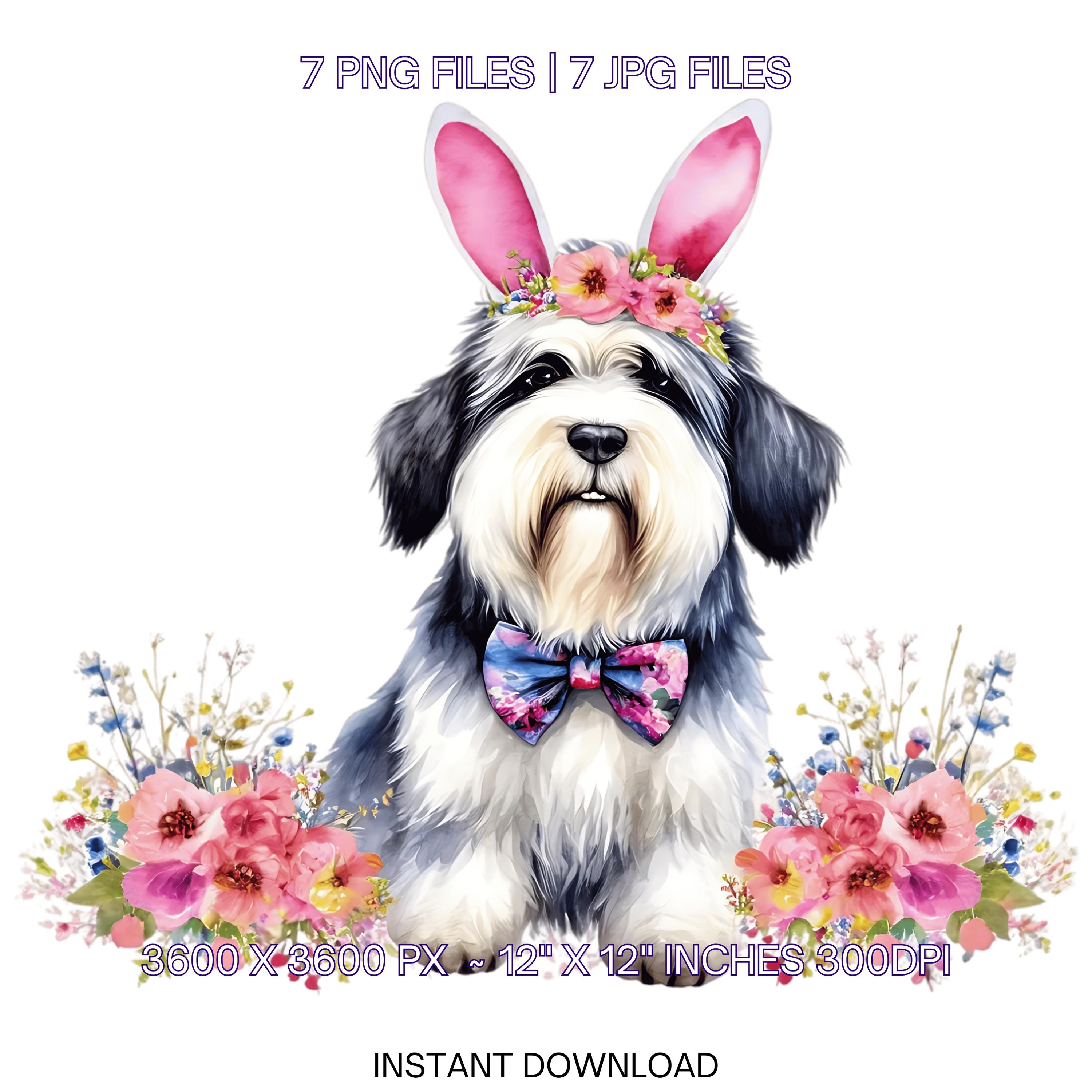 Easter Old English Sheep Dog Wearing Floral Bow & Bunny Ear Handband Ready for Easter Egg Hunting Clipart PNG, 7 Dog Lover Commercial – Instant Digital Download - TumblersGalaxy