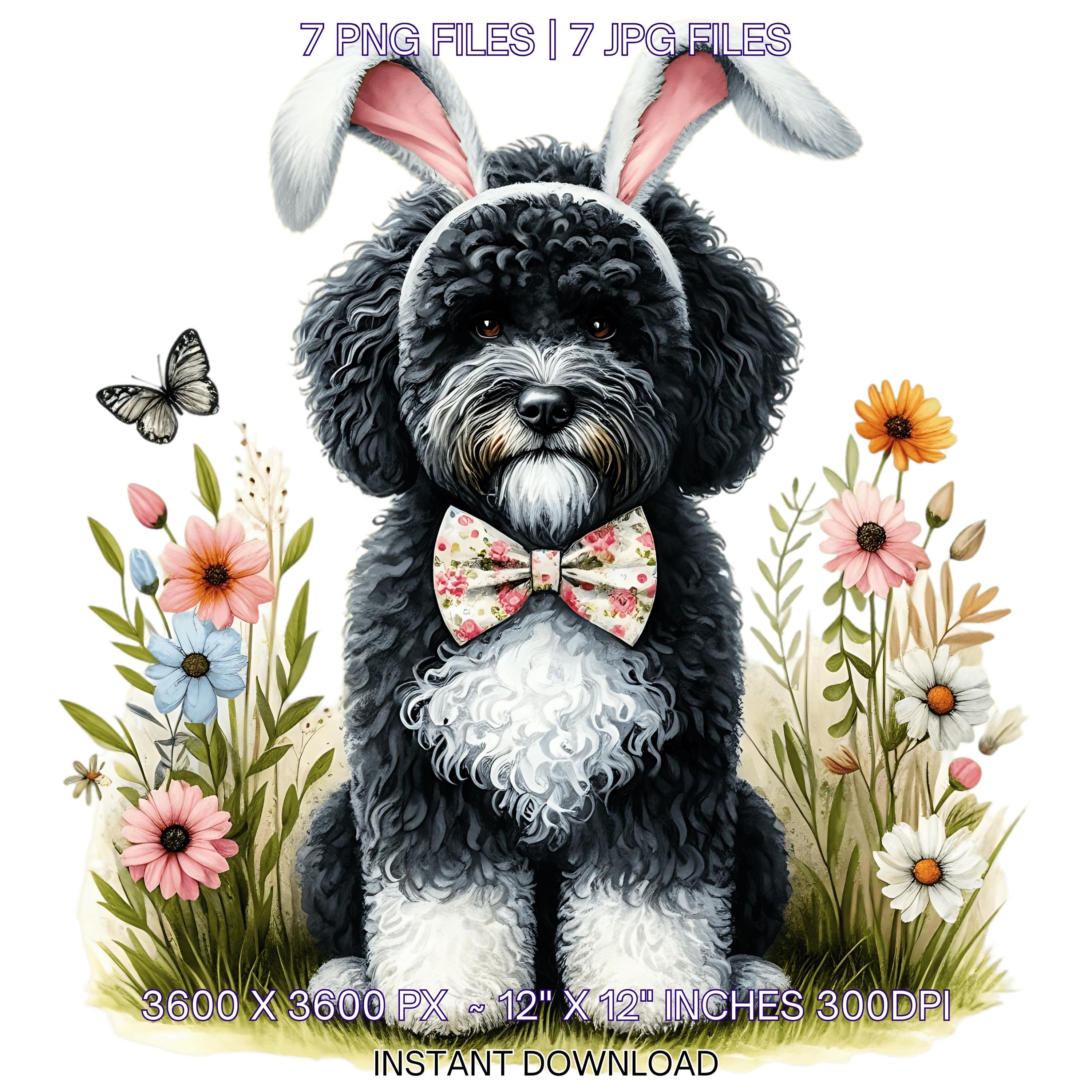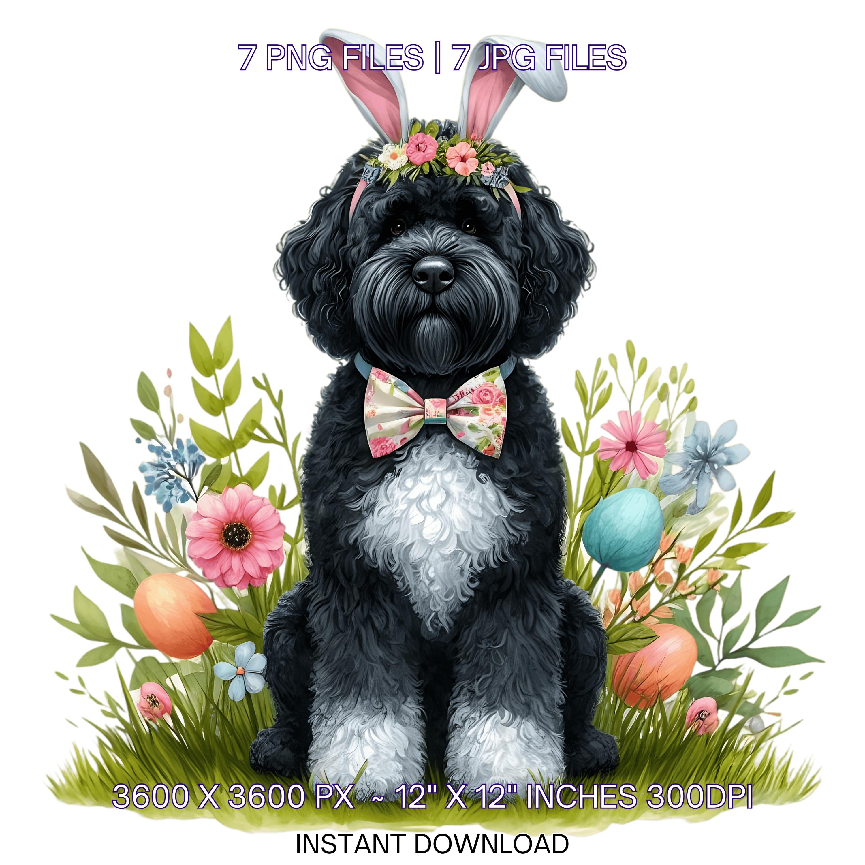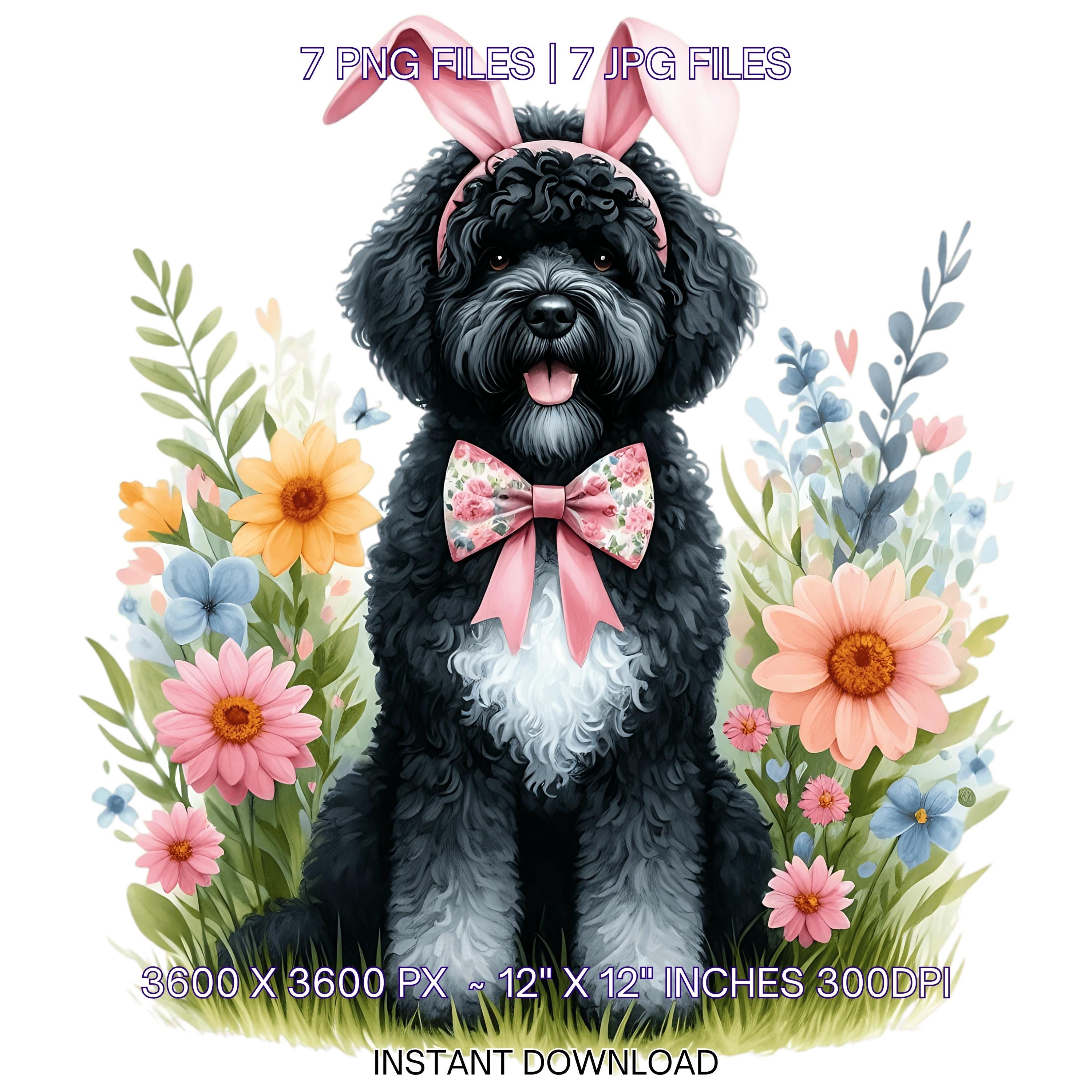 Easter Portuguese Water Dog Wearing Floral Bow & Bunny Ear Handband Ready for Easter Egg Hunting Clipart PNG, 7 Dog Lover Commercial Use is an eye-catching, high-resolution digital asset designed for creators, crafters, teachers, and small business owners looking to elevate their visuals.