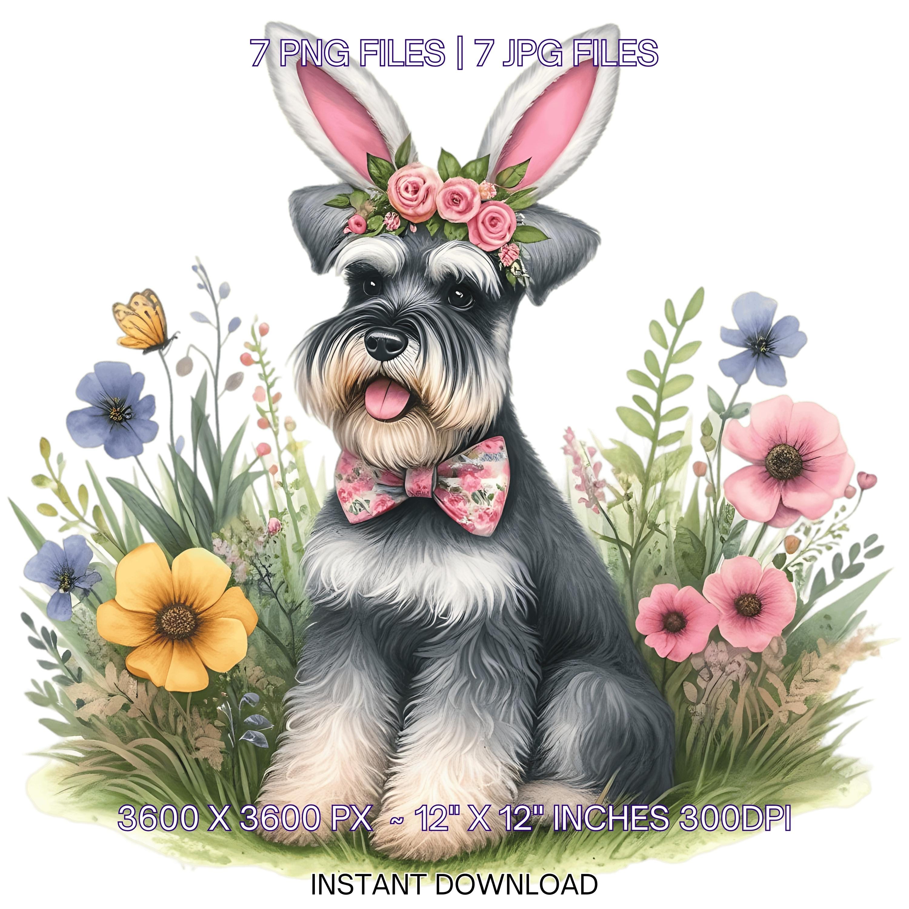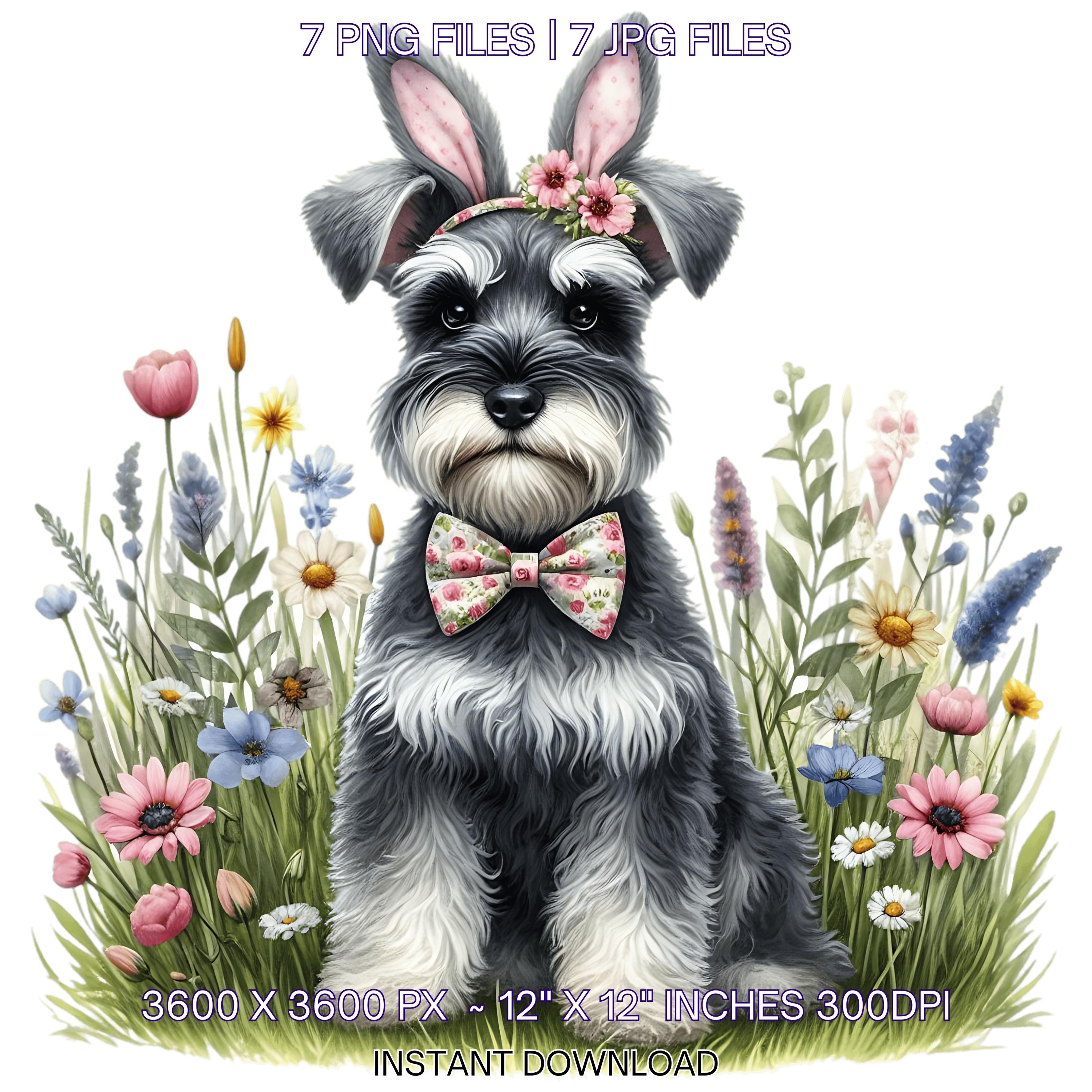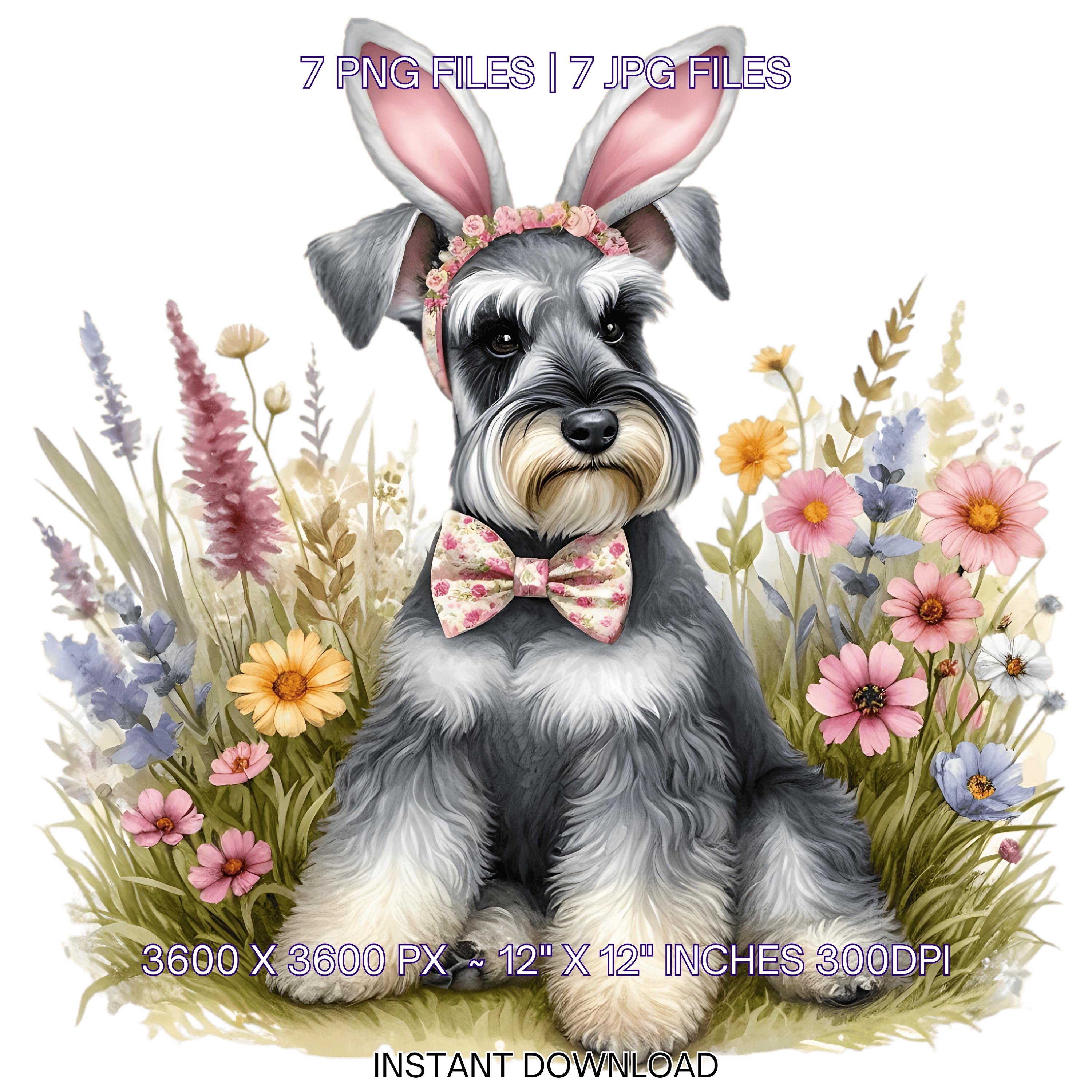 Easter Schnauzer Dog Wearing Floral Bow & Bunny Ear Handband Ready for Easter Egg Hunting Clip Art PNG | 7 Clip Art | Dog Lover Sublimation Commercial Use