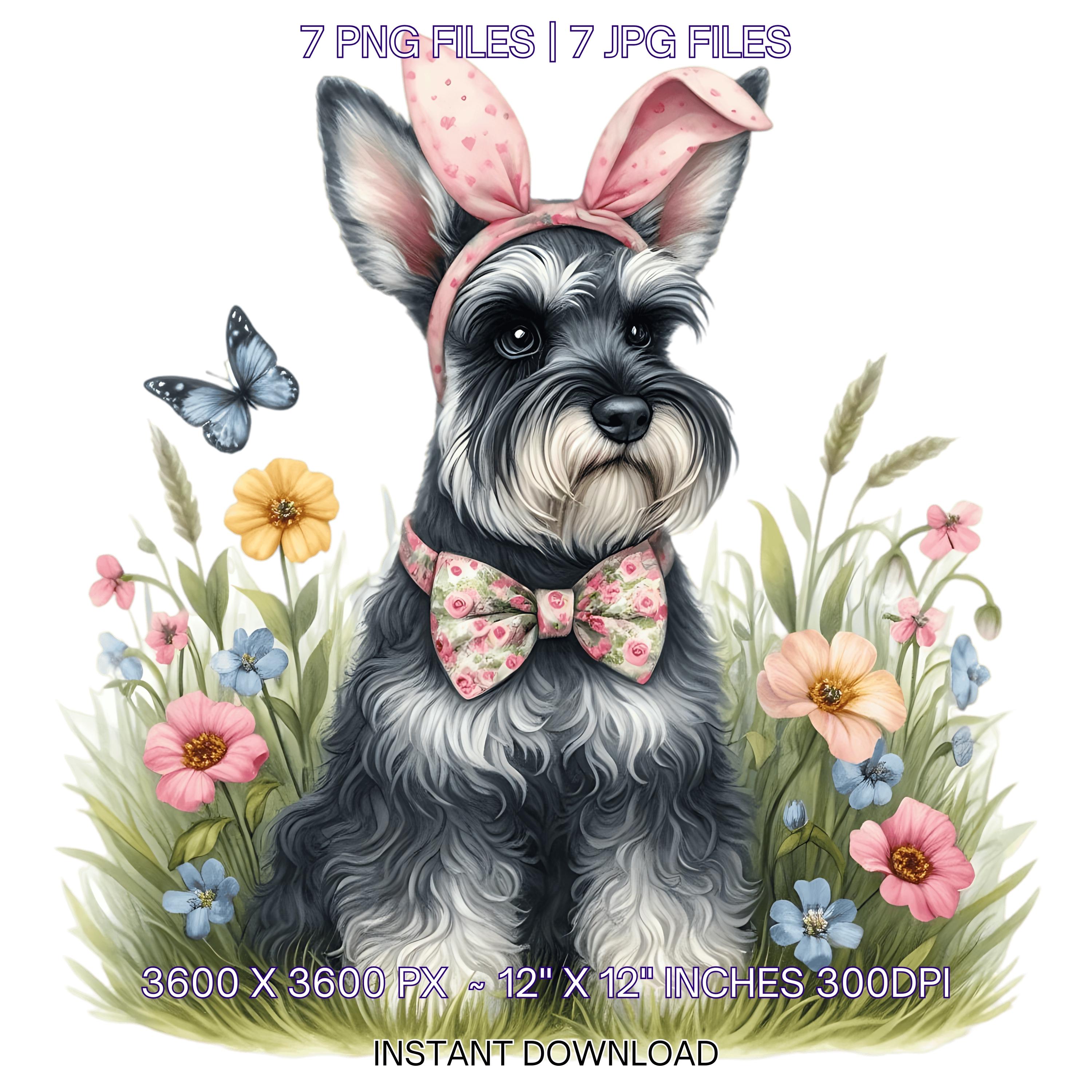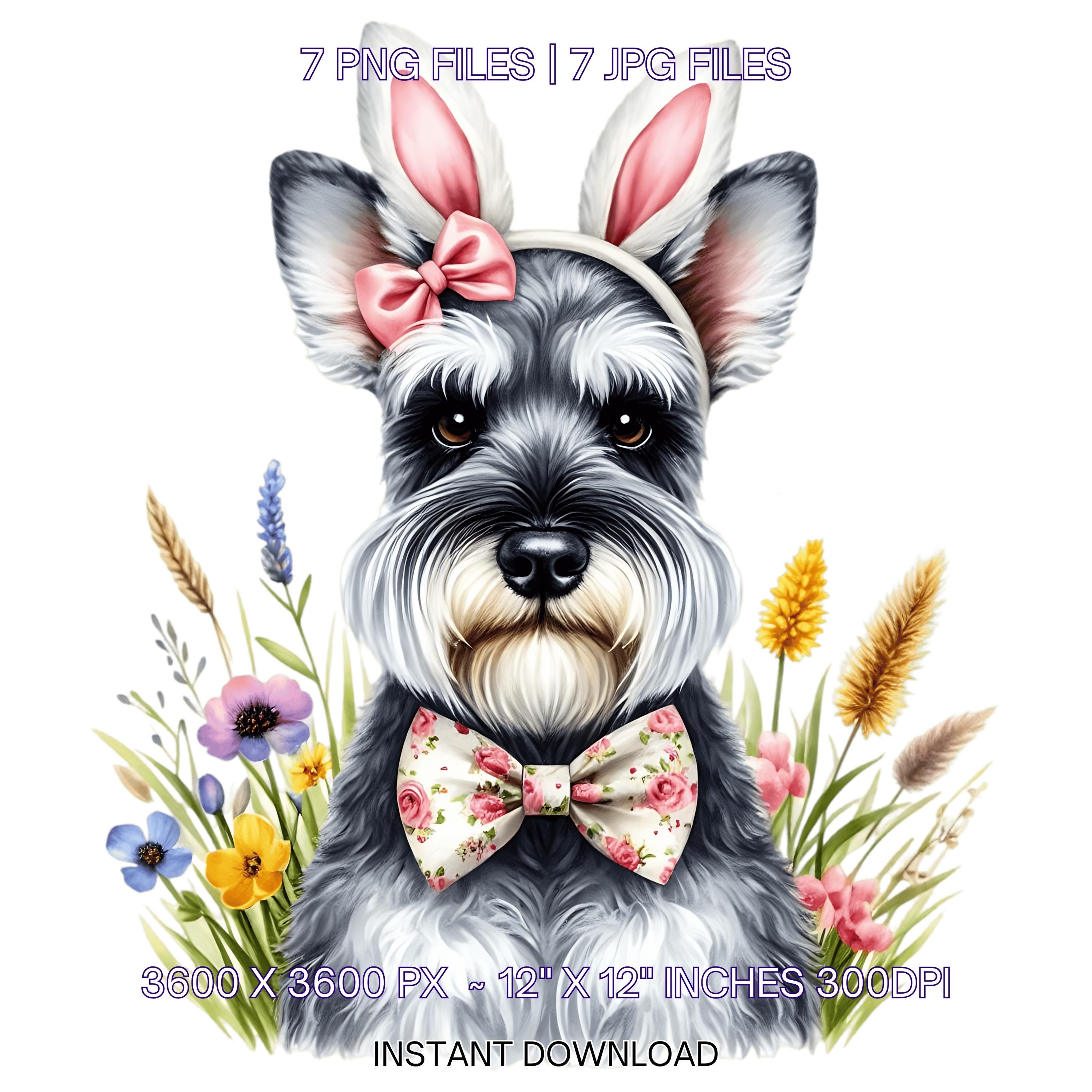 Easter Schnauzer Dog Wearing Floral Bow & Bunny Ear Handband Ready for Easter Egg Hunting Clipart PNG, 7 Dog Lover Commercial Use is an eye-catching, high-resolution digital asset designed for creators, crafters, teachers, and small business owners looking to elevate their visuals.