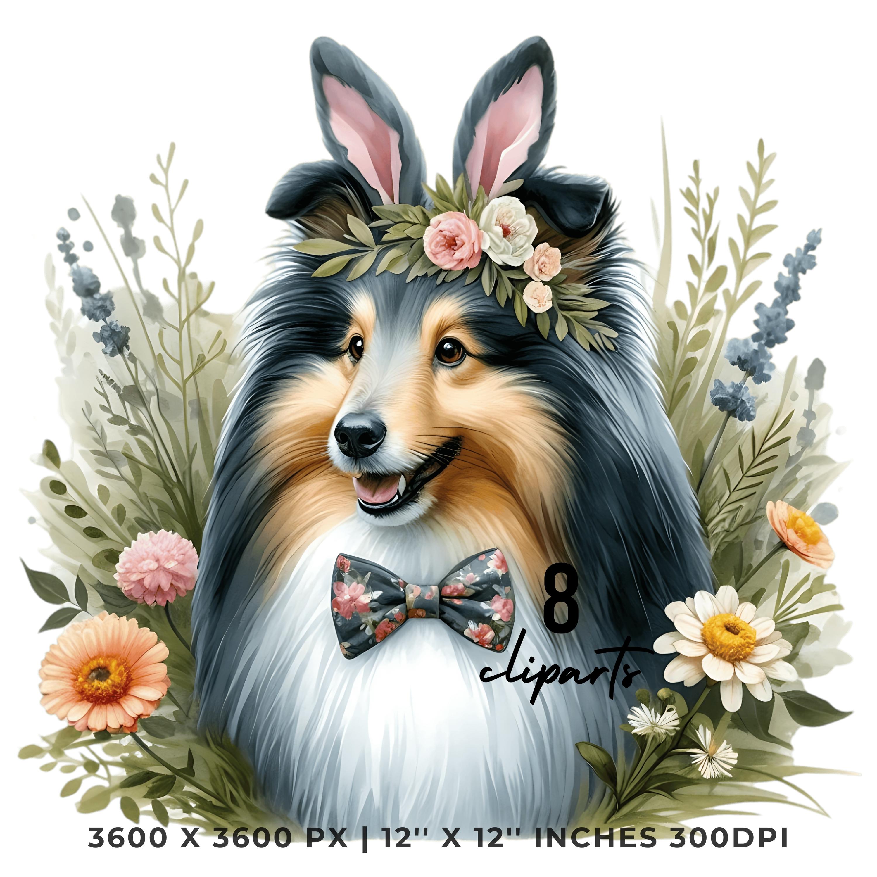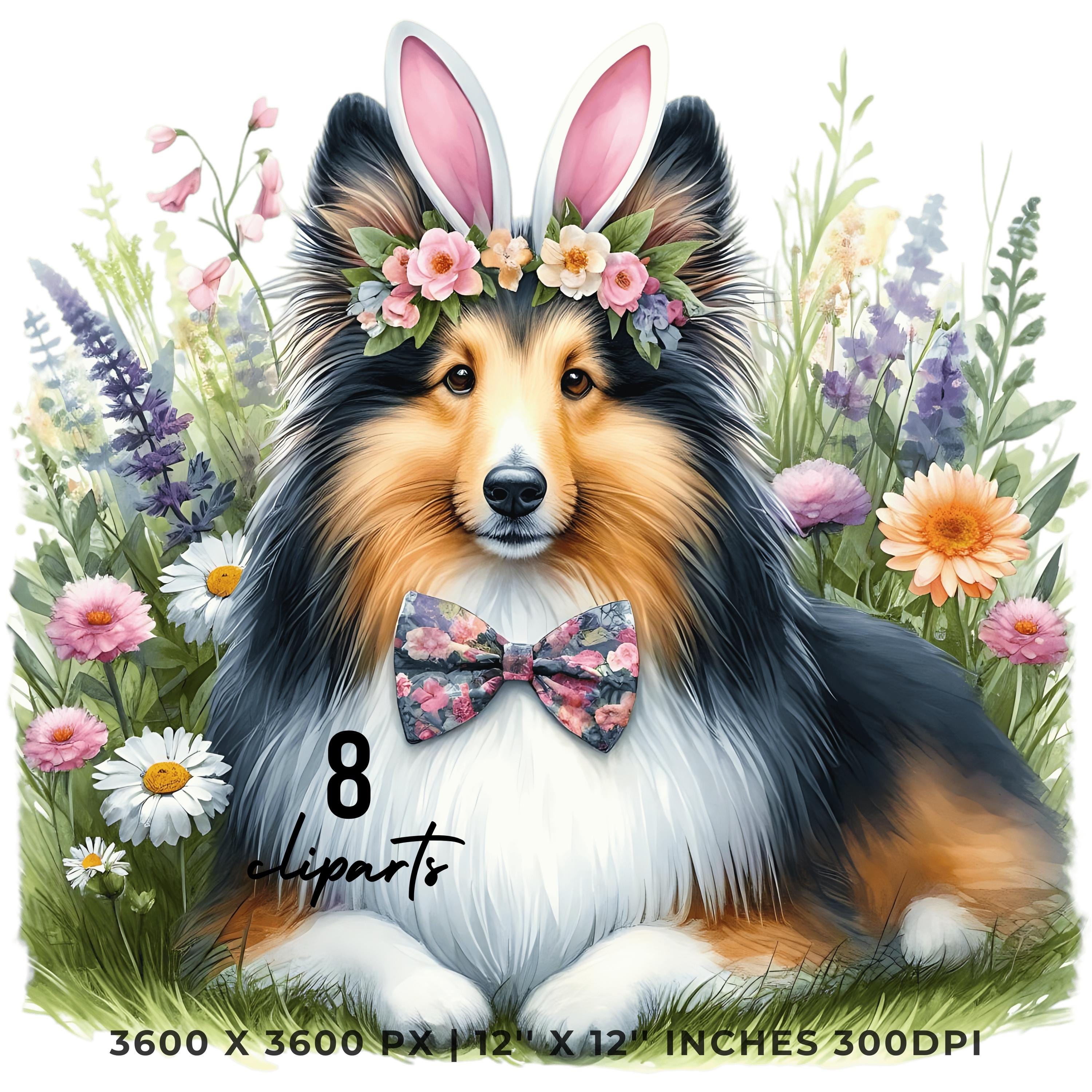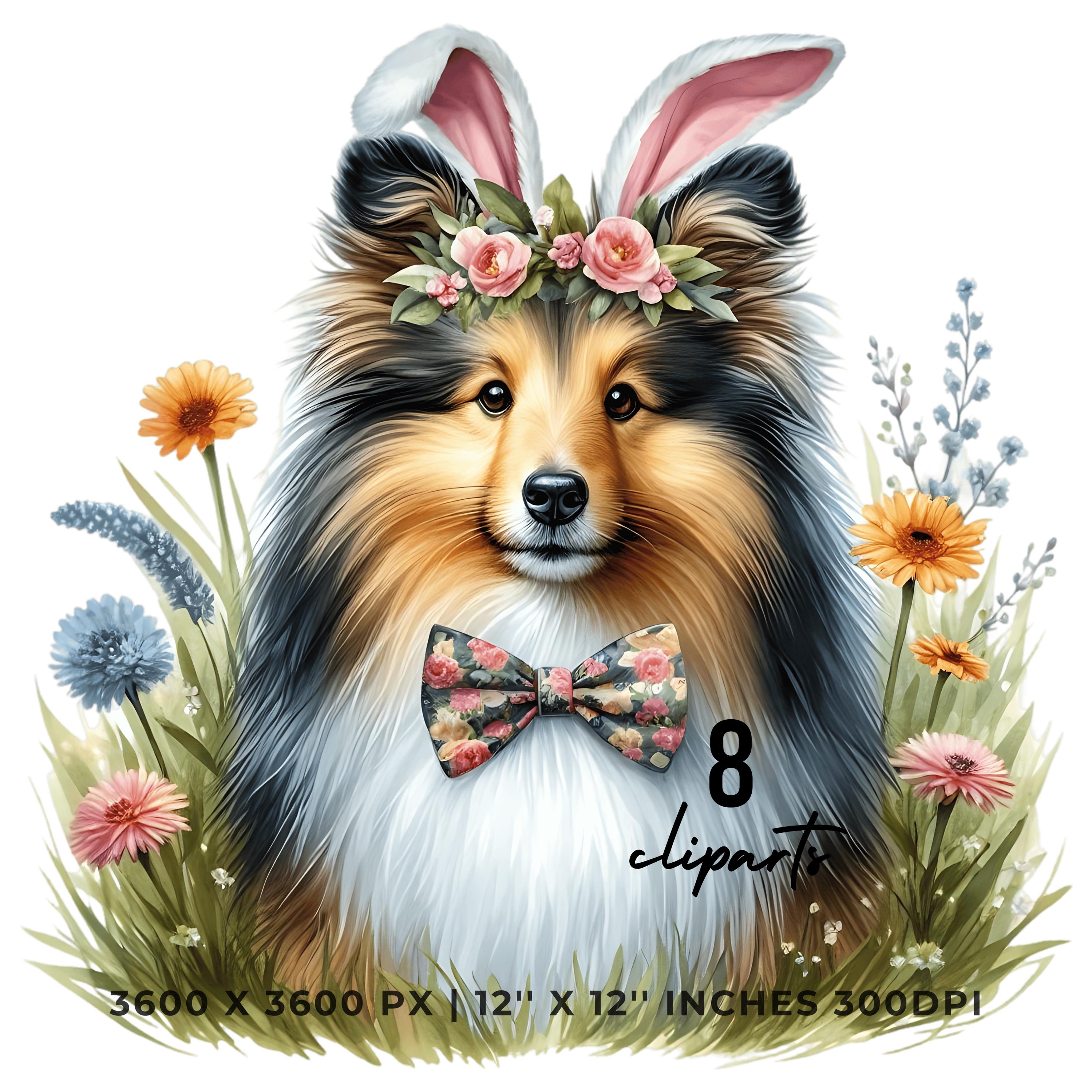 Easter Shetland Sheepdog Dog Wearing Floral Bow & Bunny Ear Handband Ready for Easter Egg Hunting Clip Art PNG | 8 Clip Art | Dog Lover Sublimation Commercial Use