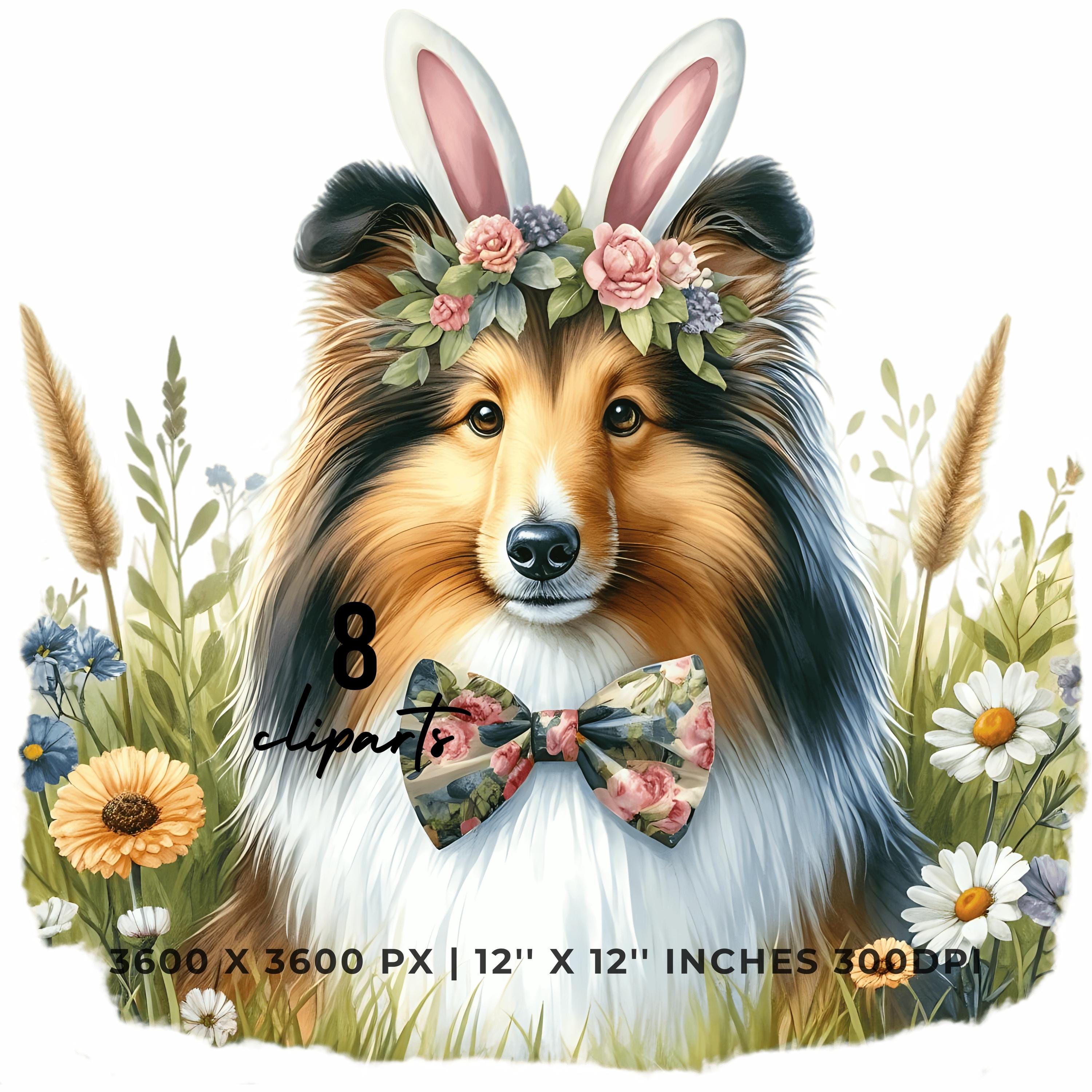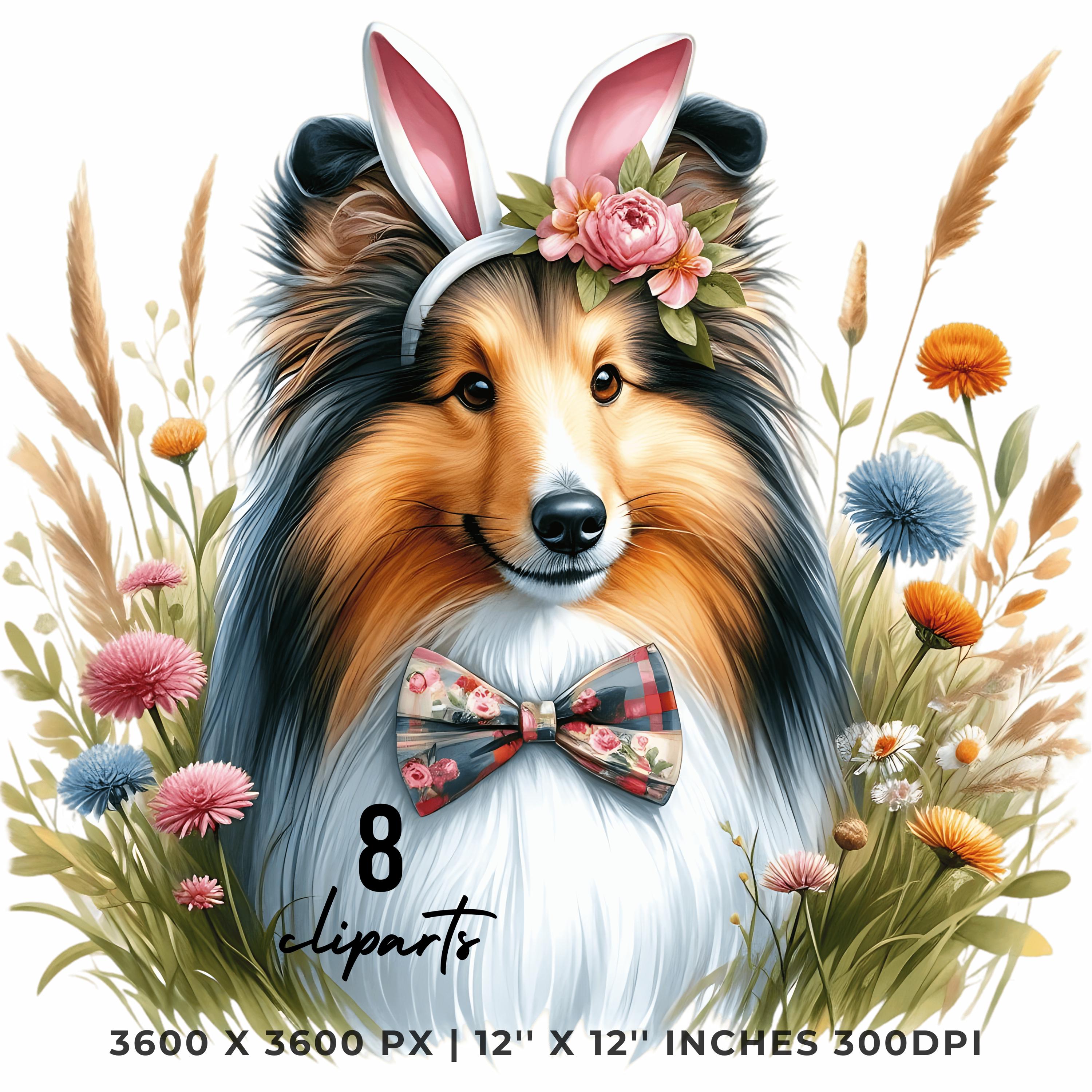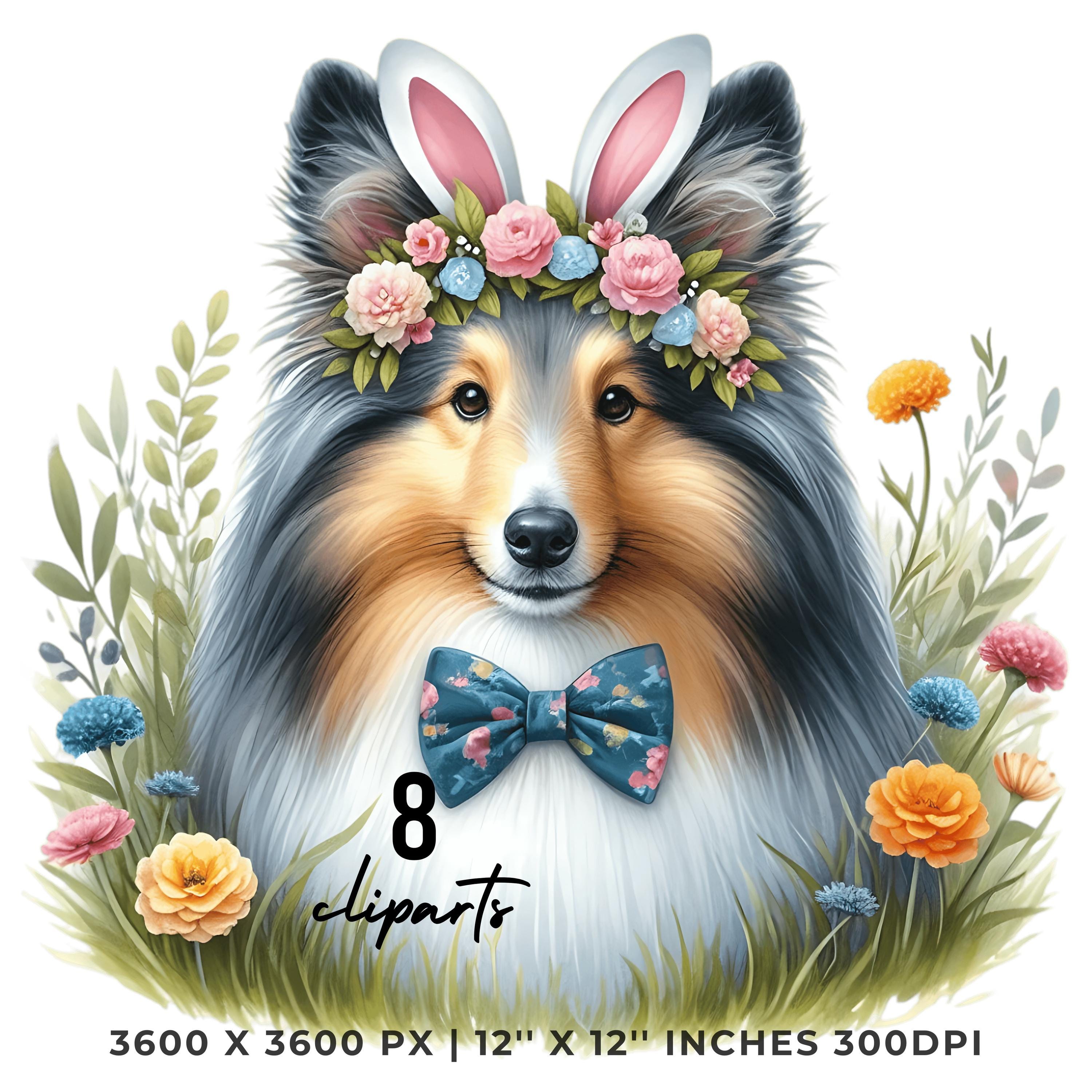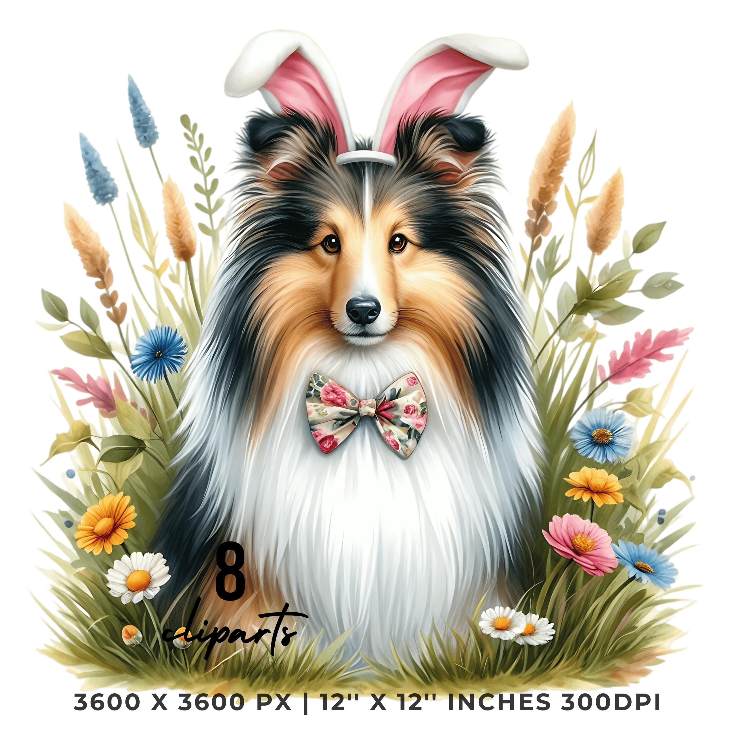 Easter Shetland Sheepdog Dog Wearing Floral Bow & Bunny Ear Handband Ready for Easter Egg Hunting Clip Art PNG | 8 Clip Art | Dog Lover Sublimation Commercial Use