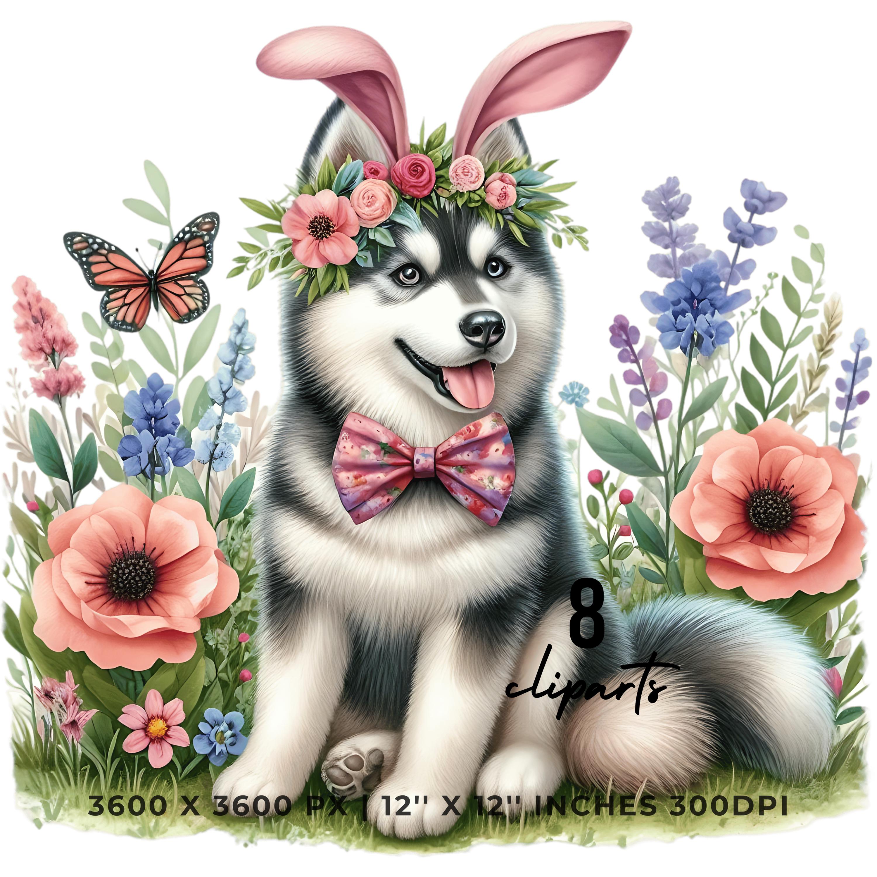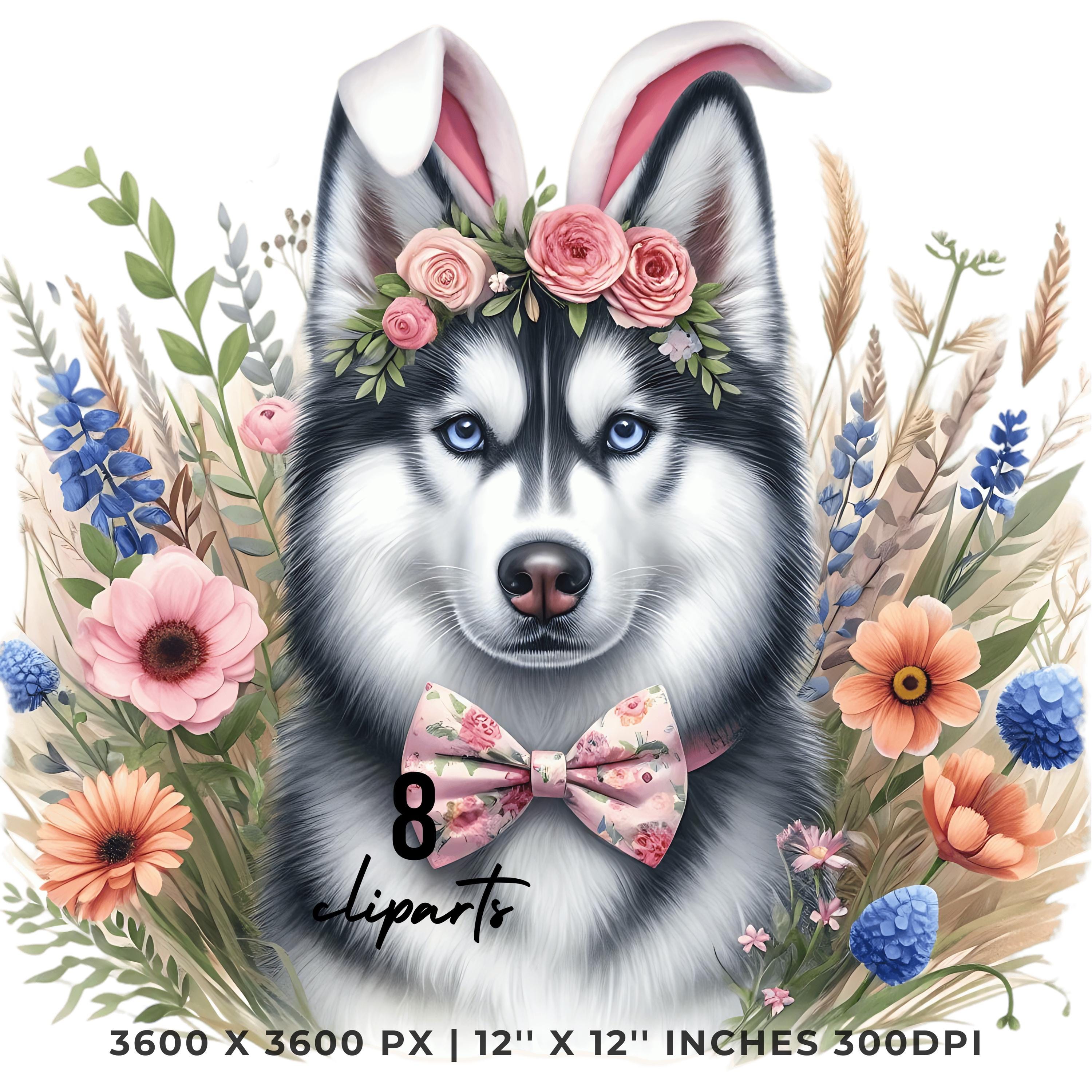 Easter Siberian Husky Dog Wearing Floral Bow & Bunny Ear Handband Ready for Easter Egg Hunting Clipart PNG, 8 Dog Lover Commercial is an eye-catching, high-resolution digital asset designed for creators, crafters, teachers, and small business owners looking to elevate their visuals.