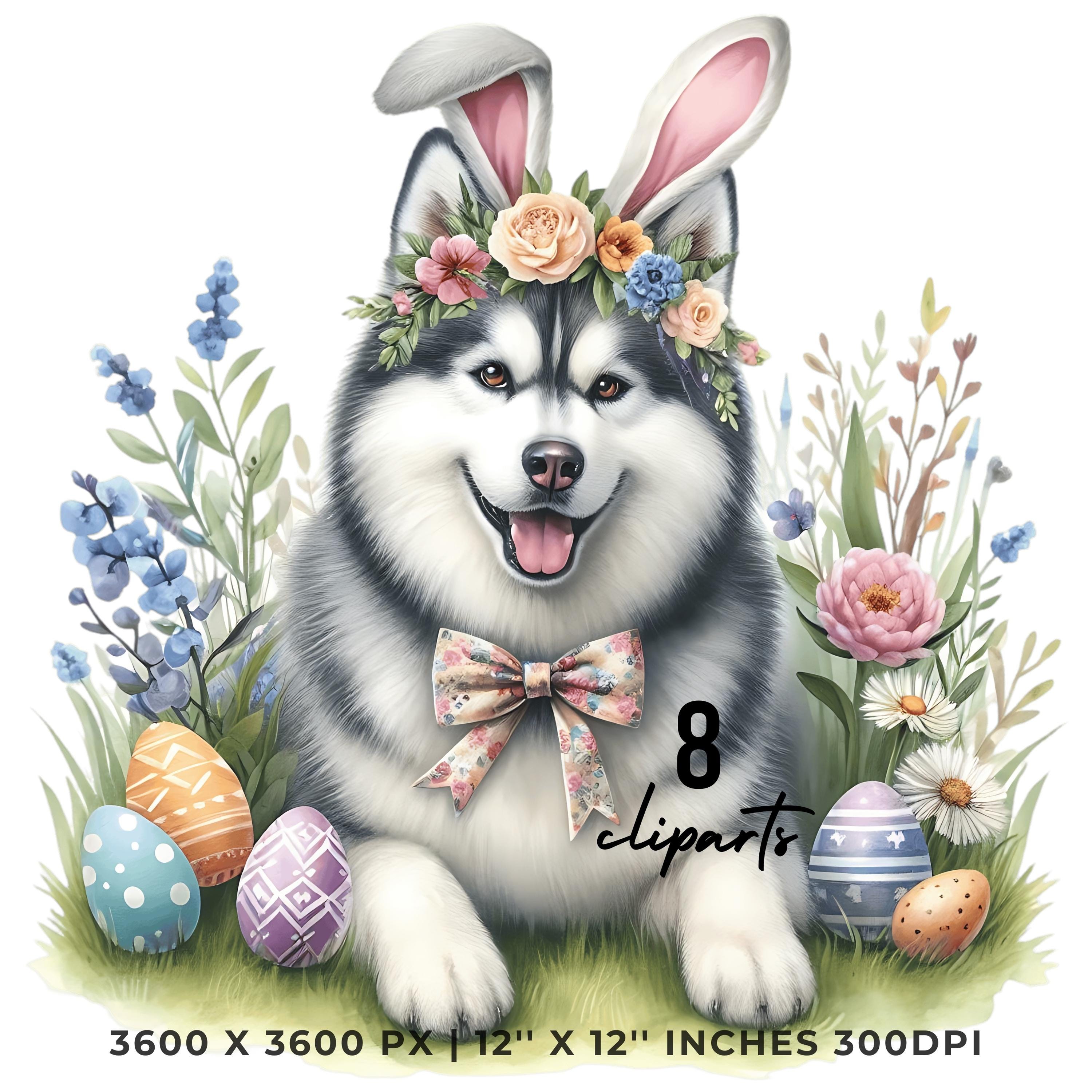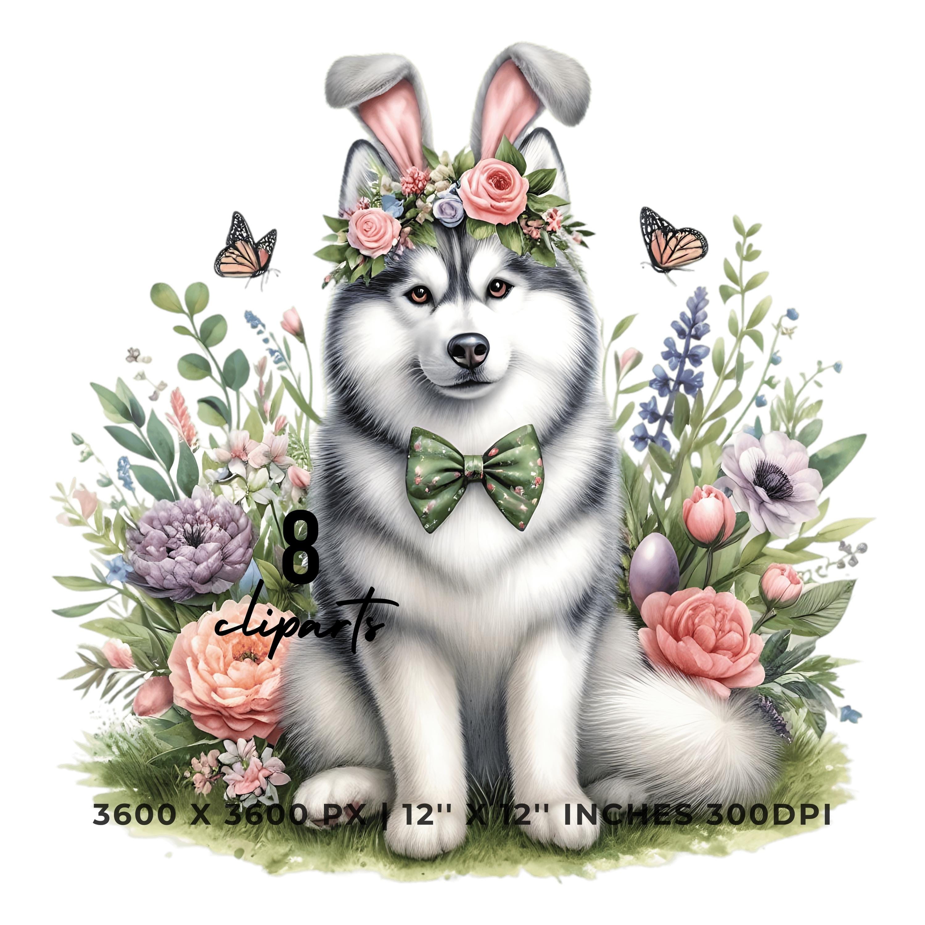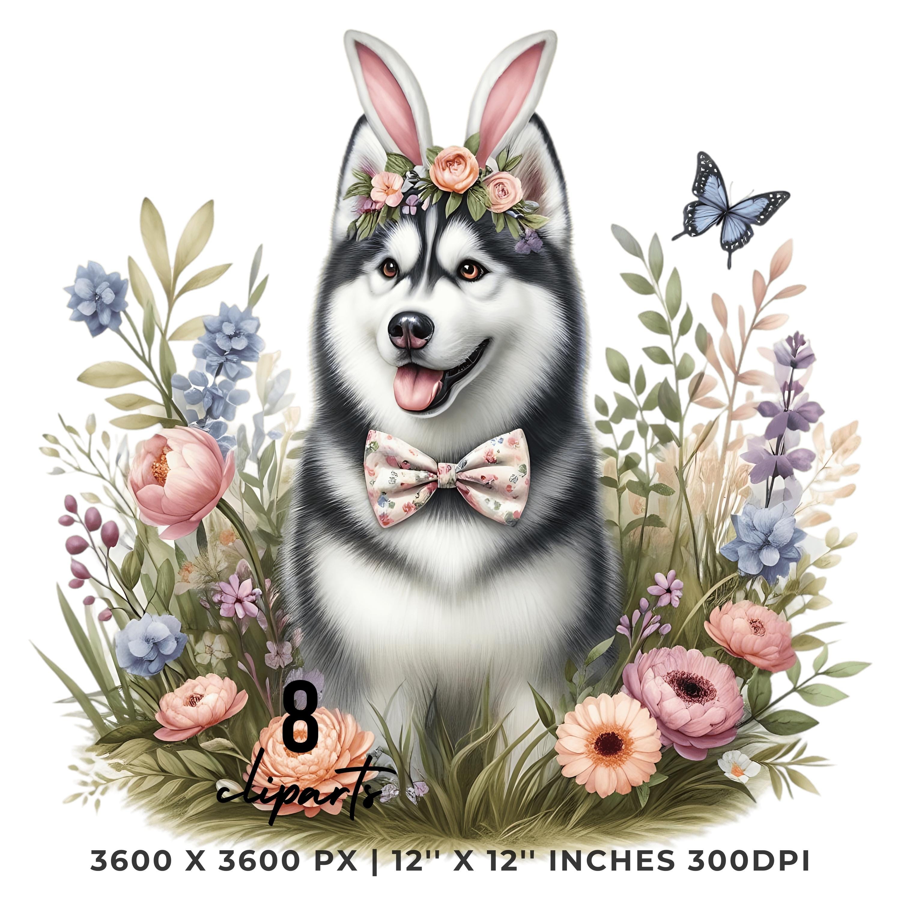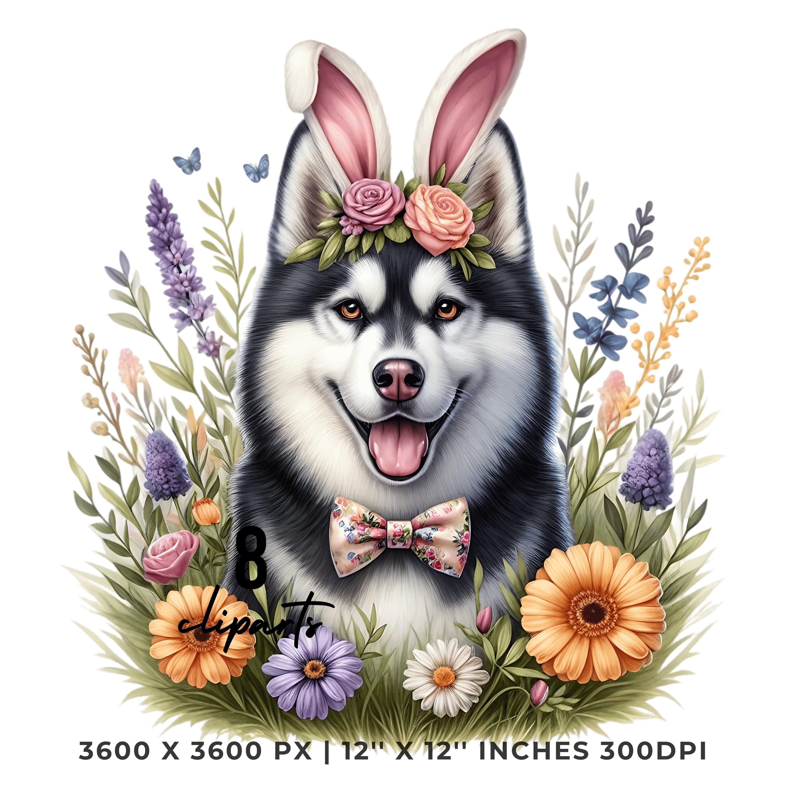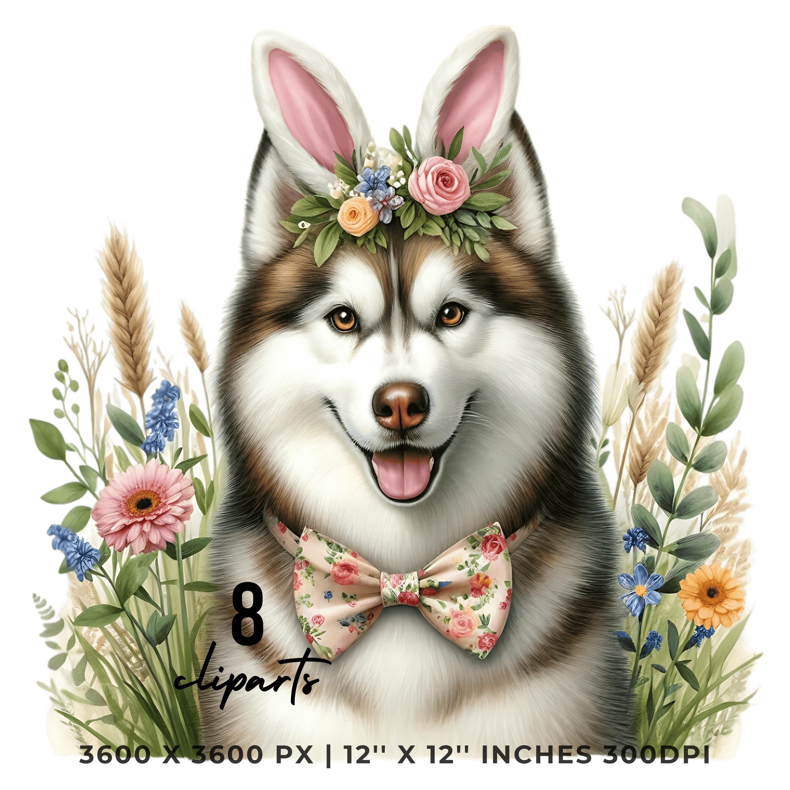 Easter Siberian Husky Dog Wearing Floral Bow & Bunny Ear Handband Ready for Easter Egg Hunting Clip Art PNG | 8 Clip Art | Dog Lover Sublimation Commercial Use