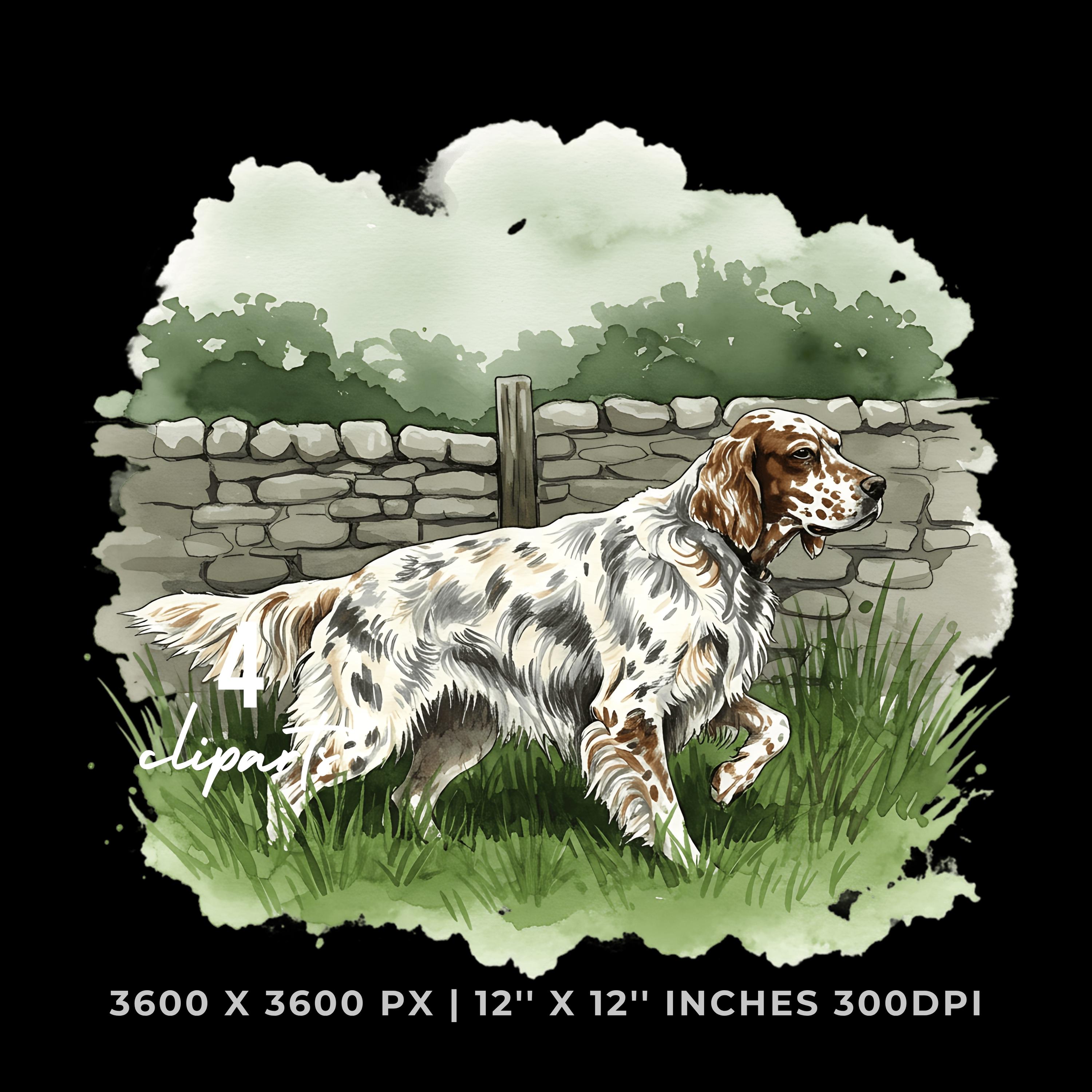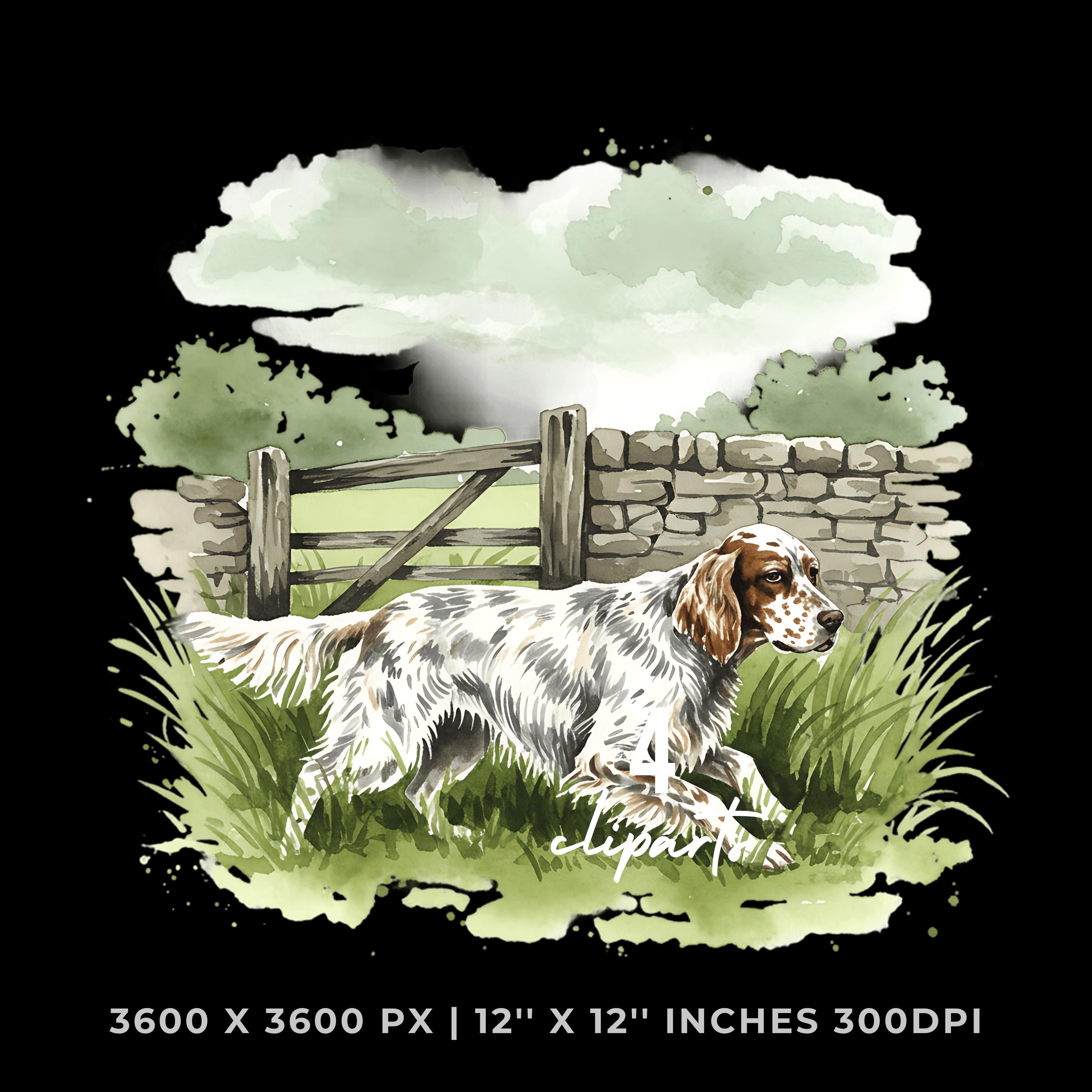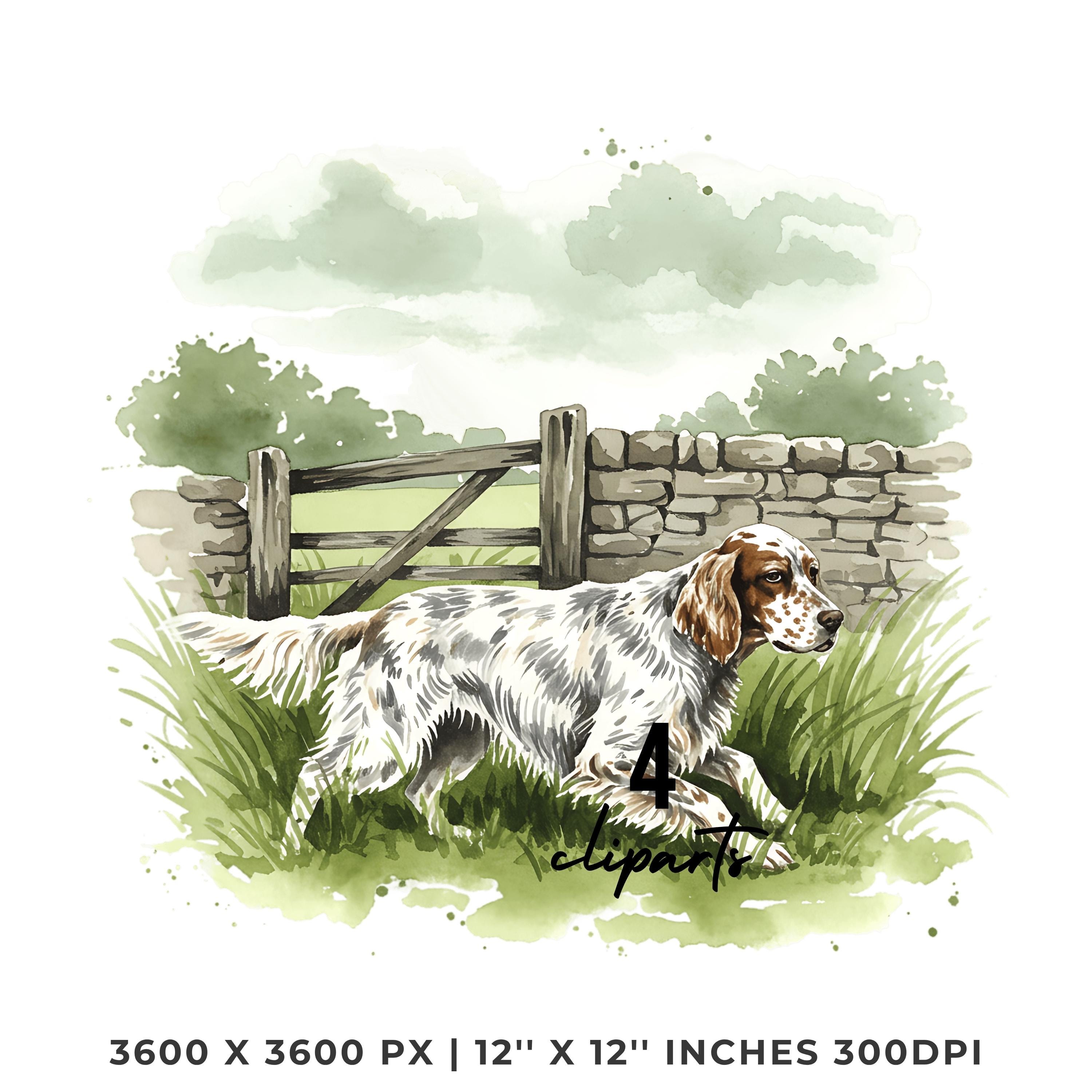 English Setter Hunting Clipart | 4 PNG & 4 JPG | Fall Dog Field Art 4 Set | Sublimation Transparent Commercial Use is an eye-catching, high-resolution digital asset designed for creators, crafters, teachers, and small business owners looking to elevate their visuals.