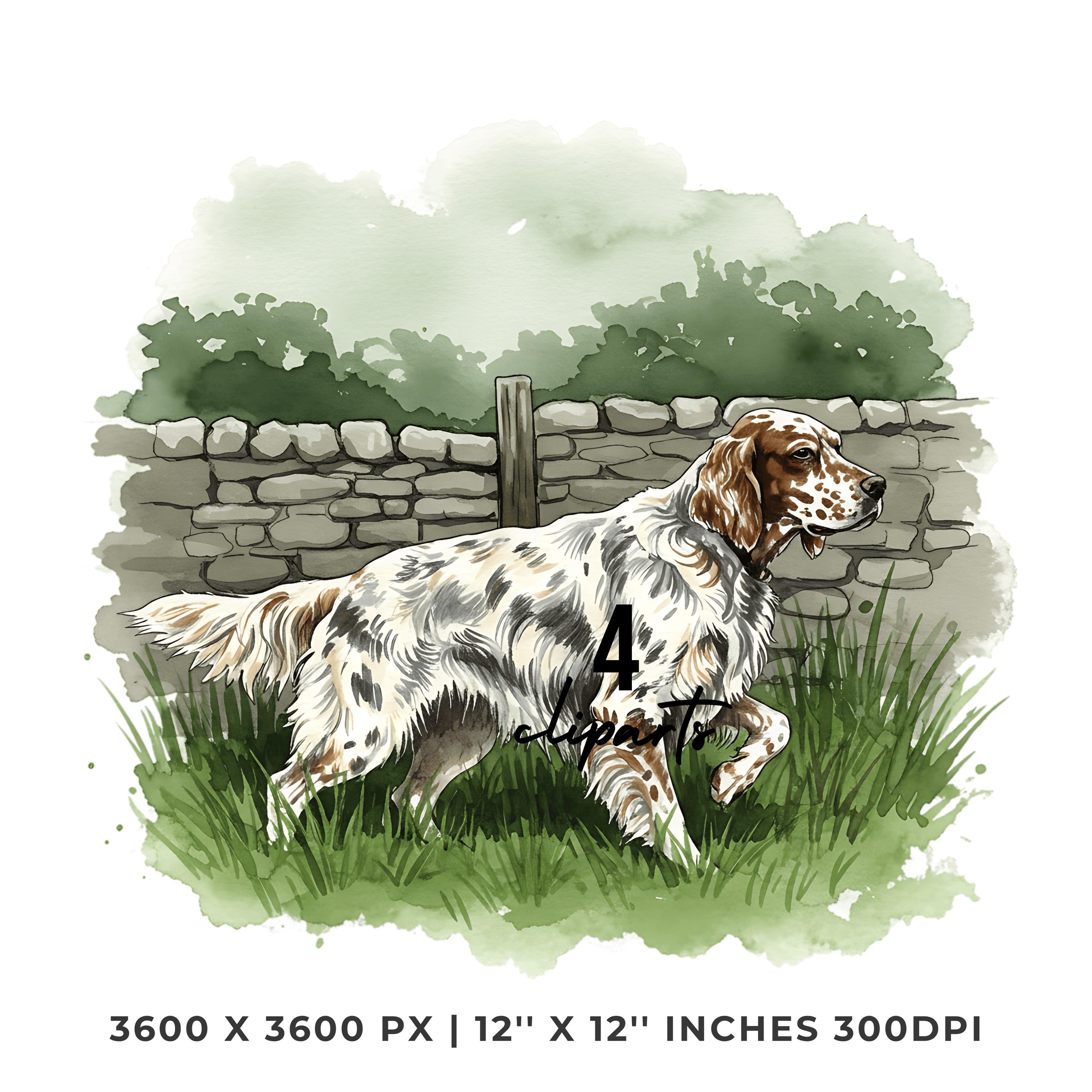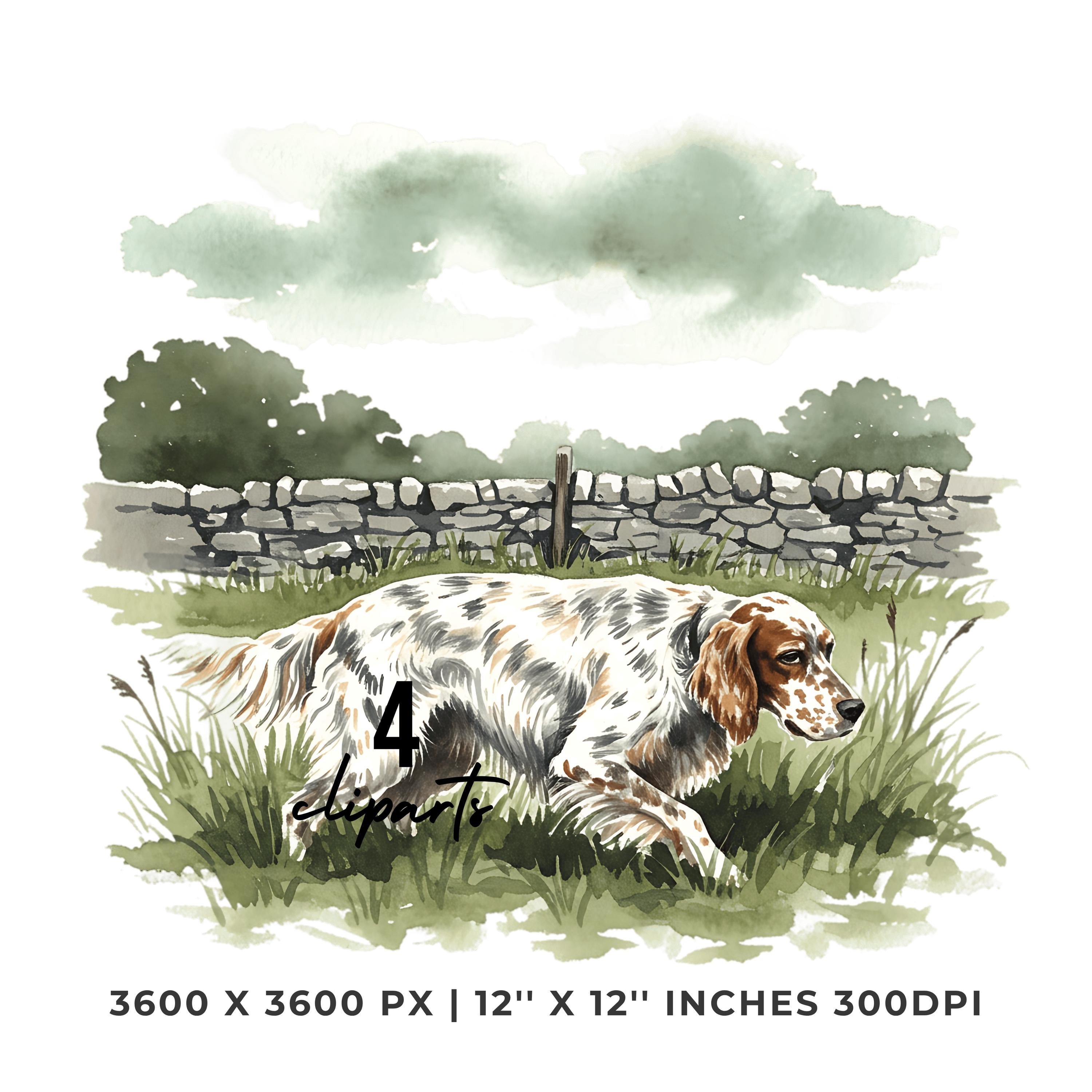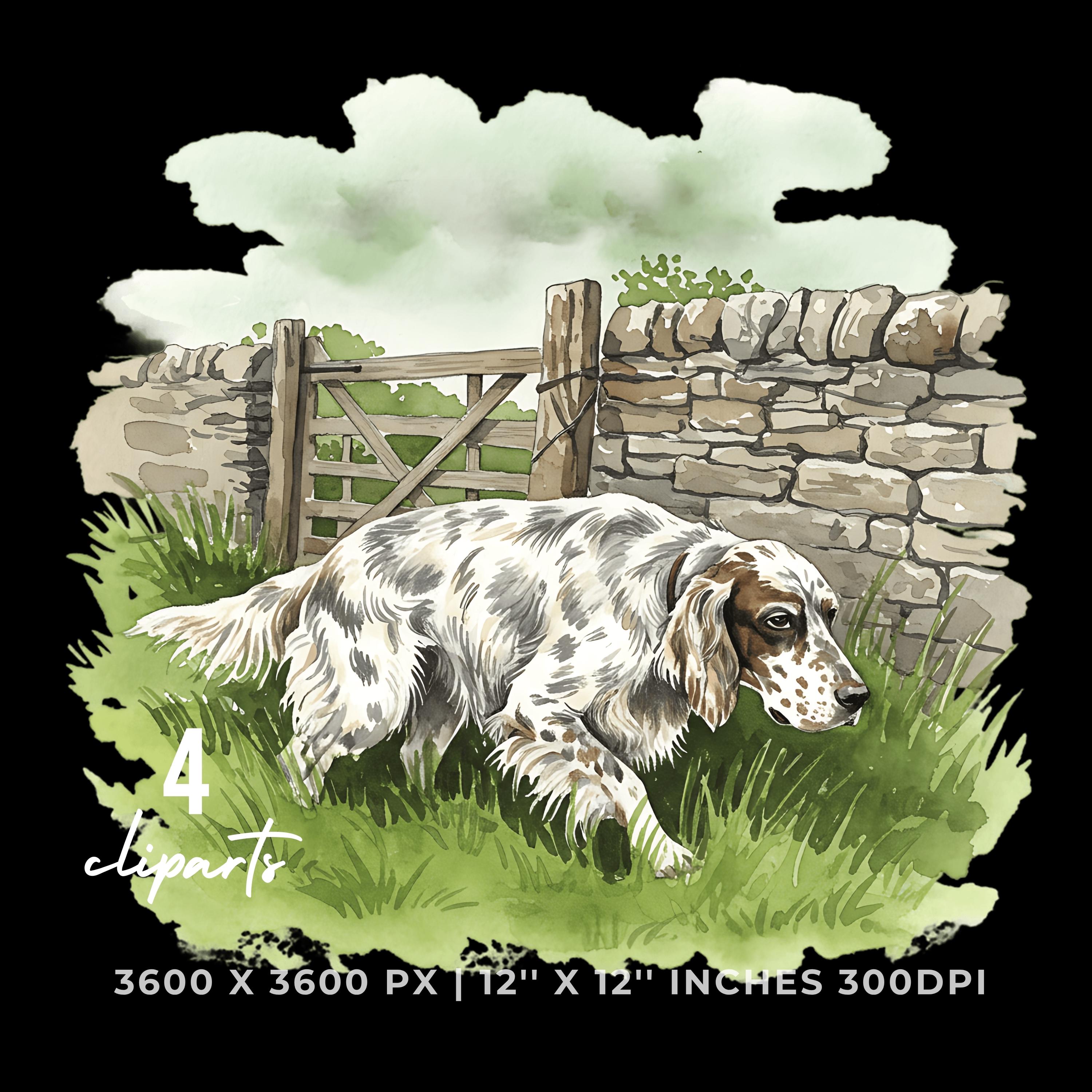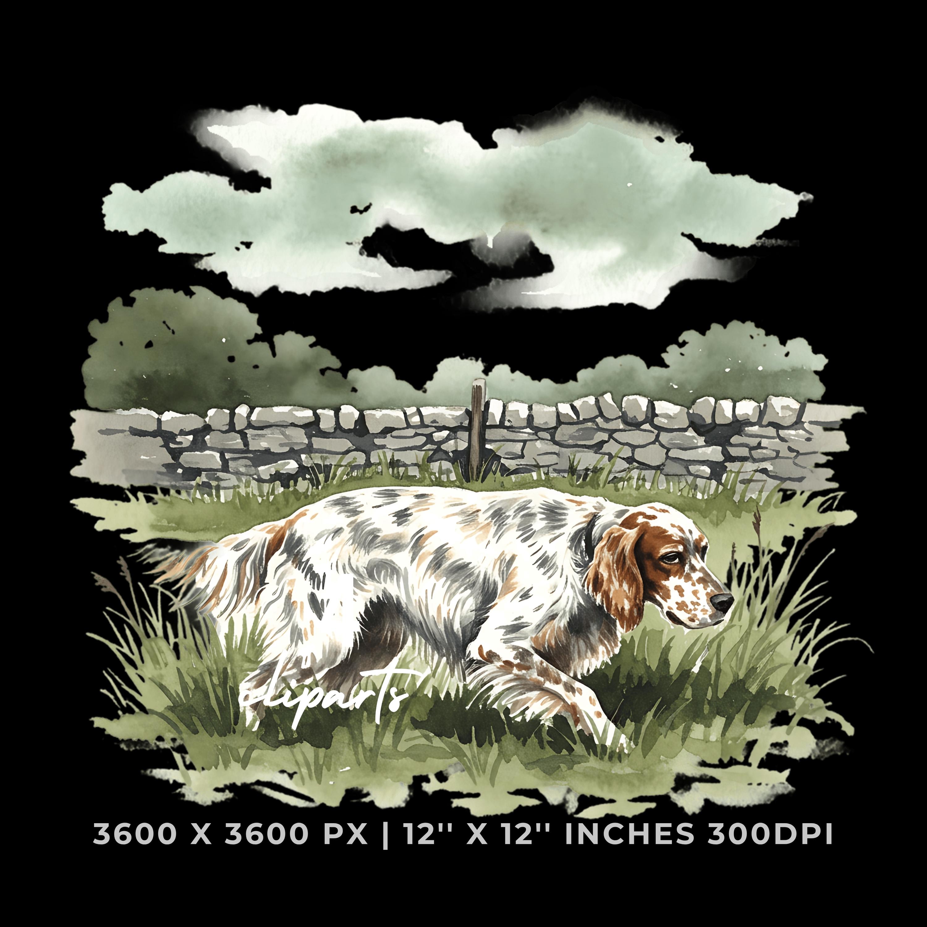English Setter Hunting Clipart | 4 PNG & 4 JPG | Fall Dog Field Art 4 Set | Sublimation Transparent Commercial Use is an eye-catching, high-resolution digital asset designed for creators, crafters, teachers, and small business owners looking to elevate their visuals.