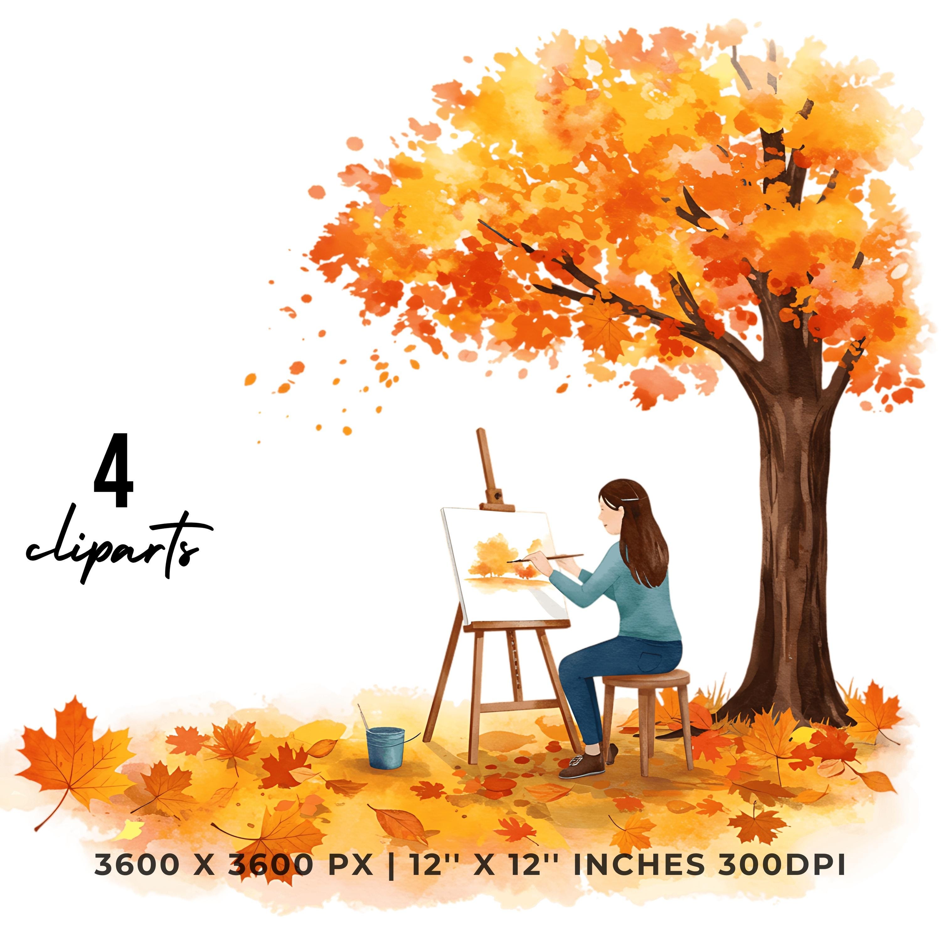 Fall Artist Painting Clipart Set โ Autumn Leaves & Easel Illustration | Watercolor Autumn Scene Art Clipart 4 JPG – 4 PNG Commercial Use is an eye-catching, high-resolution digital asset designed for creators, crafters, teachers, and small business owners looking to elevate their visuals.