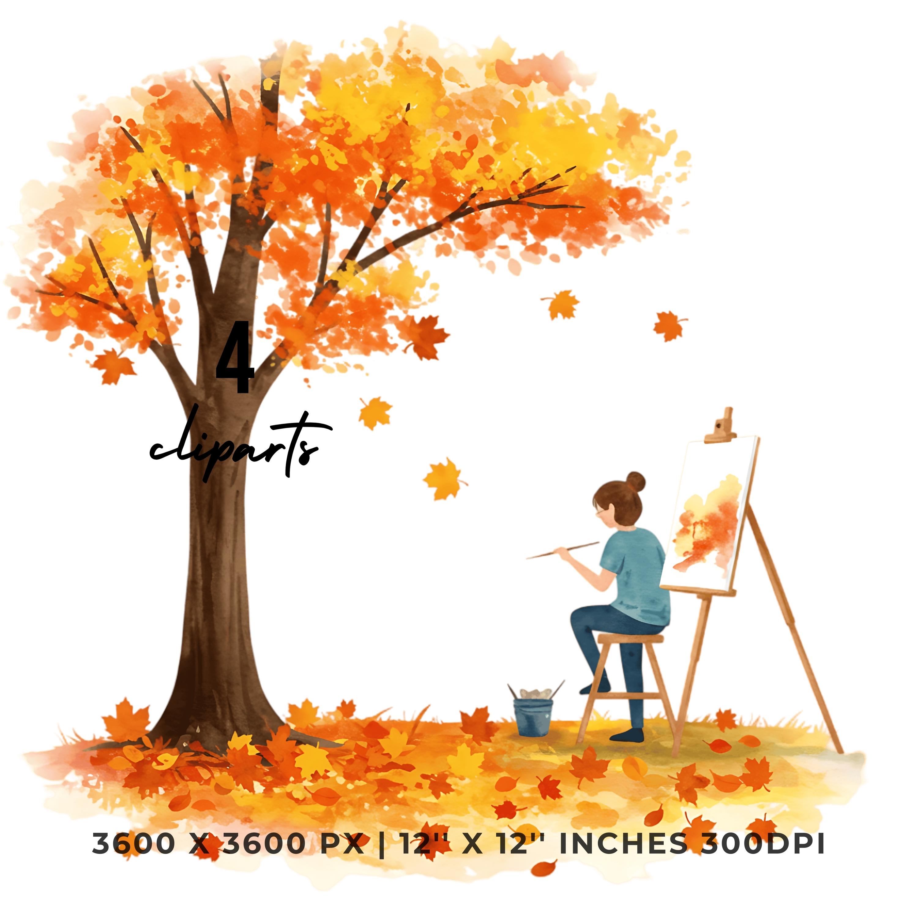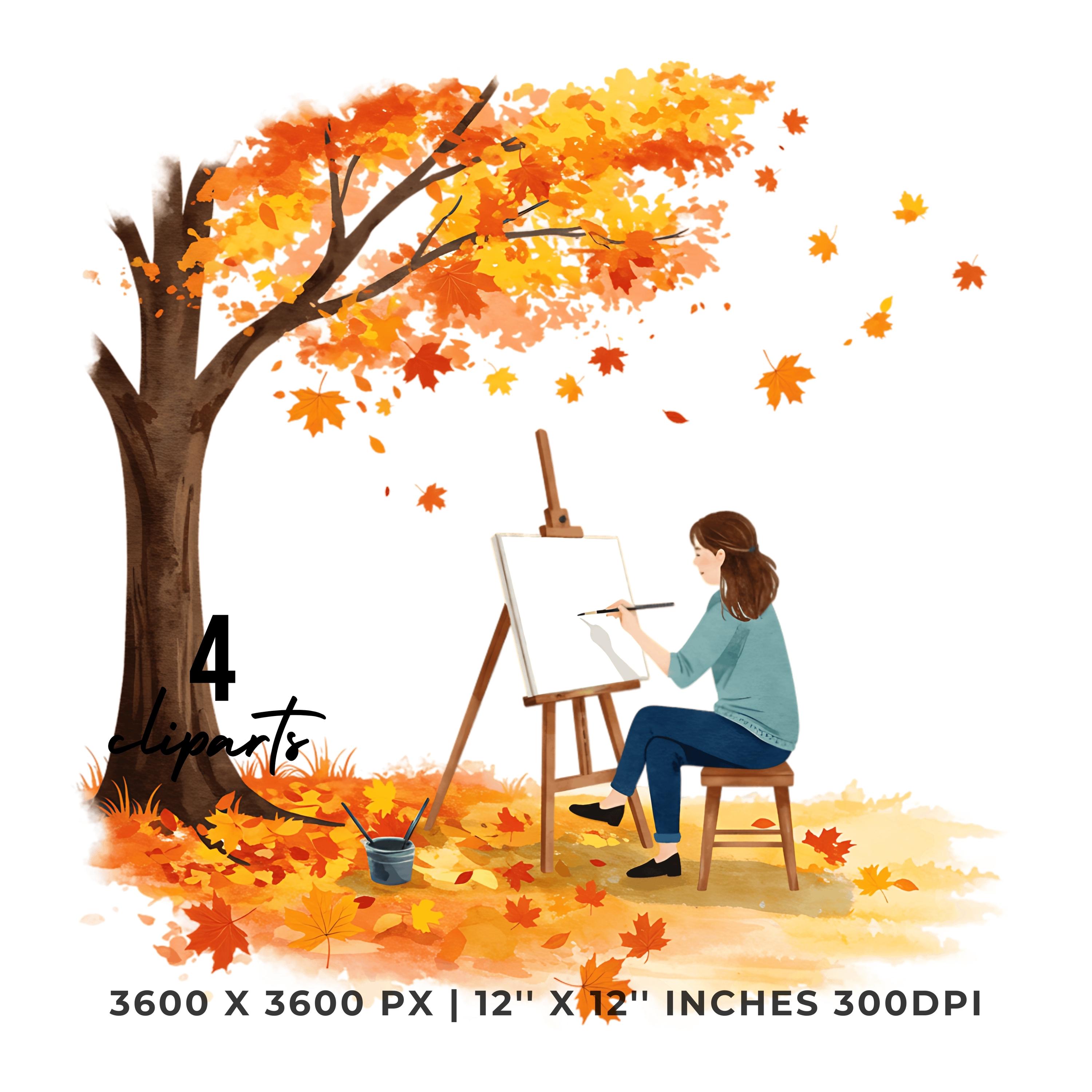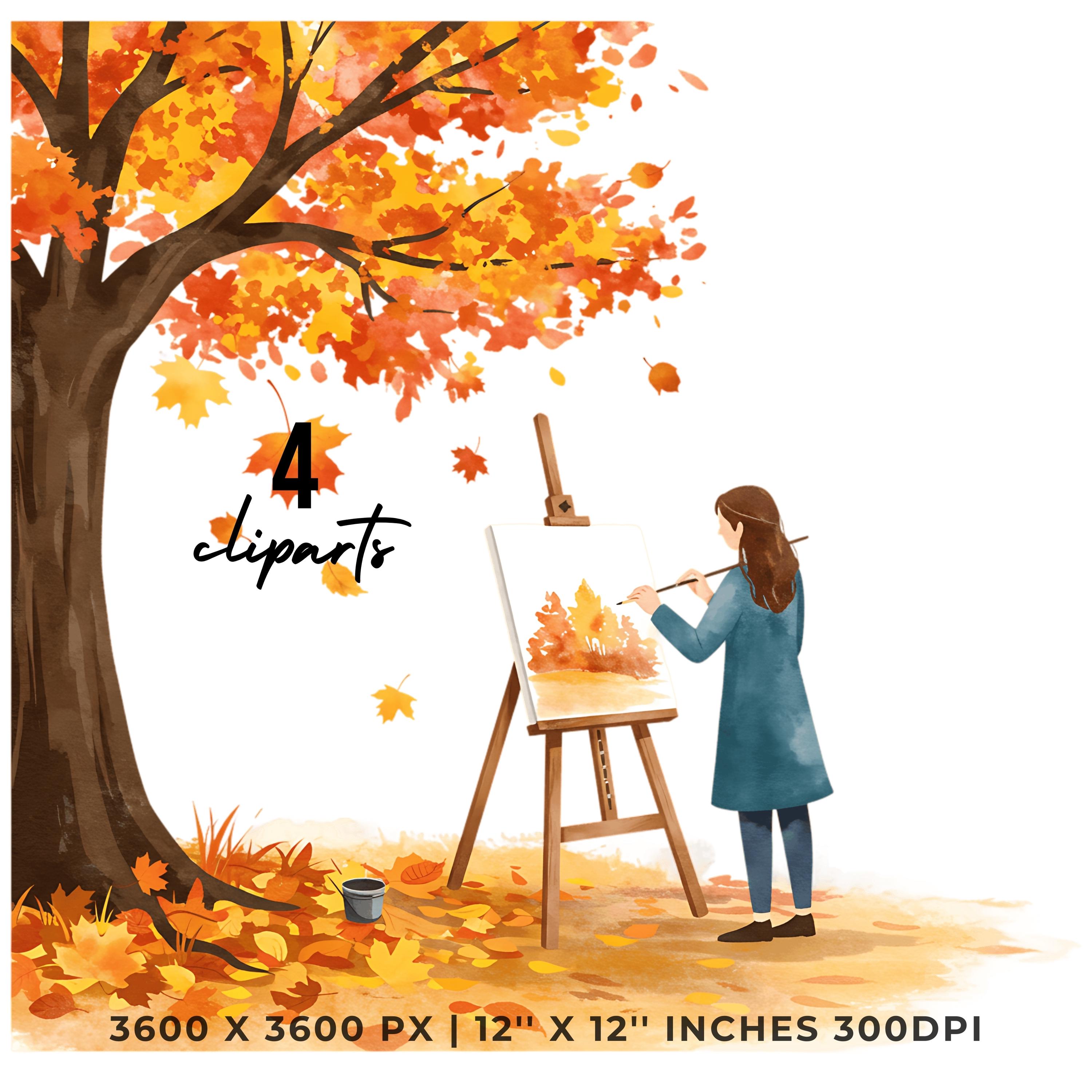 Fall Artist Painting Clipart Set โ Autumn Leaves & Easel Illustration | Watercolor Autumn Scene Art Clipart Bundle | 12″x12″ 300 DPI | 4 JPG – 4 PNG Sublimation Commercial Use