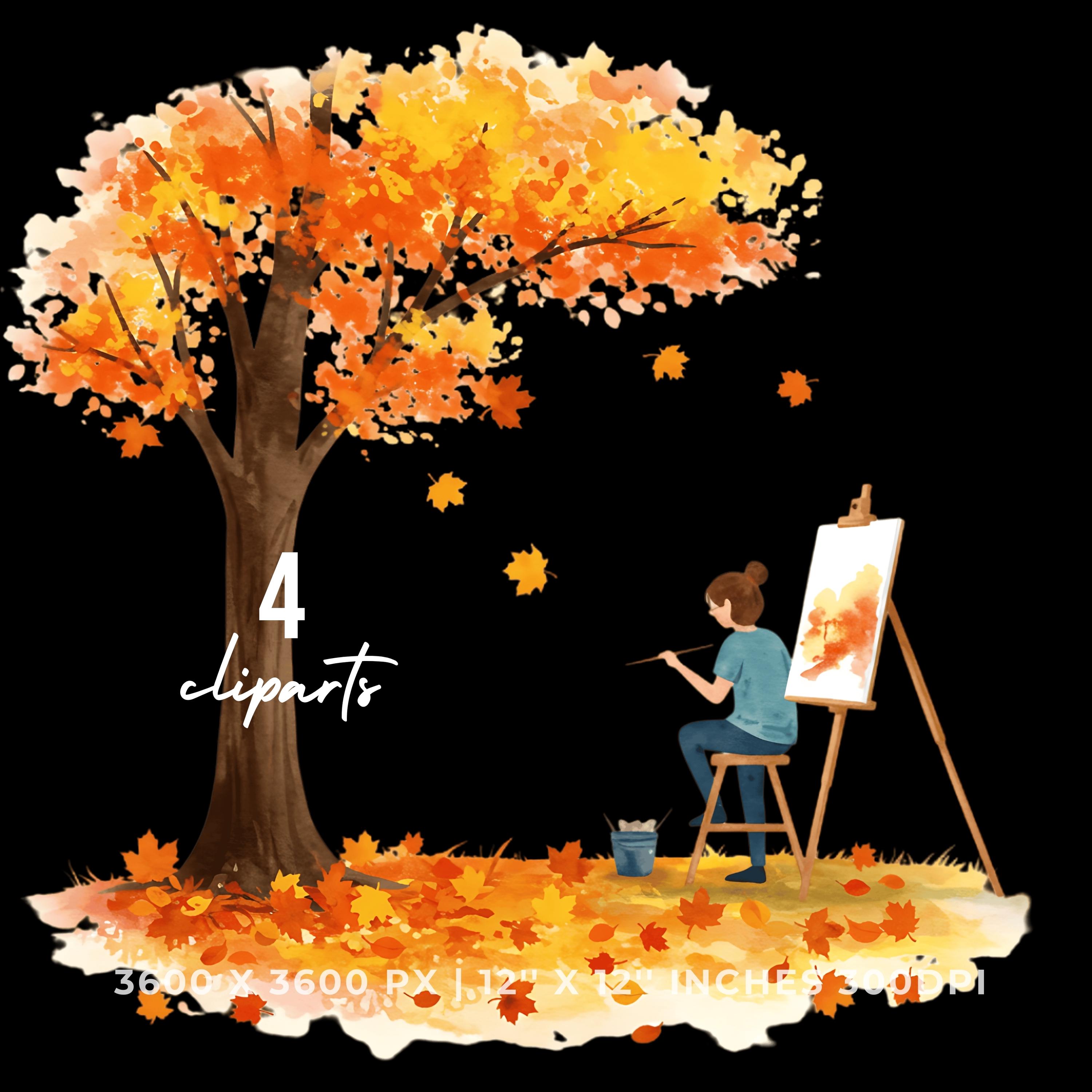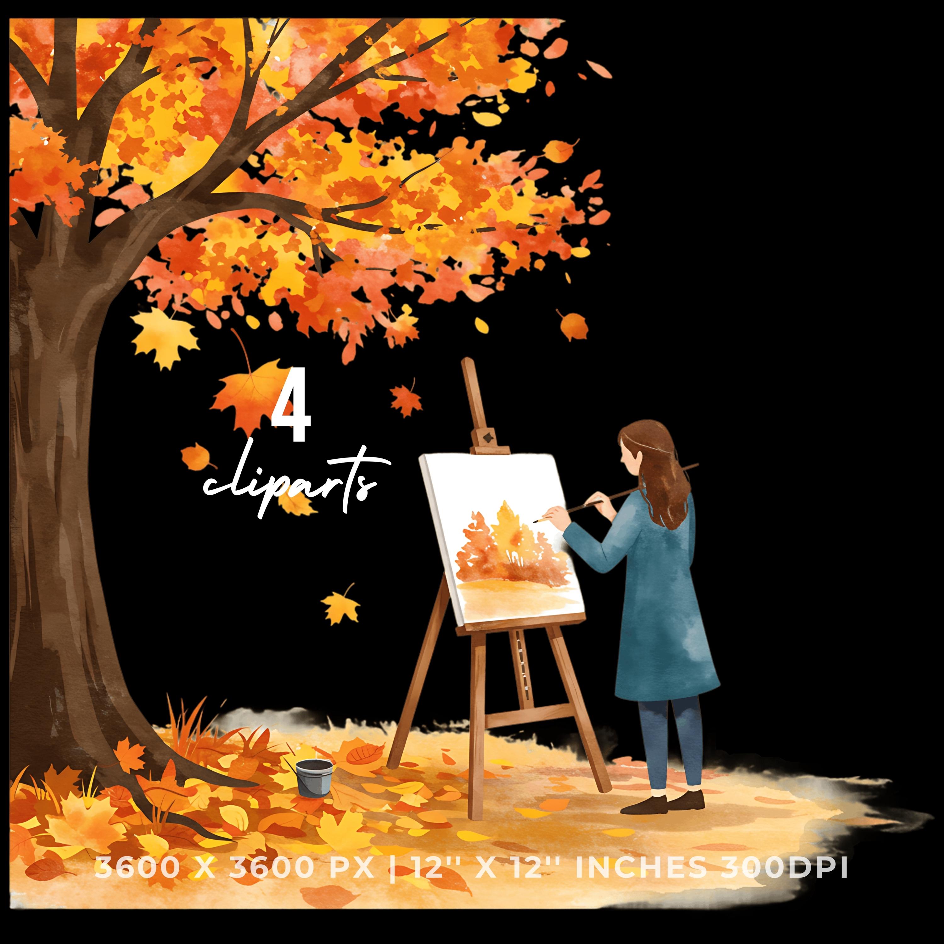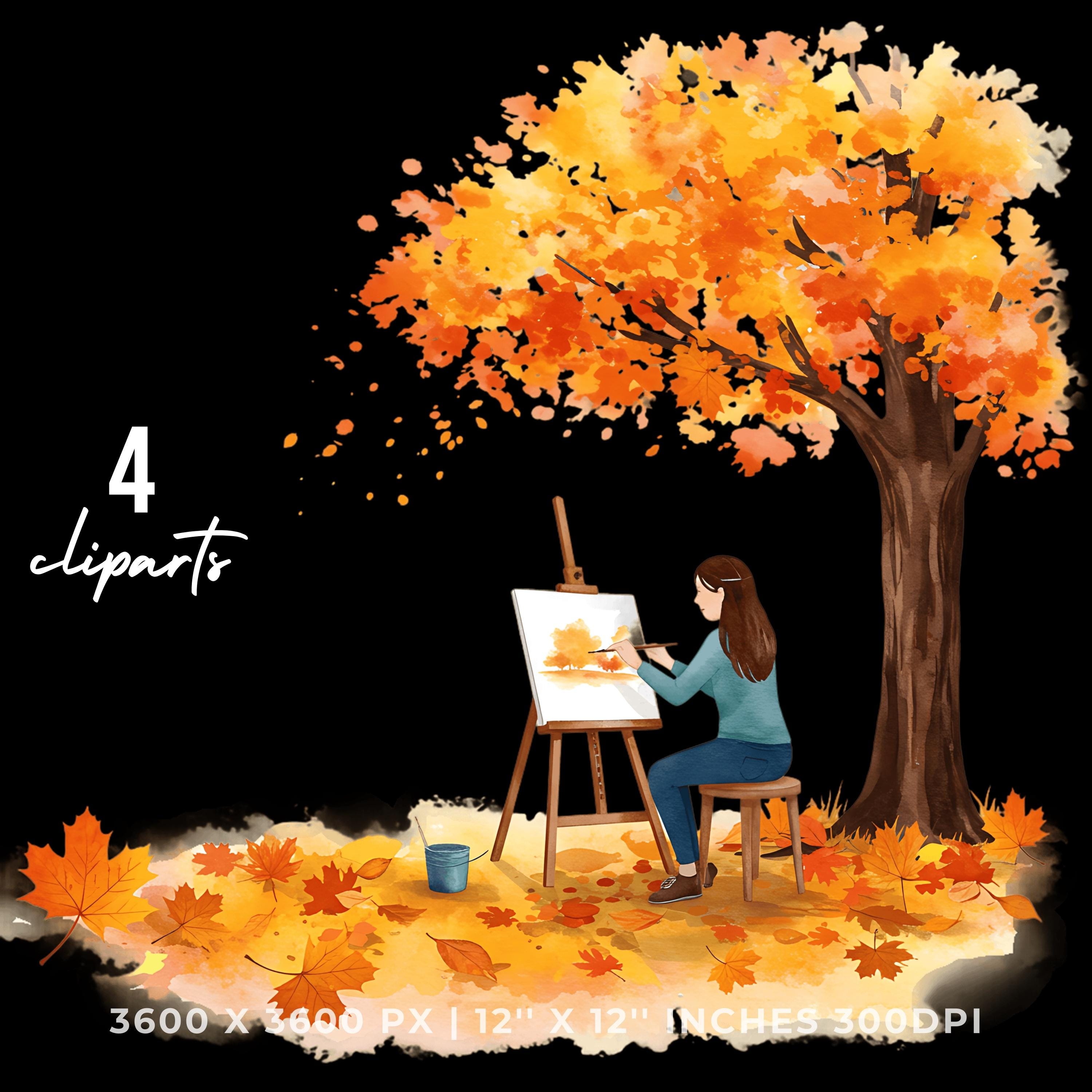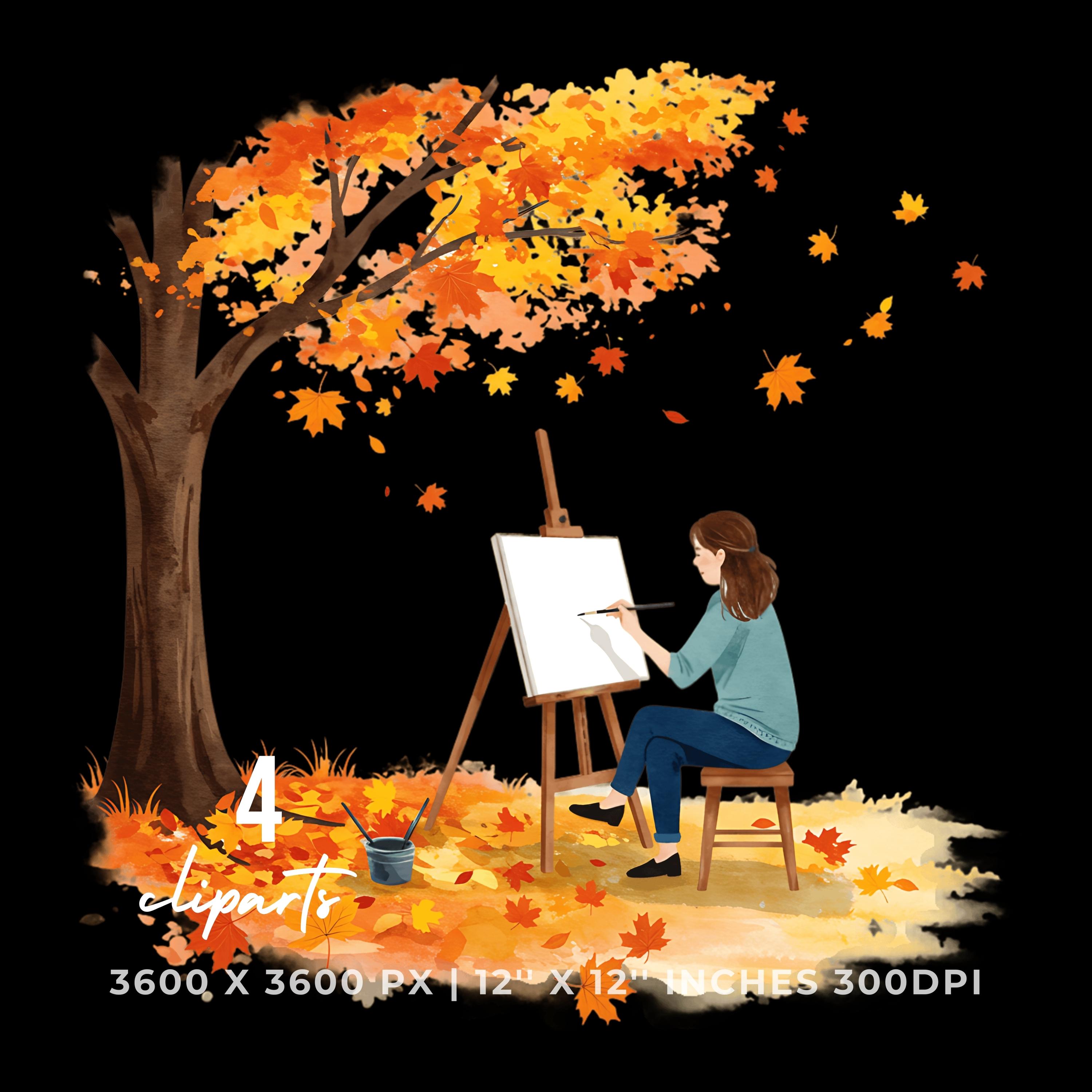 Fall Artist Painting Clipart Set โ Autumn Leaves & Easel Illustration | Watercolor Autumn Scene Art Clipart Bundle | 12″x12″ 300 DPI | 4 JPG – 4 PNG Sublimation Commercial Use