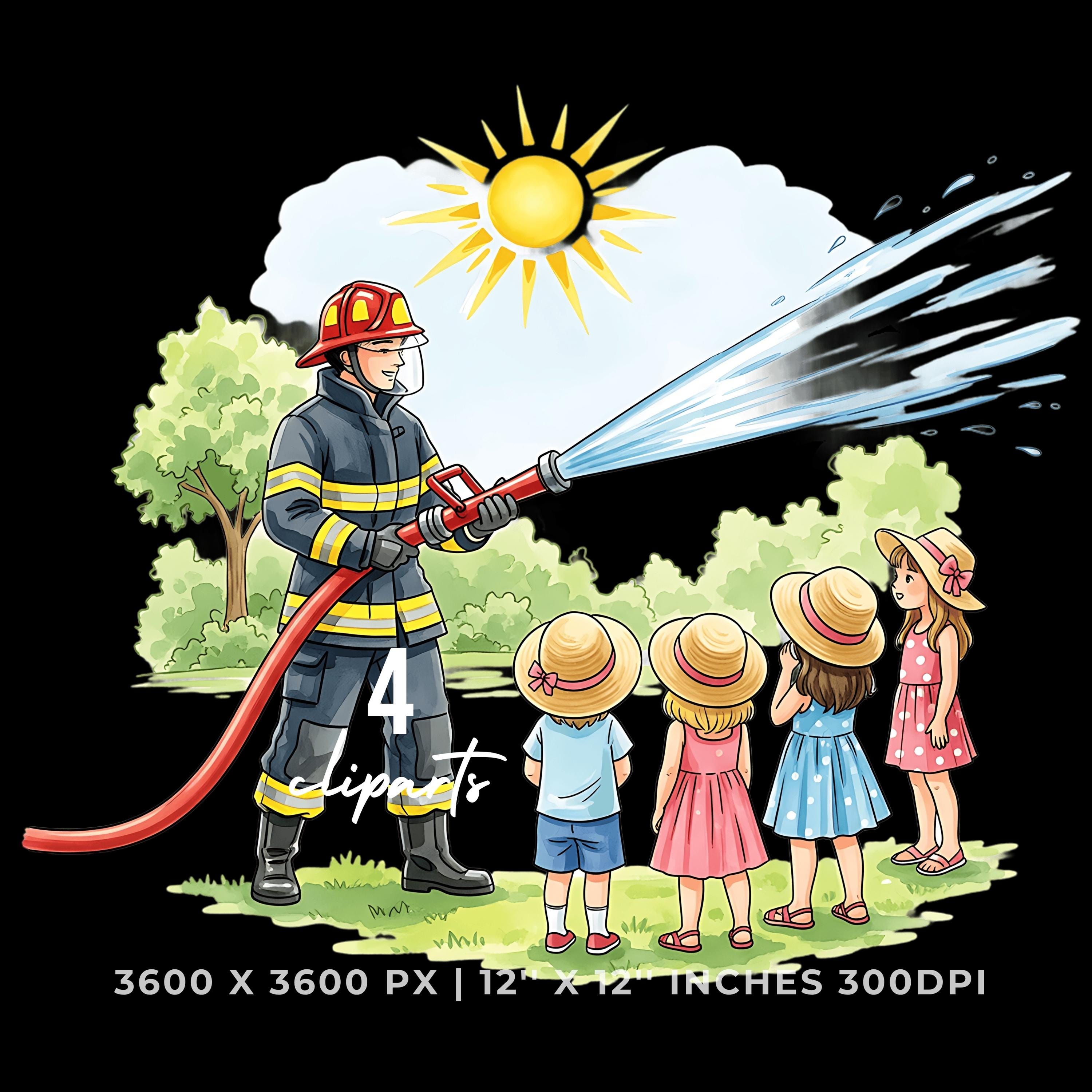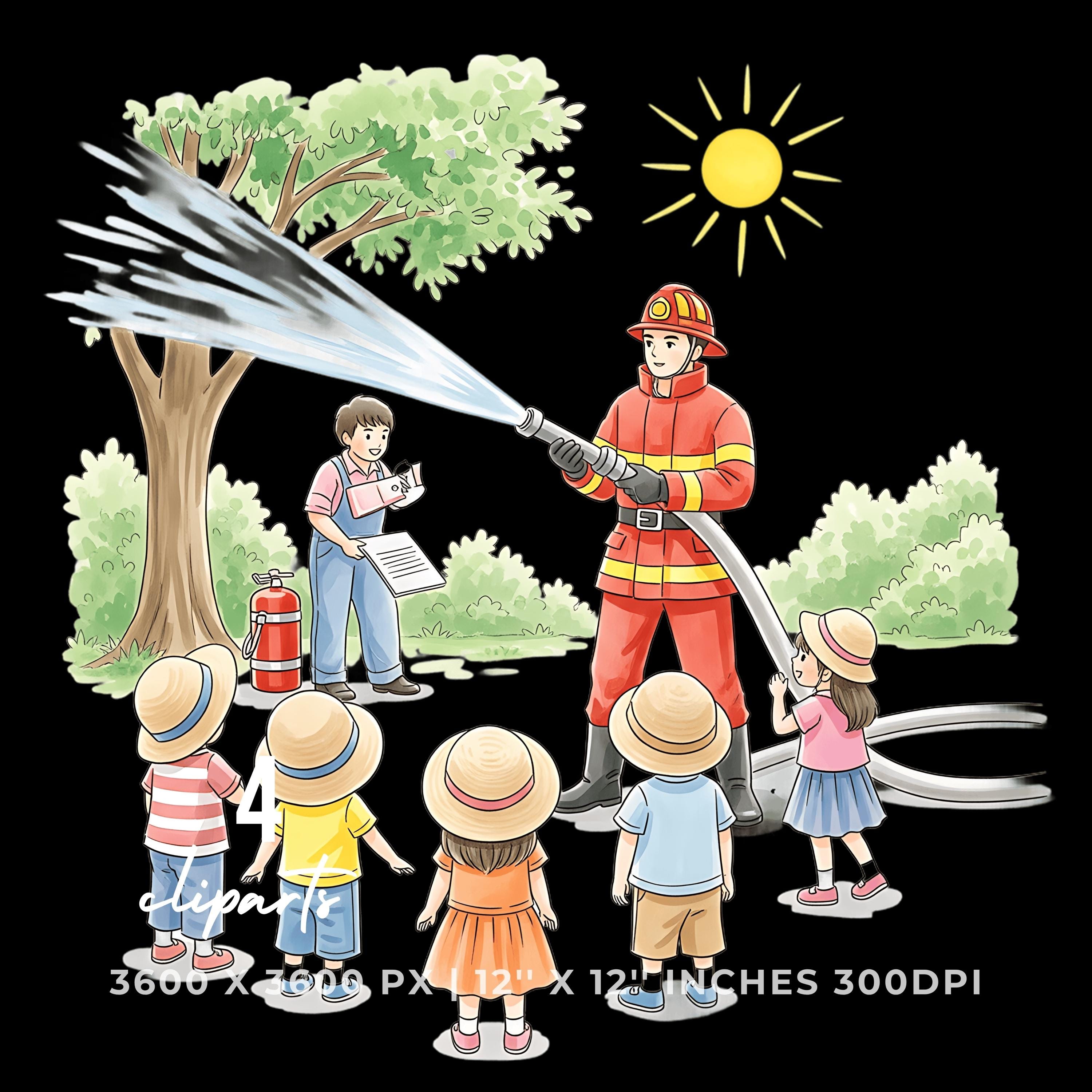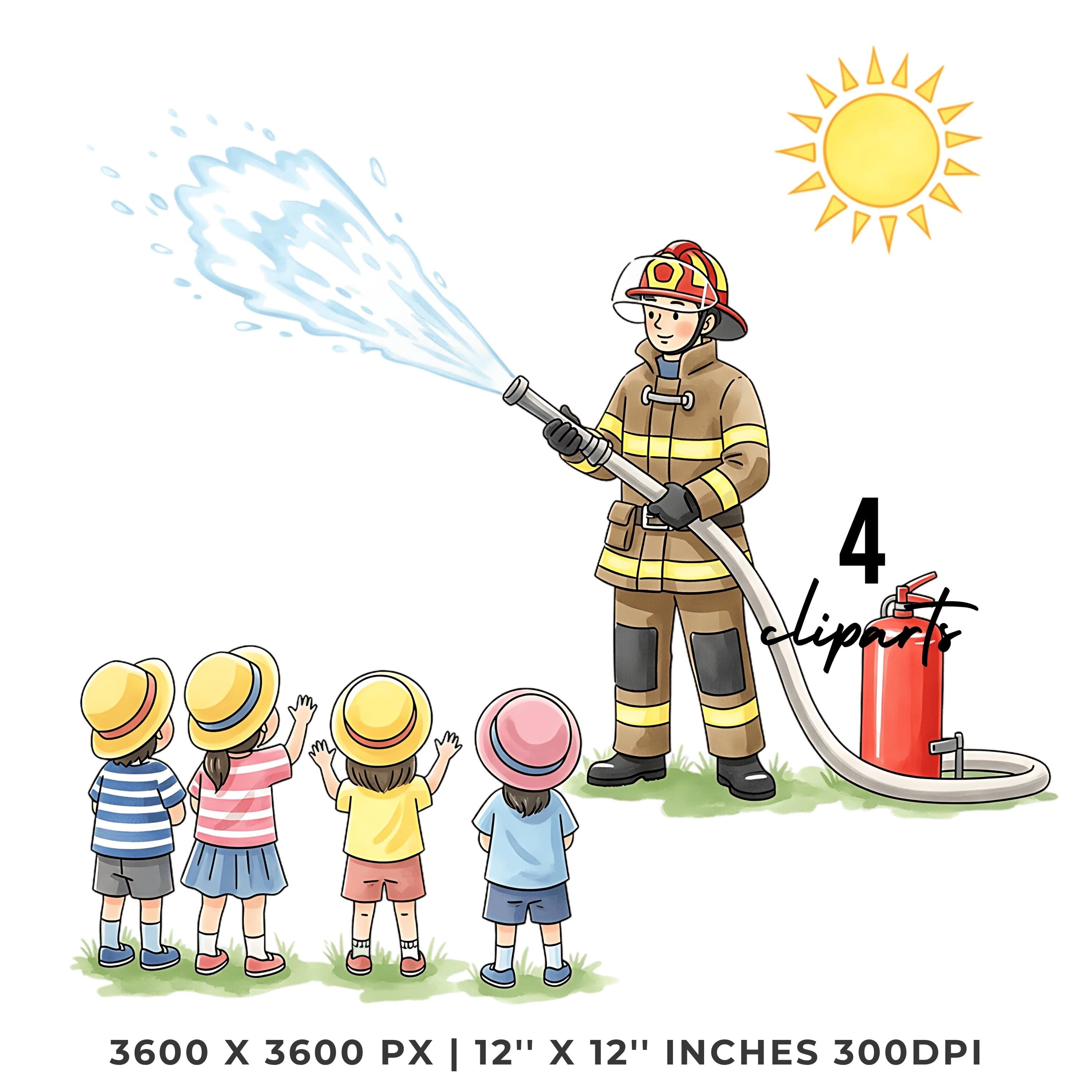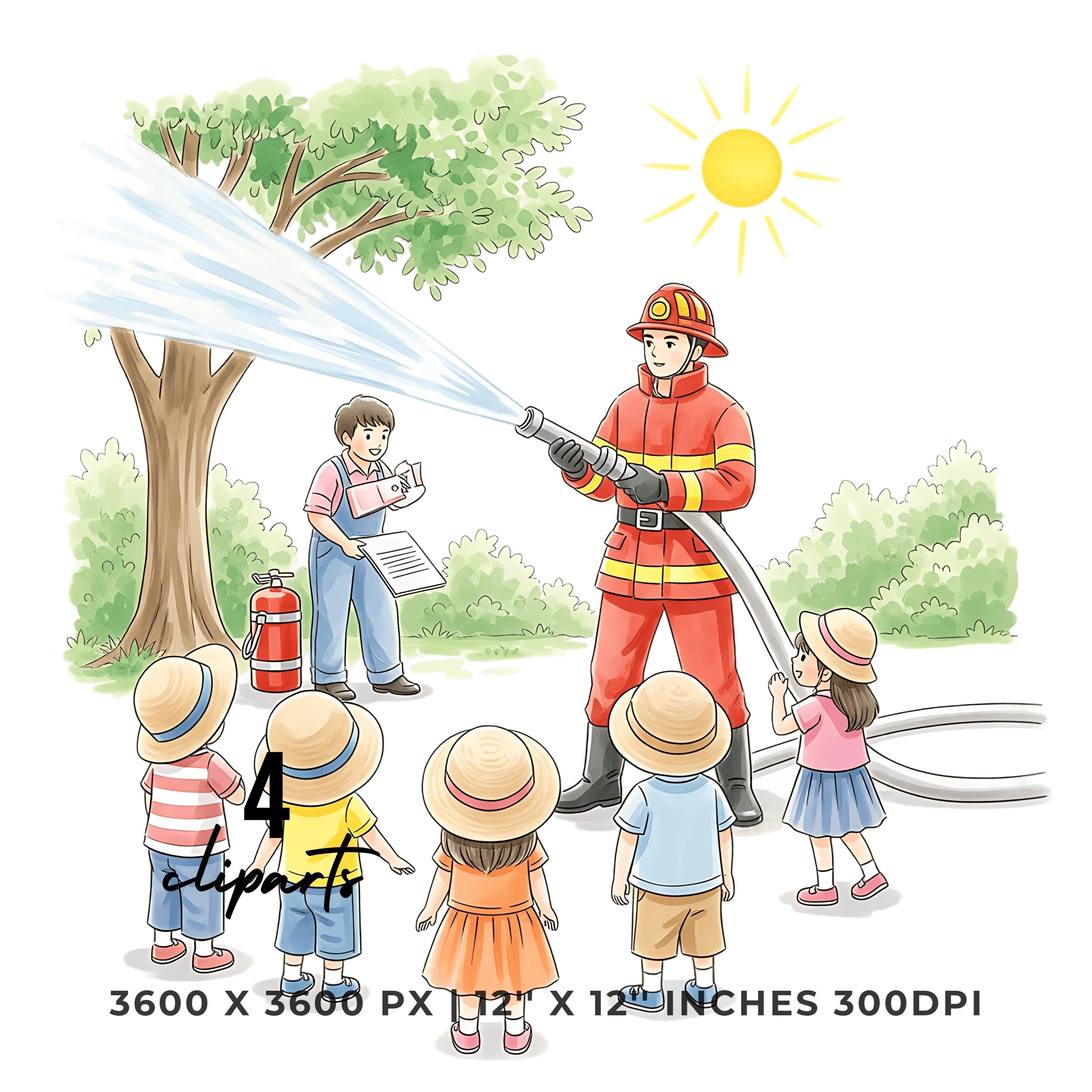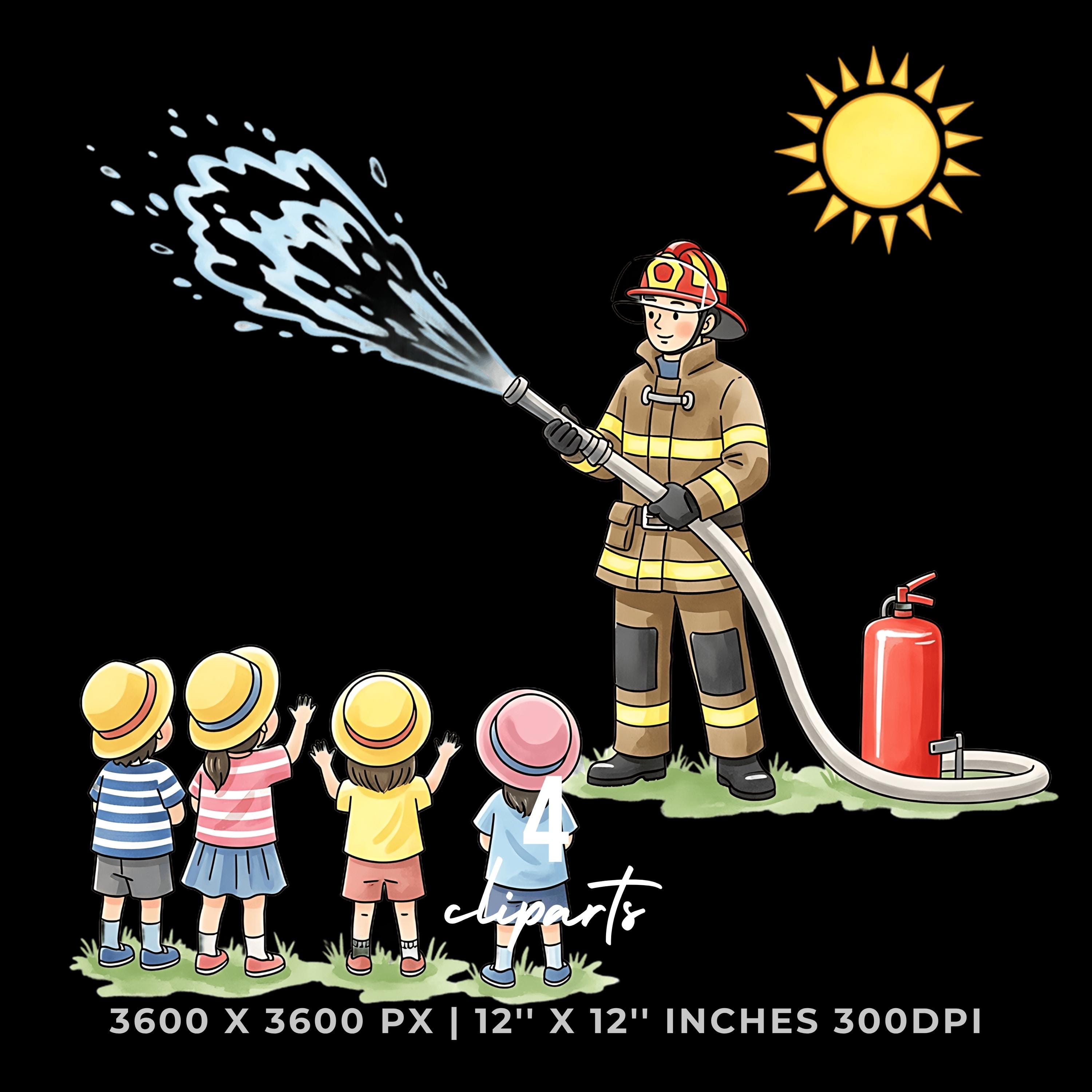 Firefighter Safety Demo Clipart | Kids Learning About Fire Safety | 4 PNG & 4 JPG | Sublimation Design | 12″x12″ 300DPI Graphic Commercial Use