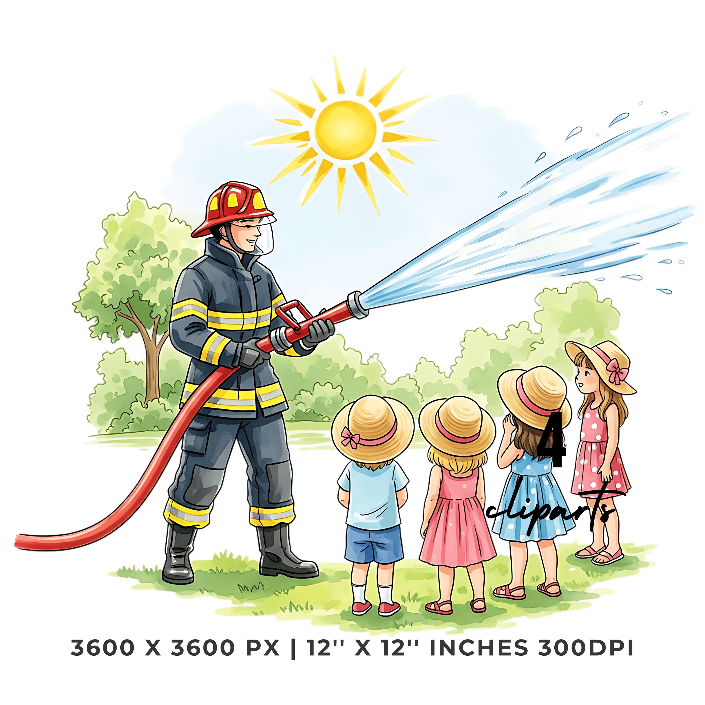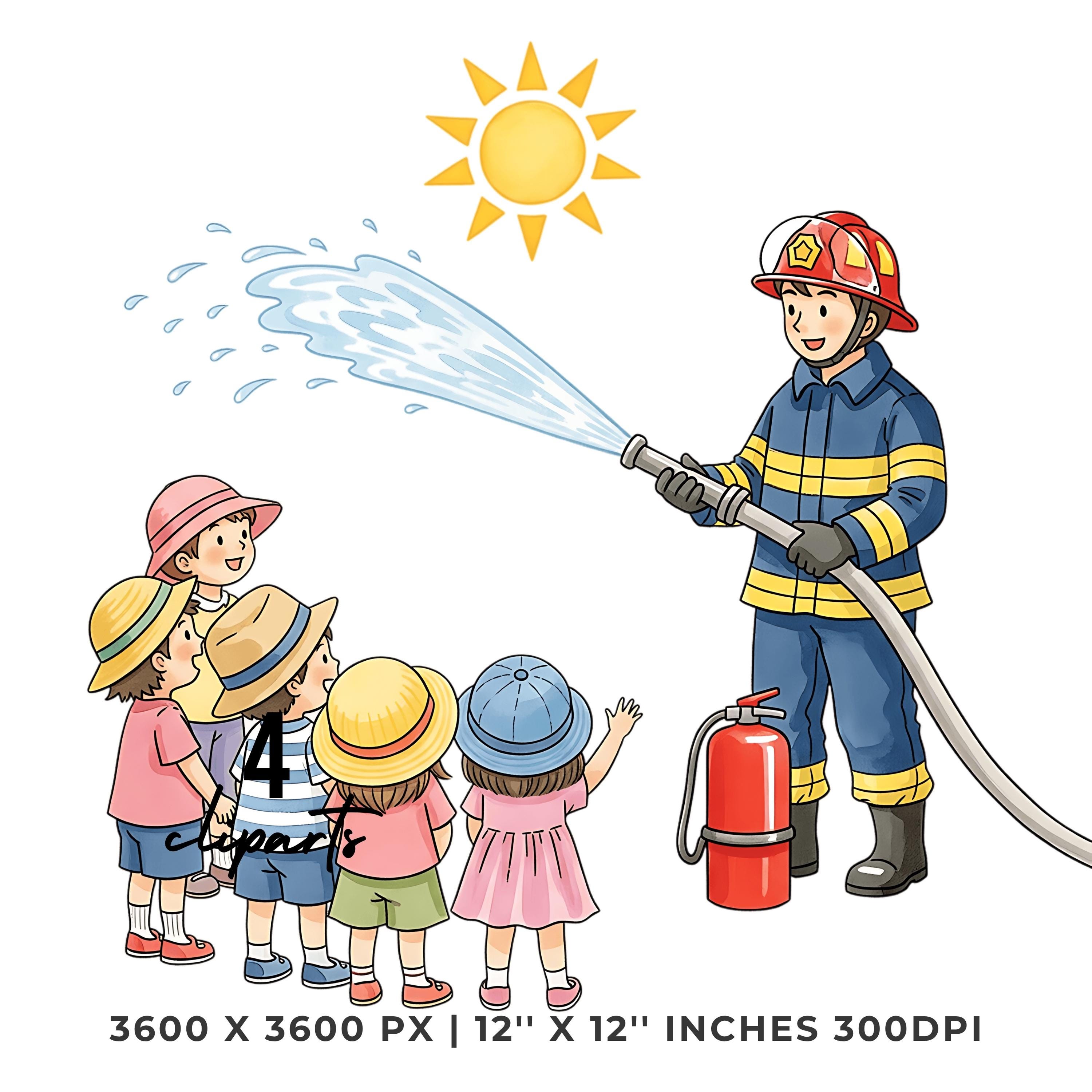 Firefighter Safety Demo Clipart | Kids Learning About Fire Safety | 4 PNG & 4 JPG | Sublimation Design | 12″x12″ 300DPI Commercial Use is an eye-catching, high-resolution digital asset designed for creators, crafters, teachers, and small business owners looking to elevate their visuals.