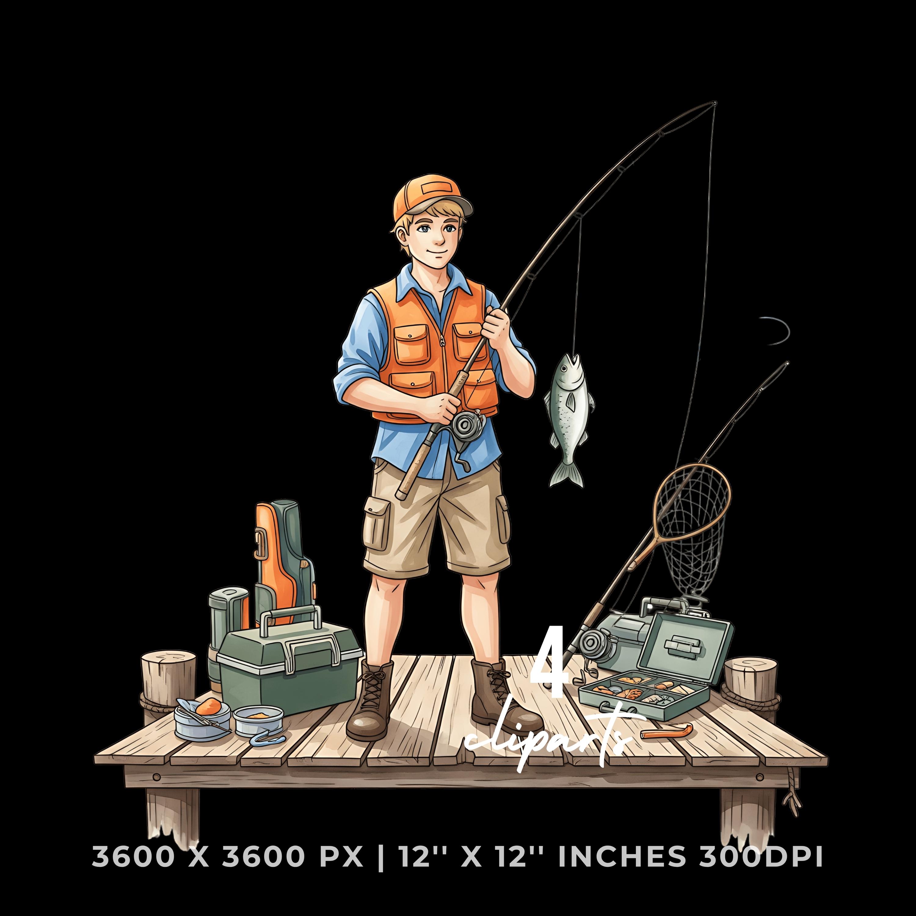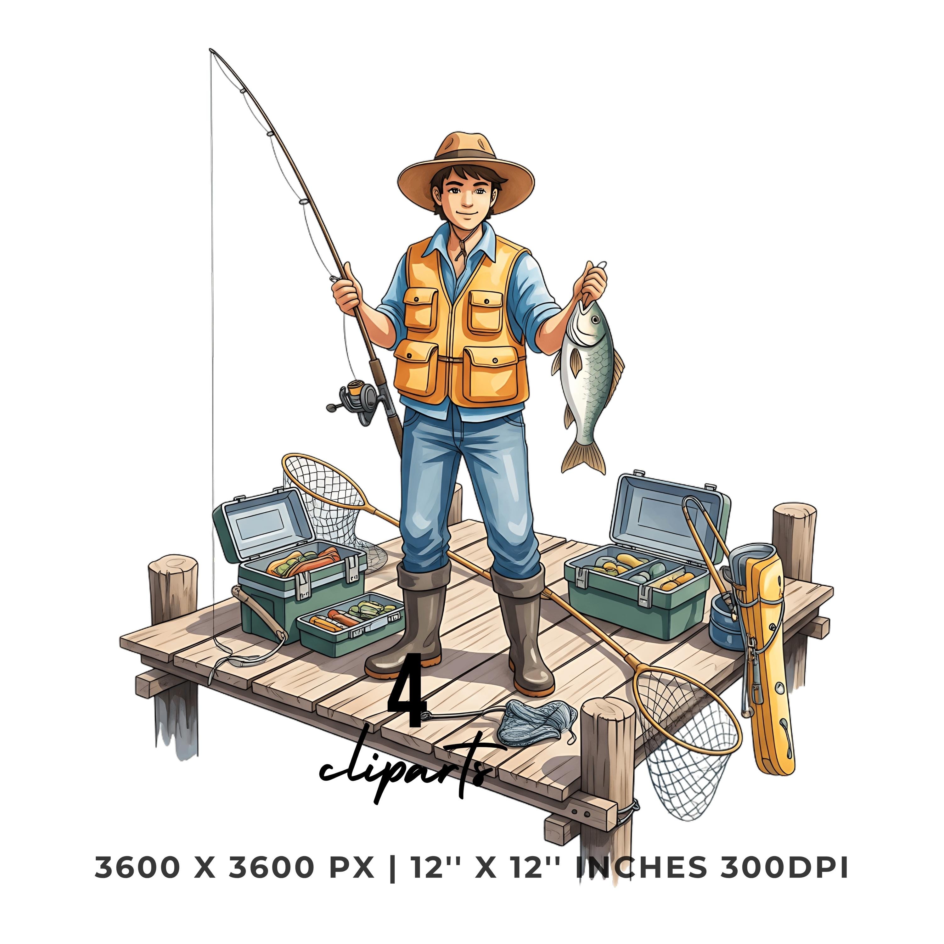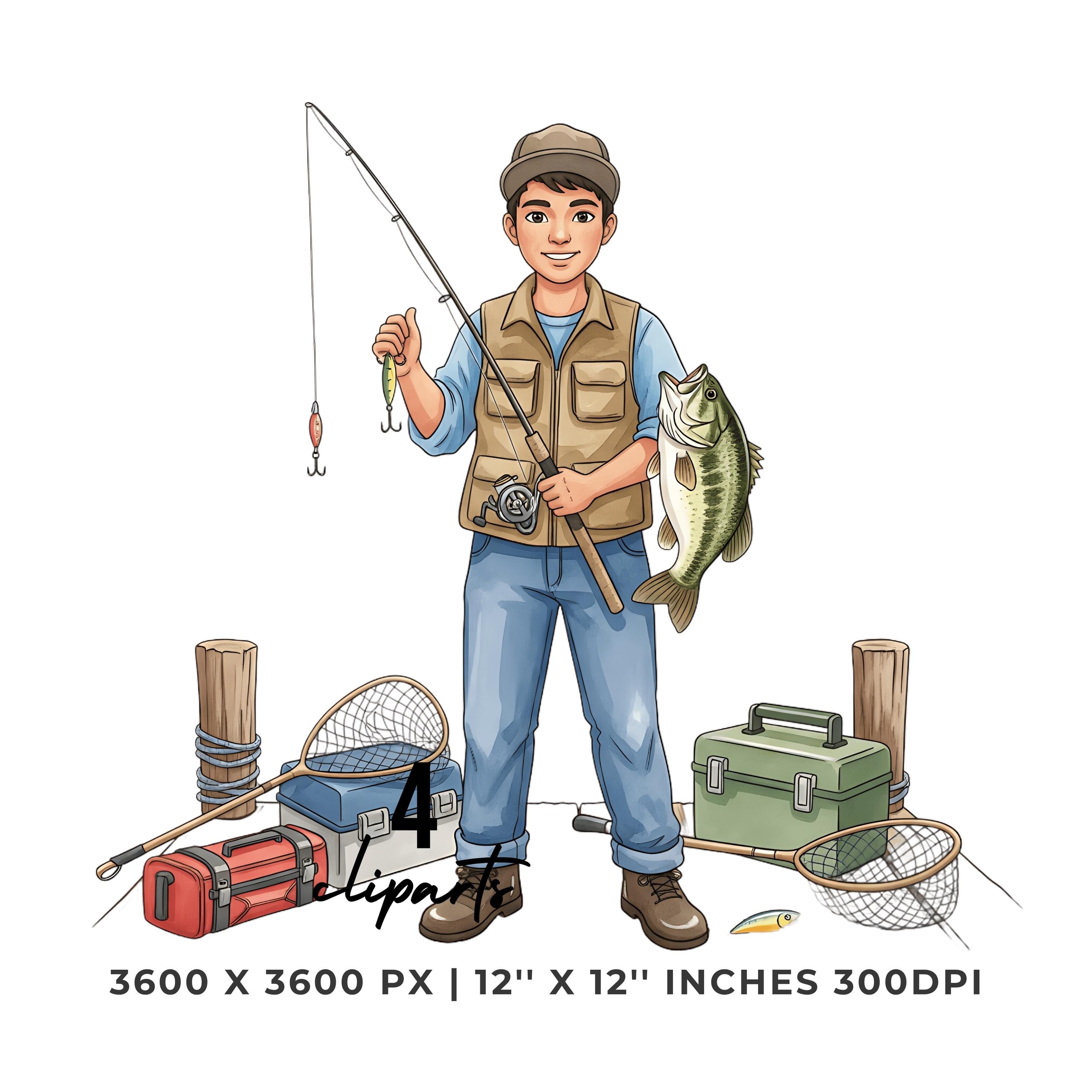 Fisherman PNG Clipart | Watercolor Young Fishing Guide holding a Fishing Rod | Summer Activity 4 PNG – 4 JPG Graphic Commercial Use