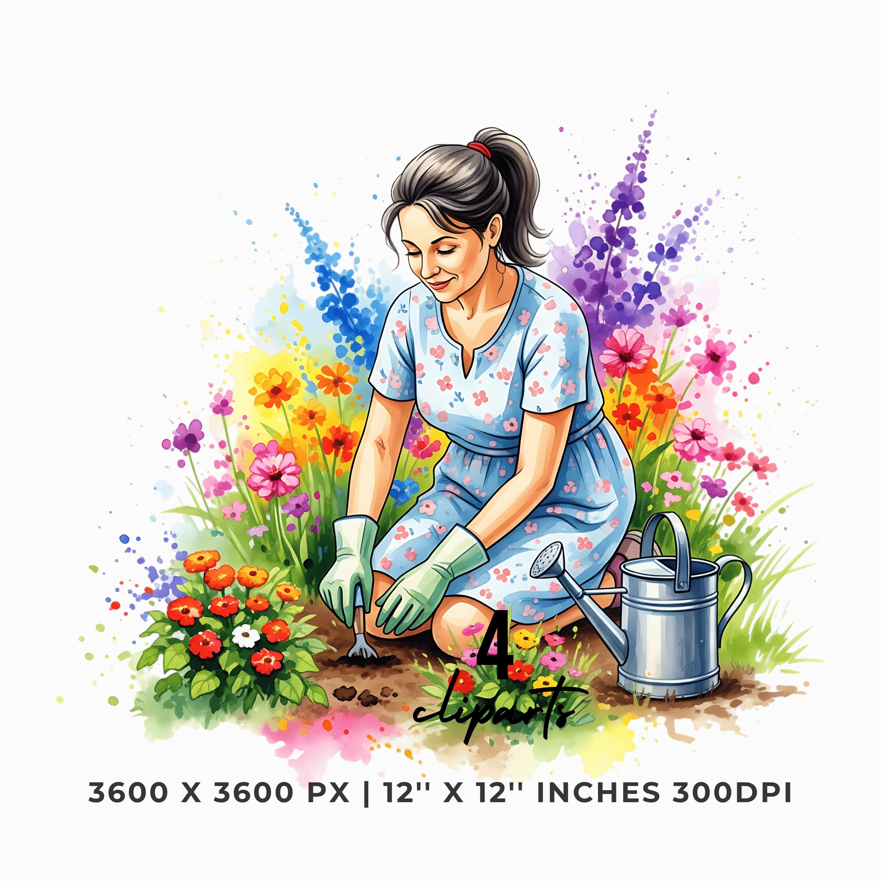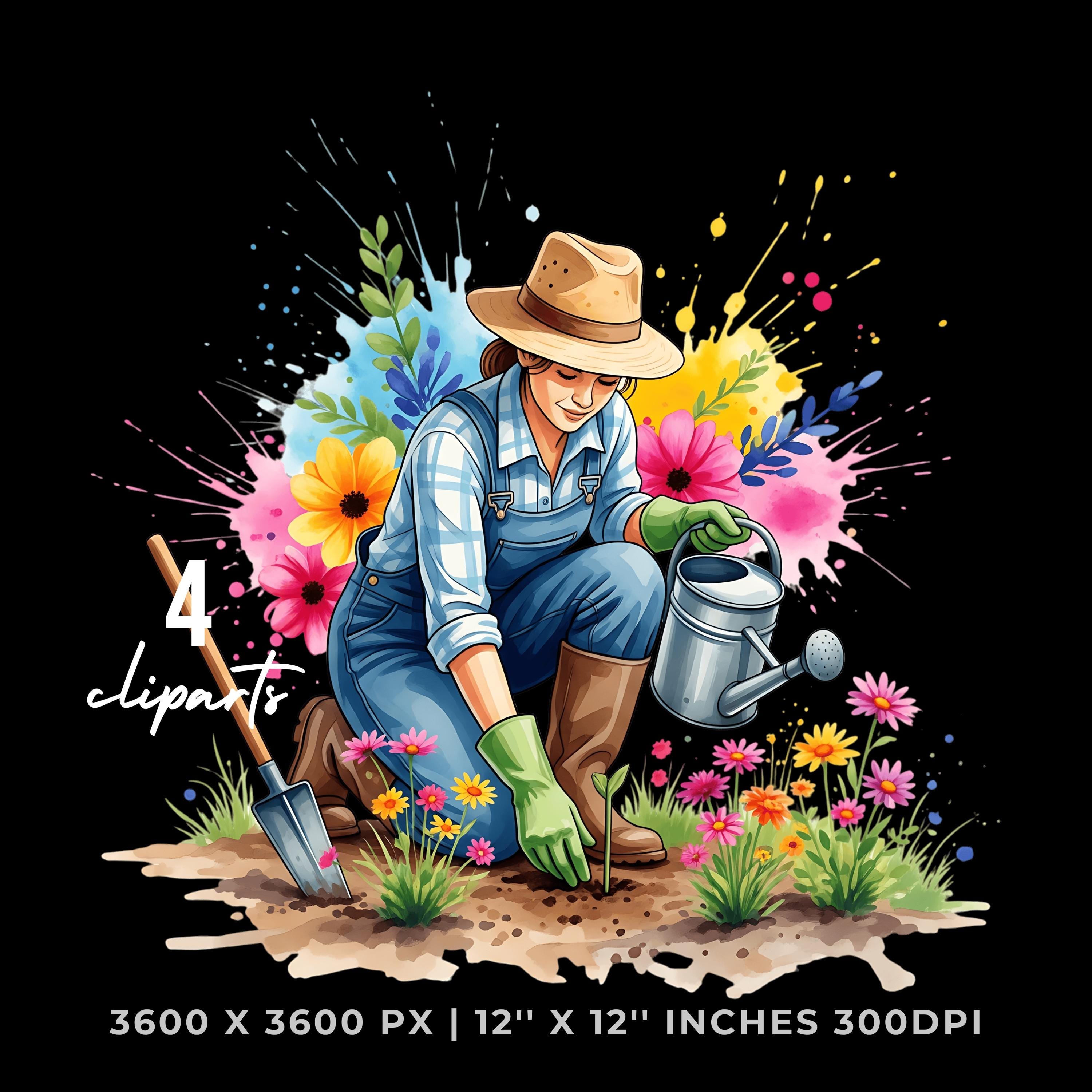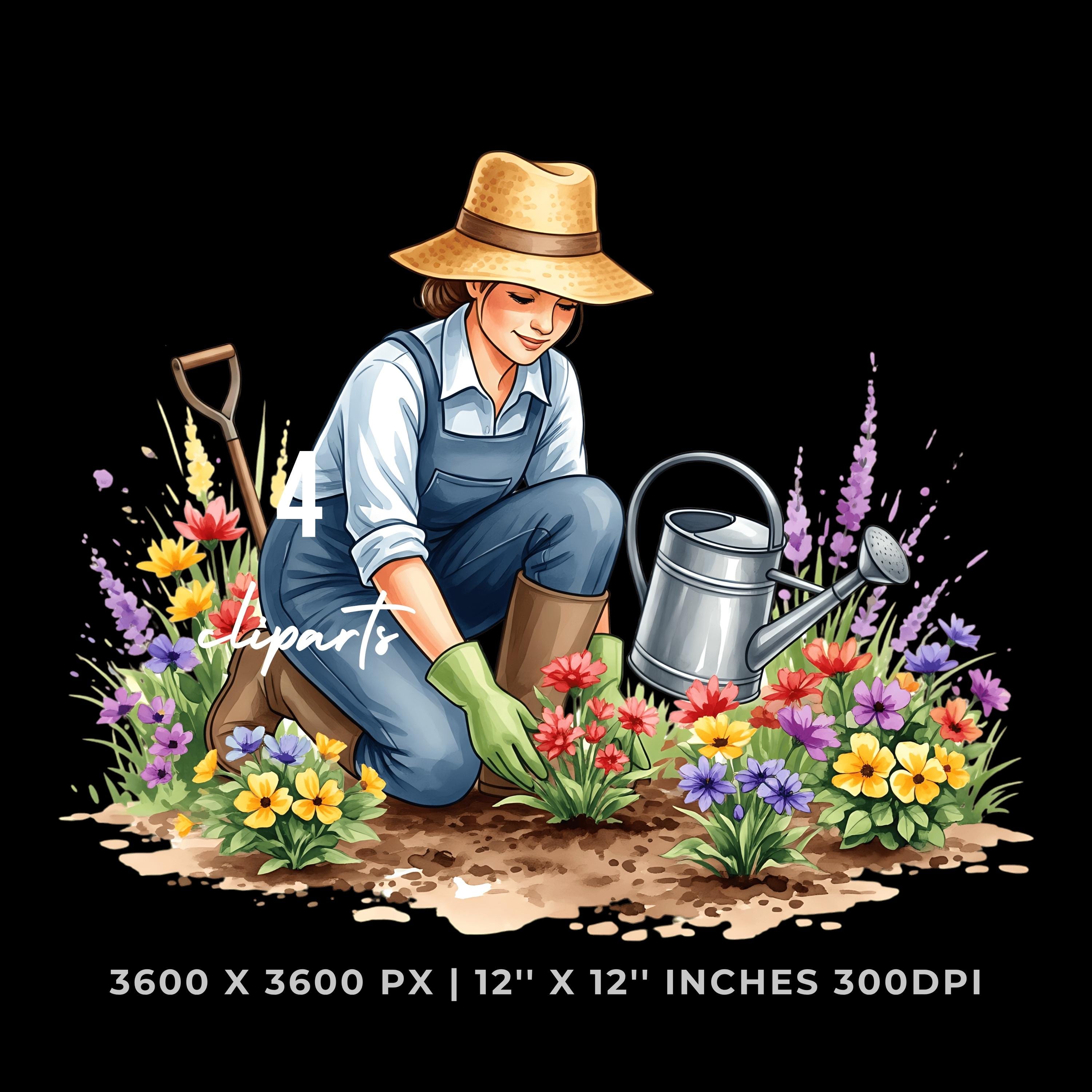 Flower Farm Workers PNG Clipart | Watercolor Gardener kneeling in flower beds | Florist worker | 4 PNG – 4 JPG Graphic Commercial Use is an eye-catching, high-resolution digital asset designed for creators, crafters, teachers, and small business owners looking to elevate their visuals.