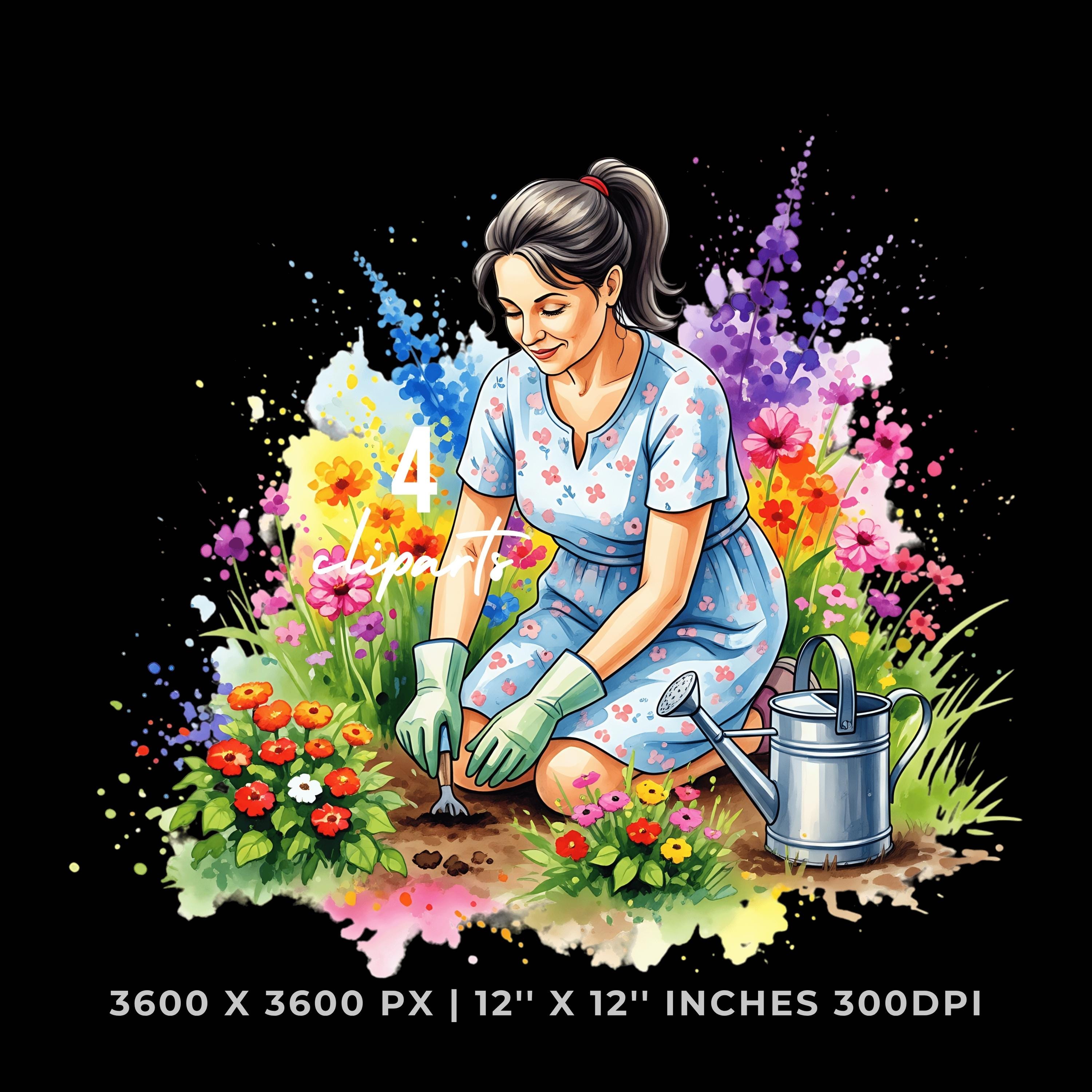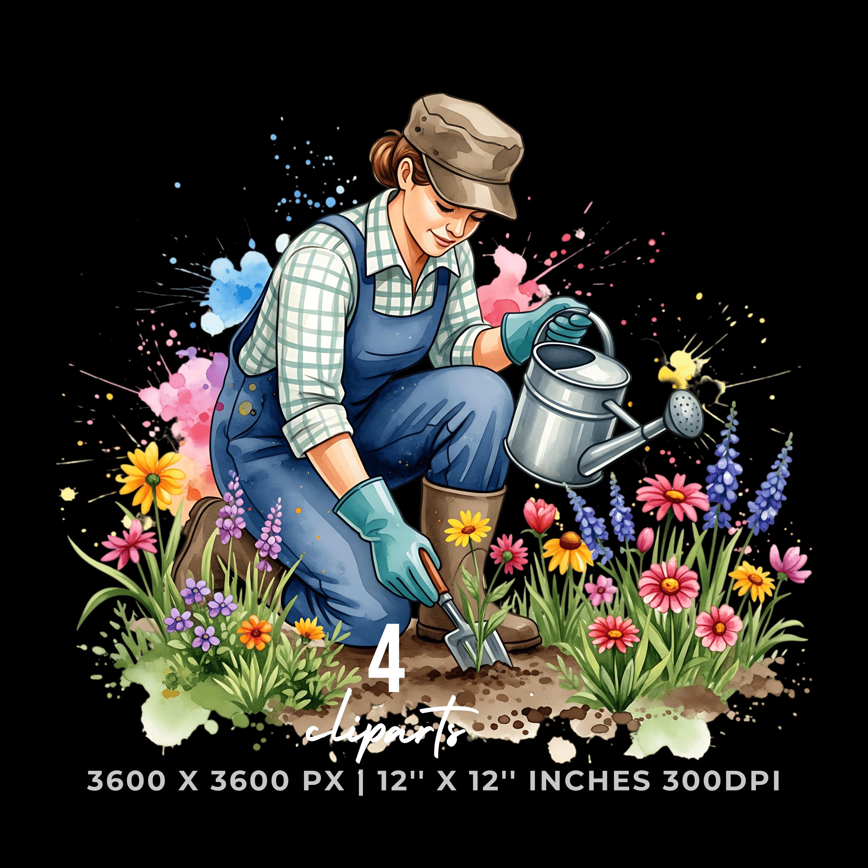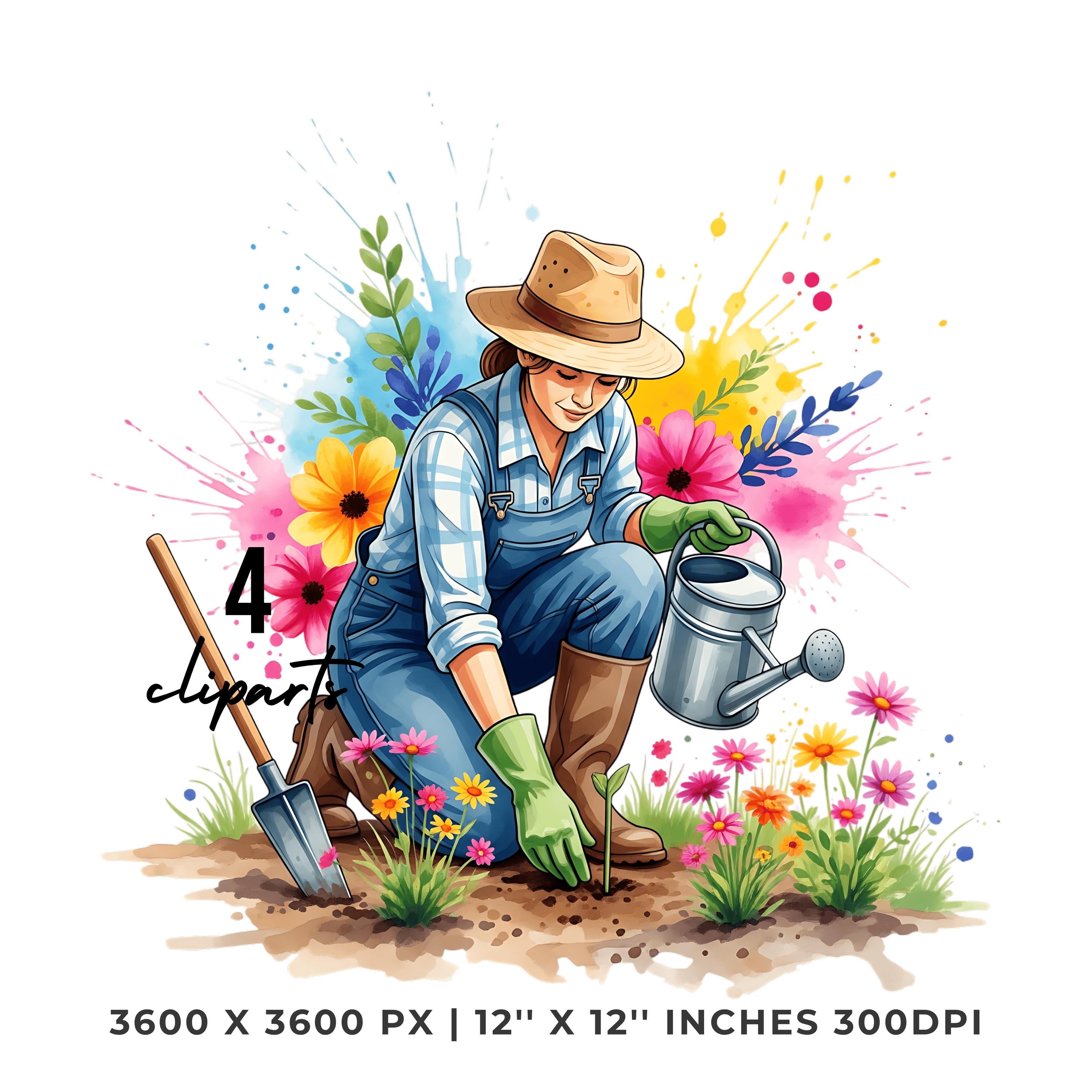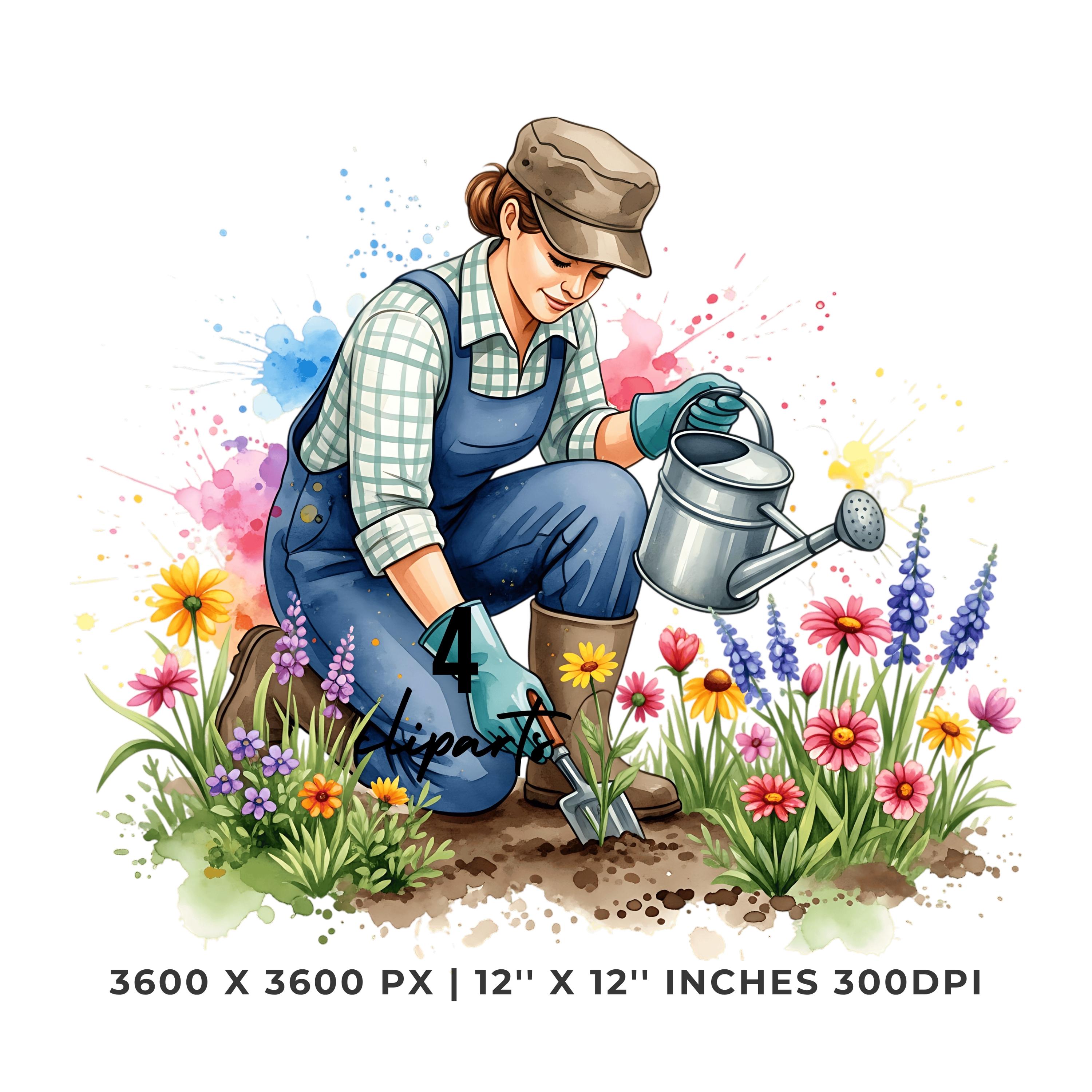 Flower Farm Workers PNG Clipart | Watercolor Gardener kneeling in flower beds with gloves & watering can | Florist worker | 4 PNG – 4 JPG Graphic Commercial Use