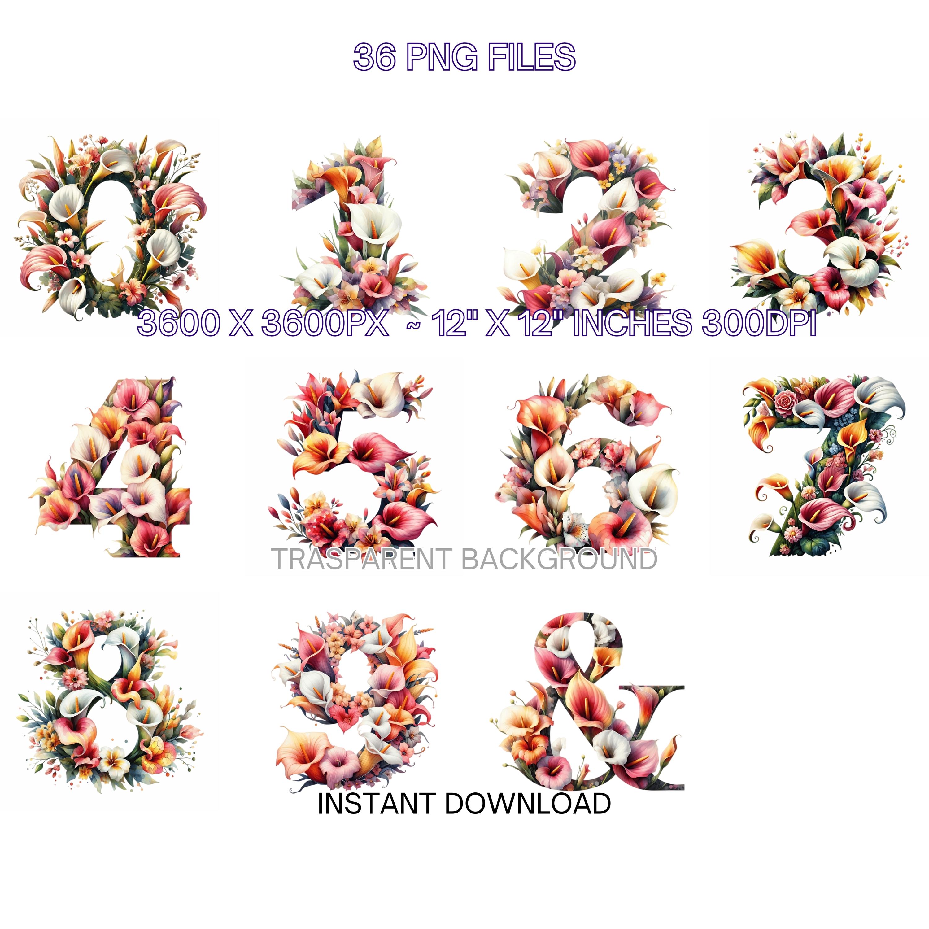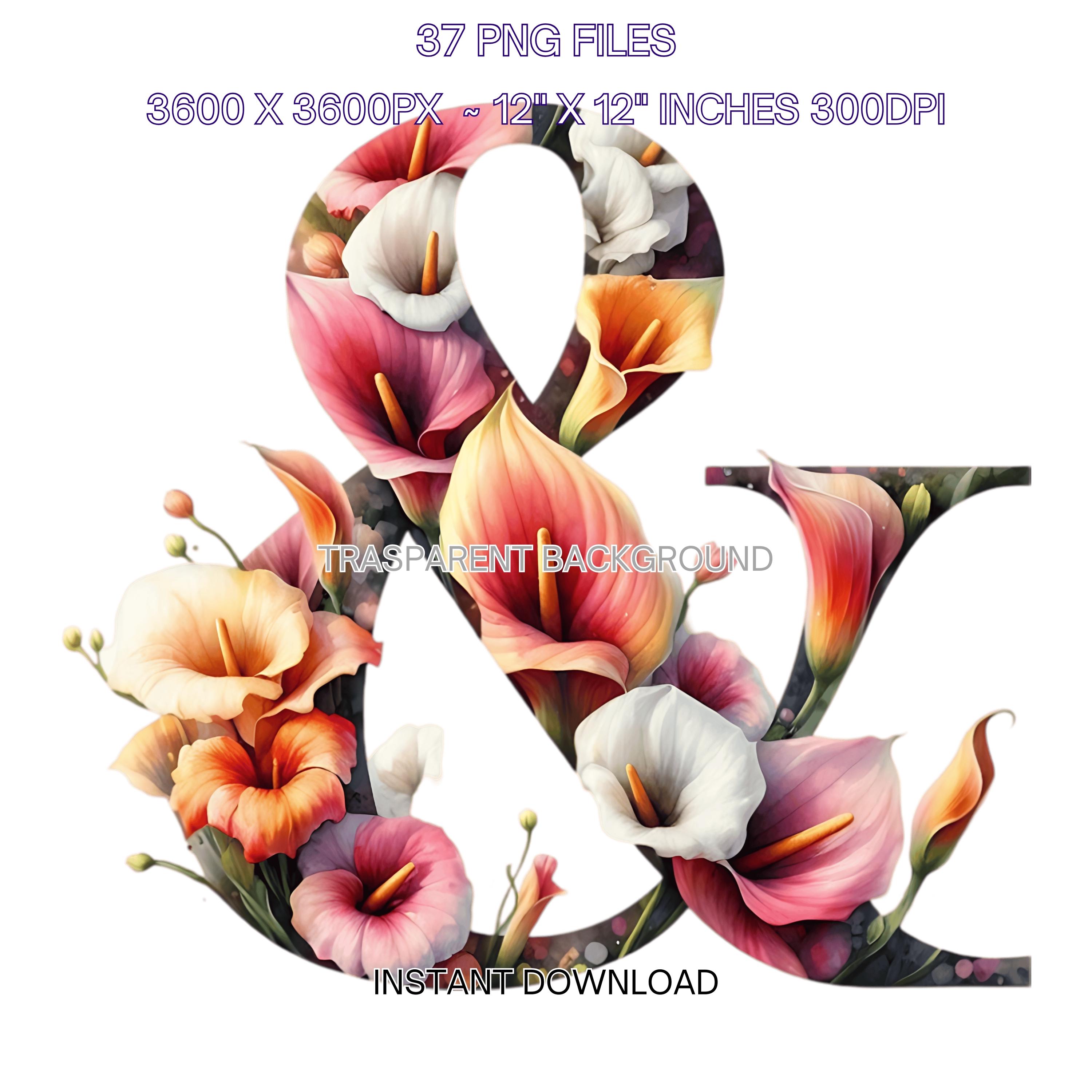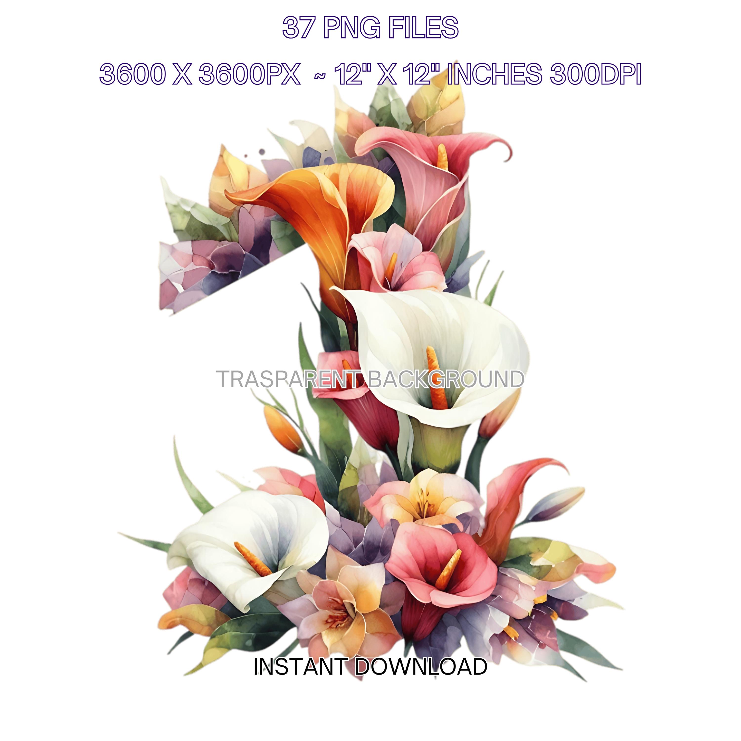 Flowers Alphabet PNG | 37 Watercolor Calla Lily Flowers Letters, Numbers for Invitation Cards Clipart | Full English Alphabet Commercial Use is an eye-catching, high-resolution digital asset designed for creators, crafters, teachers, and small business owners looking to elevate their visuals.