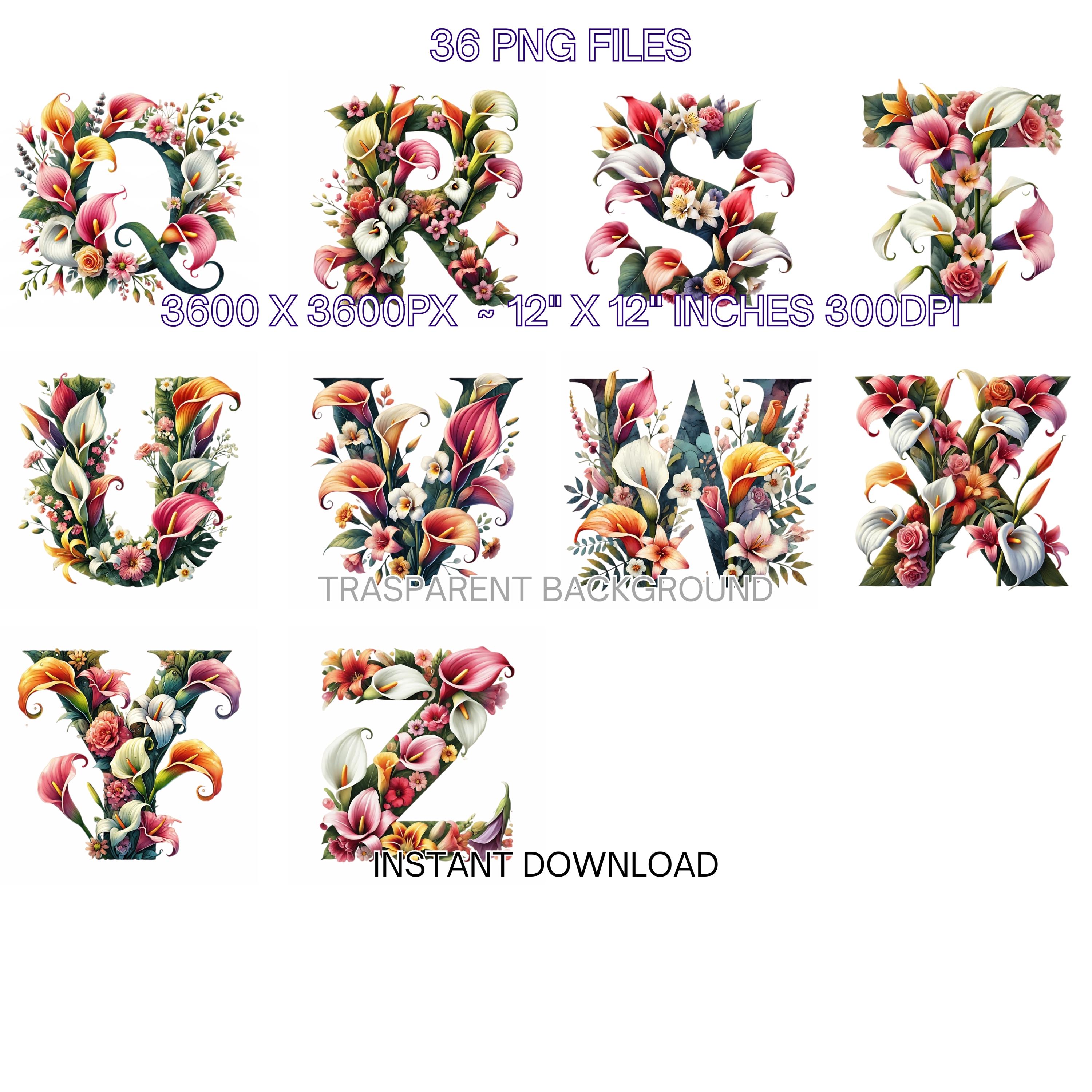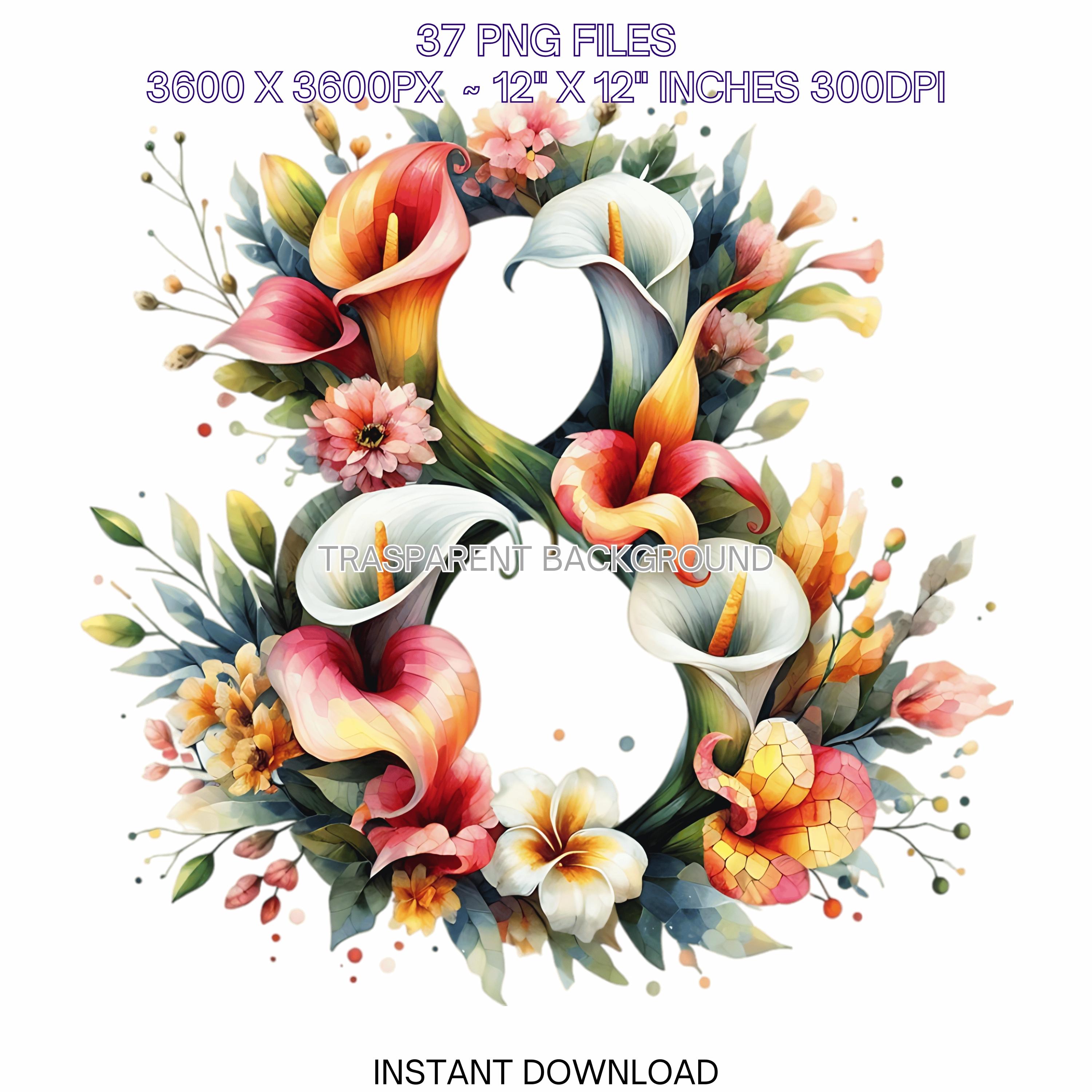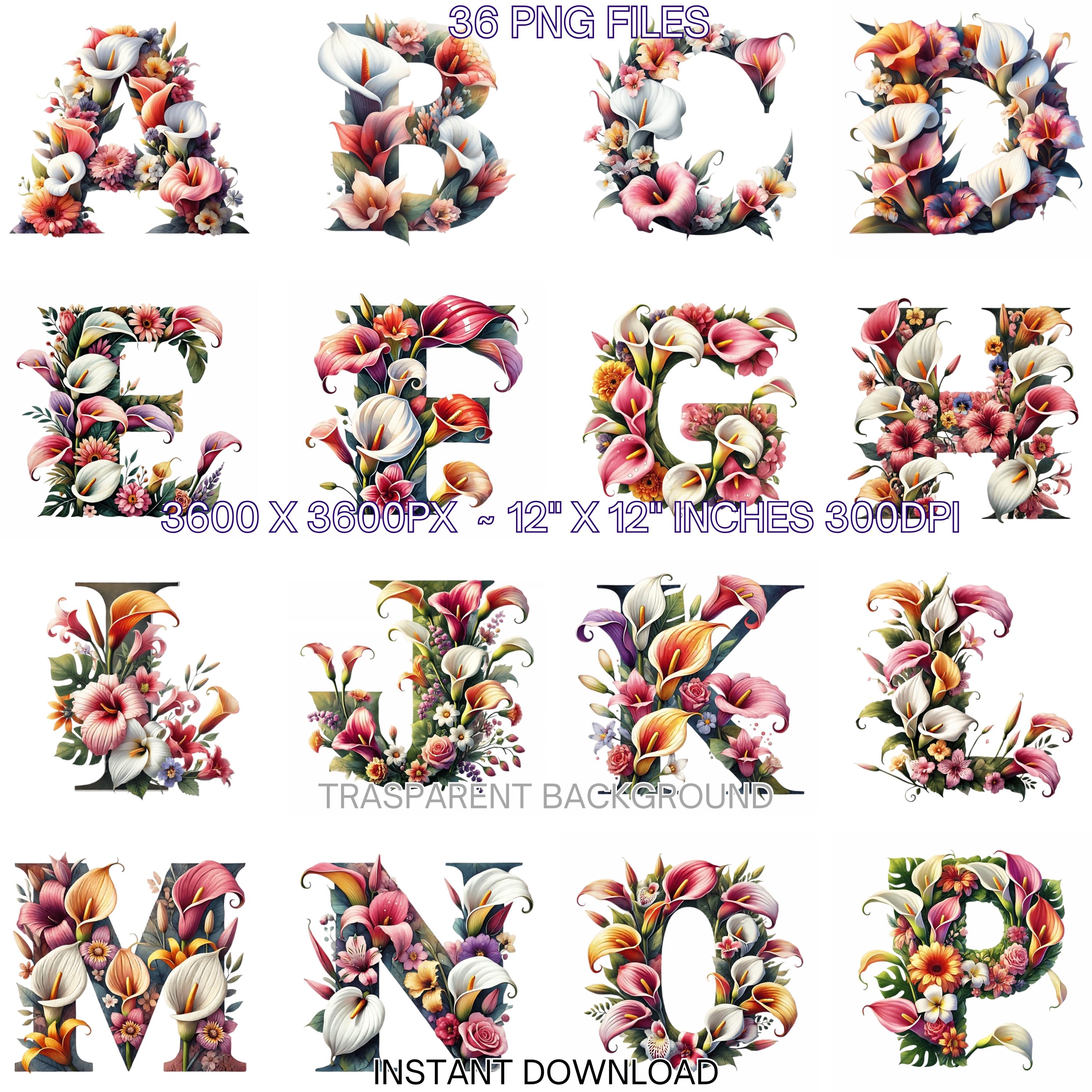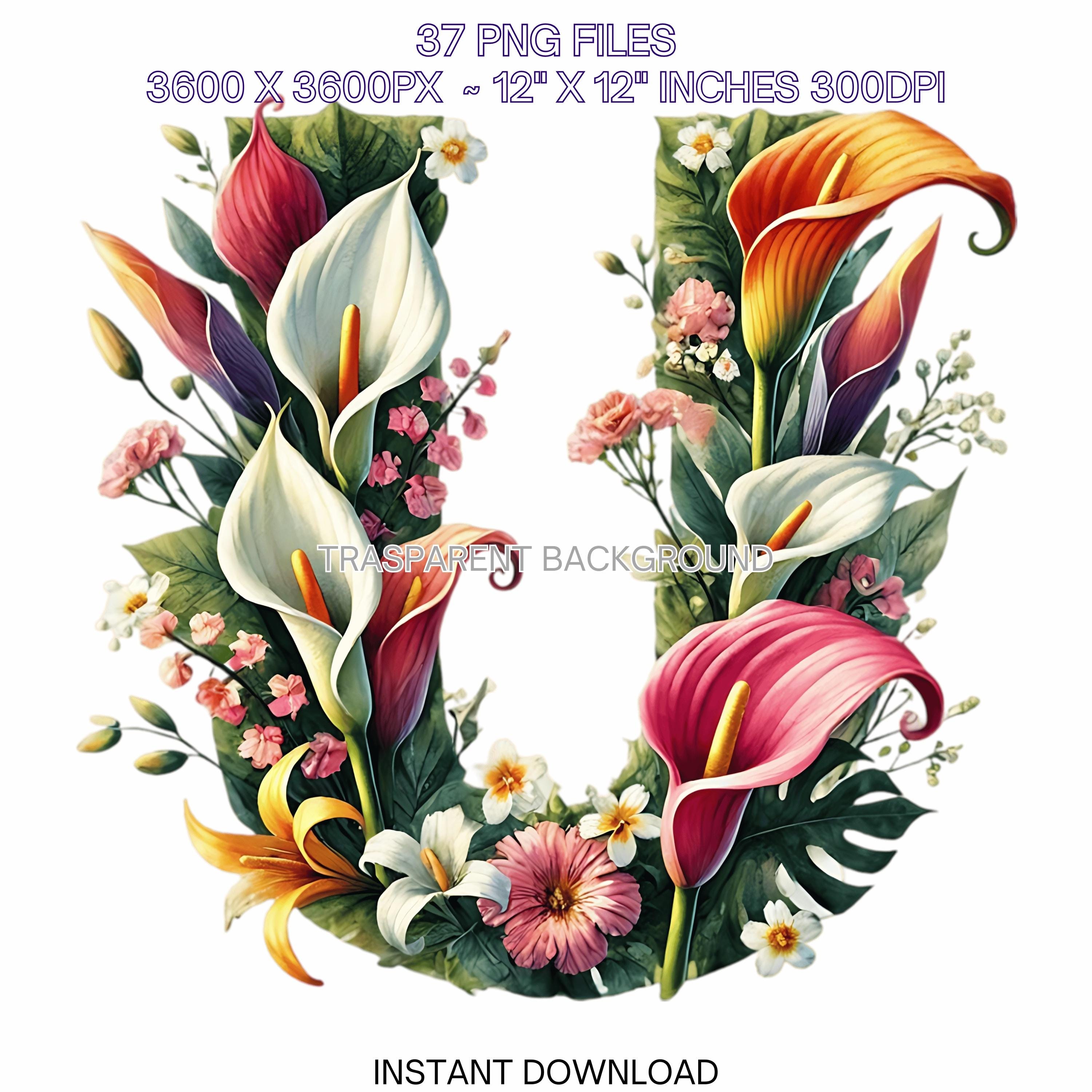 Flowers Alphabet PNG | 37 Watercolor Calla Lily Flowers Letters, Numbers for Invitation Cards Clipart | Full English Alphabet Commercial Use is an eye-catching, high-resolution digital asset designed for creators, crafters, teachers, and small business owners looking to elevate their visuals.