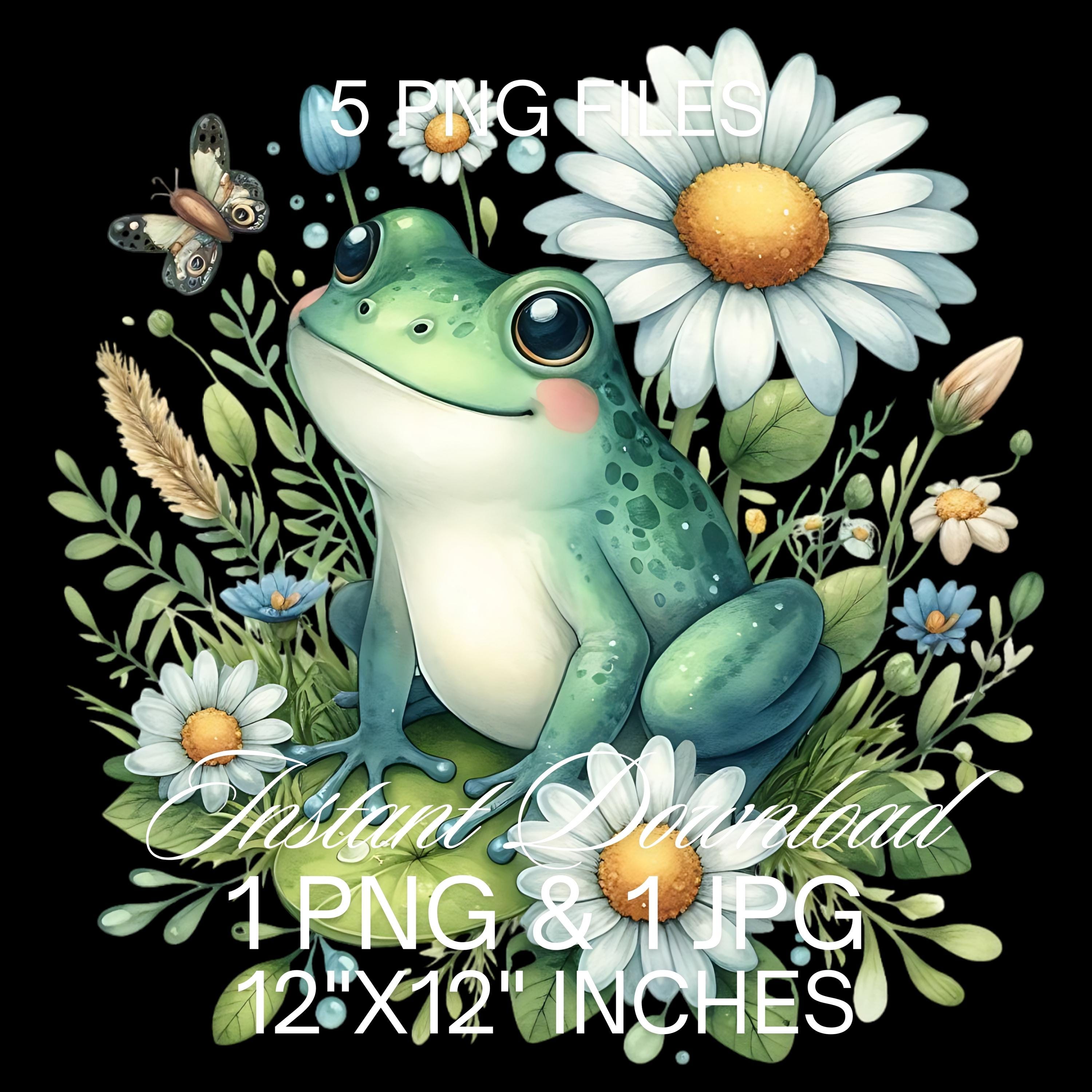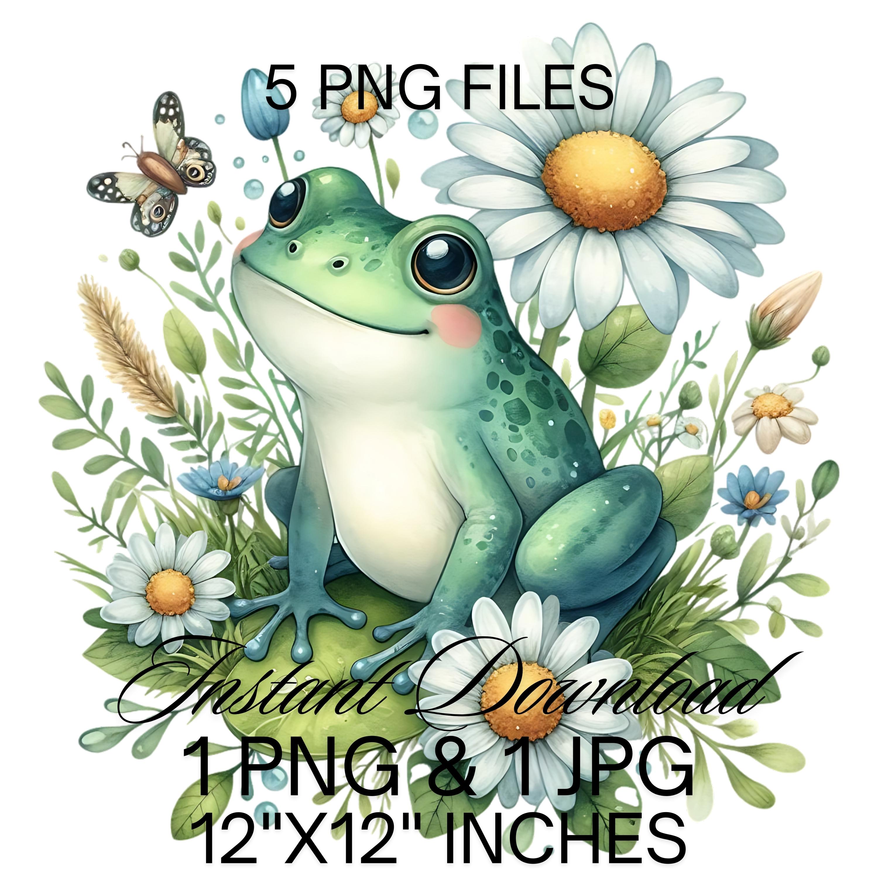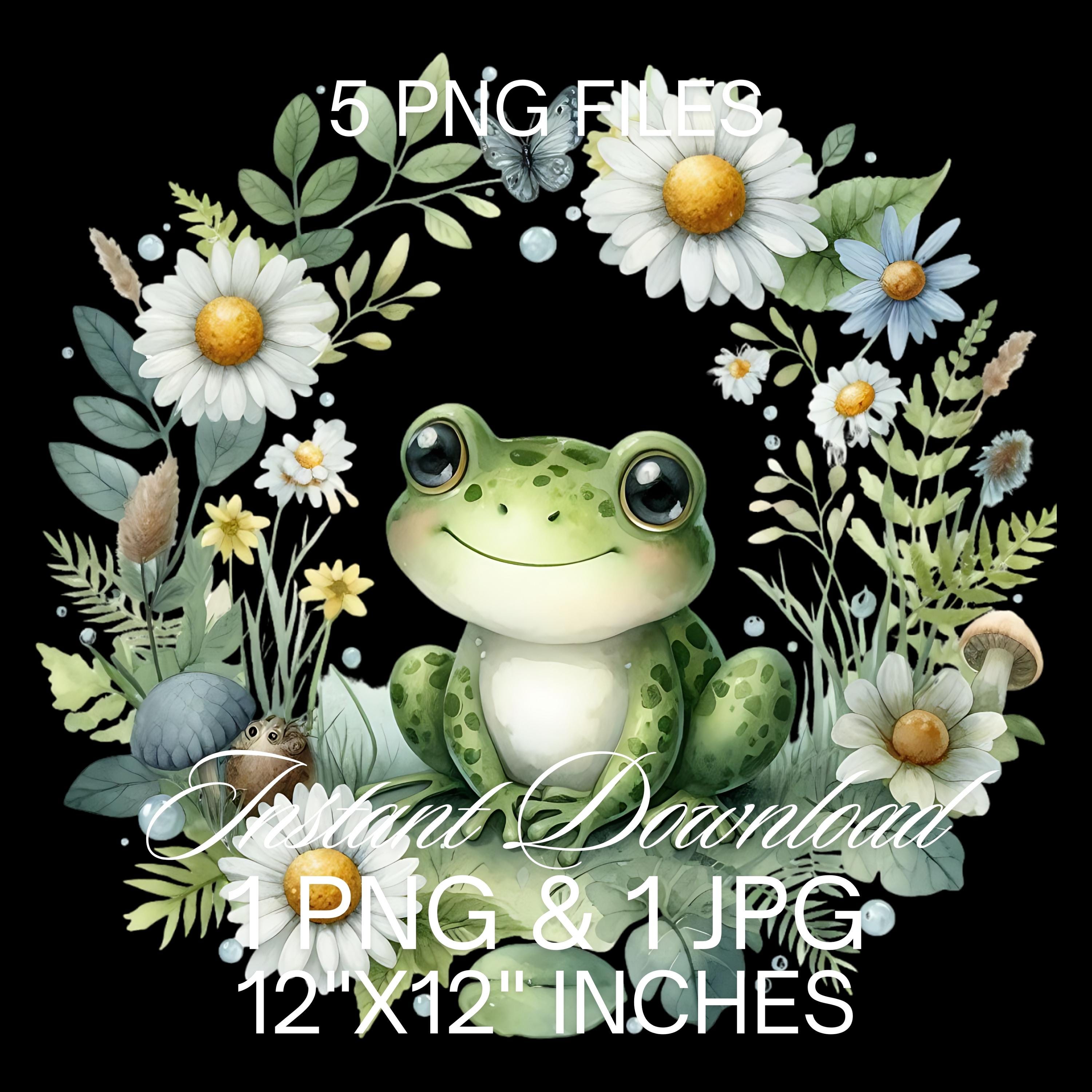 Watercolor Frog Clipart PNG | Cute Frog with Spring Daisy Flowers Frame | Woods Forest Animals Water Aquatic 5 PNG – 5 JPG Sublimation Commercial Use