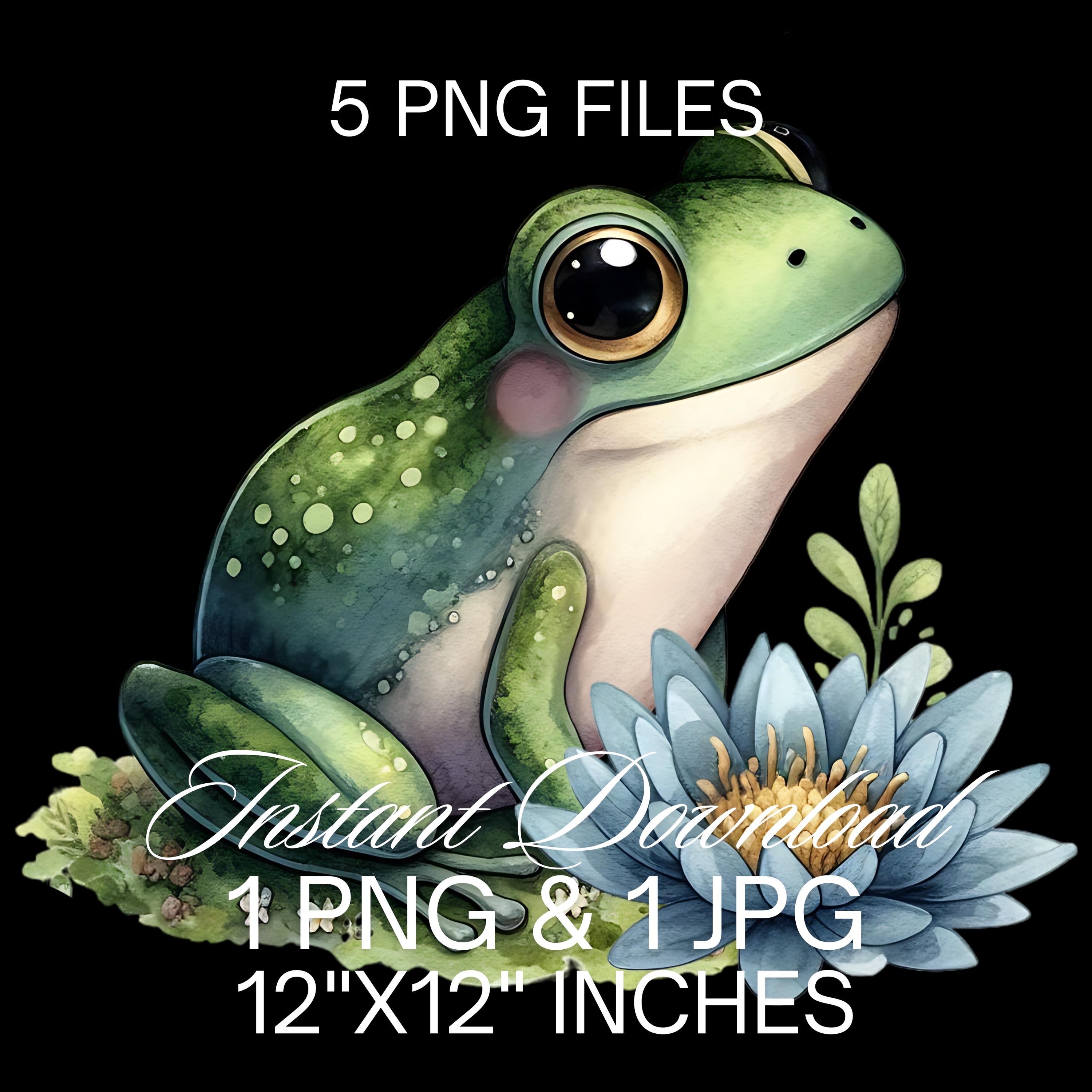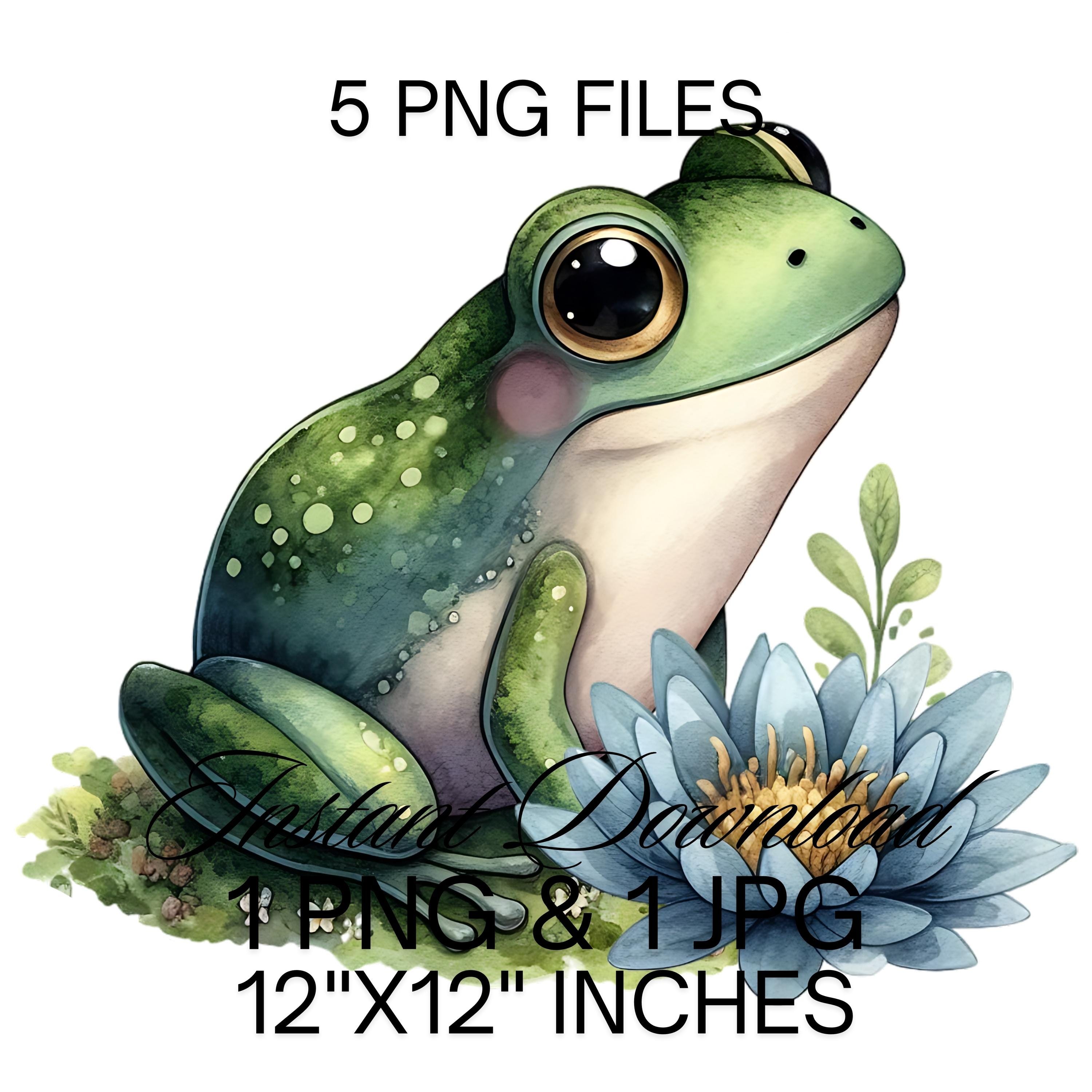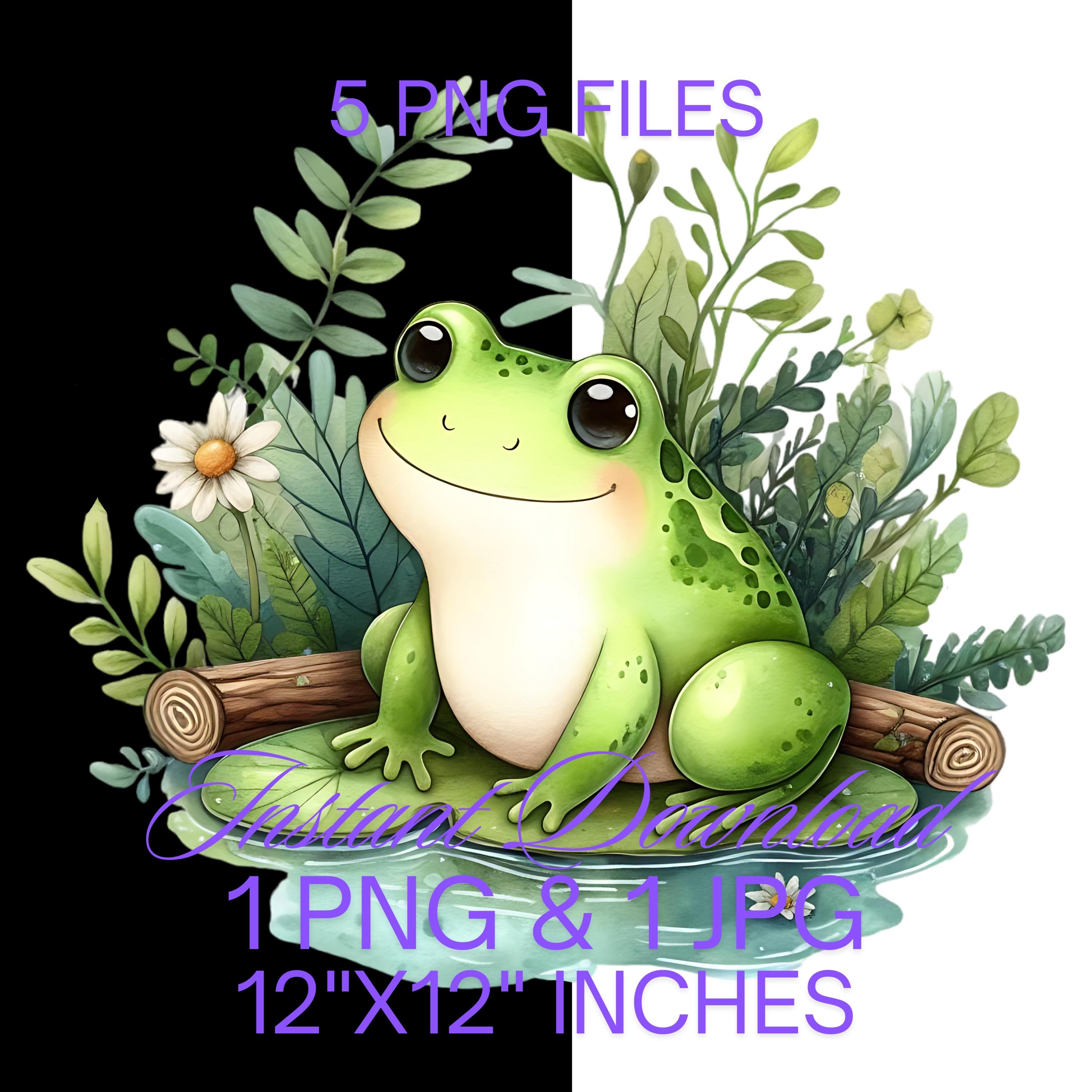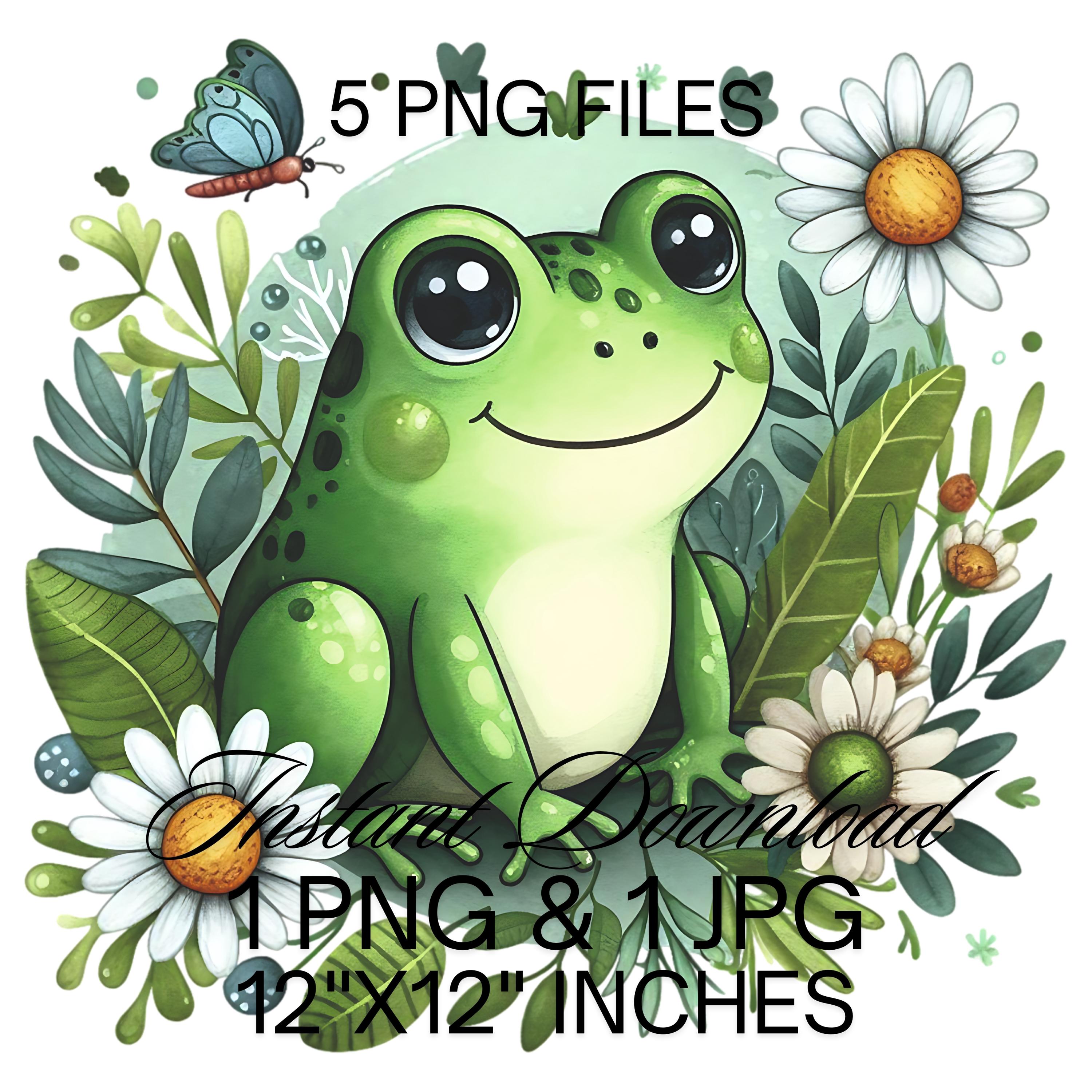 Watercolor Frog Clipart PNG | Cute Frog with Spring Daisy Flowers Frame | Woods Forest Animals Water Aquatic 5 PNG – 5 JPG Sublimation Commercial Use
