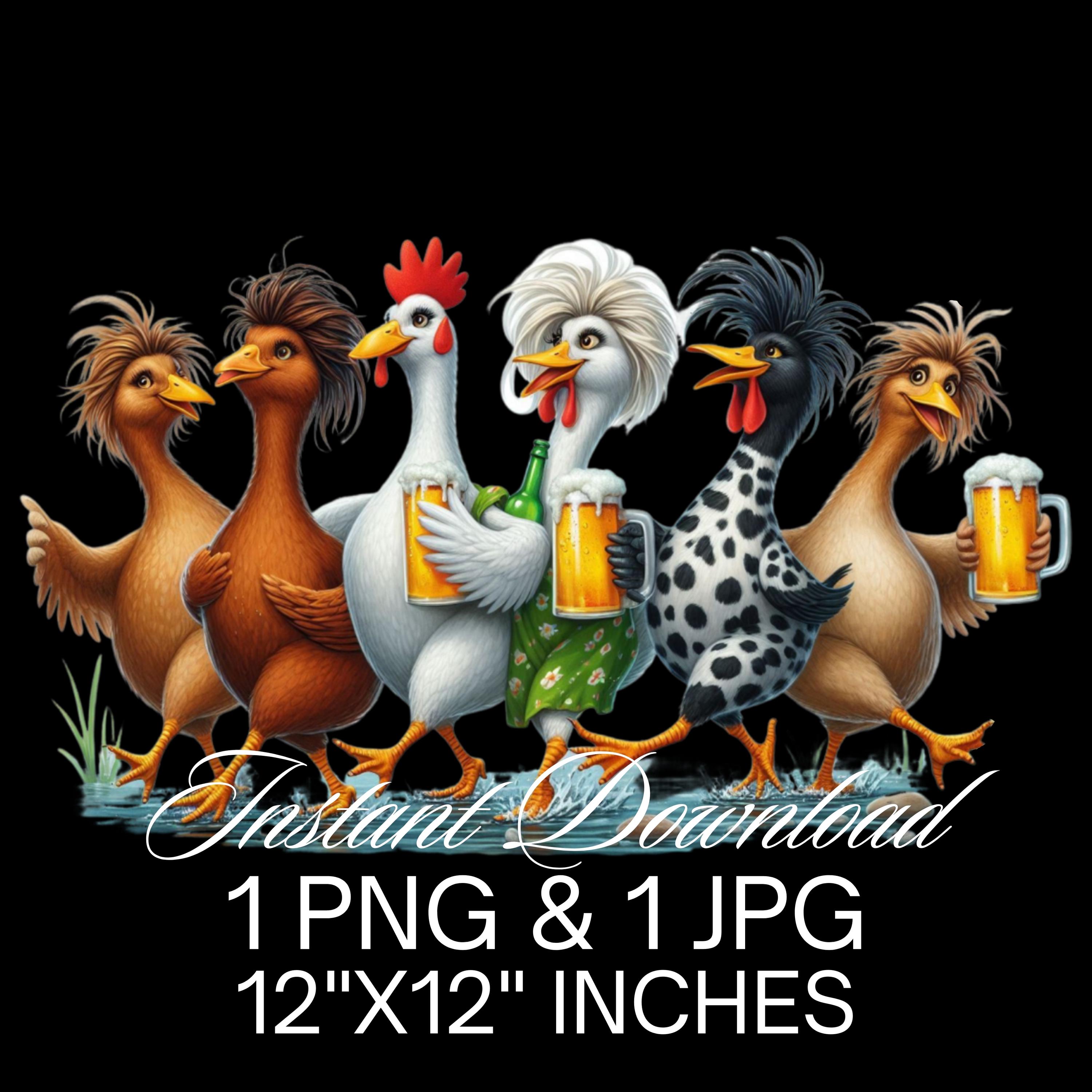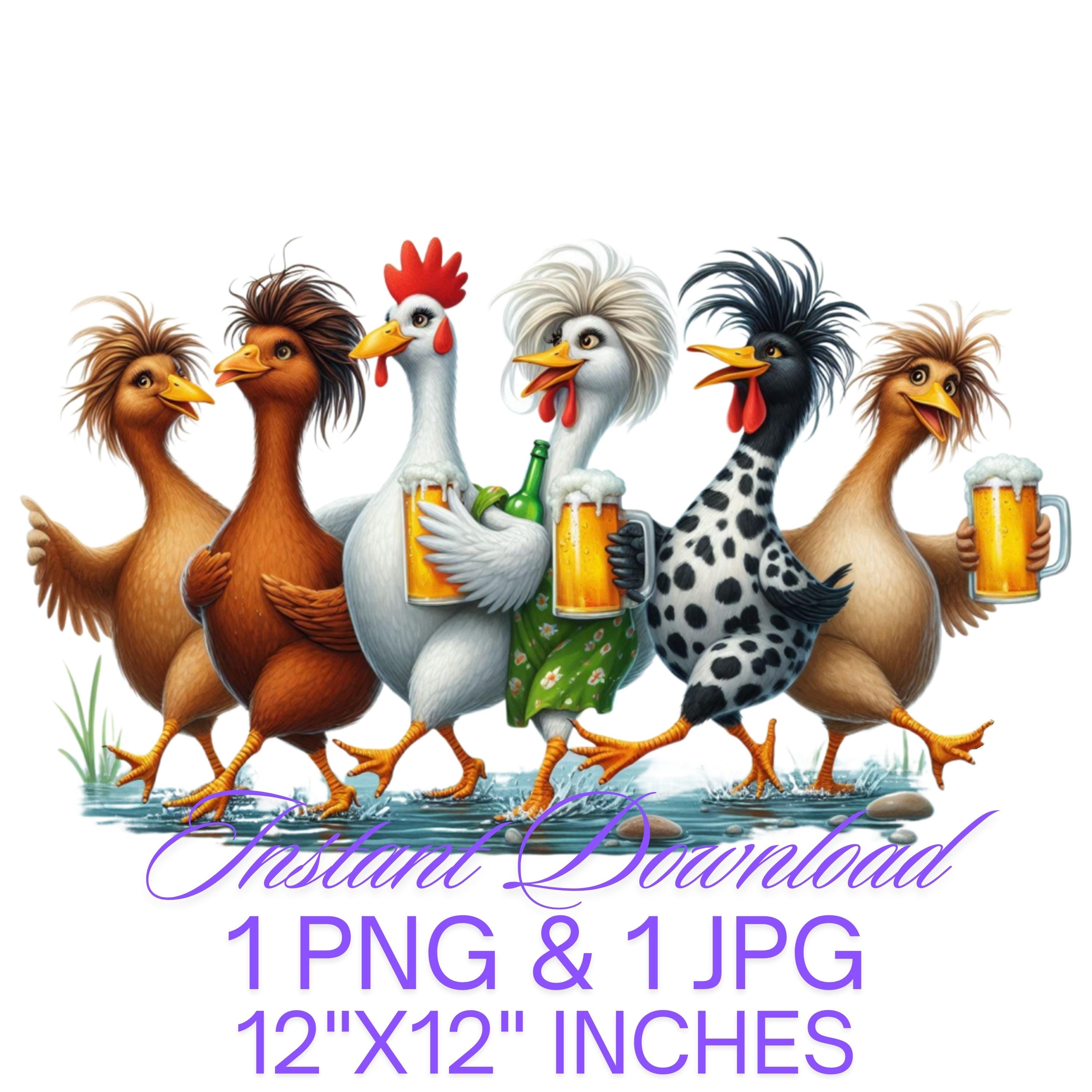 Funny Hens PNG | Cute Hens Dink Beer PNG Sublimation | Six Crazy Hens Party | Commercial Use | Chicken Chicks Farm Life | Digital Download is an eye-catching, high-resolution digital asset designed for creators, crafters, teachers, and small business owners looking to elevate their visuals.