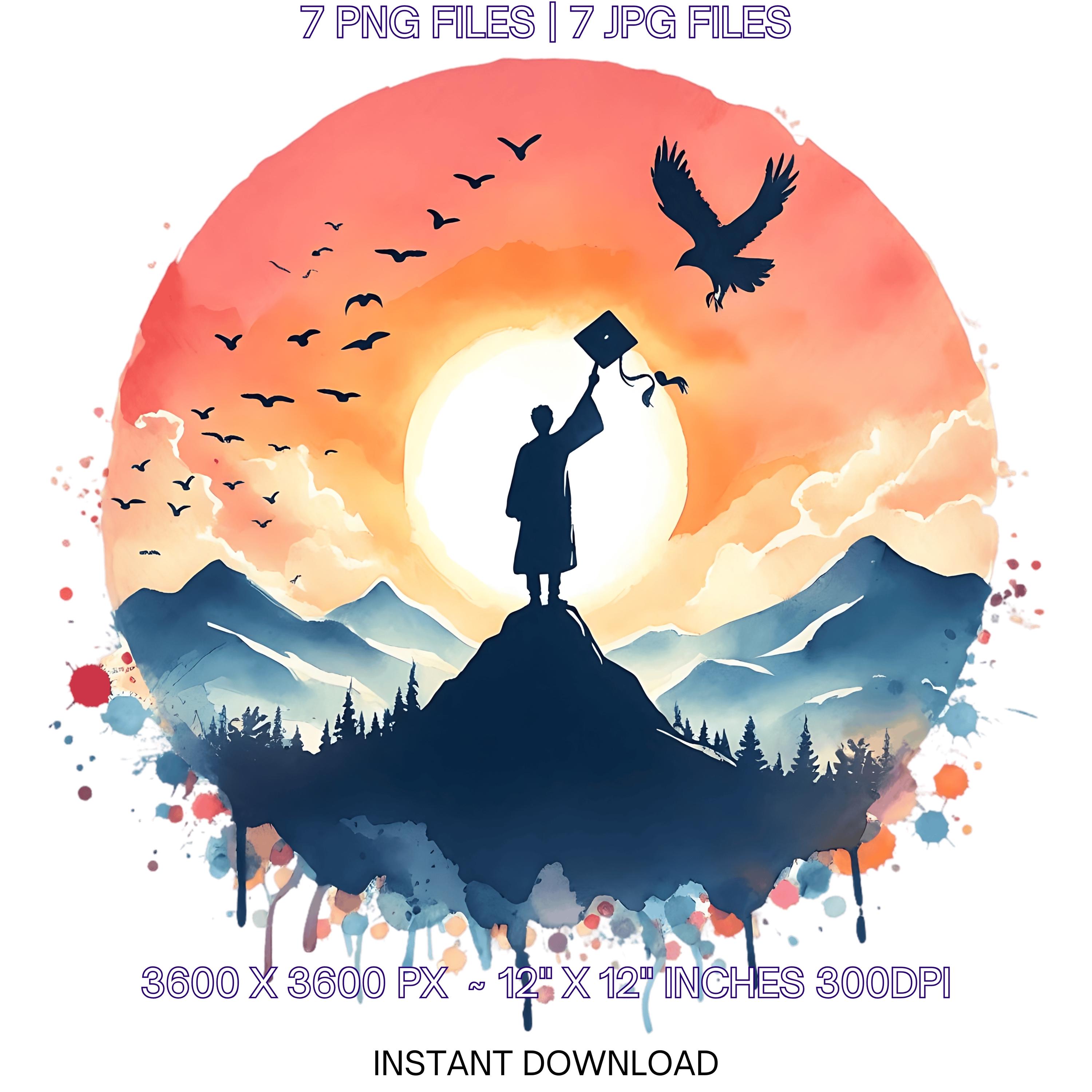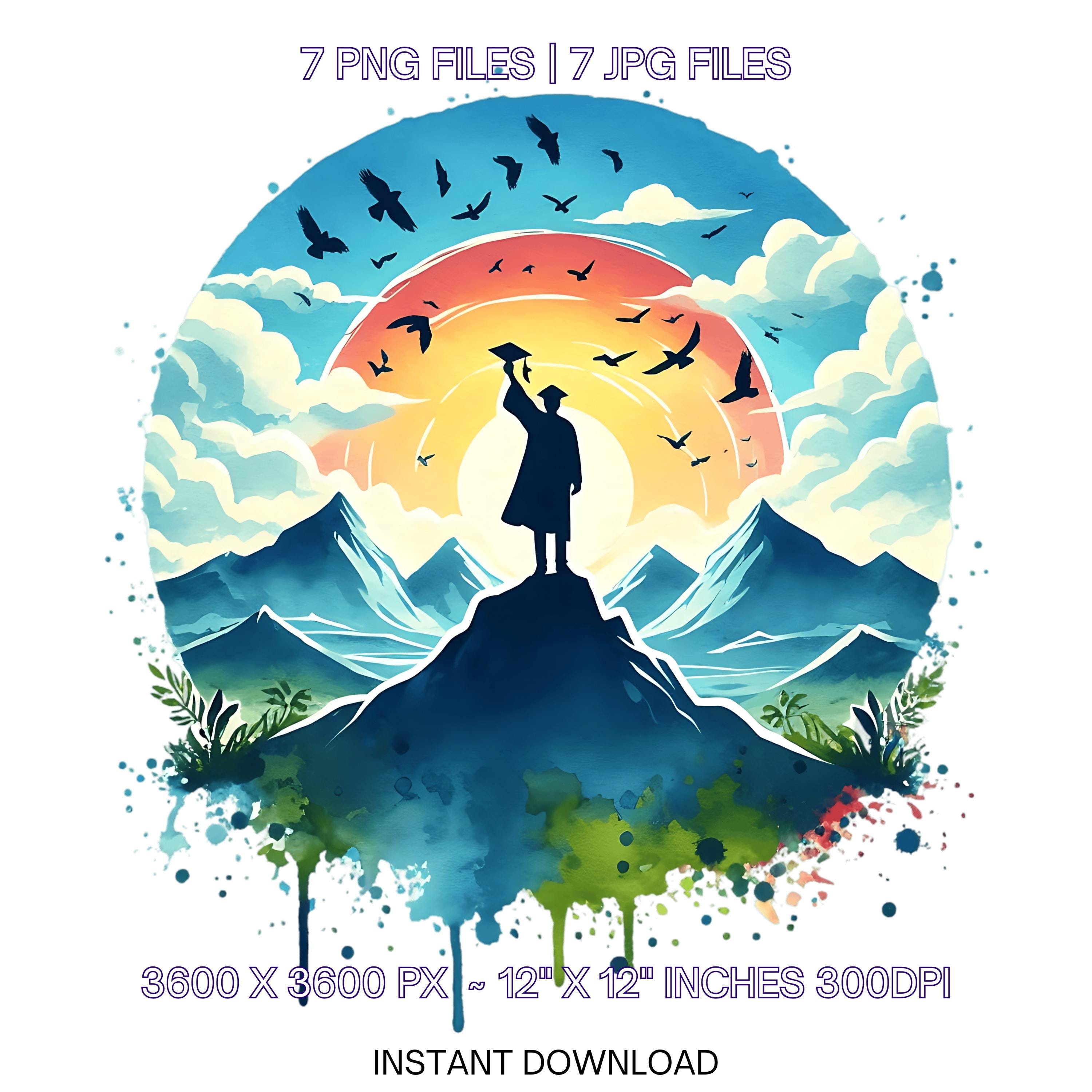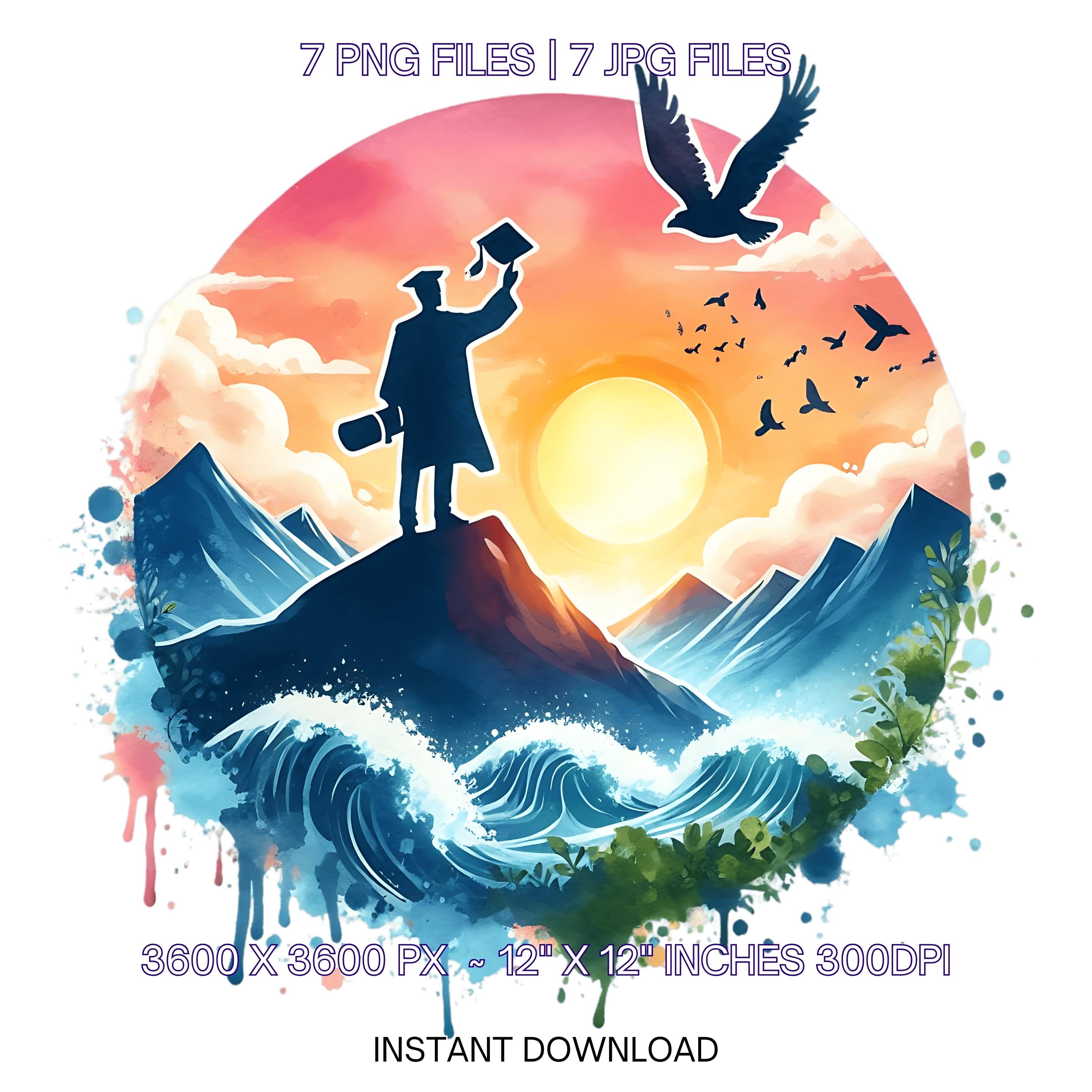 Future is Bright | A silhouette of a graduate on a mountain peak, holding a diploma, sunrise & birds flying | Graduate Clipart PNG 7 PNG-JPG is an eye-catching, high-resolution digital asset designed for creators, crafters, teachers, and small business owners looking to elevate their visuals.