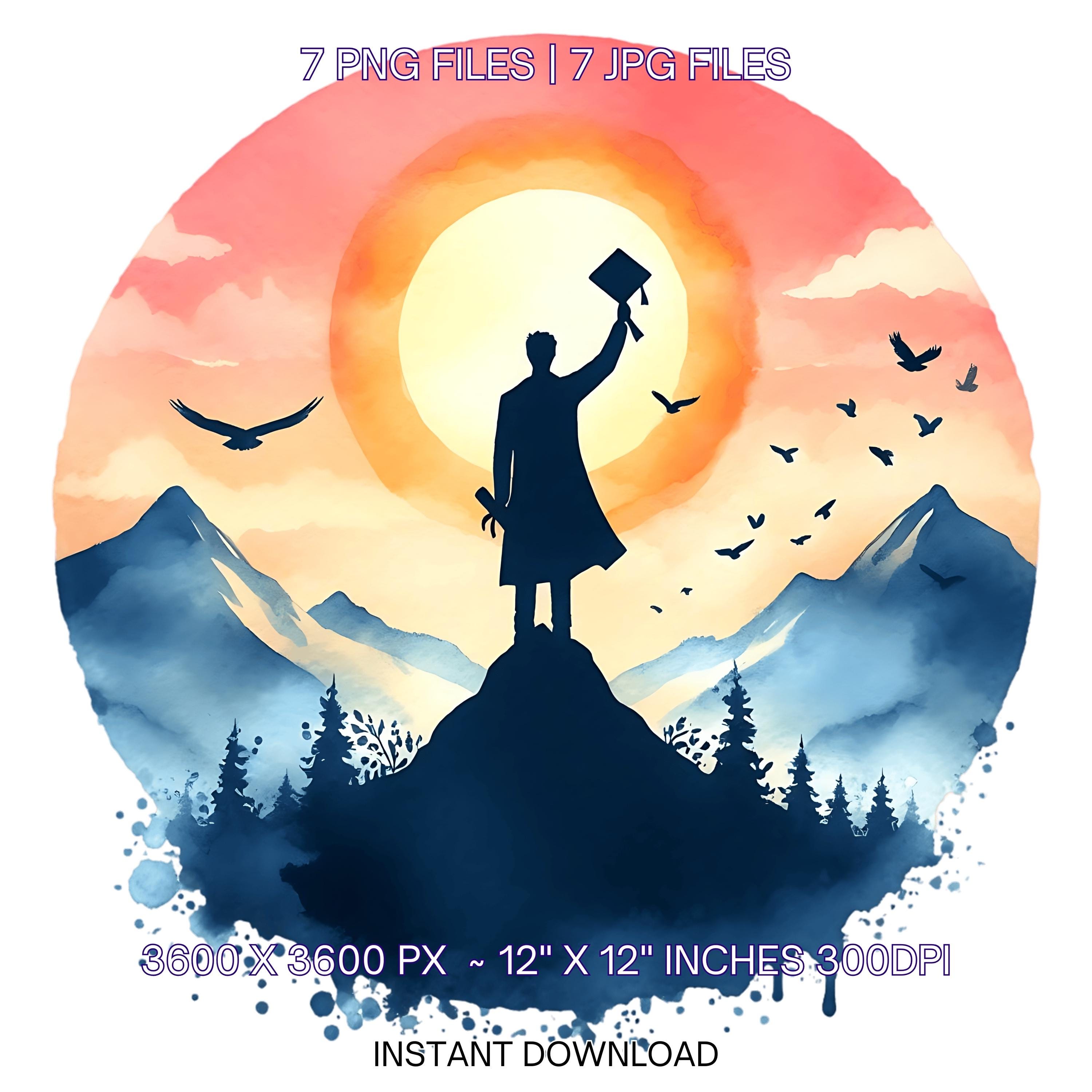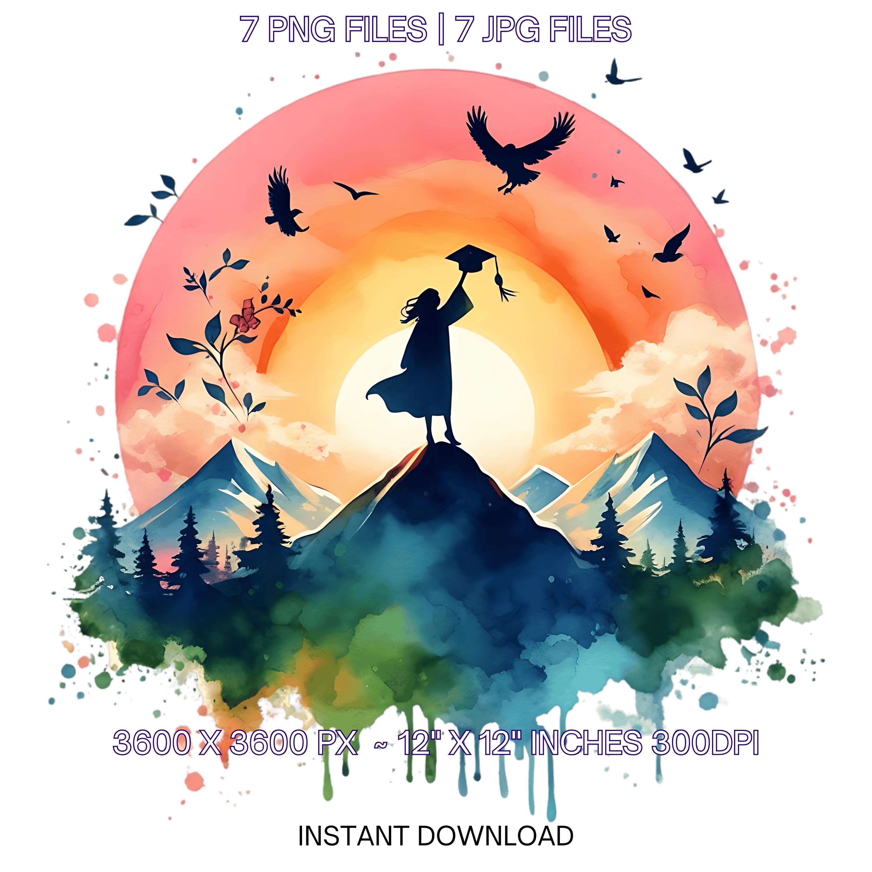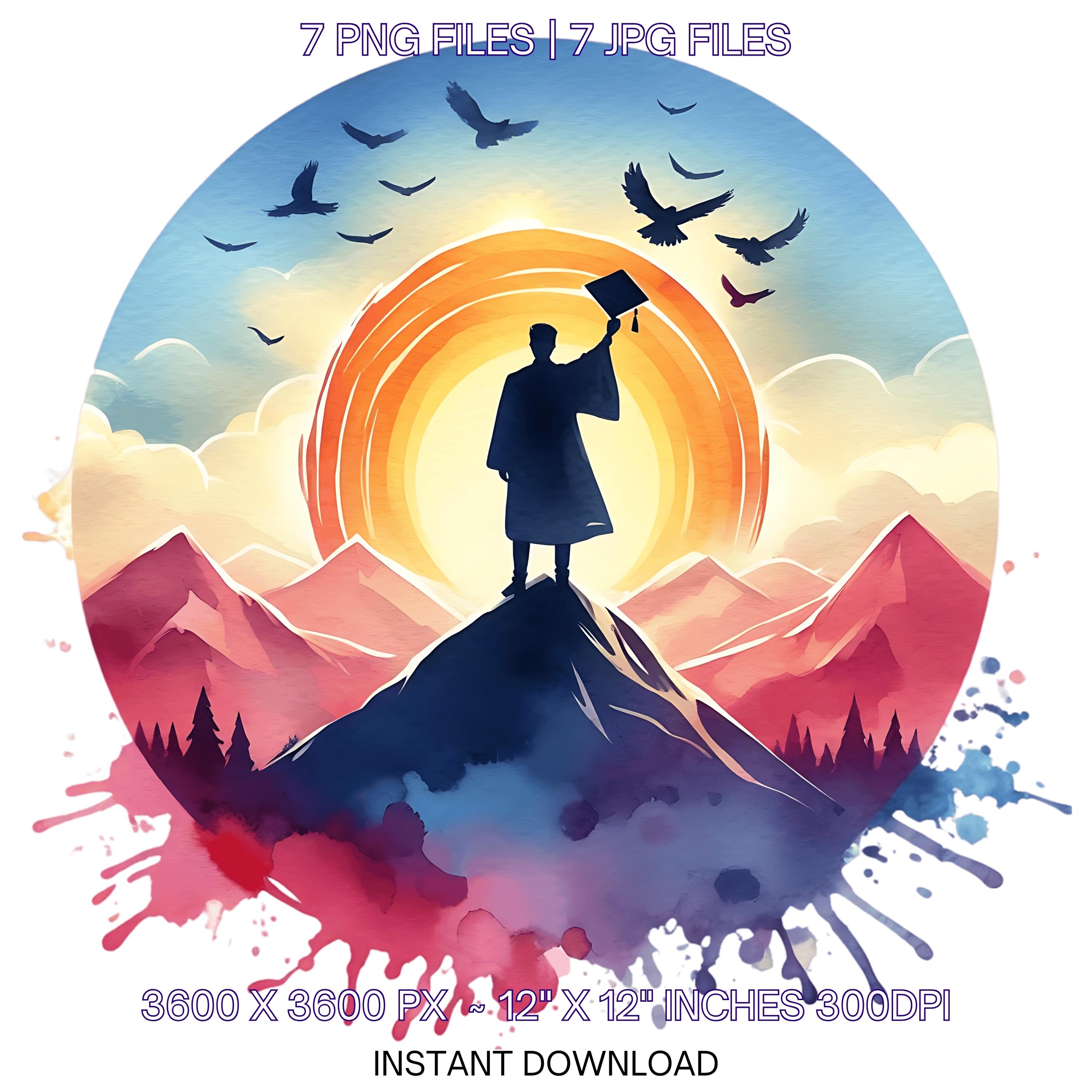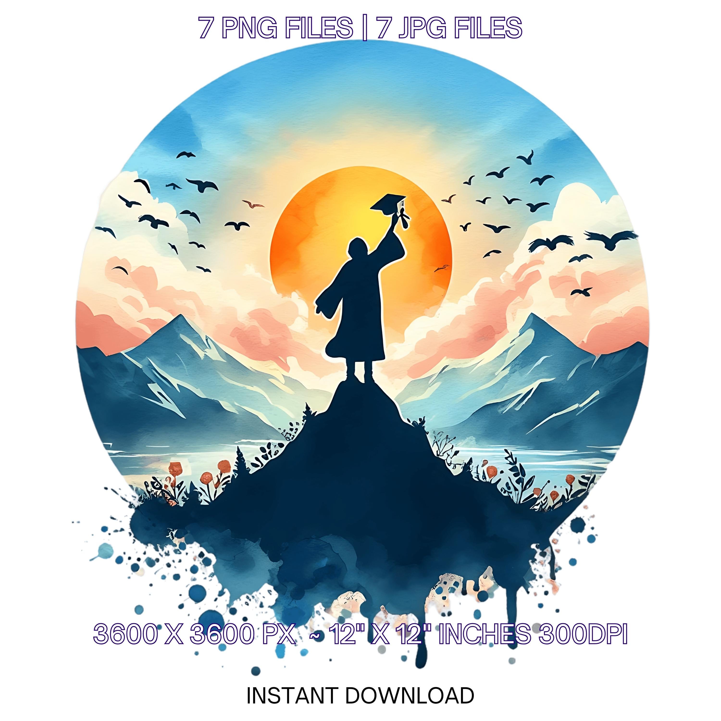 Future is Bright | A silhouette of a graduate on a mountain peak, holding a diploma, sunrise & birds flying | Graduate Clipart PNG 7 PNG-JPG is an eye-catching, high-resolution digital asset designed for creators, crafters, teachers, and small business owners looking to elevate their visuals.