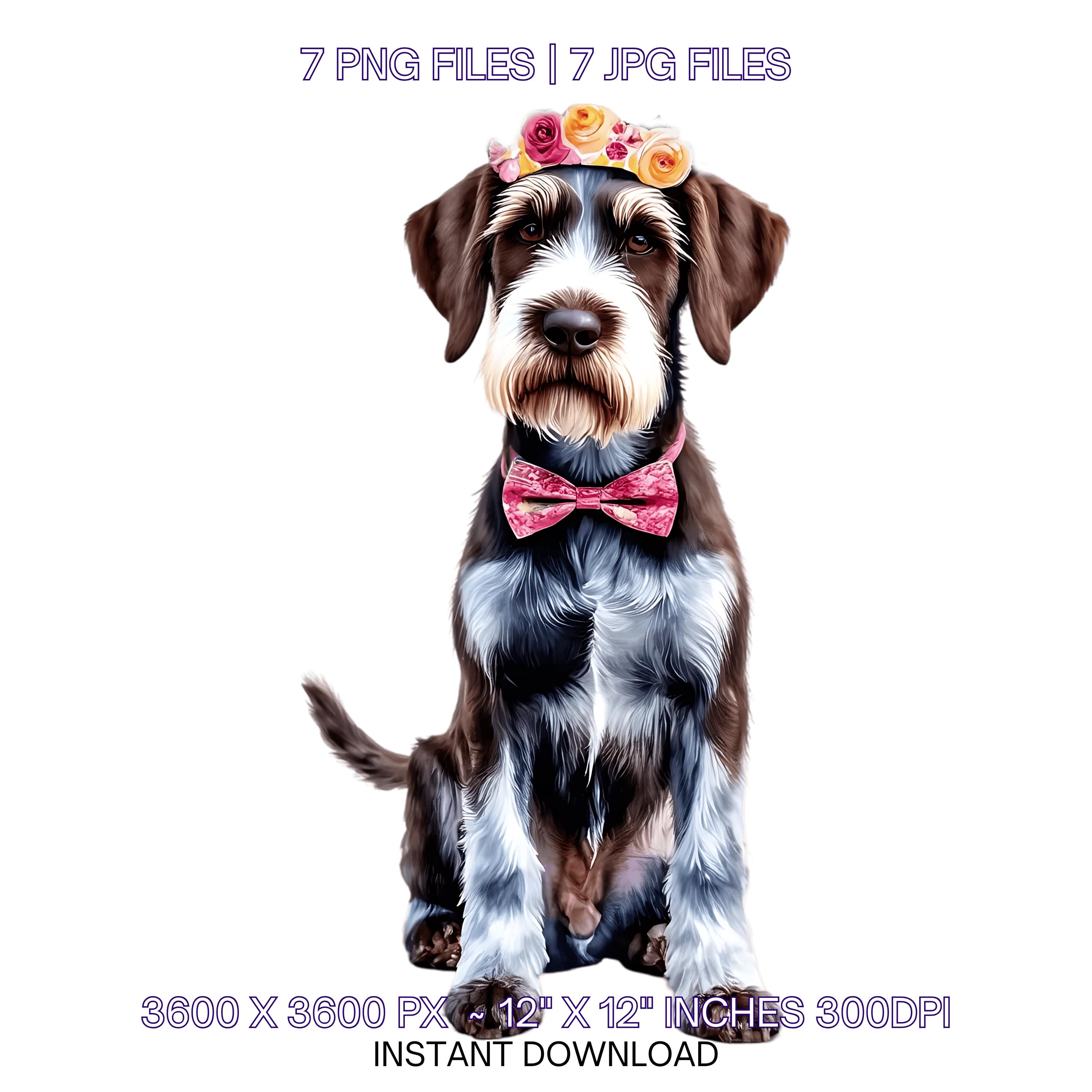German Wirehaired Pointer Dog Wearing Floral Bow & Bunny Ear Handband Ready for Easter Egg Hunting Clipart PNG, 7 Dog Lover Commercial Use is an eye-catching, high-resolution digital asset designed for creators, crafters, teachers, and small business owners looking to elevate their visuals.
