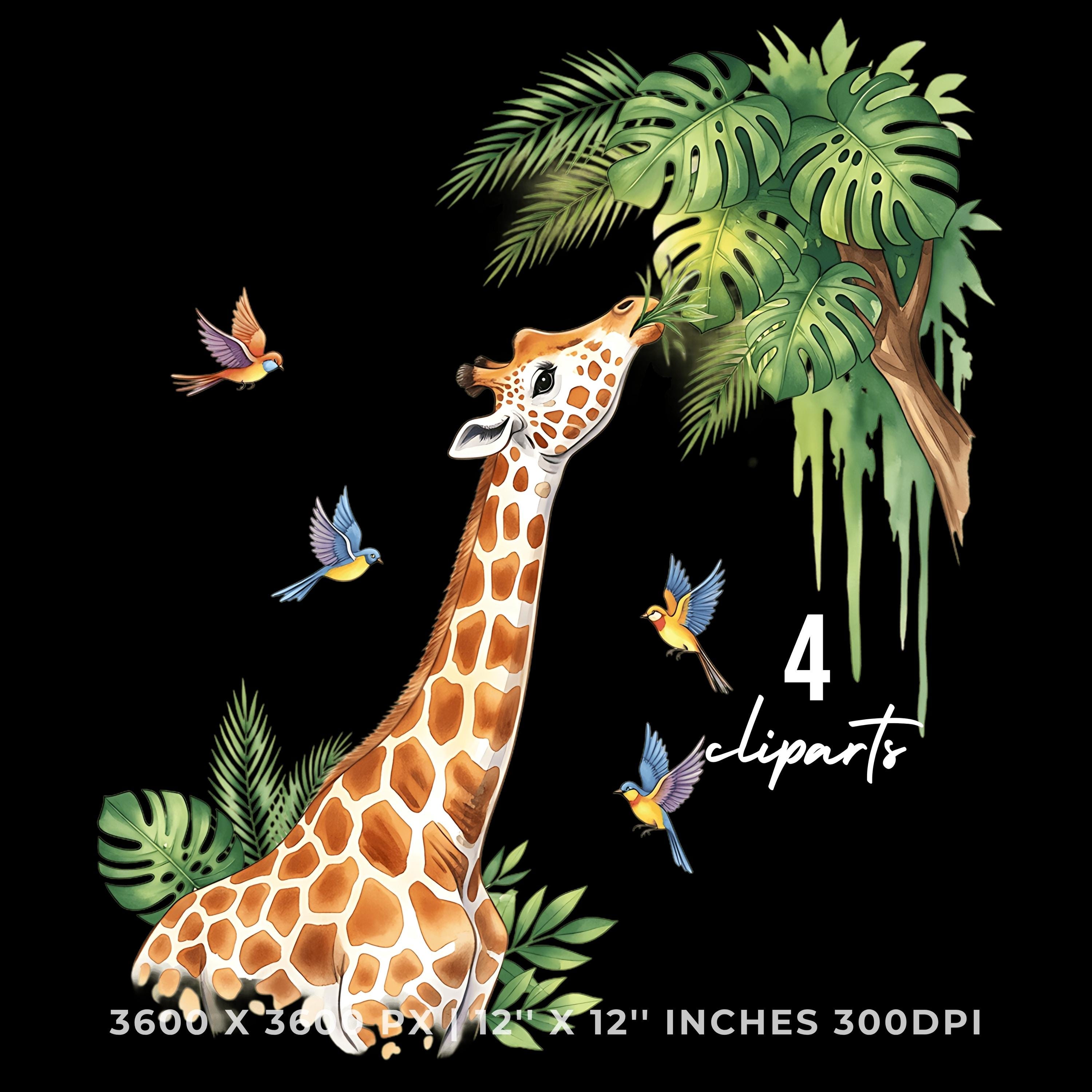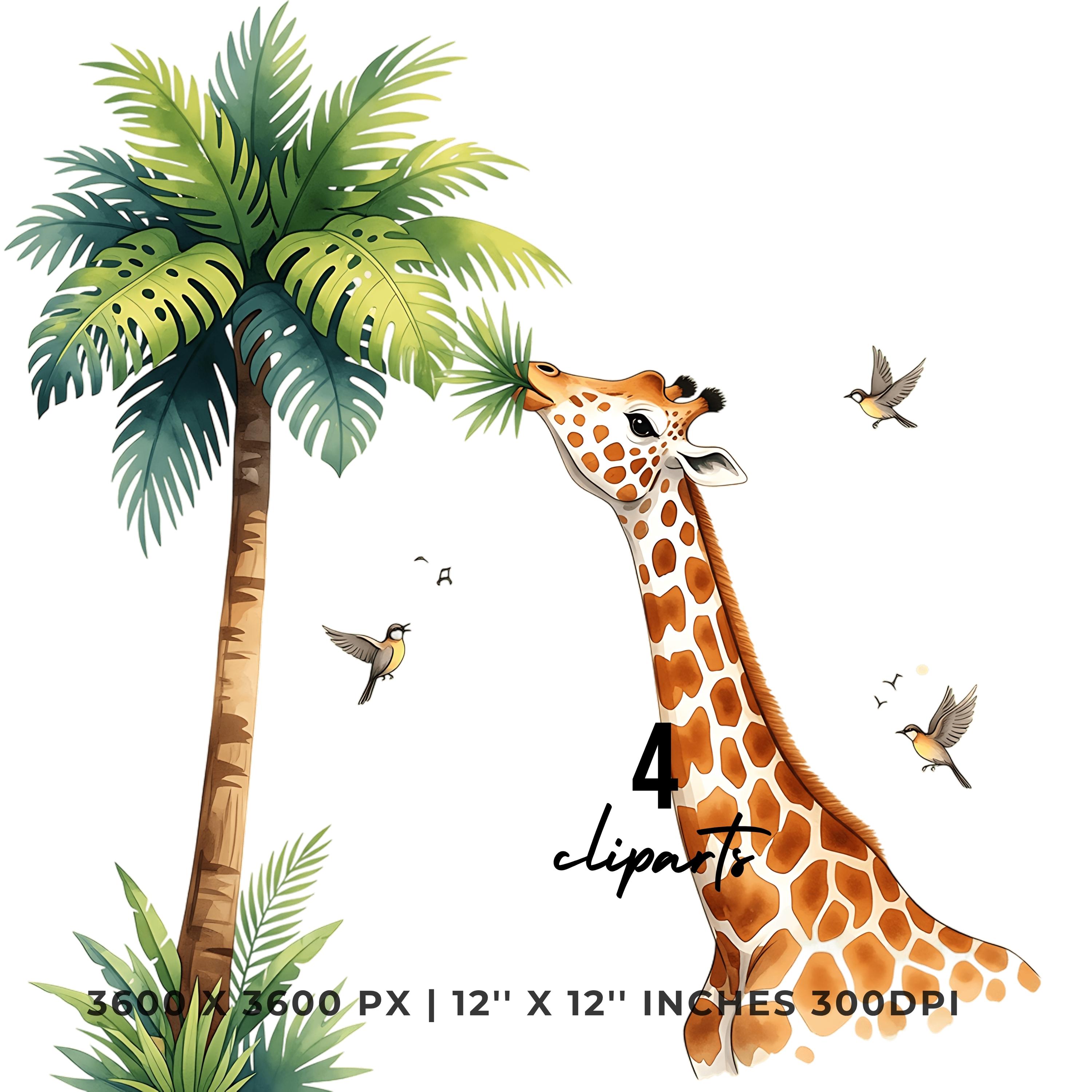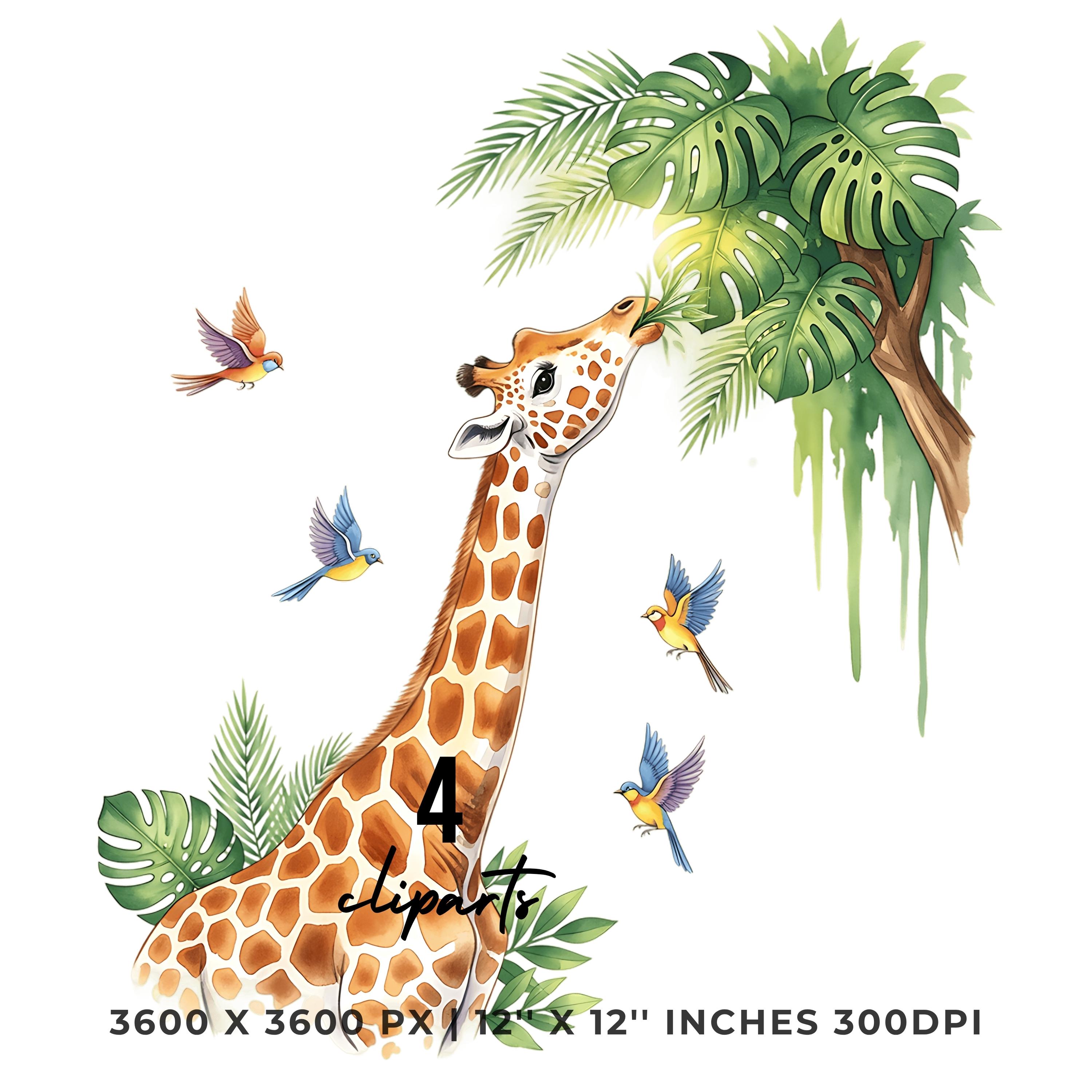 Giraffe Clipart PNG | 4 Watercolor Giraffe munching tropical leaves from a Palm tree while birds sing | Summer Sublimation Commercial Use is an eye-catching, high-resolution digital asset designed for creators, crafters, teachers, and small business owners looking to elevate their visuals.