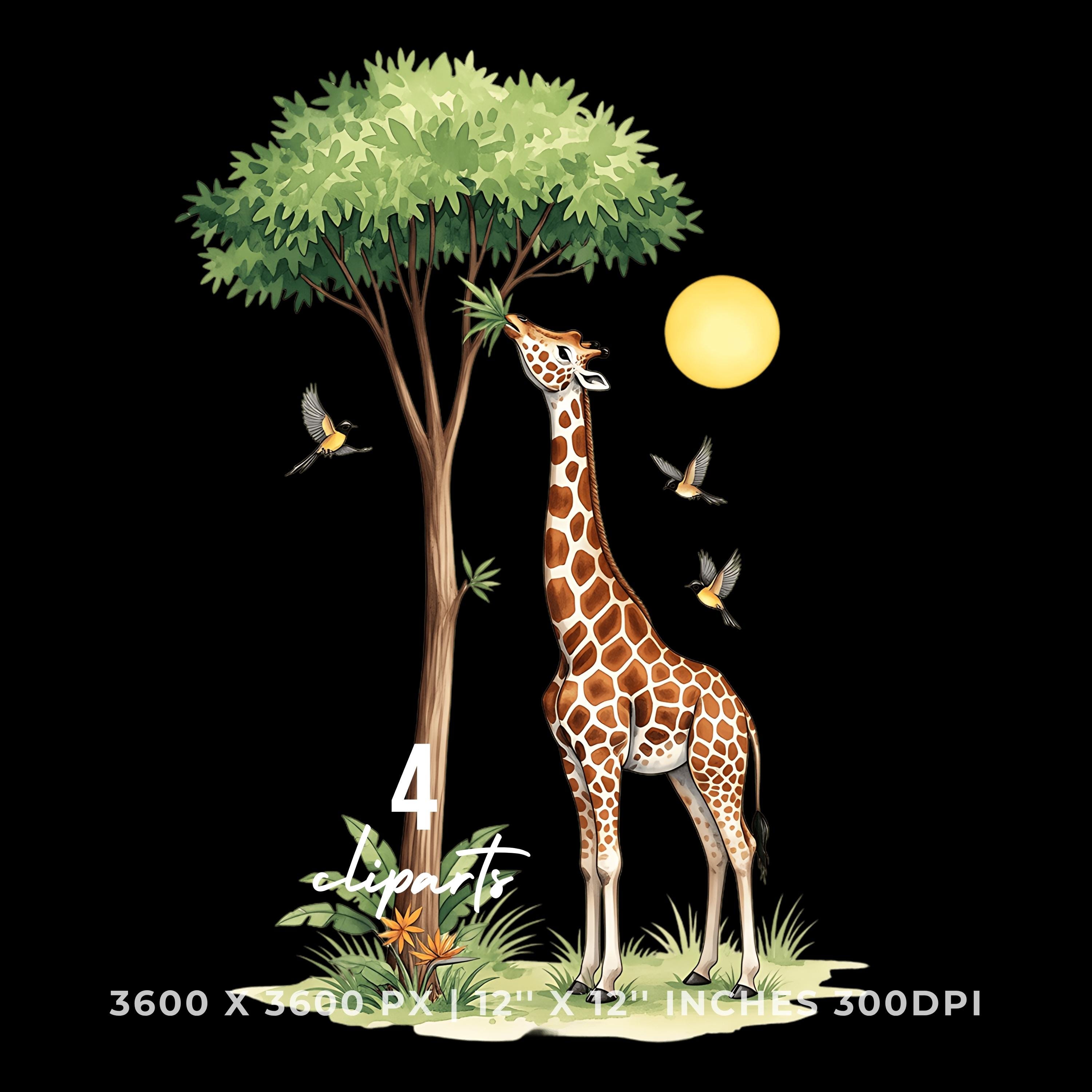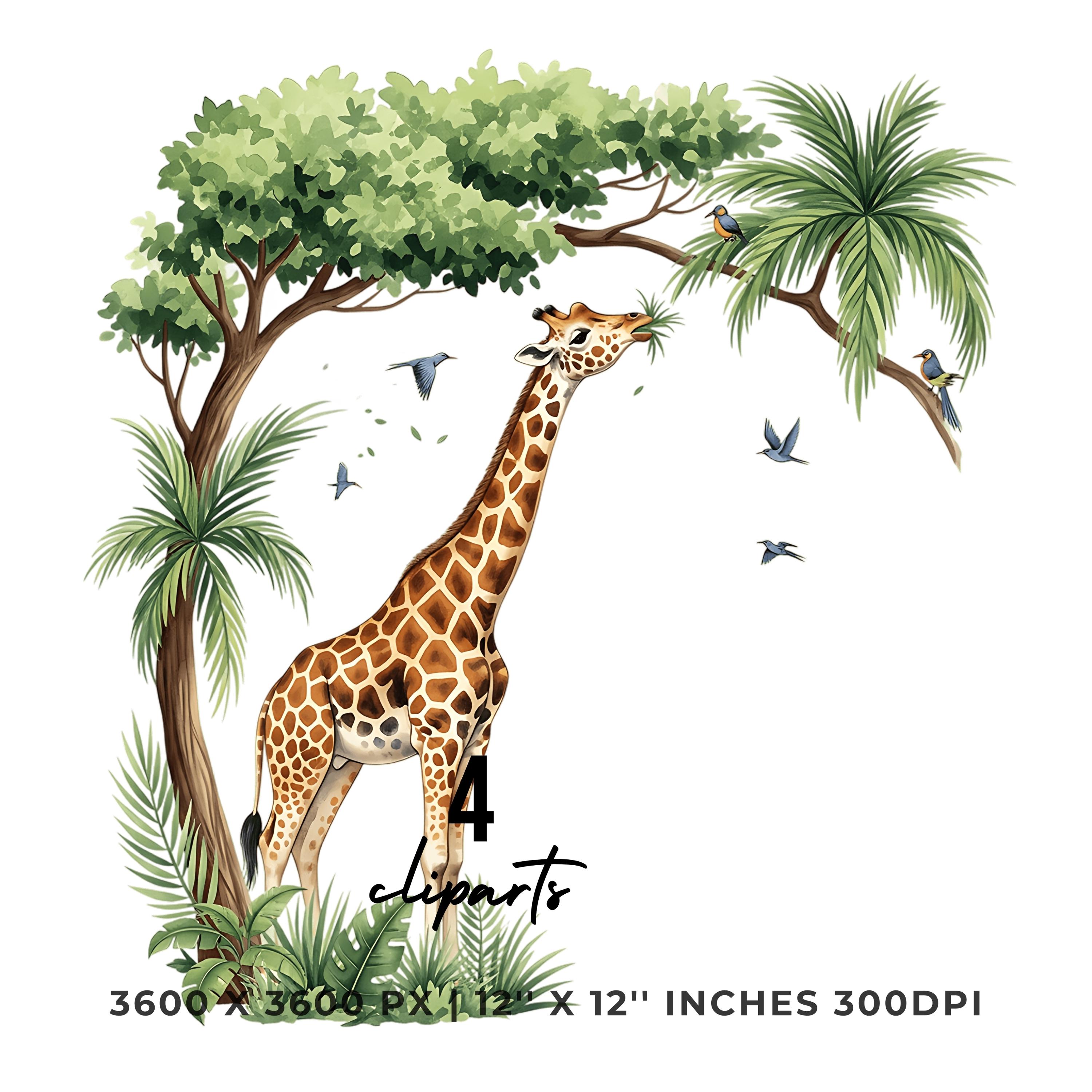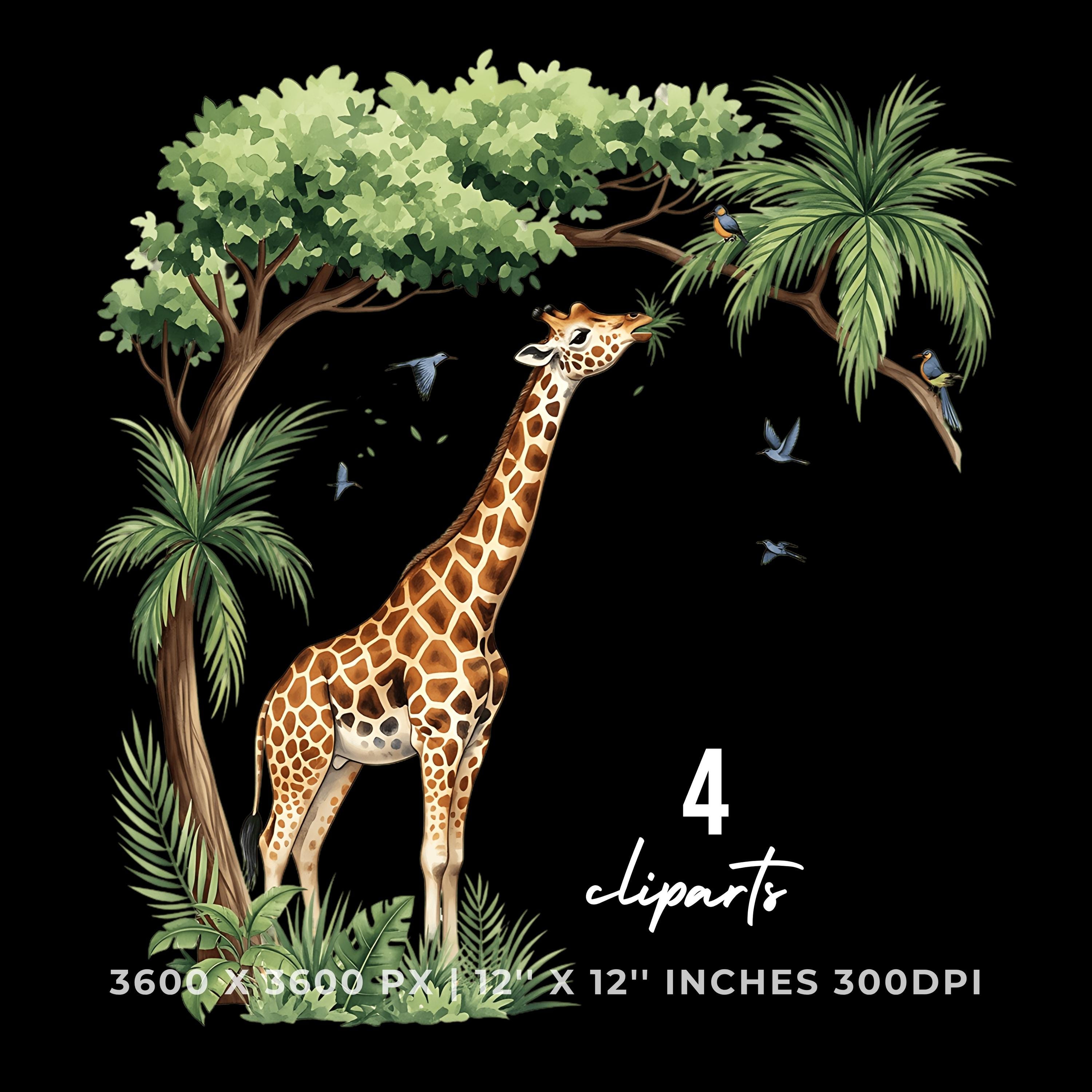 Giraffe Clipart PNG | 4 Watercolor Giraffe munching tropical leaves from a Palm tree while birds sing | Summer Sublimation Commercial Use is an eye-catching, high-resolution digital asset designed for creators, crafters, teachers, and small business owners looking to elevate their visuals.