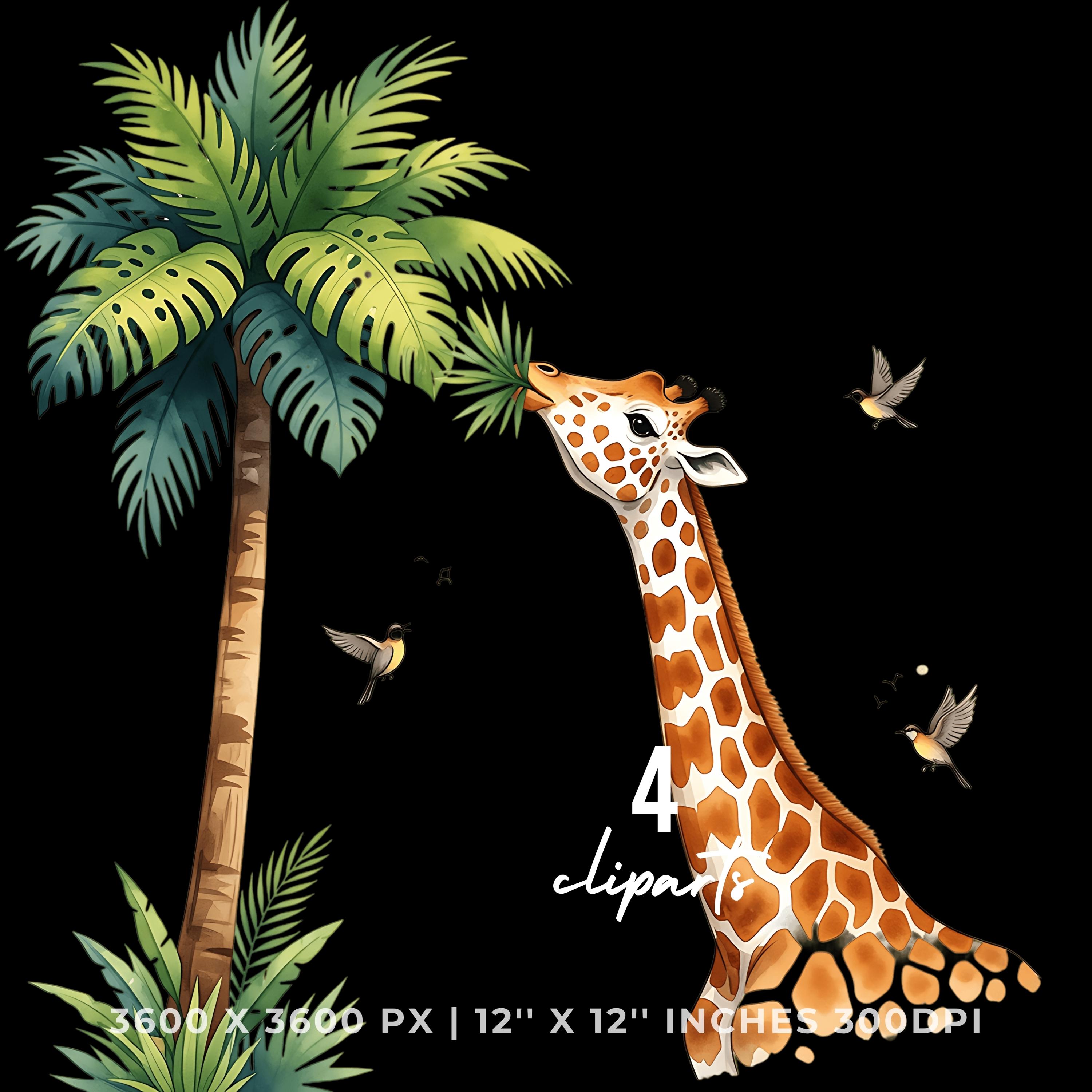 Giraffe Clipart PNG | 4 Watercolor Giraffe munching tropical leaves from a Palm tree while birds sing | Summer Sublimation Transparent Commercial Use