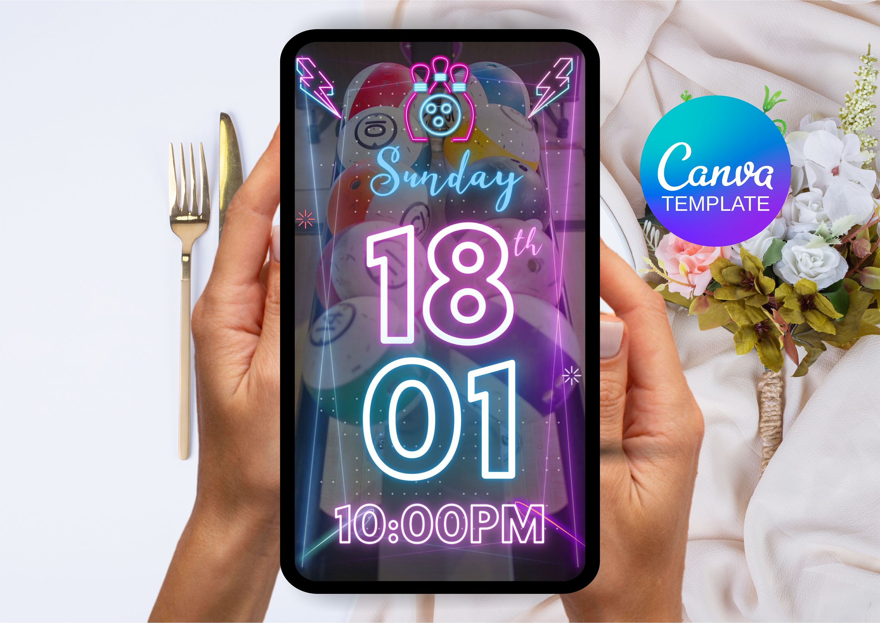 Glow Bowling Party Invitation, Let’s Strike Up Some Fun Retro Neon Lights Party, Editable Video Evite Canva Template for Girl or Boy Any Age is an eye-catching, high-resolution digital asset designed for creators, crafters, teachers, and small business owners looking to elevate their visuals.