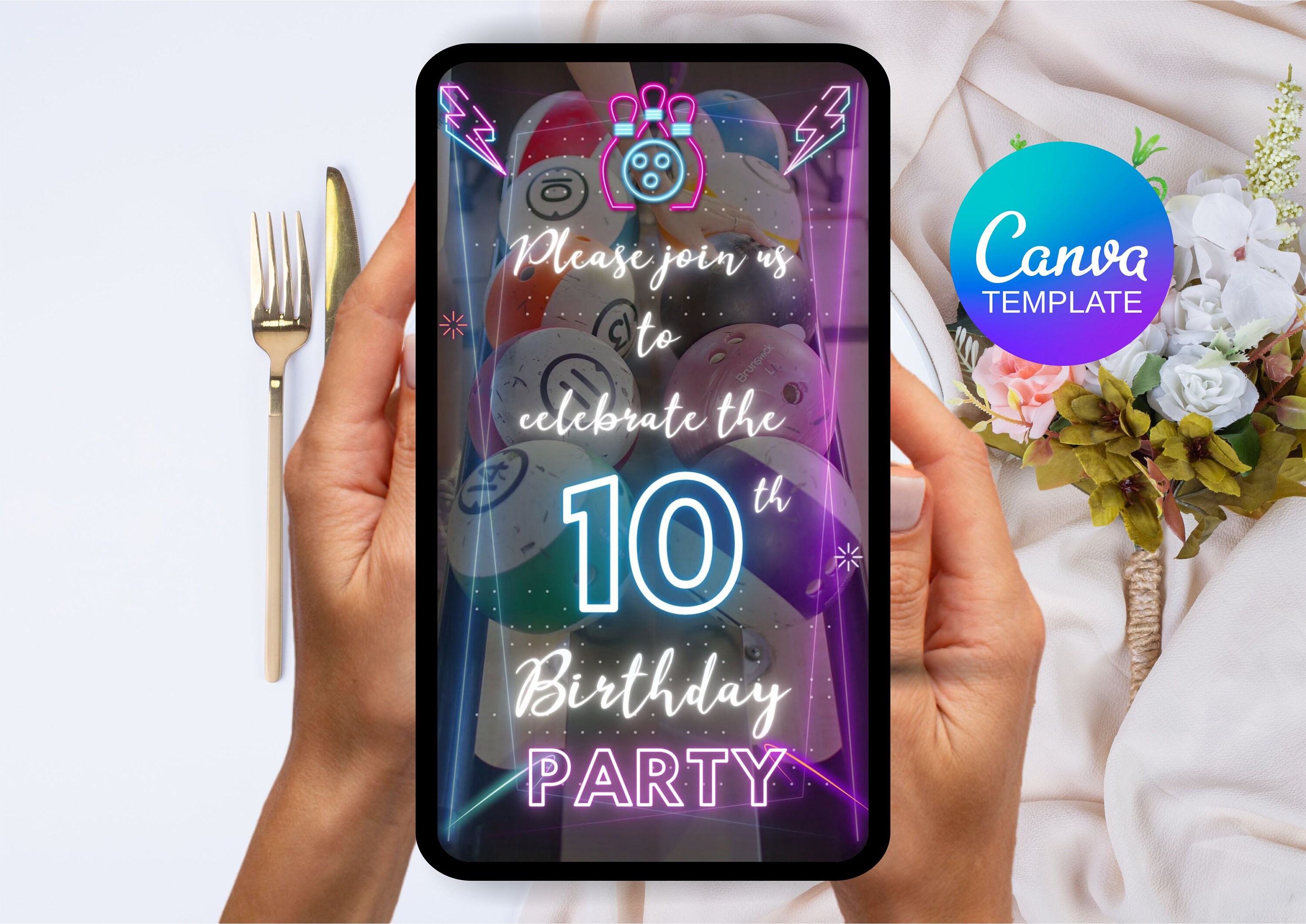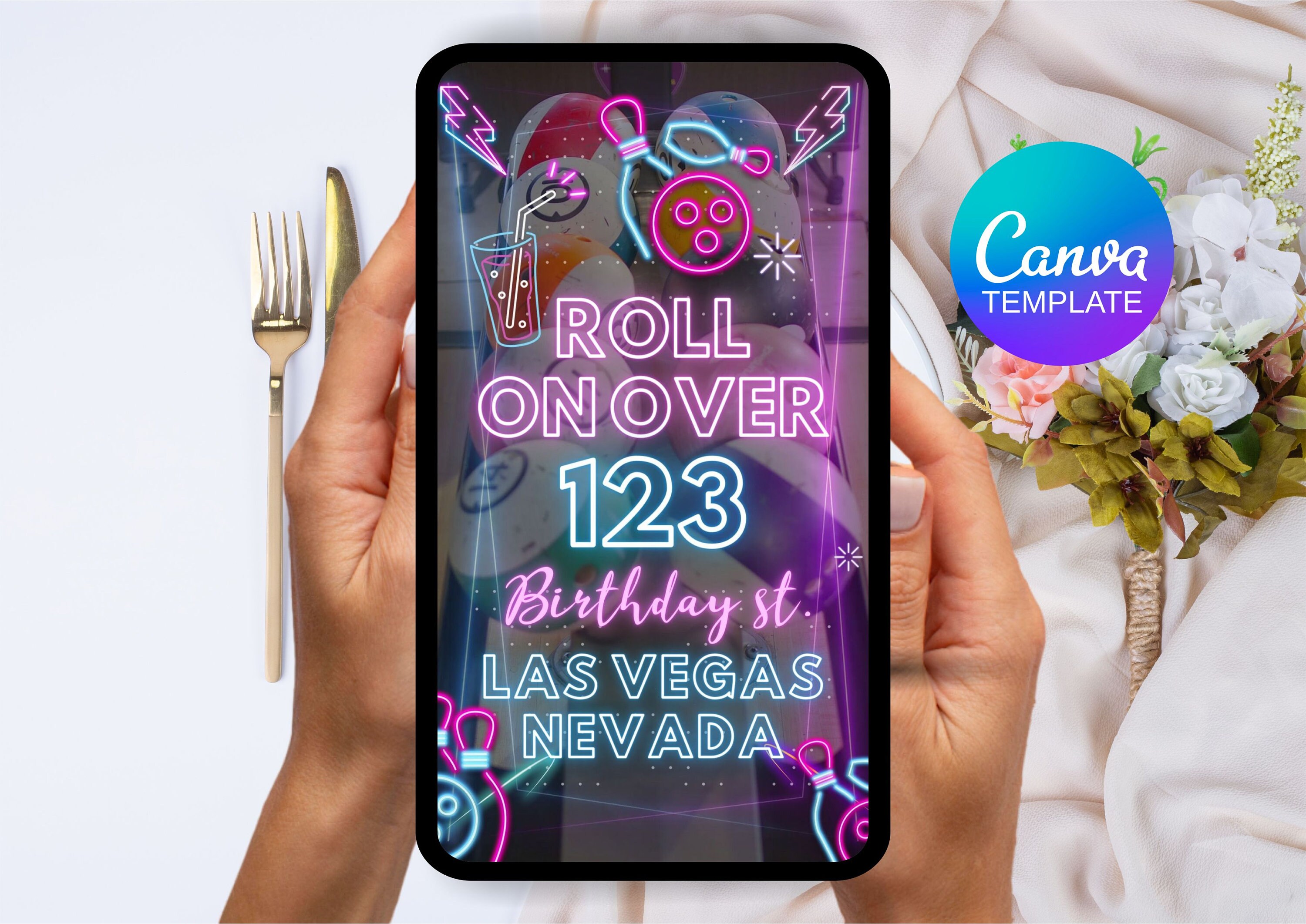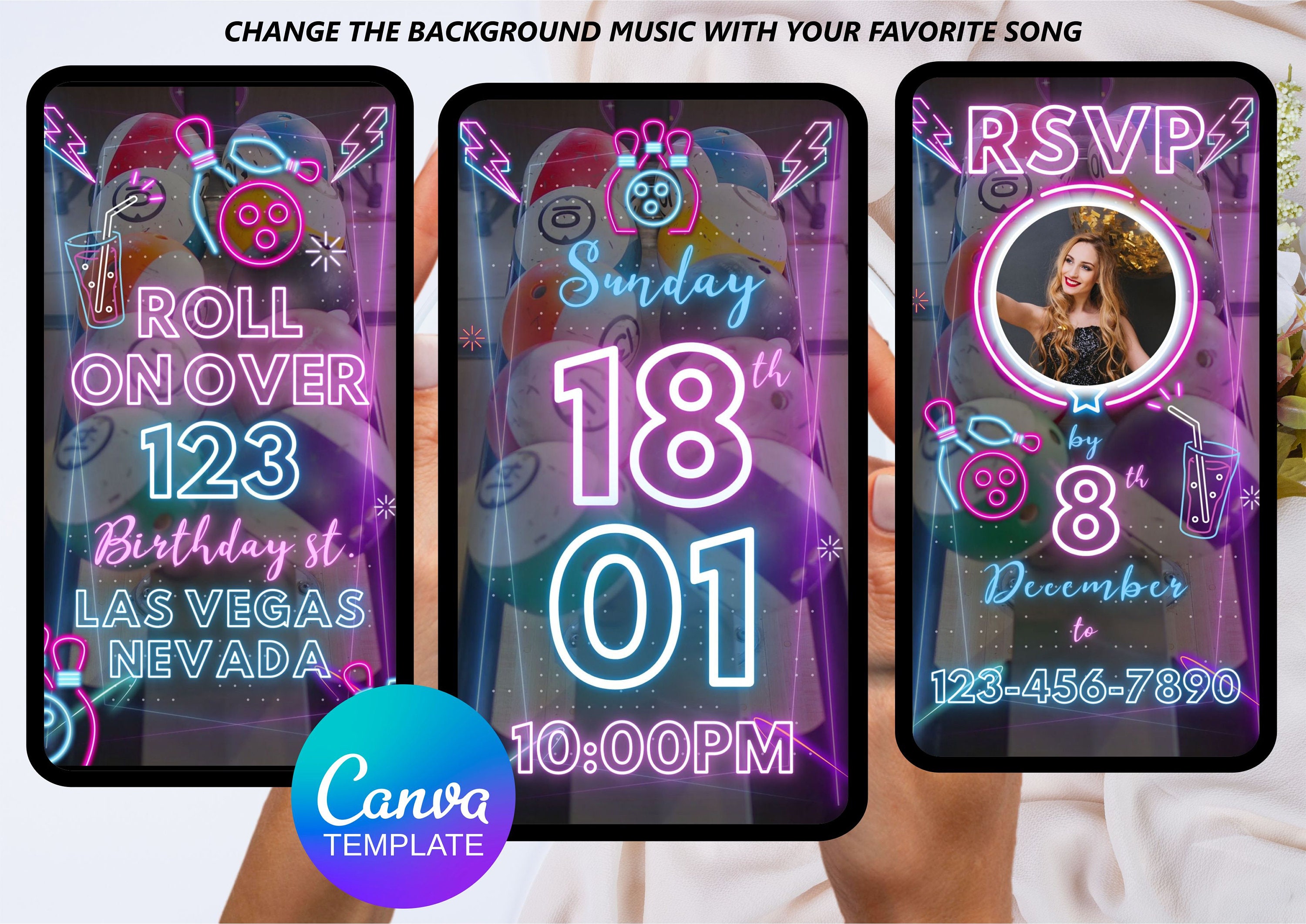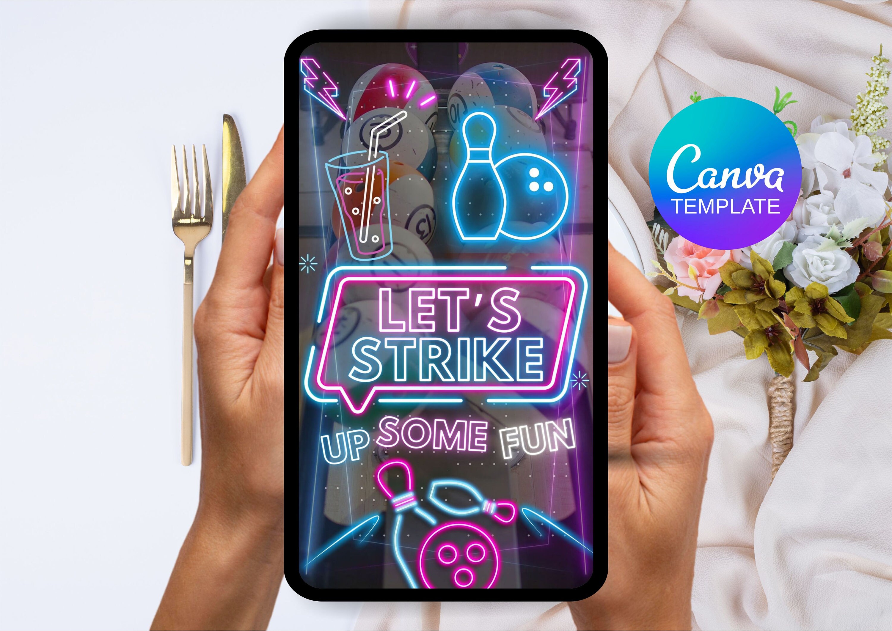 Glow Bowling Party Invitation, Let’s Strike Up Some Fun Retro Neon Lights Party, Editable Video Evite Canva Template for Girl or Boy Any Age – Instant Digital Download - TumblersGalaxy
