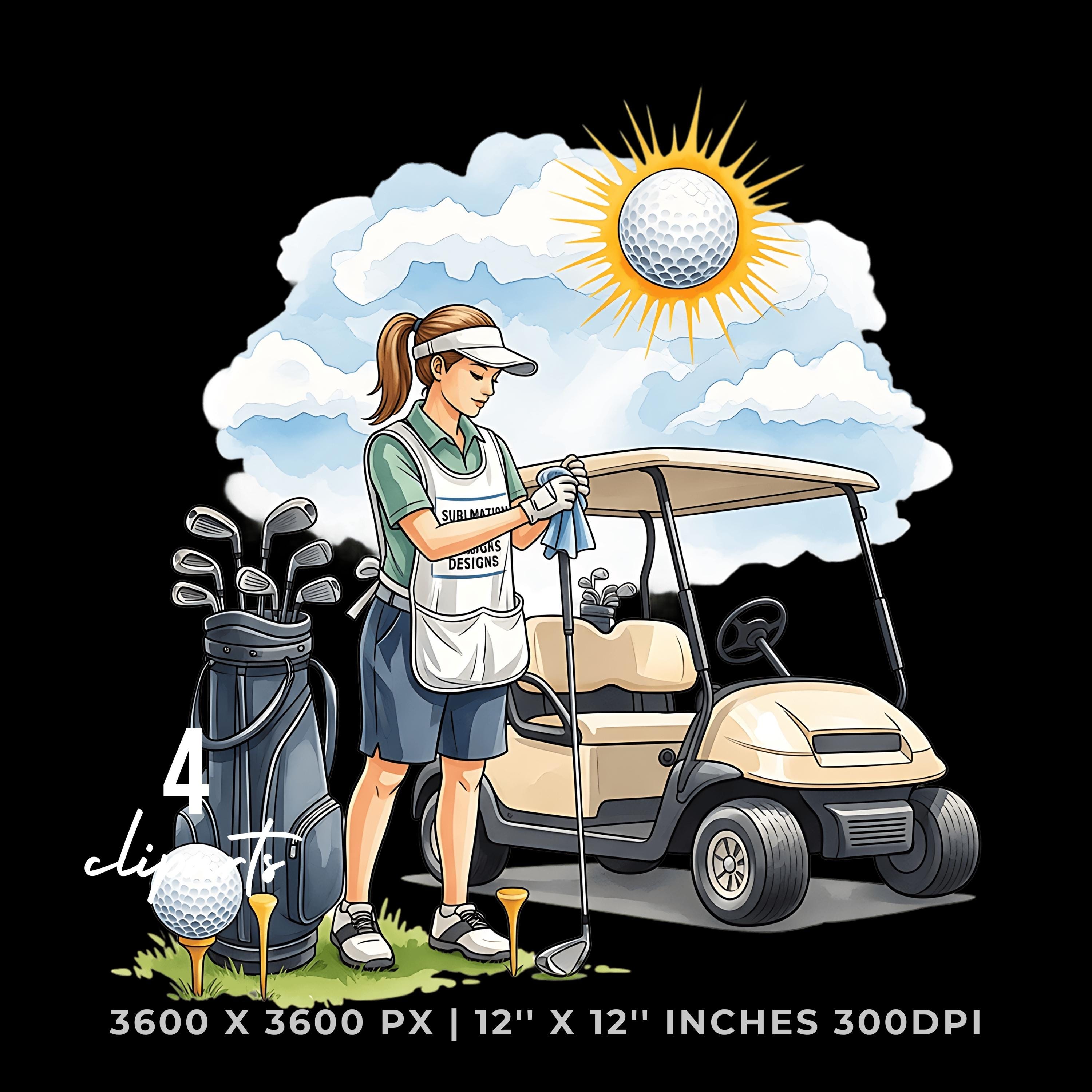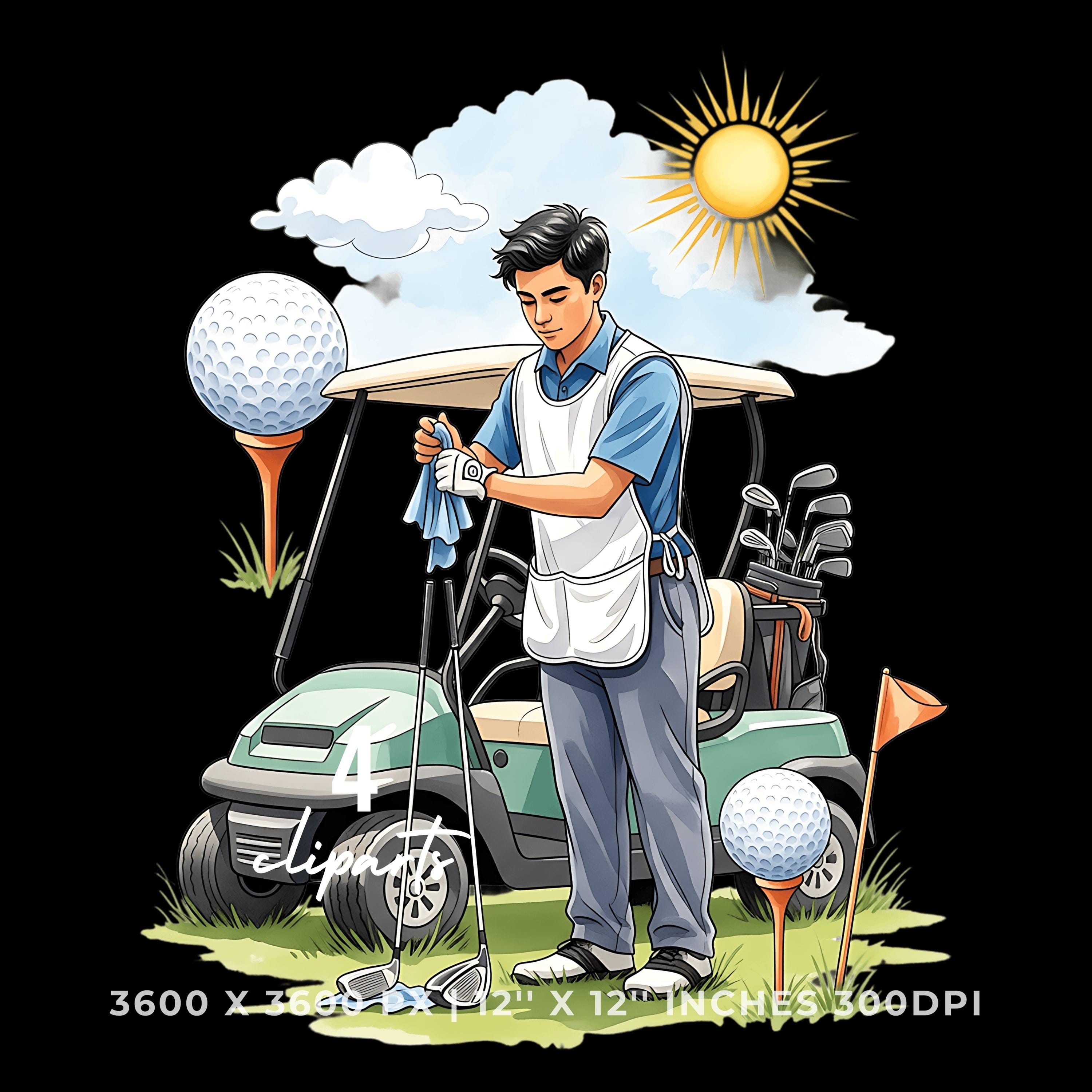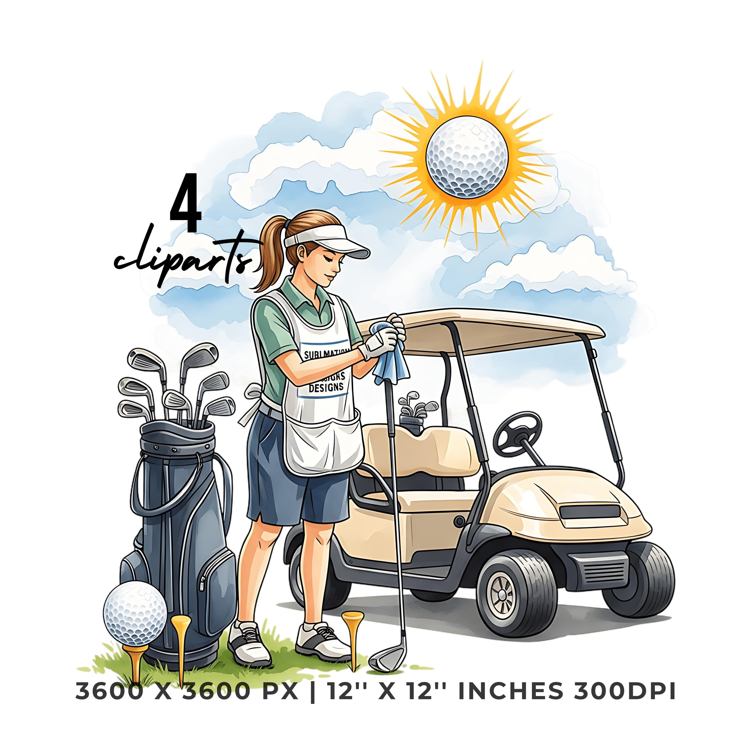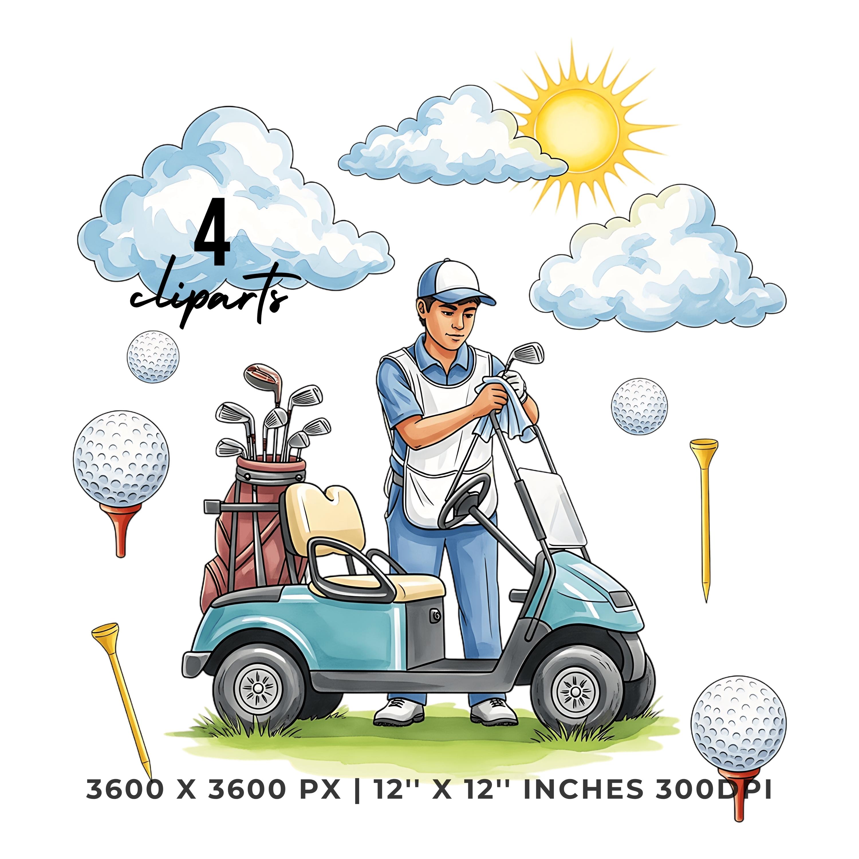 Golf Caddy Clipart Set | Golf Cart, Clubs & Caddy | Summer Sport Clipart | 4 PNG 4 JPG | Sublimation Design 12″x12″ 300DPI Commercial Use is an eye-catching, high-resolution digital asset designed for creators, crafters, teachers, and small business owners looking to elevate their visuals.