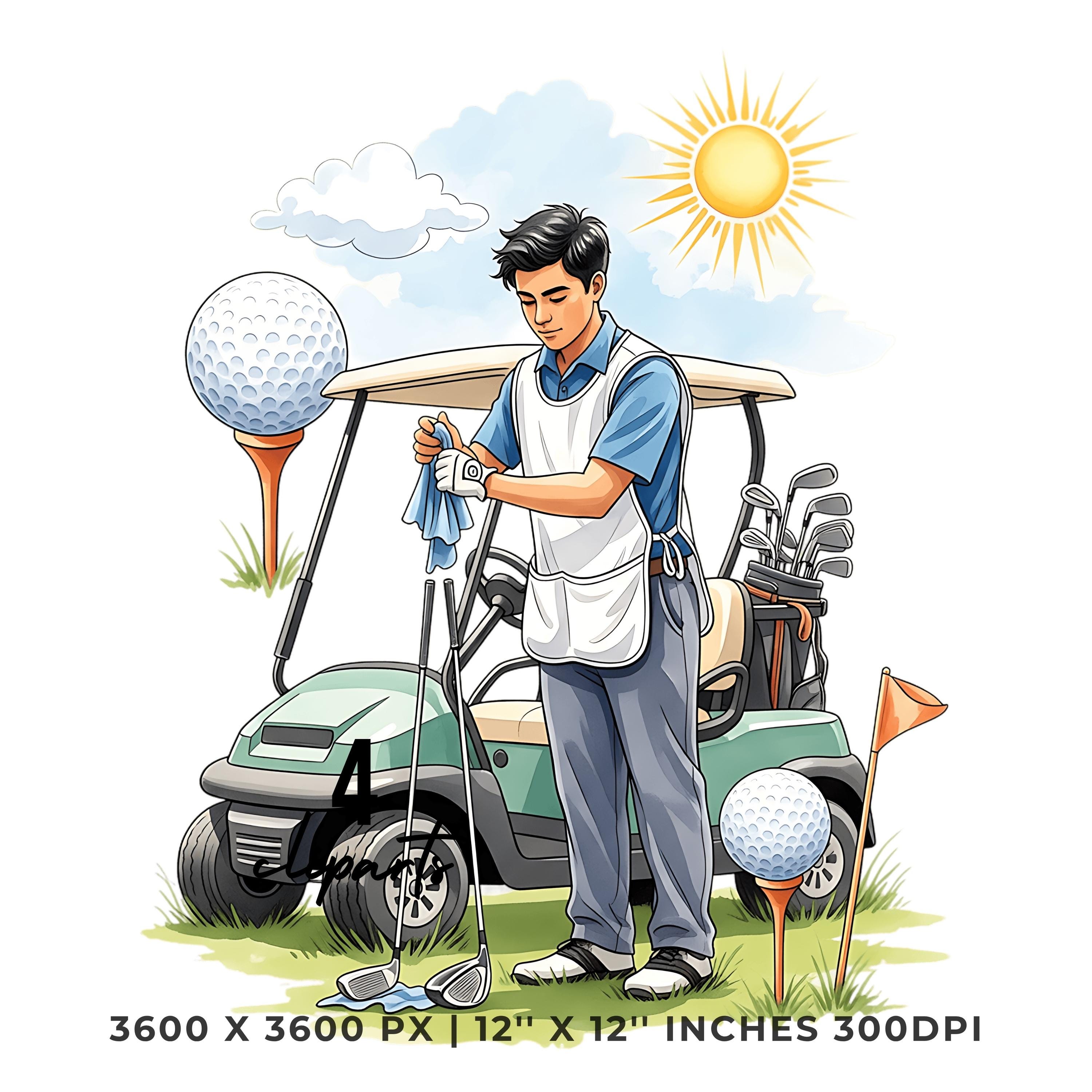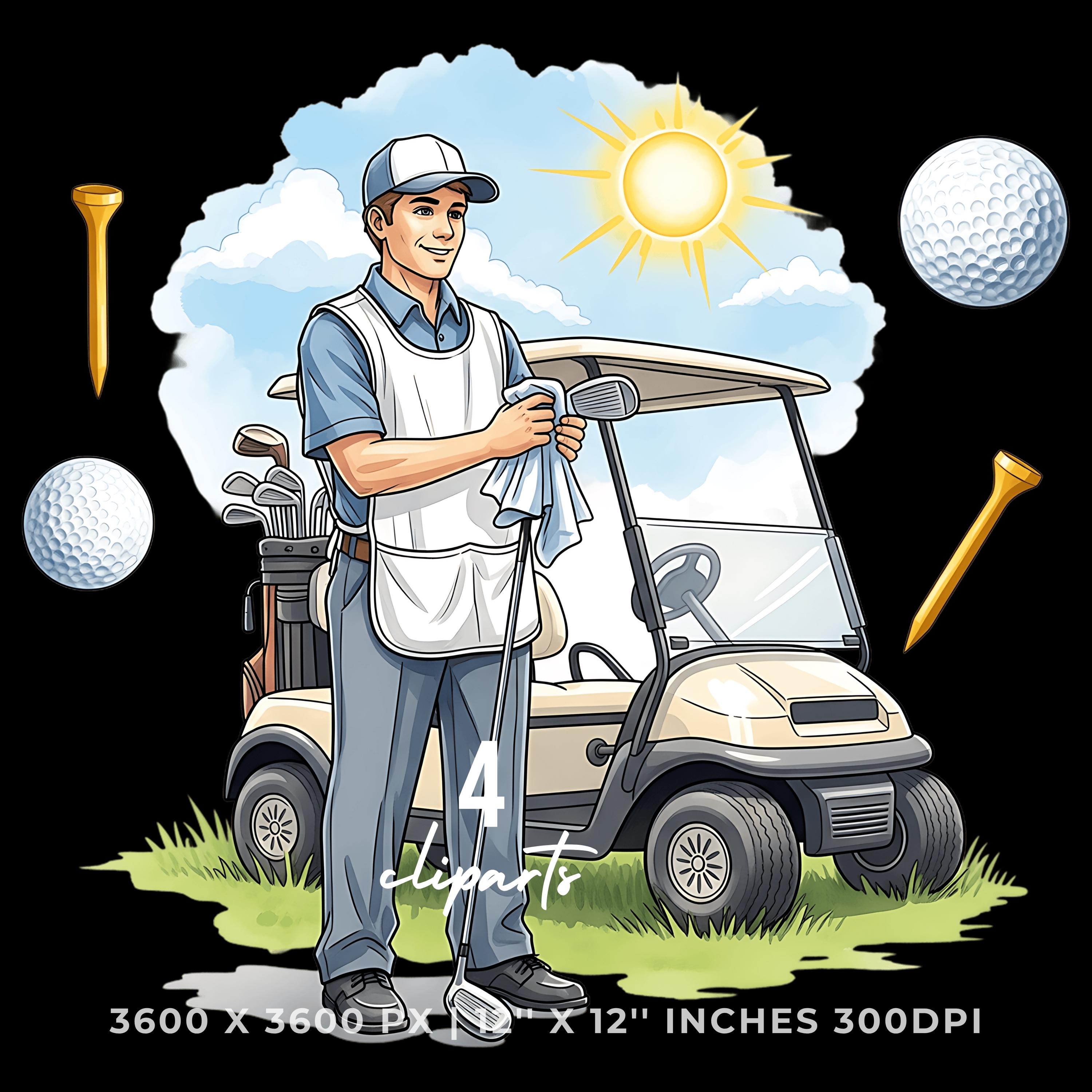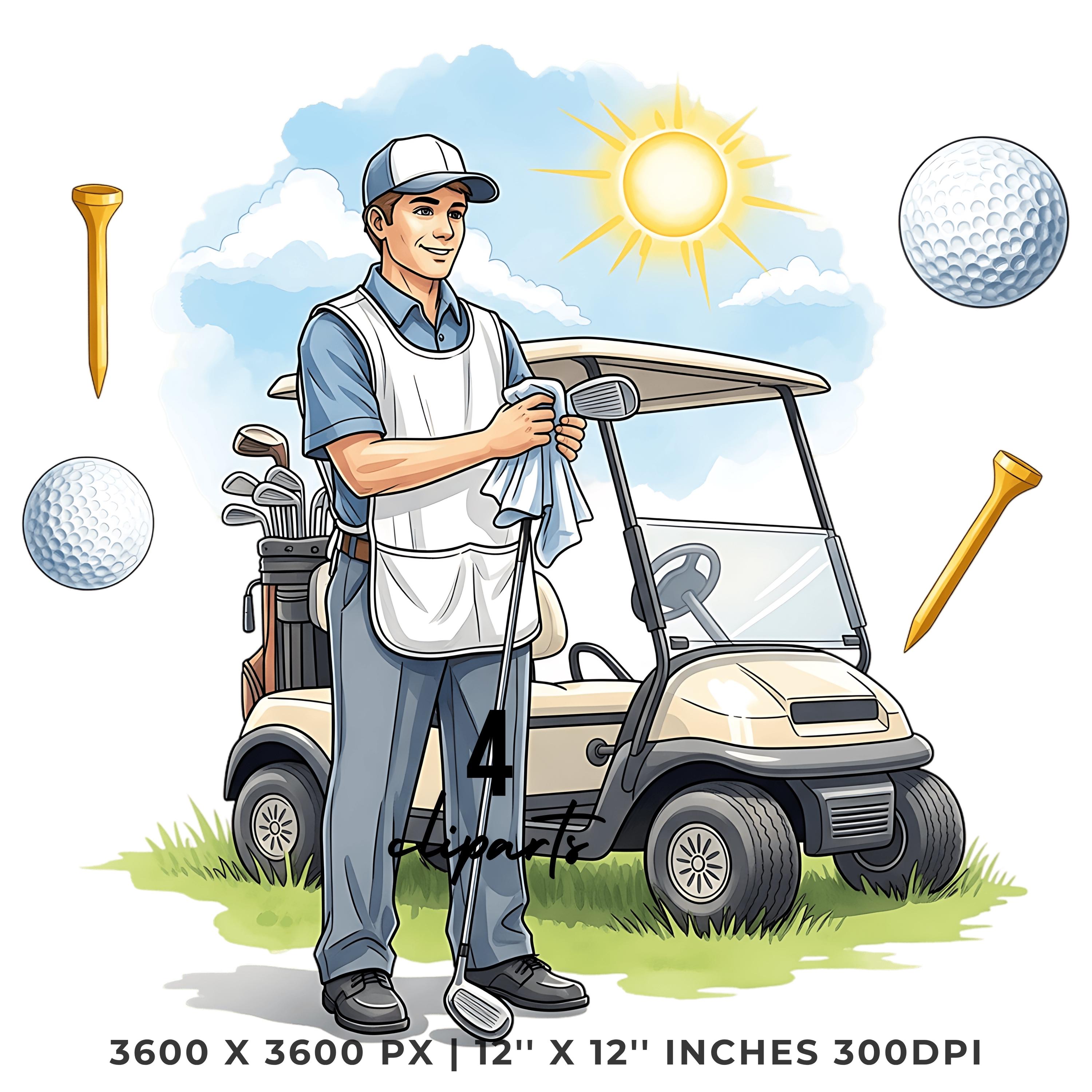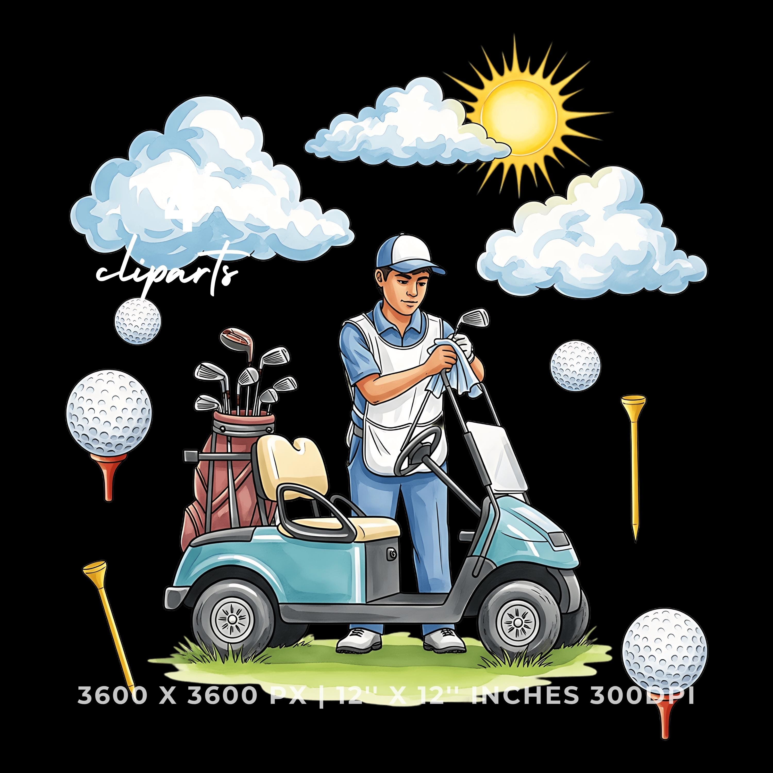 Golf Caddy Clipart Set | Golf Cart, Clubs & Caddy | Summer Sport Clipart | 4 PNG 4 JPG | Sublimation Design 12″x12″ 300DPI Commercial Use is an eye-catching, high-resolution digital asset designed for creators, crafters, teachers, and small business owners looking to elevate their visuals.