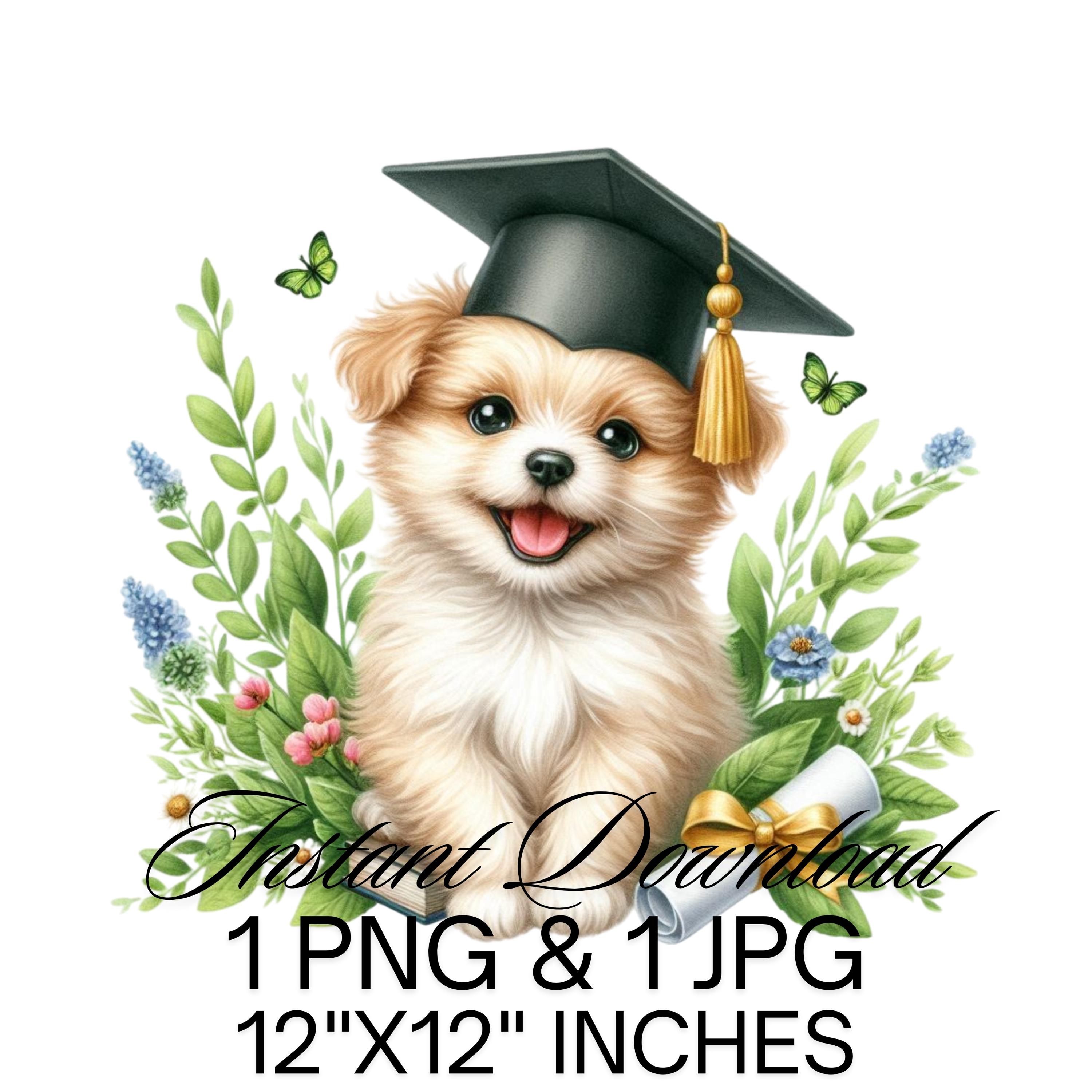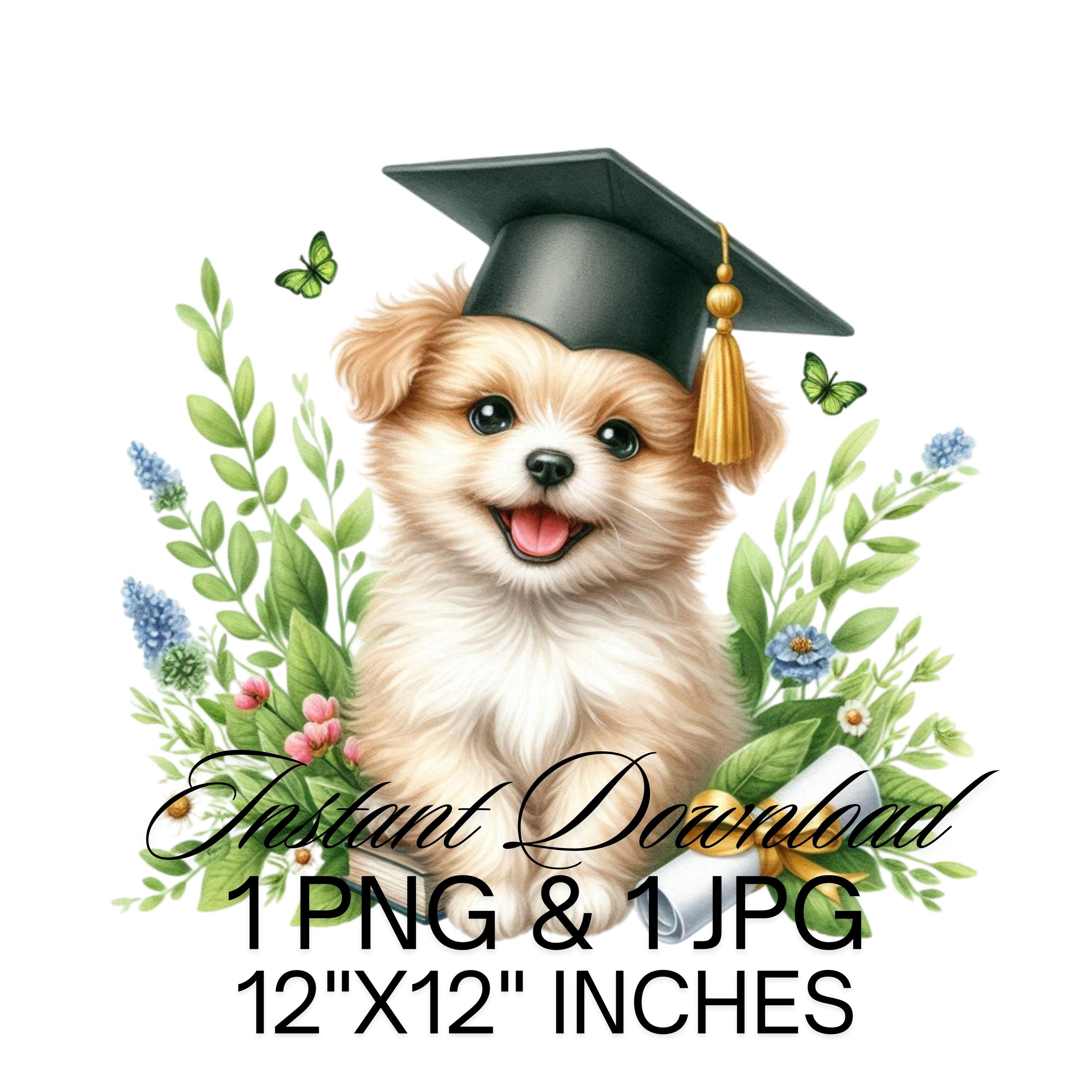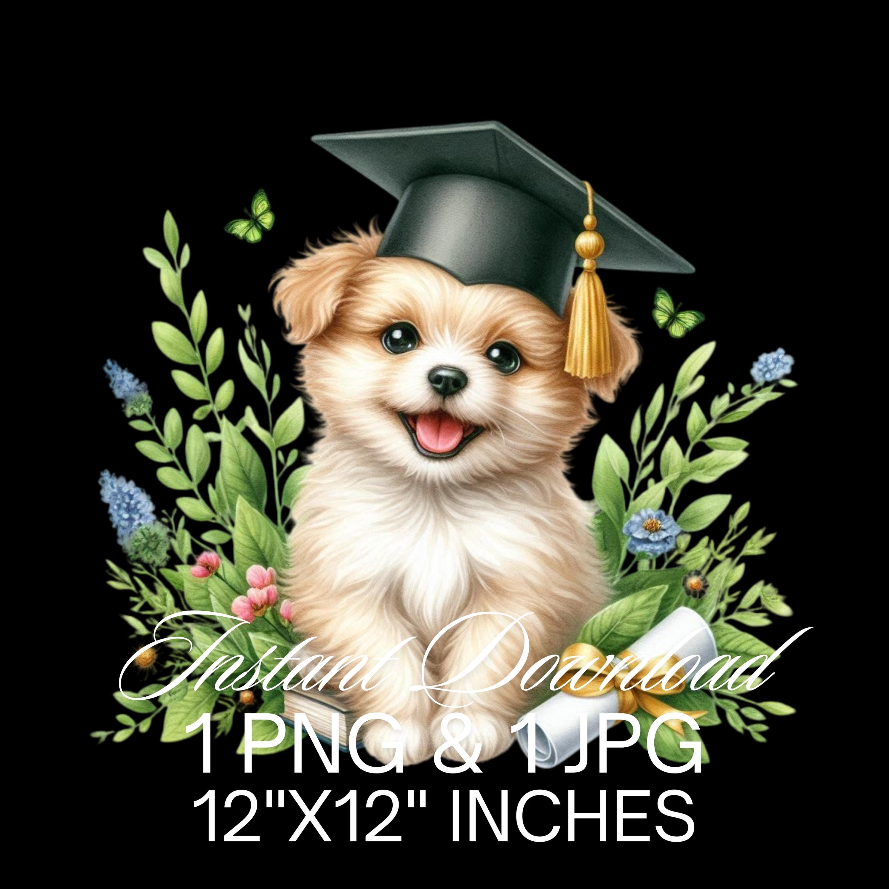 Graduation Cream Puppy Clipart Grad Student | Dog PNG College Graduation Sublimation | Graduation Black Cap & Gold Tassel | Doggy, Green Flowers & Wildflowers Graduate Printable | 12″x12″ inches | Digital Download | Doggie Commercial Use